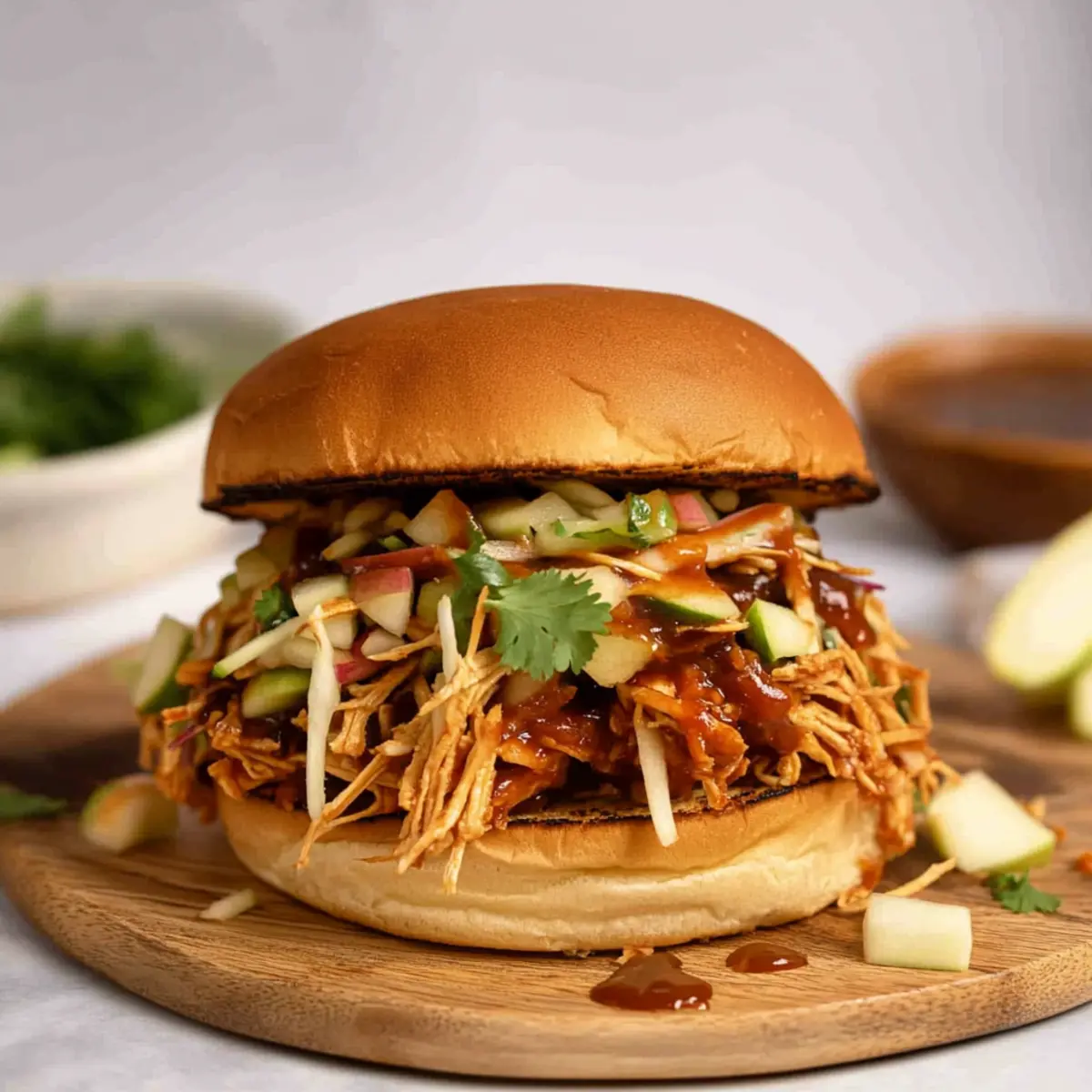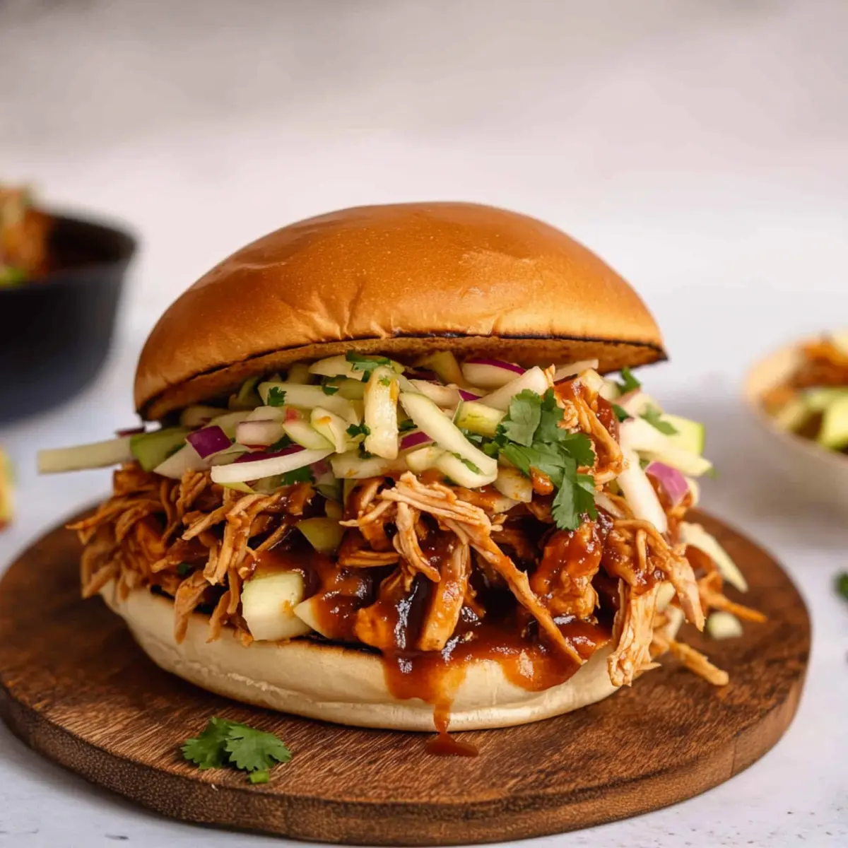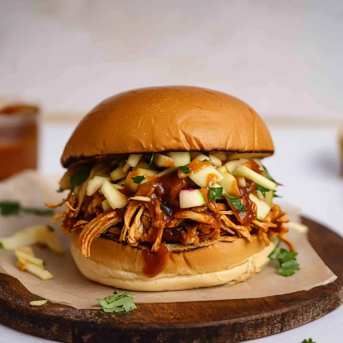 Once the buns are toasted, it’s time to assemble your sandwiches. Place a generous portion of the shredded chicken onto the bottom half of each bun, followed by a drizzle of extra BBQ sauce. Top it off with a vibrant scoop of the prepared apple cabbage slaw, adding a crunchy and flavorful contrast to the tender chicken.