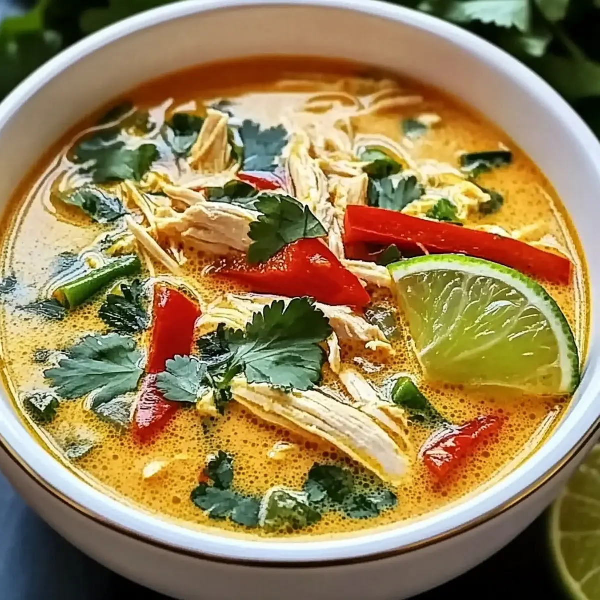 Jump to Recipe Print RecipeAs the sun begins to set and a warm glow fills the kitchen, I unsnap the lid of my trusty crockpot, releasing an aromatic wave that instantly transports me to the bustling streets of Thailand. My Crockpot Thai Coconut Chicken Soup blends the richness of coconut milk with vibrant spices for an experience that’s not just about savoring a meal but also nourishing the soul. The best part? It requires minimal prep time and makes for a comforting dish that your whole family will adore, all while being healthy and gluten-free. So, are you ready to let your slow cooker work its magic and bring a little taste of Thailand to your dinner table? Why is this soup a winner? Comforting, there’s nothing quite like a warm, hearty bowl on a chilly evening. Healthy & Nutritious, packed with protein from the chicken and healthy fats from coconut milk, this soup nourishes your body. Family-Friendly, even the pickiest of eaters will love the creamy, slightly sweet flavor, making it a dinner table favorite. Customizable, add your seasonal vegetables or switch chicken for tofu to suit dietary preferences, as seen in other recipes like Hawaiian Chicken Salad or Cheesy Chicken Enchiladas. Time-Saving, thanks to the crockpot, simply toss in ingredients and let it simmer—perfect for busy weeknights! Crowd-Pleasing, it’s ideal for gatherings, effortlessly impressing guests with its rich, aromatic flavors that evoke the essence of Thai cuisine. Crockpot Thai Coconut Chicken Soup Ingredients For the Soup Base • 1 pound boneless, skinless chicken breasts – This is the main protein that becomes tender and easy to shred after cooking. • 1 can (14 ounces) coconut milk – It brings rich creaminess; you can substitute with coconut cream for a more decadent flavor. • 4 cups chicken broth – Acts as the soup’s foundation; switch to vegetable broth for a vegetarian option. For the Vegetables • 1 cup chopped carrots – Adds natural sweetness and crunchy texture; parsnips make a great alternative if you’re looking for something different. • 1 cup chopped bell peppers (red or yellow preferred) – These bring color and flavor; feel free to use green ones in a pinch. • 1 cup snap peas or green beans – They provide fresh crunch; broccoli or bok choy will work beautifully too. For Flavor Enhancements • 2 tablespoons red curry paste – The star of the flavor profile; tweak the amount based on your spice tolerance or opt for yellow curry paste for mildness. • 3 cloves garlic, minced – It gives depth and aroma; there’s really no good substitution here. • 1 tablespoon ginger, minced – Fresh ginger adds warmth; it’s best to avoid powdered ginger for this dish. • 1 tablespoon fish sauce – Boosts umami flavor; use soy sauce to keep it vegetarian. For the Final Touches • 2 tablespoons lime juice – Brightens and lifts the dish; I always recommend fresh lime for the best taste. • Fresh cilantro, for garnishing – It adds a refreshing note; Thai basil is a lovely substitute if you’d like a bolder flavor. • Lime wedges, for serving – A fresh squeeze enhances each bowl, ensuring every bite is juicy and flavorful. • Salt and pepper to taste – Essential for bringing all the flavors together. This Crockpot Thai Coconut Chicken Soup is perfect for cozy dinners or gatherings, filling you with warmth and comfort. Your family will love it! Step‑by‑Step Instructions for Crockpot Thai Coconut Chicken Soup Step 1: Prepare Chicken Begin by placing the pound of boneless, skinless chicken breasts at the bottom of your crockpot. This will serve as the foundation for your Crockpot Thai Coconut Chicken Soup, ensuring that the juices and flavors meld beautifully as the chicken cooks. Step 2: Add Aromatics Sprinkle the minced garlic and ginger evenly over the chicken in the crockpot. These aromatic ingredients will infuse the soup with warm, fragrant notes as they slow-cook together, making every bite delightful and full of depth. Step 3: Incorporate Vegetables Layer in the chopped carrots, colorful bell peppers, and snap peas or green beans on top of the chicken and aromatics. The vibrant veggies not only add nutritional value but also a wonderful crunch, making your soup visually appealing and hearty. Step 4: Mix in Liquids Carefully pour the can of coconut milk and the chicken broth over the layered ingredients in the crockpot. The creamy coconut milk combines with the broth, forming a luscious base for your soup that will envelop all the ingredients as they cook. Step 5: Add Flavor Stir in the red curry paste and fish sauce, ensuring they’re well-distributed throughout the soup mixture. These flavor-packed components are crucial for achieving that signature taste of Crockpot Thai Coconut Chicken Soup, bringing warmth and a hint of spice to each spoonful. Step 6: Season Sprinkle salt and pepper to taste, adjusting according to your preference. Seasoning is vital for elevating the flavors of your soup, so feel free to taste the mixture before cooking to ensure it’s just right. Step 7: Cook Cover the crockpot and set it to cook on low for 4-6 hours or high for 2-3 hours. You’ll know it’s ready when the chicken is fully cooked and tender, easily shredding with a fork, while all the flavors meld beautifully together. Step 8: Shred Chicken About 30 minutes before serving, remove the chicken breasts from the crockpot. Shred them with two forks and return the tender chicken back into the soup, allowing it to absorb all the rich flavors as it finishes cooking. Step 9: Add Lime Juice Just before serving, stir in the fresh lime juice, which brightens up the entire soup. This final touch enhances the overall flavor profile of your Crockpot Thai Coconut Chicken Soup, making it refreshing and zesty. Step 10: Serve Dish out the delicious soup into bowls and garnish with freshly chopped cilantro and lime wedges. This not only adds a pop of color but also an extra burst o
