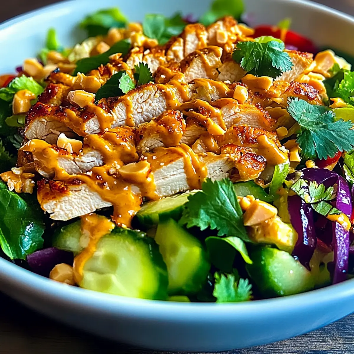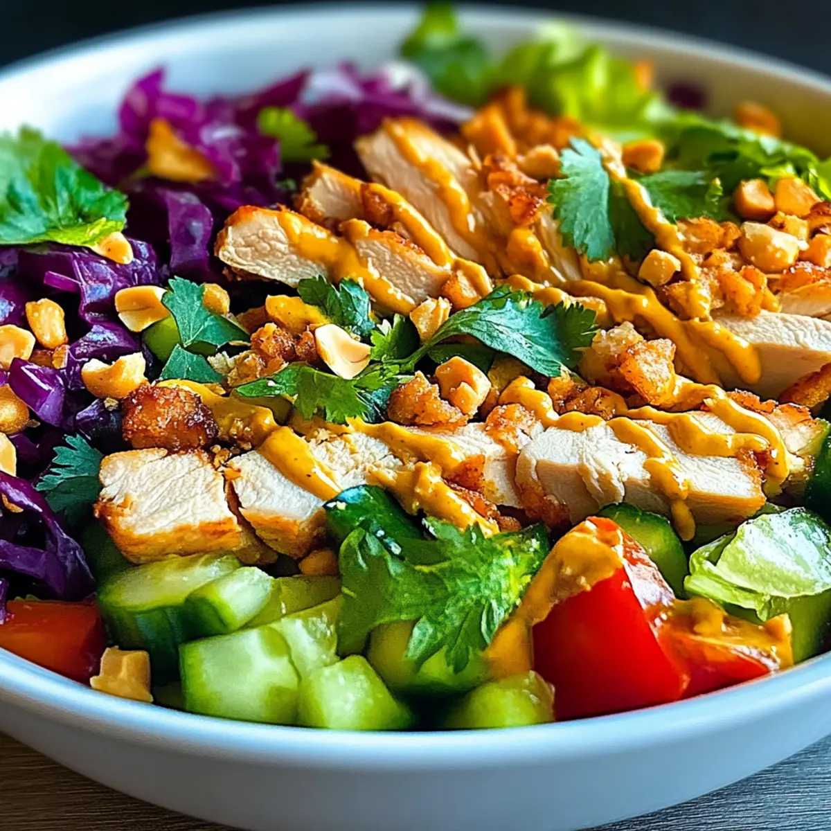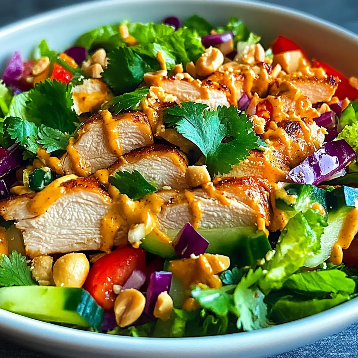 Jump to Recipe Print Recipe“You’ve just stepped into your kitchen, and the clock is ticking. Craving a meal that’s both quick and bursting with flavor? Enter my Crunchy Thai Chicken Salad with Peanut Dressing, an easy dish that will wow your taste buds in under 30 minutes. Imagine a beautiful medley of juicy chicken, crisp vegetables, and a creamy dressing that’s not only healthy but customizable to suit your palate! This salad becomes a quick prep solution for those busy weeknights, a must-try at gatherings, or even a refreshing lunch option. Feeling adventurous? Swap the chicken for tofu or shrimp to mix things up! What flavors will you choose to brighten up your bowl today?” Why is this salad a must-try? Bursting with flavor: This Crunchy Thai Chicken Salad is a delicious explosion of flavors that combines creamy peanut dressing with fresh, vibrant vegetables. Quick and easy: Ready in under 30 minutes, it’s perfect for those busy nights when you want a homemade meal without the fuss. Customizable options: With substitutions for chicken like tofu or shrimp, you can cater it to your dietary preferences or mood. Health-conscious: Packed with protein and vitamins, this salad is a guilt-free choice that satisfies. Crowd-pleaser: Whether for a family dinner or a potluck, this dish is sure to impress and leave everyone craving more! If you’re looking for more fresh ideas, check out my delicious Mediterranean Chicken Pasta Salad or refreshing Hawaiian Chicken Salad. Crunchy Thai Chicken Salad Ingredients For the Salad • Chicken Breast – Main protein source; can substitute with tofu or shrimp for a delicious twist. • Bell Peppers – Adds sweetness and crunch; choose colorful varieties for a vibrant look. • Carrots – Provides a satisfying crunch and natural sweetness; shredded or julienned works perfectly. • Cucumbers – Refreshing with a lovely crunch; use English cucumbers or regular for best results. • Fresh Herbs (Cilantro, Mint) – Enhances the salad’s flavor; feel free to adjust based on your taste preference. For the Peanut Dressing • Peanut Butter – Creates a creamy base for the dressing; choose smooth or chunky according to your texture preference. • Soy Sauce – Adds an umami flavor; opt for tamari for a gluten-free option. • Lime Juice – Provides acidity and brightness; freshly squeezed is always the best choice. • Honey or Agave – Sweetens the dressing; honey adds depth while agave keeps it vegan-friendly. • Sesame Oil – Introduces a nutty touch; while optional, it greatly enhances the dressing’s flavor profile. • Salt and Pepper – Basic seasonings to taste; adjust according to your preference for a perfect blend. This delightful Crunchy Thai Chicken Salad is not only visually appealing but also bursting with delicious flavors tailored to your liking! Step‑by‑Step Instructions for Crunchy Thai Chicken Salad Step 1: Prepare Chicken Start by cooking the chicken breast using your preferred method—grilling or sautéing works wonderfully. If grilling, preheat your grill to medium-high heat and cook for about 6-7 minutes per side until no longer pink and juices run clear. For sautéing, heat a tablespoon of oil over medium heat and cook the chicken for 10-15 minutes, flipping halfway. Let it rest, then slice it into bite-sized pieces. Step 2: Chop Vegetables While the chicken cooks, wash and chop the fresh vegetables: bell peppers, carrots, and cucumbers. Dice the bell peppers into small cubes, shred the carrots using a grater, and slice the cucumbers into thin rounds or half-moons. Aim for uniform sizes to ensure a pleasing texture in your Crunchy Thai Chicken Salad. Set aside in a large mixing bowl. Step 3: Make Dressing In a separate bowl, whisk together the creamy peanut butter, soy sauce, freshly squeezed lime juice, honey, and optional sesame oil. This should take about 2-3 minutes to reach a smooth and drizzle-ready consistency. Adjust the flavor with a pinch of salt and pepper, ensuring the dressing balances sweetness and tanginess perfectly for the salad. Step 4: Combine Ingredients Once the chicken has cooled slightly, add it to the bowl with the chopped vegetables and toss everything to combine. This is the moment when colors burst to life—combine gently but thoroughly, ensuring every piece of chicken and vegetable gets coated with the bright dressing. Step 5: Serve or Chill For an immediate serving option, plate the Crunchy Thai Chicken Salad in bowls and enjoy the vibrant flavors right away. If making ahead, cover and refrigerate for up to three hours to allow the flavors to meld beautifully. Remember to keep the dressing separate until you’re ready to serve to maintain the freshness of the veggies. What to Serve with Crunchy Thai Chicken Salad Craving a complete meal that perfectly pairs with the fresh, zesty flavors of this salad? Here are some delightful suggestions that will elevate your dining experience! Fluffy Jasmine Rice: Offers fluffy goodness that soaks up the peanut dressing deliciously, balancing textures perfectly. Grilled Shrimp Skewers: Smoky and succulent, these skewers add layers of flavor and protein that complement the salad beautifully. Asian Cucumber Salad: Crisp and refreshing, this side adds another layer of crunch while keeping the theme vibrant and light. A duo like this brings an irresistible medley of flavors to your table, enhancing the overall experience with every single bite! Peanut Noodles: Silky and savory, these noodles bring a delightful richness that pairs well with the salad’s nutty dressing. Spring Rolls: Crisp, filled with fresh vegetables, and served with a dipping sauce, they offer a satisfying crunch to accompany the salad’s crisp elements. Lychee Martini: This sweet, fruity cocktail is an enchanting way to end a meal, enhancing the tropical flavors of the salad with its sweetness. Storage Tips for Crunchy Thai Chicken Salad Airtight Container: Store leftovers in
