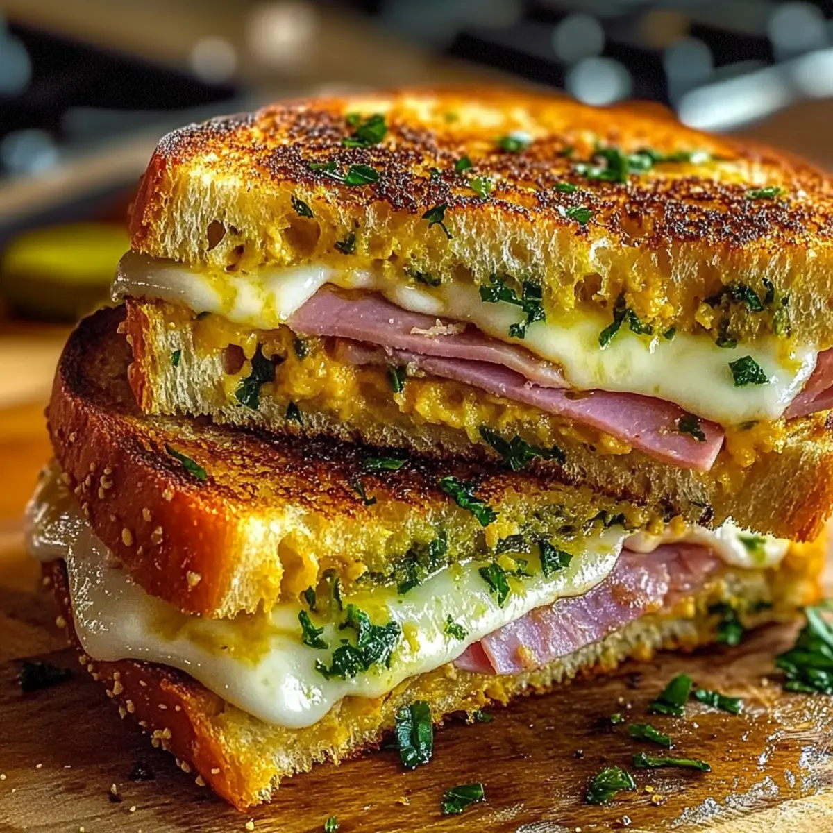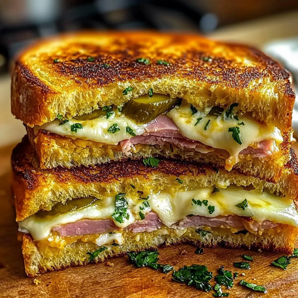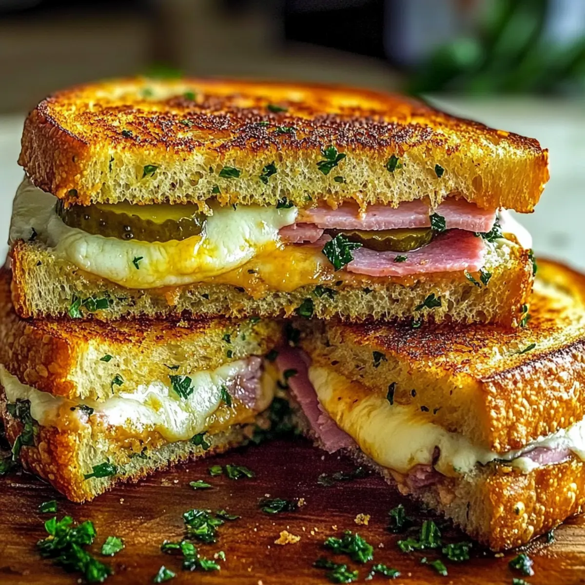Jump to Recipe Print RecipeAs I stood in my kitchen, the warm aroma of sizzling garlic wafting through the air, I couldn’t help but feel a rush of excitement. That’s the magic of cooking—transforming simple ingredients into something extraordinary. Today, I’m thrilled to share my recipe for Bold & Buttery Cuban Garlic Bread Sandwiches, a true feast for the senses. These mouthwatering sandwiches are not only stunningly easy to whip up but are also a delicious escape from the ordinary fast-food routine. With layers of savory meats, gooey cheese, and a crunchy garlic-butter exterior, they promise to be a crowd-pleaser for game nights or quick weeknight dinners. Ready to dive into the world of flavorful comfort? Let’s bring the taste of Cuba to your table! Why Are Cuban Garlic Bread Sandwiches Irresistible? Mouthwatering flavor: Each bite is a delightful explosion of savory meats and gooey cheese, making it a sandwich you’ll crave again and again. Effortless preparation: This recipe is quick and easy, perfect for home cooks of all skill levels. Endless customization: Feel free to swap meats or cheeses; whether it’s smoked ham or roasted pork, there’s a delicious option for everyone! Perfect for gatherings: Ideal for game nights or casual get-togethers, these sandwiches will surely impress your guests. Pair them with plantain chips for the ultimate snack experience! Satisfying crunch: The buttery, garlicky crust contrasts perfectly with the melty interior, ensuring a delightful texture in every bite. Cuban Garlic Bread Sandwich Ingredients • A mouthwatering fusion awaits! For the Garlic Butter 3 tablespoons unsalted butter, softened – Ensures a rich, creamy spread that’s perfect for grilling. 2 cloves garlic, minced – Fresh garlic elevates the flavor, creating a fragrant aroma. 1 tablespoon fresh parsley, chopped – Adds a pop of color and subtle freshness to the garlic butter. For the Sandwich 4 slices Cuban bread – Provides a sturdy base with a delightful crunch; can substitute with crusty French or sourdough bread. 4 slices smoked ham – Delivers savory depth, though turkey or roast beef can be used as a lighter alternative. 4 slices salami or roasted pork – Adds additional richness; feel free to choose based on your taste preferences or dietary needs. 4 slices mozzarella or Swiss cheese – Melts beautifully, creating that gooey texture; avoid hard cheeses that don’t melt well. 8 pickle slices – Introduces a tangy contrast; increase quantity for extra zing or use dill for a sharper flavor. 2 teaspoons yellow mustard – Infuses a hint of acidity; consider Dijon mustard for a sophisticated twist or skip for a milder taste. Exploring these Cuban Garlic Bread Sandwiches could transform your mealtime into a fiesta of flavor that you and your loved ones will cherish! Step‑by‑Step Instructions for Bold & Buttery Cuban Garlic Bread Sandwiches Step 1: Prepare garlic butter In a small bowl, combine the softened unsalted butter, minced garlic, and chopped parsley. Use a fork to mix until fully blended, resulting in a fragrant and creamy garlic butter. This mixture is the key to creating the deliciously rich flavor in your Cuban Garlic Bread Sandwiches, so be sure it’s well combined. Step 2: Prep the bread Slice the Cuban bread into halves, creating a top and bottom for each sandwich. Generously brush the garlic butter mixture on the cut sides of the bread, ensuring an even coating. This step not only adds flavor but also contributes to that irresistible garlic aroma as the sandwiches grill. Step 3: Layer flavor On the bottom half of each buttered Cuban bread slice, spread a thin layer of yellow mustard for a touch of acidity. Then, layer on the smoked ham, followed by the salami or roasted pork, ensuring even distribution. Top with pickle slices and the mozzarella or Swiss cheese, creating a flavorful and satisfying stack. Step 4: Assemble sandwiches Carefully place the top half of the bread on each sandwich, ensuring the buttered sides face outward. Gently press down to help the ingredients meld and stay in place while grilling. This will create a cohesive Cuban Garlic Bread Sandwich that’s packed with flavor in every bite. Step 5: Grill sandwiches Preheat a cast iron skillet over medium heat. Once hot, place the assembled sandwiches in the skillet, pressing down slightly with a spatula. Grill for about 3-4 minutes or until the bread is golden brown and crispy, and the cheese is melty and gooey. Flip the sandwiches and repeat the grilling process on the other side. Step 6: Serve Once both sides are perfectly grilled, remove the sandwiches from the skillet and let them rest for about 1 minute. Slice the sandwiches in half to reveal the gooey insides, and serve immediately. These Bold & Buttery Cuban Garlic Bread Sandwiches are a delightful treat that’s sure to impress anyone at your table! What to Serve with Bold & Buttery Cuban Garlic Bread Sandwiches These flavorful delights are just the beginning of a satisfying culinary experience, perfect for any mealtime gathering. Plantain Chips: Their crispy texture brings a delightful crunch, complementing the soft, melty insides of the sandwiches beautifully. Crisp Coleslaw: This refreshing side adds a tangy crunch and balance, cutting through the richness of the garlic butter and meats. French Fries: A classic pairing, golden fries offer a satisfying crunch that pairs perfectly with the savory flavors of the sandwiches. Sweet Potato Wedges: The natural sweetness of roasted sweet potato wedges contrasts nicely with the salty layers of the Cuban Garlic Bread Sandwiches, creating a harmonious balance. Mango Salsa: Bright, zesty, and slightly sweet, mango salsa is a vibrant addition that brings freshness to each bite, enhancing the overall meal experience. Iced Tea or Lemonade: Quench your thirst with a tall glass of iced tea or refreshing lemonade; their bright acidity complements the savory sandwich flavors perfe