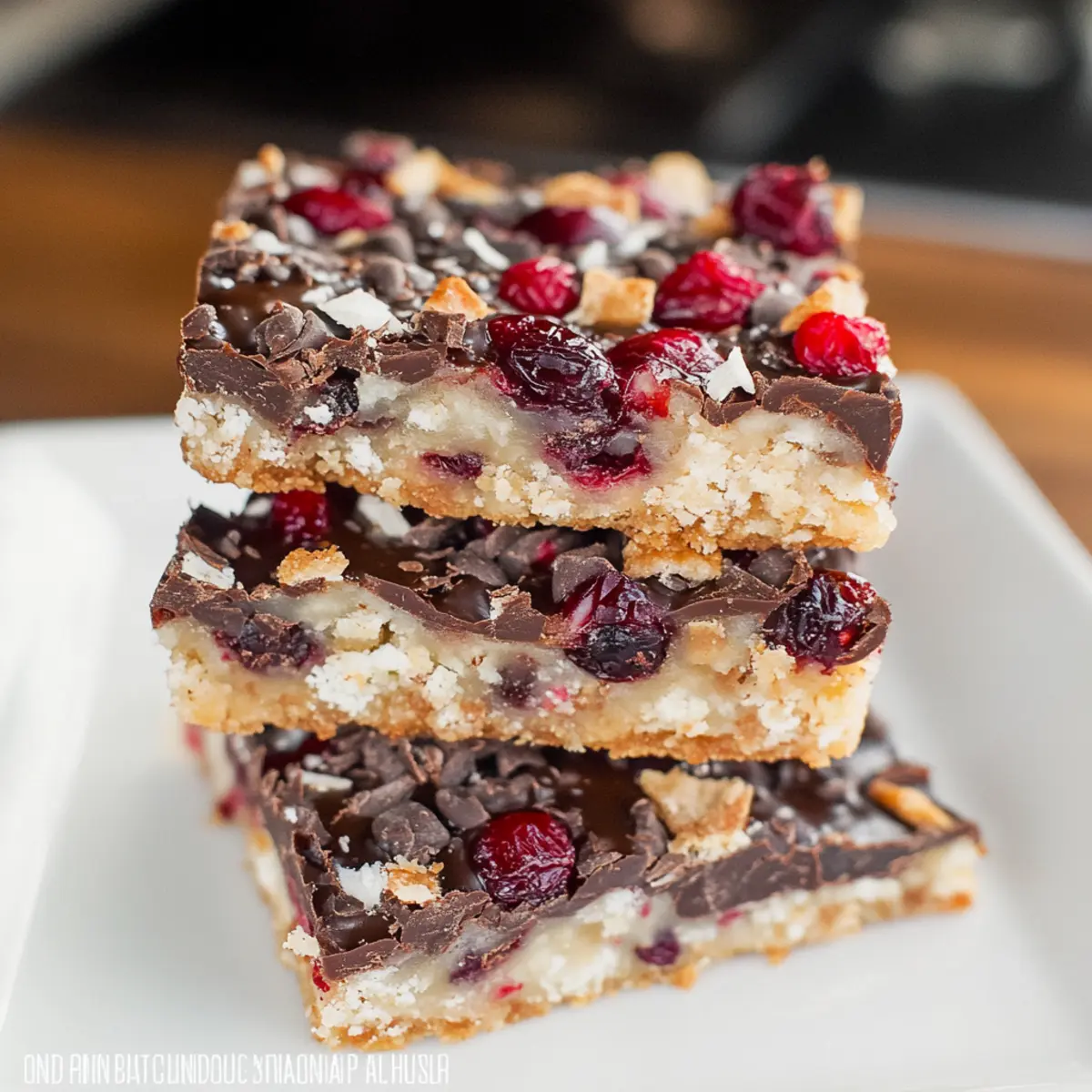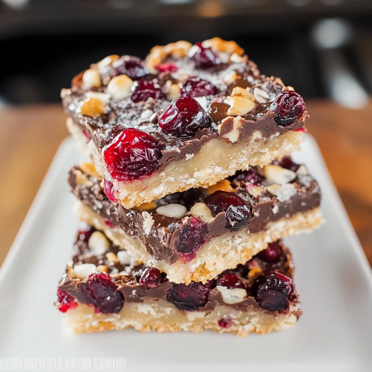 Jump to Recipe Print RecipeThe kitchen was filled with the sweet, nutty aroma of baking as my friends gathered for a cozy holiday celebration. The star of the show? My freshly made Dark Chocolate Cranberry Magic Bars. This easy dessert recipe is a delightful fusion of sweet and tart, wrapping up the festive spirit in every chewy, gooey bite. With the rich decadence of dark chocolate and the zing of cranberries, these bars are designed to impress at any holiday gathering or serve as thoughtful gifts. Plus, they require minimal prep time—perfect for busy home chefs like us. Want to elevate your dessert game this season? Let’s dive into the magic of these bars and create something truly special together! Why Are These Bars So Irresistible? Indulgent Flavors: Each bite bursts with rich dark chocolate and tart cranberries, creating a harmonious balance that will sweep you away! Effortless Preparation: This recipe is incredibly simple, making it perfect for both beginner and seasoned bakers. You won’t spend hours in the kitchen, allowing you to enjoy more sweet moments with loved ones. Versatile Options: Feel free to get creative! Substitute nuts or dried fruits to match your taste. For example, try these with Apple Cranberry Coleslaw for a fresh twist at your holiday table. Crowd-Pleaser: Perfect for gatherings, these bars are guaranteed to impress guests, making them a hit at every party or family reunion. Make-Ahead Delight: Whether for gift-giving or personal indulgence, these no-fuss bars can be prepared in advance and stored conveniently in the fridge! Elevate your dessert game this season with these delectable creations! Dark Chocolate Cranberry Magic Bars Ingredients • Discover the magic behind these bars! For the Crust Cold, Cubed Unsalted Butter – Essential for providing richness and a tender texture to the crust. Powdered Sugar – Adds sweetness and ensures the crust is delightfully soft. All-Purpose Flour – Forms the base, giving structure to these mouthwatering bars. For the Filling Dark Chocolate Chips – Offers a rich flavor that beautifully contrasts with the cranberries. Dried Cranberries – Provides a chewy texture and a burst of tartness that complements the chocolate. Shredded Coconut – Adds a tropical note and chewy goodness (optional for those with allergies). Chopped Pecans – Enhances the crunch; feel free to swap with walnuts or omit for nut-free needs. Sweetened Condensed Milk – Acts as a binding agent, adding creaminess and sweetness to the filling. These Dark Chocolate Cranberry Magic Bars are sure to bring joy to your holiday table! Step‑by‑Step Instructions for Dark Chocolate Cranberry Magic Bars Step 1: Preheat the Oven Begin your journey to delicious Dark Chocolate Cranberry Magic Bars by preheating the oven to 350°F (175°C). This step is crucial for ensuring that your bars bake evenly and become perfectly gooey. As the oven warms up, prepare your ingredients and gather a greased 9×13″ baking pan for the crust. Step 2: Make the Crust Mixture In a large mixing bowl, combine the cold, cubed unsalted butter, powdered sugar, and all-purpose flour. Use a fork or pastry cutter to mix until the mixture resembles small pea-sized crumbs. This process should take about 3-5 minutes, so keep an eye out for that crumbly texture, which is essential for a tender crust. Step 3: Bake the Crust Firmly press the crumb mixture evenly into the greased 9×13″ pan to create a solid base for your bars. Once evenly spread, bake in the preheated oven for 12 minutes. The crust should turn a light golden color, indicating it’s ready for the next layer of luscious ingredients. Step 4: Add the Toppings Carefully remove the baked crust from the oven and immediately sprinkle the dark chocolate chips, dried cranberries, shredded coconut, and chopped pecans evenly over the surface. This colorful layer adds both flavor and texture to your Dark Chocolate Cranberry Magic Bars, creating a delightful visual display. Step 5: Pour the Sweetened Condensed Milk Drizzle the sweetened condensed milk over the toppings, ensuring even coverage. This sweet, creamy layer binds all the ingredients together, enhancing the delightful gooeyness of your bars. Make sure everything is well-coated before returning the pan back to the oven. Step 6: Bake to Perfection Return the layered pan to the oven and bake for an additional 18 minutes. Keep an eye on the bars; you want the topping to look bubbly and slightly golden around the edges. This is when the magic happens, and the aromas fill your kitchen! Step 7: Cool and Cut Once baked, remove your Dark Chocolate Cranberry Magic Bars and allow them to cool completely in the pan. This cooling time is crucial for setting the bars, making them easier to cut into squares without falling apart. Patience is key; let them cool for at least 1 hour. Step 8: Store for Freshness After the bars have cooled, slice them into squares and store covered in the refrigerator. This helps maintain their freshness and the delightful chewy texture. Your Dark Chocolate Cranberry Magic Bars are now ready to be enjoyed at gatherings or as a special treat for yourself! Expert Tips for Dark Chocolate Cranberry Magic Bars Perfectly Cold Butter: Use very cold, cubed unsalted butter to achieve a flaky crust. This step prevents the crust from becoming too dense. Cooling Time Matters: Allow the bars to cool completely before cutting them into squares. This crucial step ensures they hold their shape and don’t crumble. Baking Watch: Keep an eye on the baking time; over-baking can lead to dry bars. Ideally, look for a bubbly top that’s golden around the edges. Creative Toppings: Feel free to get creative! Adding extra toppings like a drizzle of white chocolate can enhance both flavor and presentation of your Dark Chocolate Cranberry Magic Bars. Storage Tips: To maintain their freshness, store the bars covered in the refrigerator. They taste even better after a day or two 