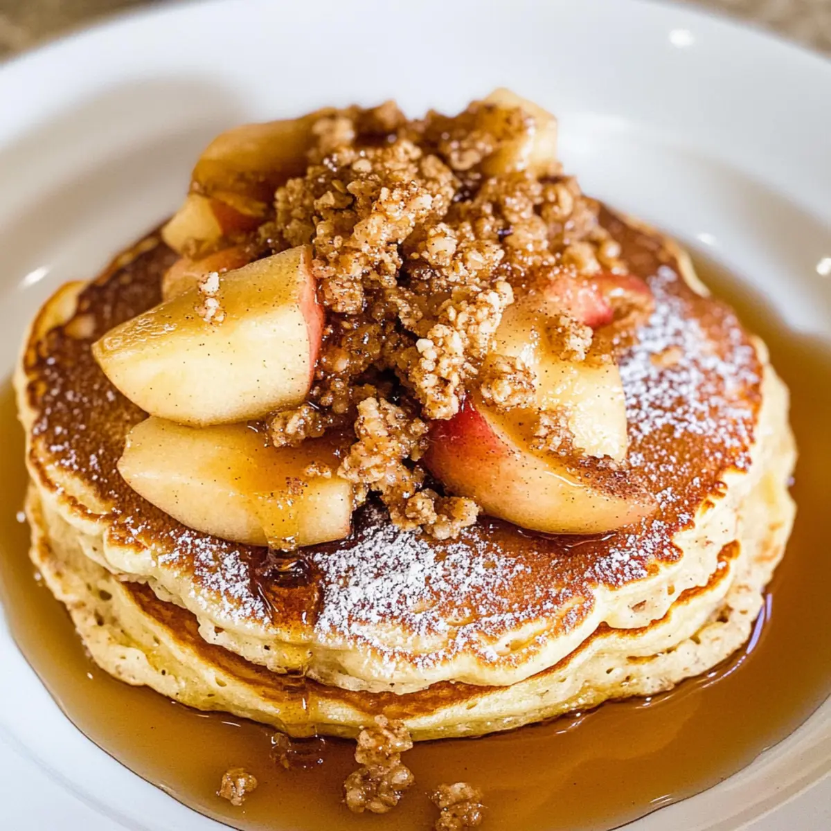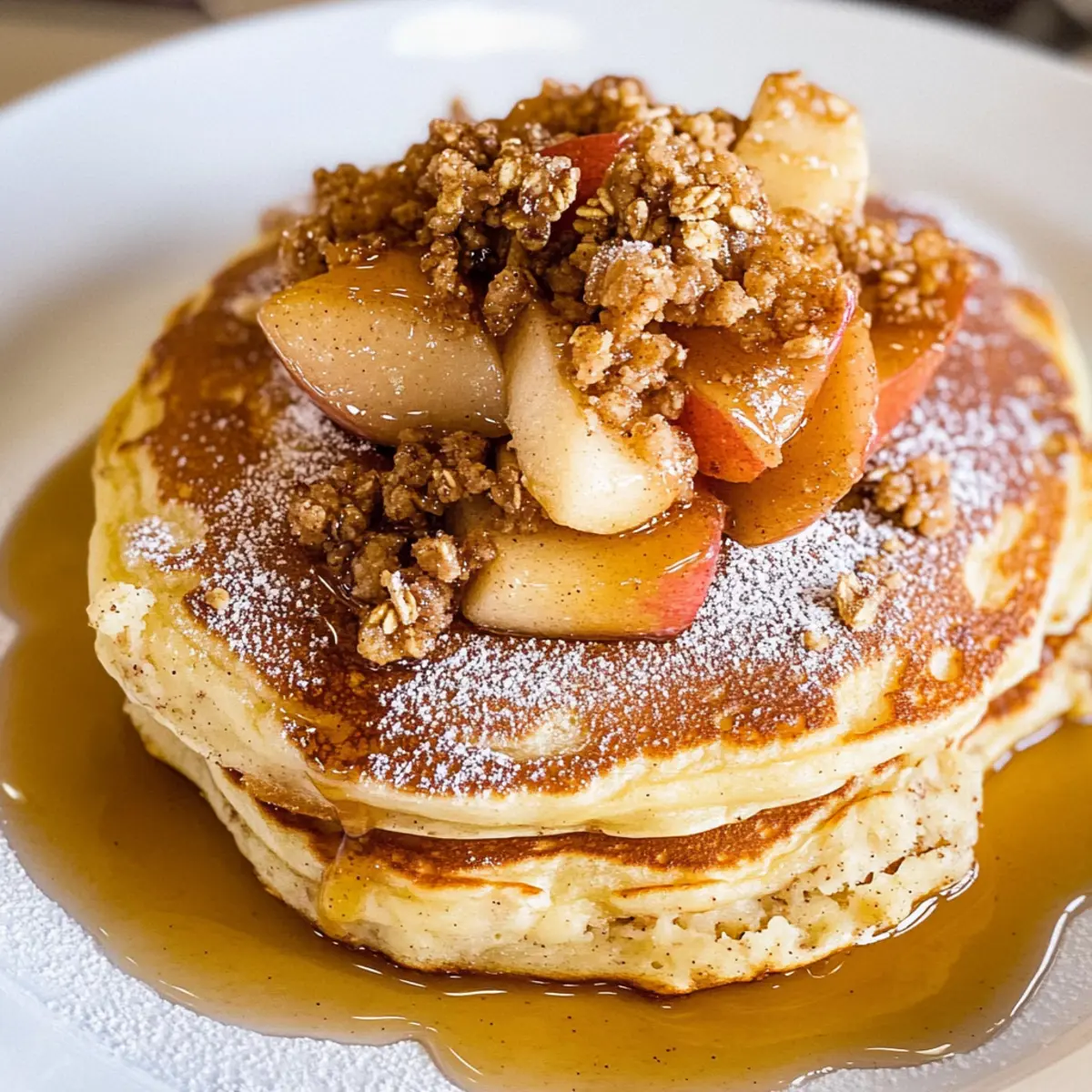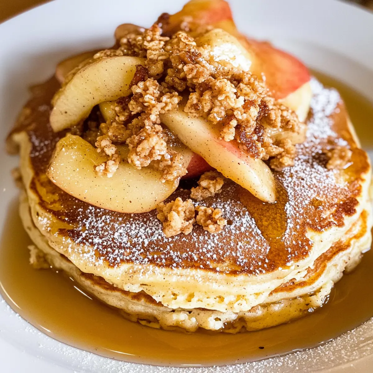 Jump to Recipe Print RecipeAs I stood in my kitchen, the aroma of cinnamon and warm apples instantly transported me back to my favorite Disneyland mornings. There’s something magical about starting the day with a stack of Disneyland Apple Granola Pancakes on your plate. Fluffy buttermilk pancakes embellished with roasted apples and crunchy granola are not just a breakfast; they’re a family-friendly feast that livens up any morning, whether you’re racing against the clock or enjoying a leisurely brunch. This high-protein delight is incredibly simple to whip up, making it an excellent choice for anyone looking to escape the grip of fast food. Ready to recreate a little taste of that enchanting park experience in your own home? Let’s dive in! Why Are Disneyland Pancakes So Special? Magic in Every Bite: These Disneyland Apple Granola Pancakes bring a taste of the happiest place on earth right to your breakfast table. Family-Friendly Delight: Perfect for kids and adults alike, these pancakes will have everyone coming back for seconds. Easy Preparation: You’ll love how simple it is to whip up this high-protein breakfast, making busy mornings feel special. Versatile Options: Whether you prefer whole wheat, or sour cream pancakes, this recipe offers variations to suit your palate. Gourmet Touch: The combination of roasted apples and crunchy granola transforms ordinary pancakes into an extraordinary morning treat. For a refreshing side, consider pairing with a delightful Apple Iced Tea to complete your breakfast experience! Disneyland Apple Granola Pancake Ingredients • Get ready to create a breakfast masterpiece! For the Pancakes Sifted Flour – Provides structure to the pancakes; you can use whole wheat flour for a healthier twist. Baking Powder – Helps pancakes rise; don’t substitute it solely with baking soda as it alters the texture. Baking Soda – Works with buttermilk for fluffiness; essential for achieving that perfect pancake consistency. Salt – Enhances flavor; if you’re on a low-sodium diet, feel free to omit it. Sugar – Adds the right level of sweetness; opt for maple syrup for a natural alternative. Buttermilk – Infuses moisture and tanginess; use milk with vinegar as a quick substitute if needed. Eggs – Bind ingredients and add richness; substitute with flax eggs for a vegan option. Butter (unsalted) – Adds moisture and flavor; can be swapped with coconut oil for a dairy-free version. For the Roasted Apples Granny Smith Apple – Offers a delightful tartness; Honeycrisp apples make a great alternative if you prefer a sweeter bite. Cinnamon – Adds warm spice notes; feel free to mix in nutmeg for a cozy twist. Sugar & Brown Sugar – Enhances sweetness for the apples; adjust according to your taste preferences. For the Toppings Nature Valley Granola Bar – Provides a crunchy texture; any granola of your choice will work. Maple Syrup – A touch of sweetness; optional if your granola is already sweetened. Powdered Sugar – A sprinkling for garnish; omit for a healthier presentation or simply to keep it rustic. Now you’re all set to create these scrumptious Disneyland Apple Granola Pancakes! Enjoy the delightful process and the amazing flavors that await you! Step‑by‑Step Instructions for Disneyland Apple Granola Pancakes Step 1: Prepare Roasted Apples In a skillet, melt 1 tablespoon of unsalted butter over medium heat. Add sliced Granny Smith apples, a sprinkle of cinnamon, and a mix of white and brown sugars. Cook for about 5-10 minutes, stirring occasionally, until the apples are soft and beautifully caramelized. The warm apple aroma will create a cozy atmosphere in your kitchen, setting the perfect tone for your Disneyland Apple Granola Pancakes. Step 2: Mix Dry Ingredients In a large mixing bowl, whisk together 1 cup of sifted flour, 2 teaspoons of baking powder, 1/2 teaspoon of baking soda, 1/4 teaspoon of salt, and 1 tablespoon of sugar. Make sure there are no lumps by sifting the flour beforehand. This dry mixture forms the base of your pancakes and should be light and airy to help achieve that fluffy texture upon cooking. Step 3: Combine Wet Ingredients In a separate bowl, whisk together 1 cup of buttermilk and 1 large egg until smooth. Incorporate 2 tablespoons of melted unsalted butter, ensuring it has slightly cooled down. The combination of wet ingredients will add moisture and richness to your pancake batter, and will contribute to the delightful fluffiness of your Disneyland Apple Granola Pancakes. Step 4: Combine Mixtures Pour the wet ingredients into the bowl with the dry mixture. Gently stir until just combined—be careful not to overmix, as this can lead to dense pancakes. It’s perfectly fine if there are some streaks of flour remaining, as this will ensure a tender texture. Your pancake batter should be thick and luscious, perfect for frying up light and fluffy pancakes. Step 5: Cook Pancakes Heat a nonstick skillet or griddle over medium heat, lightly greased if necessary. Pour about 1/4 cup of batter for each pancake onto the skillet. Cook until small bubbles form on the surface and the edges start to look set, about 2-3 minutes. Carefully flip each pancake and cook for an additional 2-3 minutes, or until both sides are golden brown and inviting. Step 6: Serve Stack the fluffy pancakes on a warm plate, generously topped with the roasted apples from Step 1. For an extra crunch, sprinkle crushed Nature Valley granola over the top. Finish by dusting with powdered sugar and a drizzle of maple syrup, creating a deliciously tempting serving of Disneyland Apple Granola Pancakes that you can’t resist. Variations & Substitutions for Disneyland Apple Granola Pancakes Feel free to experiment with these ideas to make the recipe truly your own; the flavors are just waiting to be explored! Whole Wheat: Substitute all-purpose flour with whole wheat flour for added fiber and a nuttier flavor. Sour Cream: For richness, replace buttermilk