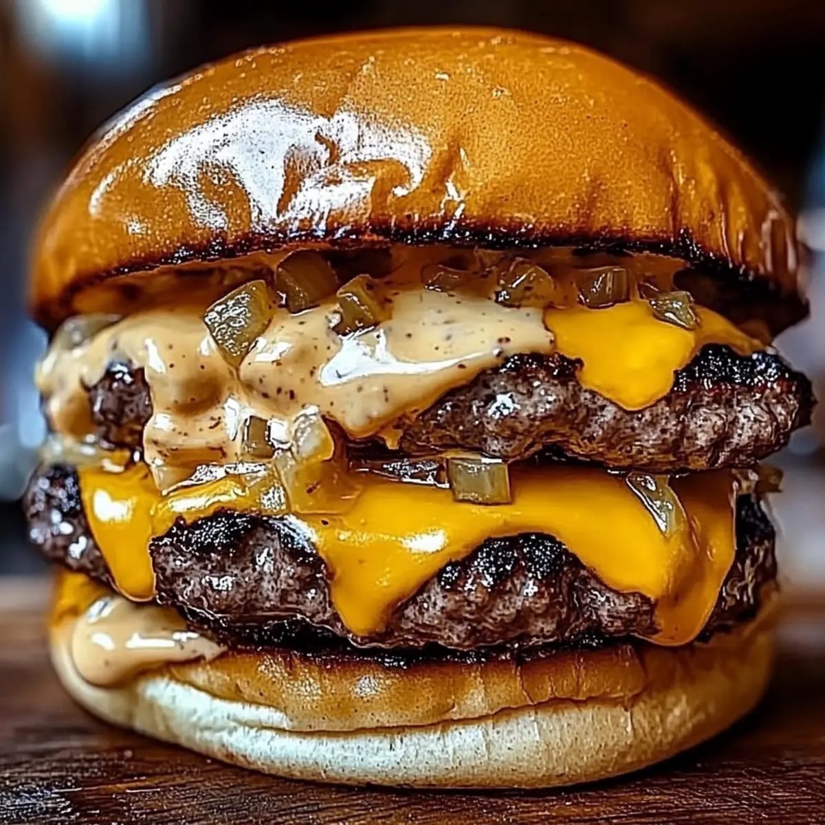 6. Assemble the Burger: Spread the sauce on the bottom bun, add onions, then stack the two patties. Top with the other half of the bun.