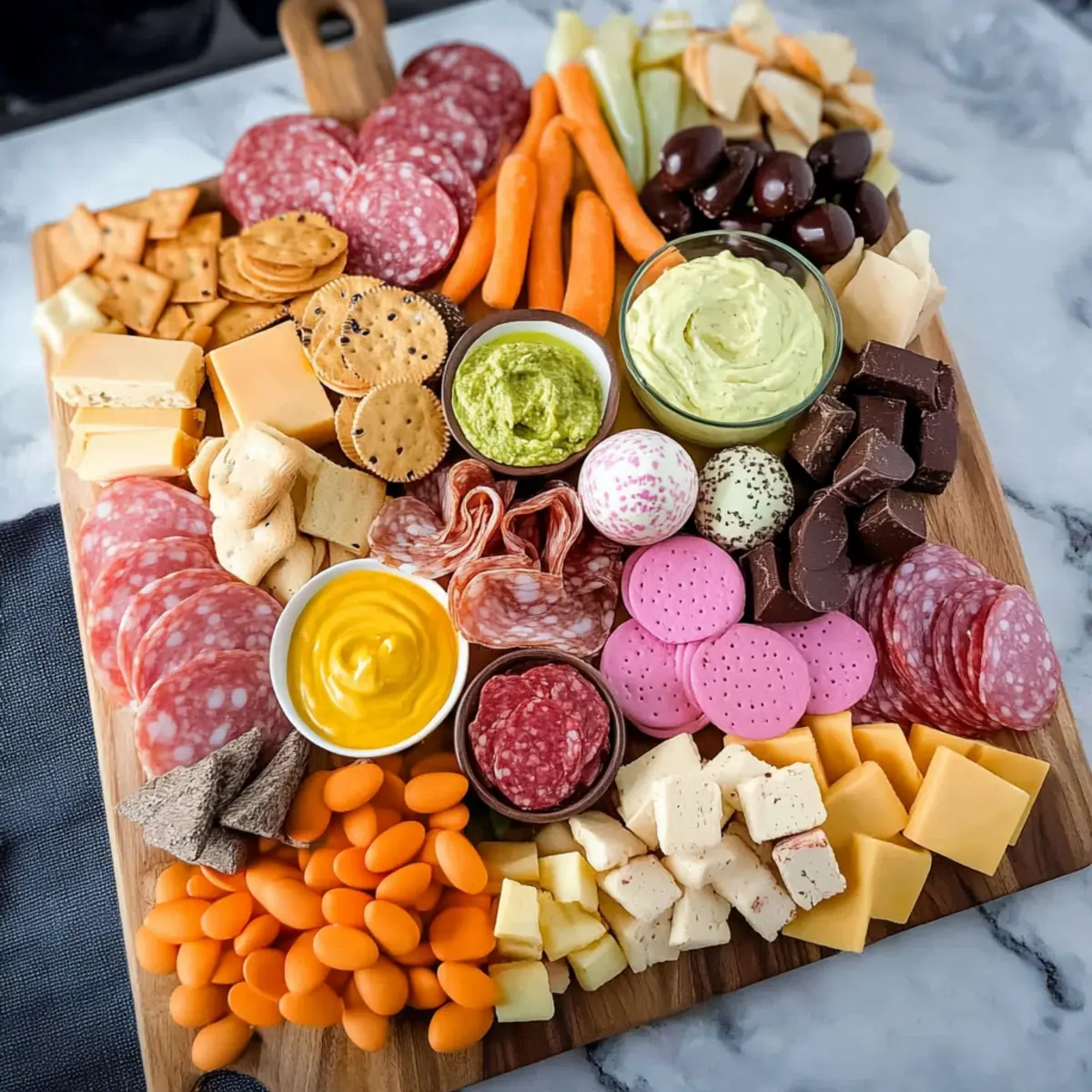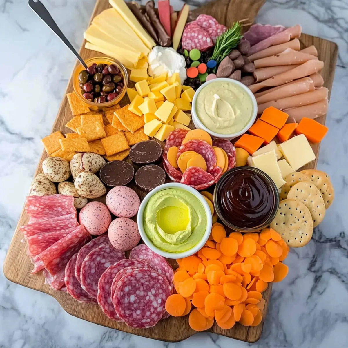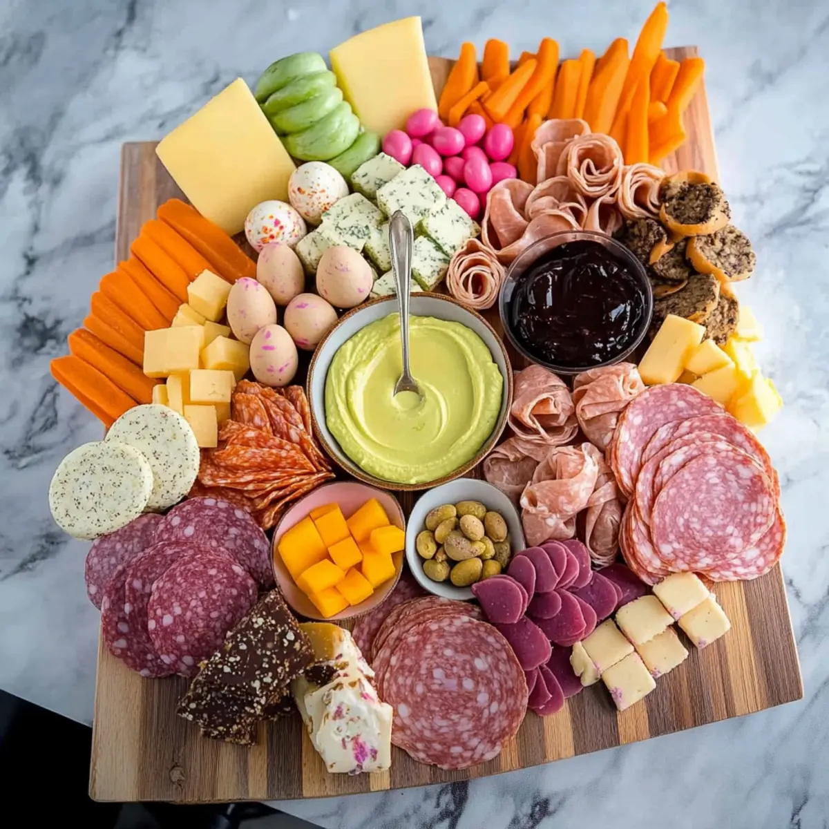 Jump to Recipe Print RecipeAs I wandered through the vibrant aisles of my local market, the colorful display of fresh produce and artisanal cheeses caught my eye, sparking an idea for this year’s gathering. The Easter Charcuterie Platter is not just an appetizer; it’s a celebration of flavor and creativity. Perfect for a festive occasion, it allows you to mix and match ingredients, making it an ideal option for both traditionalists and those exploring gluten-free or vegan alternatives. This customizable board not only caters to your guests’ dietary needs but also promises to be an eye-catching centerpiece for your table. Are you ready to craft a colorful and delicious spread that’s sure to impress? Let’s dive in! Why is this Charcuterie Platter a Must-Try? Customizable Variety: This Easter Charcuterie Platter allows endless creativity—swap ingredients based on your personal tastes or dietary needs! Visually Stunning: Arrangement is key; a colorful spread of vibrant meats, cheeses, and fresh veggies makes for an eye-catching centerpiece. Easy to Assemble: With no cooking required, you can assemble this dish in minutes, making it a stress-free option for last-minute entertaining. Crowd-Pleasing Delight: A crowd favorite, this platter caters to everyone—guests will love mingling and grazing over an array of flavors. Seasonal Freshness: Use seasonal fruits and herbs to celebrate the spring season, ensuring your platter echoes the joy of Easter gatherings. Enhance your platter experience by trying out these essential charcuterie tips for presentation ideas that dazzle! Easter Charcuterie Platter Ingredients For the Meats • Calabrese Salami – Adds a spicy kick to the platter. Substitution: Any cured meat. • Prosciutto – Offers a rich, savory flavor. Substitution: Serrano ham or other dry-cured meats. • Capocollo – Enhances the board with a unique spice profile. Substitution: Any similar cured meat. For the Cheeses • Havarti (cubed) – Provides a creamy texture. Substitution: Gouda or creamy Cheddar. • Gouda (sliced) – Adds a nutty flavor. Substitution: Gruyere or Colby Jack. For the Fruits and Sweets • Candied Orange Slices – Introduce sweetness and color. Substitution: Other candied fruits like lemon or grapefruit. • Dried Mango Slices – Brings a chewy sweetness. Substitution: Any dried fruit like apricot or figs. • Dried Coconut Strips – Adds a tropical twist. Substitution: Almond slices or other nuts. For the Vegetables • Bell Peppers (sliced) – Contributes crunch and freshness. Substitution: Any crunchy veggie, like cucumbers or radishes. For the Dips • Avocado Tzatziki Dip – A flavorful and creamy accompaniment. Substitution: Hummus or any nut-based dip. • Lemon Curd – Provides a sweet citrusy dip. Substitution: Cream cheese or any citrus spread. For the Crackers and Cookies • Almond Crackers – Serve as a gluten-free base. Substitution: Any crackers or bread. • Ginger Snaps – Add spice and crunch. Substitution: Other spiced cookies or biscuits. • Pastel Shortbread Cookies – Brings sweetness and color. Substitution: Any colorful cookies. • Lemon Squares – Offer a zestful touch. Substitution: Any tart dessert. • Macarons – Introduce a French sweet element. Substitution: Other bite-sized desserts like petit fours. • Peanut Butter Cups – For a sweet, nostalgic treat. Substitution: Chocolate-covered almonds or truffles. • Caramels – Add a rich, chewy texture. Substitution: Chocolate-covered caramels. • Toffee – Provides crunch and sweetness. Substitution: Almonds or other sweet nuts. • Jelly Candies – Provide a chewy, fruity candy option. Substitution: Any soft candy. • Pirouette Cookies – Add crunch and elegance. Substitution: Any rolled wafer cookie. Feel inspired by these Easter Charcuterie Platter ingredients to create a vibrant, customizable feast that pleases every palate! Step‑by‑Step Instructions for Easter Charcuterie Platter Step 1: Prepare the Board Begin by selecting a large, beautiful cutting board or platter that will showcase your Easter Charcuterie Platter. Clean and dry it thoroughly, then lay down a clean parchment paper if desired for easy cleanup. This will provide a clean canvas for arranging all your colorful ingredients. Step 2: Arrange the Meats Start by placing your cured meats on the board. You can fold or roll the Calabrese salami, prosciutto, and capocollo to give them visual interest and texture. Position the meats in clusters, spreading them out to create balance while leaving ample space for other components without overcrowding the platter. Step 3: Add the Cheeses Next, introduce the cheeses to the Easter Charcuterie Platter. Arrange the cubed havarti and sliced gouda around the cured meats, ensuring each cheese has its own space. Aim for contrasting shapes and sizes to create a visually appealing spread. This will entice your guests and invite them to taste each unique flavor. Step 4: Incorporate Fresh Vegetables Now, add the sliced bell peppers for a pop of color and crunchiness. Strategically place them near the meats and cheeses to encourage dipping them into your spreads later. These vibrant vegetables not only enhance the aesthetic appeal but also offer freshness that balances the richness of the meats and cheeses. Step 5: Include Fruits and Sweets Scatter the candied orange slices and dried mango slices across the platter, integrating their sweetness with the savory elements. Consider draping them artistically around the cheese and meats, as their colors will complement the other ingredients beautifully. This step adds vibrant hues and a delightful contrast in flavors to your Easter Charcuterie Platter. Step 6: Set Up Dips and Spreads Place small bowls filled with avocado tzatziki dip and lemon curd conveniently near the corresponding veggies and sweet treats. This will make it easy for guests to reach the dips. For a polished finish, consider fresh herbs 