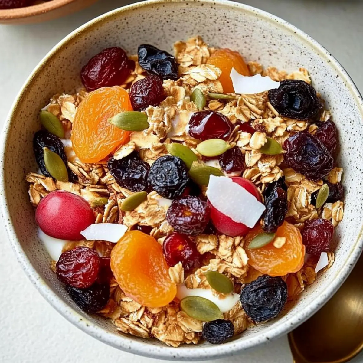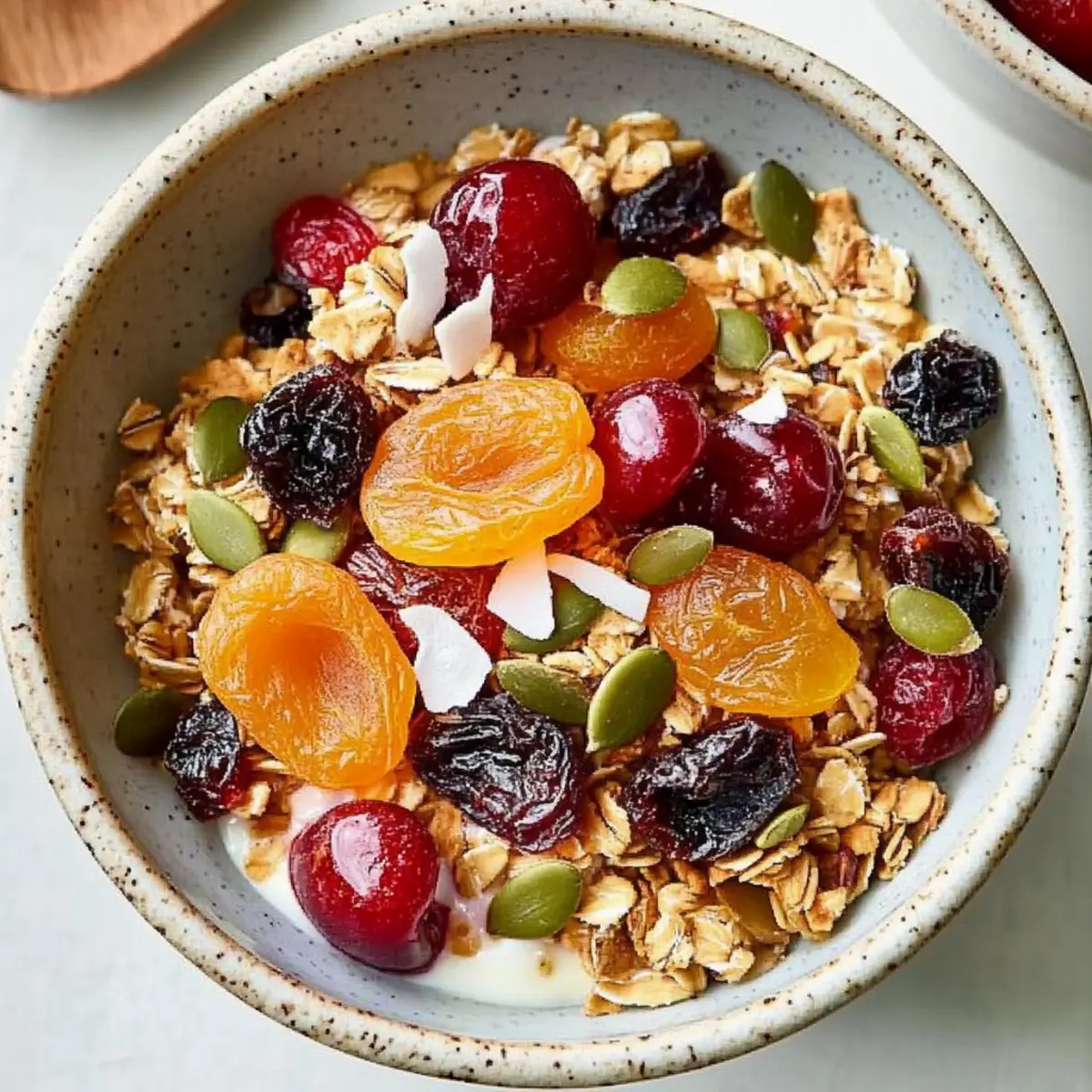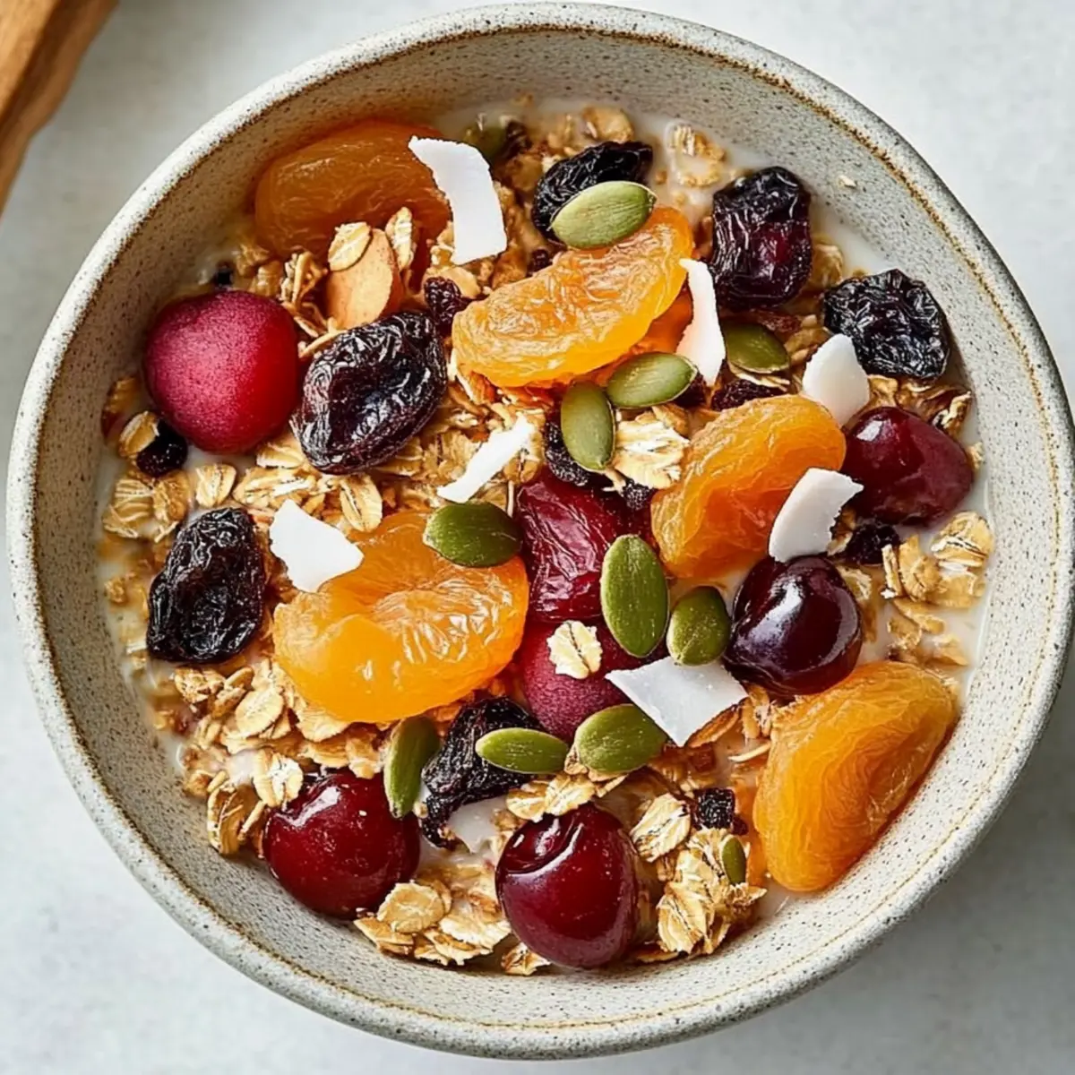 Jump to Recipe Print RecipeEvery morning, just a whiff of toasting oats makes me feel like I’m wrapped in a cozy blanket of healthy comfort. That’s the beauty of my Easy Muesli recipe, where whole grains mingle with seeds, coconut, and a playful mix of dried fruits. This isn’t just any breakfast; it’s a nutritious, make-ahead option that fits seamlessly into busy lives, giving you a delightful kick-start to your day. Whether you’re enjoying it with milk, yogurt, or simply on its own, this high-fiber dish promises not just nourishment but a wonderful crunch that can transform those mundane mornings. So, what fun twists will you add to your own bowl of muesli magic? Why is this Easy Muesli a Must-Try? Versatile Base: You can easily customize this recipe with your favorite grains and fruits, making each batch uniquely yours. Time-Saving: Prepare it in advance, and have breakfast ready for the whole week—just grab and go! Nutritious Fiber: Packed with wholesome ingredients, this muesli is rich in fiber, keeping you satisfied and energized. Crowd-Pleasing: Perfect for families or brunches, it’s a healthy choice everyone will love. For something equally delightful, check out my Mediterranean Chicken Pasta or try the sweet touch of a Rhubarb Puff Tart. Easy to Store: Keep it fresh for up to a month in an airtight container, so you can enjoy your nutritious breakfast whenever you want! Easy Muesli Ingredients • A delightful mix of grains, fruits, and more! For the Base Rolled oats – Provides a comforting base rich in fiber; swap with gluten-free oats for an alternative option. Wheat bran – Boosts fiber content and nutrition; ground flaxseed works well as a substitute. For Flavor Kosher salt – Enhances all the flavors beautifully; no substitutes needed. Ground cinnamon – Offers warmth and depth; try nutmeg for a different twist. For Crunch Sliced almonds – Adds a delightful crunch and healthy fats; sunflower seeds are a great nut-free option. Raw pecans (coarsely chopped) – Contributes richness; replace with walnuts or omit if desired. Raw pepitas (shelled pumpkin seeds) – Adds nutritional benefits; sunflower seeds are an excellent alternative. For Sweetness and Texture Unsweetened coconut flakes – Brings natural sweetness and chew; you can leave it out for a lighter option. Dried apricots (coarsely chopped) – Introduces a sweet touch; raisins or currants are simple replacements. Dried cherries – Infuses a nice tartness; substitute with cranberries for a similar punch. Embrace the magic of Easy Muesli as you mix these wholesome ingredients into a breakfast that promises good health and delightful taste! Step‑by‑Step Instructions for Easy Muesli Step 1: Preheat and Prepare Begin by preheating your oven to 350°F (175°C). While the oven heats up, line two rimmed baking sheets with parchment paper for easy cleanup. This preparation step sets the stage for toasting the oats and nuts, which will enhance their flavors and create that delightful crunch in your Easy Muesli. Step 2: Combine the Base Ingredients On one of the prepared baking sheets, combine rolled oats, wheat bran, kosher salt, and ground cinnamon. Mix these dry ingredients thoroughly to ensure the spices and salt are well distributed. Once combined, spread the mixture into an even layer across the sheet—this helps promote even toasting, which will lead to a perfectly textured muesli. Step 3: Arrange the Nuts and Seeds On the second baking sheet, arrange your sliced almonds, coarsely chopped pecans, and raw pepitas in a single layer. This separation allows them to toast beautifully without steaming. Place both baking sheets in the preheated oven and let them bake for about 10–12 minutes, or until the nuts become fragrant and lightly golden—this will add a rich, nutty flavor to your Easy Muesli. Step 4: Toast the Coconut Flakes After removing the nuts from the oven, add unsweetened coconut flakes to the baking sheet with the oat mixture. Return this tray to the oven and bake for an additional 5 minutes, just until the coconut turns a light golden color. Keep a close eye here to prevent burning, as coconut can toast quickly and add a sweet profile to your muesli. Step 5: Mix Everything Together Once everything has cooled to room temperature, transfer the contents of both baking sheets to a large mixing bowl. Gently break apart any clumps, ensuring the toasted oats, nuts, and coconut are evenly combined. This combination is the heart of your Easy Muesli, and mixing well will allow every bite to have that delightful crunch! Step 6: Incorporate Dried Fruits Next, fold in your coarsely chopped dried apricots and dried cherries (or any other dried fruits you prefer). Toss everything together with care, making sure the fruit is distributed evenly throughout the mixture. This addition of sweetness and chewiness not only enhances the flavor but also completes your nutritious breakfast mix. Step 7: Store Properly Finally, transfer your Easy Muesli into an airtight container, ensuring all air is removed to maintain freshness. Store it at room temperature, where it will stay delicious for up to a month. This thoughtful step lets you grab a wholesome breakfast each day, ready to enjoy either on its own or with milk and yogurt. What to Serve with Easy Muesli? Every bowl of muesli can be elevated into a full-fledged breakfast experience with just a few thoughtful pairings that add flavors and textures. Fresh Berries: Bursting with juice, berries provide a lovely contrast to the chewy muesli, adding a refreshing taste and vibrant color. Greek Yogurt: Creamy and tangy, Greek yogurt not only enhances the meal’s protein content but also provides a luxurious texture that perfectly complements the crunch of the muesli. Sliced Banana: Rich and creamy, banana slices harmonize beautifully with muesli; their natural sweetness rounds out the flavors for a satisfying breakfast. Honey Drizzle: A touch of honey brings sw
