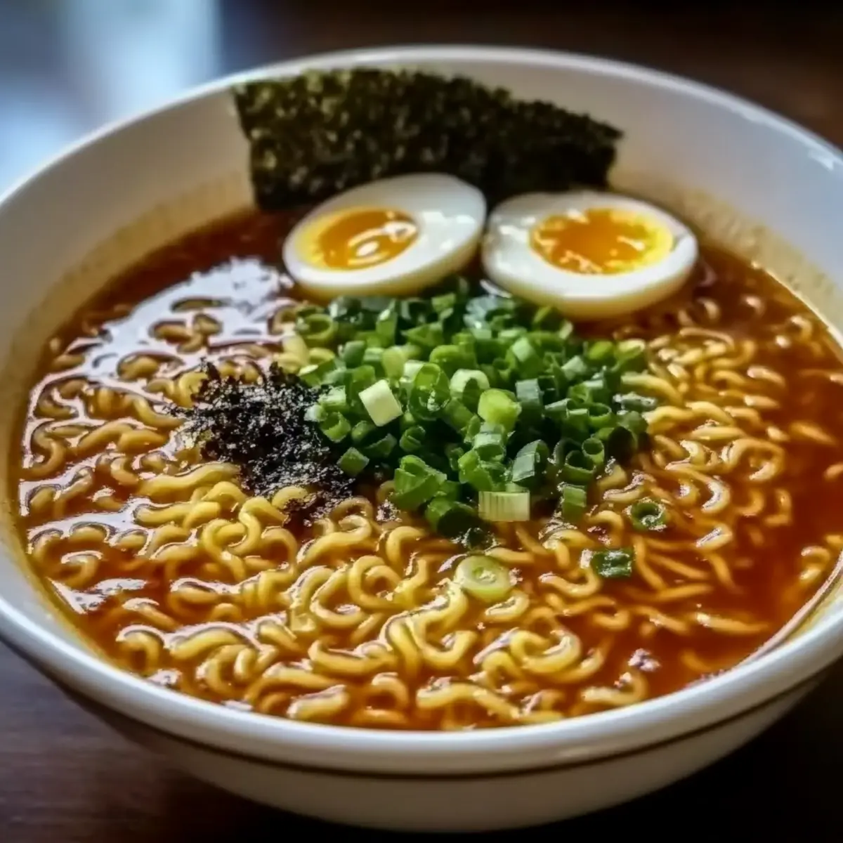 5. Garnish and Serve: Top each bowl with green onions, nori strips, and halved boiled eggs.