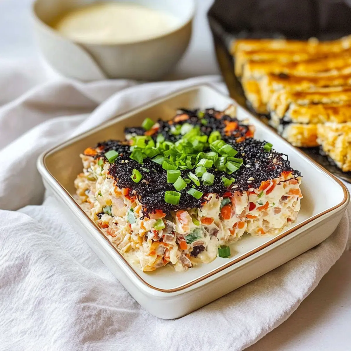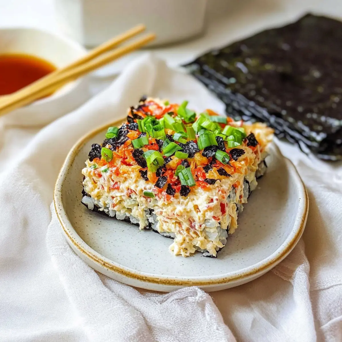Jump to Recipe Print RecipeAs I pulled open the oven door, a warm, savory aroma enveloped my kitchen, instantly transporting me to my favorite sushi bar. This Easy Sushi Bake Recipe takes everything I love about sushi—its flavors, textures, and the joy of sharing—while keeping the prep as simple as can be. In just a matter of minutes, you’ll whip together this delicious deconstructed sushi, perfect for feeding a crowd or a cozy night in. With creamy layers of imitation crab, rich Kewpie mayo, and a sprinkle of umami-packed furikake, this dish is not only quick to prepare but also wonderfully versatile—feel free to swap in your favorite seafood! Are you ready to dive into this unique comfort food experience? Why is this Easy Sushi Bake a Must-Try? Unique Twist: This recipe offers a delightful deconstructed take on sushi, making it perfect for home cooks looking to surprise their guests. Quick Preparation: Made in under 30 minutes, it’s an effortless option for busy weeknights or last-minute gatherings. Versatile Flavors: Customize with your choice of seafood—try tuna or salmon for a fresh spin that everyone will love. Comforting Layers: The creamy texture of cream cheese combined with fluffy sushi rice brings a beautiful comfort food experience, reminiscent of your favorite sushi rolls. Crowd-Pleasing Dish: Share this dish at your next potluck or family dinner, and watch as it becomes the star attraction—everyone will want seconds! For more delicious ideas, check out our Cheesy Baked Ziti or Baked Peanut Butter Cups. Easy Sushi Bake Ingredients For the Bake Imitation Crab – Main protein that shreds easily; substitute with tuna, salmon, or shrimp for a different seafood flavor. Cream Cheese – Adds a creamy texture and binds the mixture; be sure to soften it for easy mixing. Kewpie Mayo – Provides a richer flavor than regular mayo; can be swapped for regular mayonnaise if necessary. Sriracha – Introduces heat that balances the dish’s richness; adjust according to your spice tolerance. Sushi Rice – The sticky base ensuring everything holds together; don’t use non-sticky rice to avoid crumbling. Rice Vinegar – Key for adding tang and improving sushi rice texture; mix while rice is hot for best absorption. Furikake Seasoning – Enhances flavor and adds crunch; can be substituted with sesame seeds or omitted altogether. Green Onions – A fresh garnish that brightens up the dish; feel free to add avocado or cucumber for more depth. Nori Sheets – Essential for scooping your bake, mimicking the sushi experience. Feel free to customize this Easy Sushi Bake recipe with your favorite ingredients for a unique twist! Step‑by‑Step Instructions for Easy Sushi Bake Recipe Step 1: Preheat Your Oven Begin by preheating your oven to 400°F (200°C). This ensures that your Easy Sushi Bake cooks evenly and achieves that perfectly crispy top layer. While the oven is heating up, gather your baking dish—an 8×8 inch dish works perfectly for this recipe. Step 2: Prepare the Crab Mixture In a mixing bowl, shred the imitation crab into bite-sized pieces. Add softened cream cheese, Kewpie mayo, and a swirl of Sriracha to the bowl. Mix everything until well combined and creamy, making sure the flavors meld together beautifully. Set this mixture aside while you prepare the rice. Step 3: Cook the Sushi Rice If you haven’t prepared the sushi rice yet, cook it according to package instructions until fluffy. Once cooked, transfer the hot rice to another bowl and quickly toss it with rice vinegar. This step is crucial for flavor; allow the steam to escape as you gently fold the rice for even seasoning. Step 4: Shape the Rice Base Using your fingers or a spatula, press the sushi rice evenly into the bottom of your baking dish. Make sure it holds its shape and is compact, providing a sturdy base for your Easy Sushi Bake. To elevate the flavor, sprinkle half of the furikake seasoning over the pressed rice. Step 5: Layer the Crab Mixture Carefully spread the creamy crab mixture over the rice base, making sure to cover it evenly. This is where the comfort of the sushi bake really starts to shine. Once covered, sprinkle the remaining furikake seasoning on top for added crunch and umami flavor. Step 6: Add Final Touches For extra richness, drizzle some Kewpie mayo and additional Sriracha on top of your layered bake. This step not only enhances the flavor but also creates a lovely display when baked. Step 7: Bake to Perfection Place the baking dish in the preheated oven and allow it to bake for 25 minutes. Keep an eye on it as it cooks; you’re looking for a beautiful golden top and a bubbly, warm center. The aroma will fill your kitchen, signaling that deliciousness is on the way! Step 8: Garnish and Serve Once baked, remove your Easy Sushi Bake from the oven and let it cool slightly. Garnish with finely chopped green onions to add a fresh pop of color. Serve with nori sheets for scooping and enjoy your delightful creation with family and friends! Easy Sushi Bake Recipe Variations Feel free to get creative and personalize your sushi bake with these fun and tasty twists! Tuna Swap: Use canned tuna instead of imitation crab for a flavorful, protein-packed version that seafood lovers will enjoy. Salmon Delight: Swap out the crab for butter-sautéed salmon chunks, elevating the dish with rich, fresh flavors. Cheesy Indulgence: For a heartier touch, sprinkle shredded cheese on top before baking for a creamy, melty finish. Mango Magic: Add ripe mango strips for a burst of sweetness and a tropical flair, perfectly complementing the savory elements. Veggie Twist: Incorporate diced cucumbers and carrots for an extra crunch, enhancing your sushi bake’s freshness and texture. Spicy Kick: Amp up the heat by mixing in chopped jalapeños with your crab mixture or using spicy mayo instead of Kewpie. Nori Enhancement: Crush up extra nori sheets as a topping before baking for an added layer of flavor an