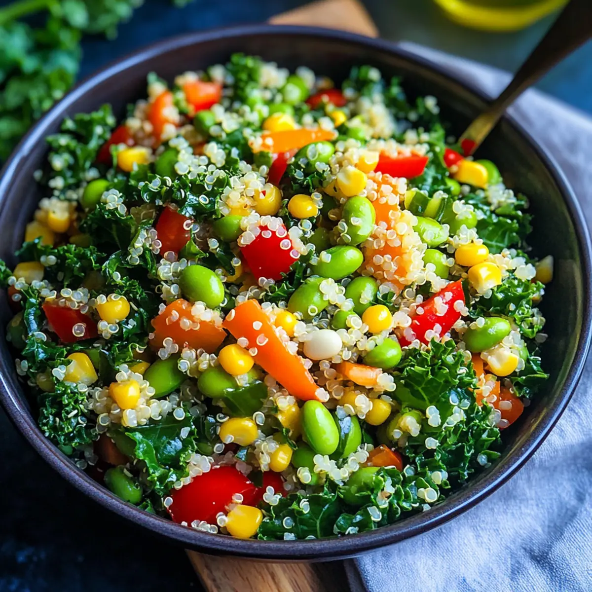 Jump to Recipe Print RecipeAs I tossed the vibrant, fresh ingredients together, I realized that this recipe for Edamame, Corn, and Quinoa Salad has quickly become a go-to favorite in my kitchen. Packed with protein-rich quinoa, sweet kernels of corn, and the delightful crunch of edamame, this colorful dish is not just a feast for the eyes but also a nutritious powerhouse. It’s vegan, gluten-free, and incredibly simple to whip up—perfect for a light lunch or a refreshing side at dinner. Plus, with its quick prep and easy cleanup, it’s a recipe that will have you enjoying homemade goodness without all the hassle. Are you ready to dive into a bowl of health and flavor? Why is this salad a must-try? Vibrant and beautiful, this Edamame, Corn, and Quinoa Salad is a feast for the senses! Nutritious ingredients like protein-packed quinoa and crunchy veggies create a balanced meal. Quick prep means less time in the kitchen, making it perfect for busy days. Ideal as a light lunch or healthy side, it’s a crowd-pleaser that appeals to everyone, whether paired with grilled chicken or served alone. For more delightful salad inspirations, check out my links to Macaroni Salad Flavor or Crunchy Broccoli Salad. Enjoy the deliciousness! Edamame, Corn and Quinoa Salad Ingredients • This refreshing salad brings together vibrant flavors and colors! For the Salad Dry Quinoa – A protein-packed base that gives the salad a hearty texture; consider using red or tri-color quinoa for added visual appeal. Chopped Curly Kale – Provides nutrients and a chewy texture; massage with a little oil and salt to mellow its flavor. Frozen Sweet Corn – Adds a hint of sweetness; steam if frozen or sauté if using fresh to enhance crunch. Frozen Edamame – A great source of plant-based protein; easily cooked from frozen for convenience. Shredded Carrots – Brings vibrant color and natural sweetness to the mix. Bell Pepper – Choose any color for a crunchy addition that also boosts flavor. Green Onion – Contributes a mild onion flavor that brightens up the salad. For the Dressing Avocado Oil or Olive Oil – A healthy fat that enriches the dressing and complements other flavors. Red Wine Vinegar – Adds acidity to balance the salad; can substitute with apple cider vinegar for a different twist. Fresh Chopped Parsley – Brightens the dressing with its fresh herbal notes. Minced Garlic – Elevates the flavor profile of the dressing with a hint of savory depth. Dried Oregano and Basil – Classic Mediterranean herbs that infuse the dressing with aromatic goodness. Sea Salt and Black Pepper – Essential seasonings that enhance all the flavors in the salad. With these simple, wholesome ingredients, your Edamame, Corn and Quinoa Salad will not only be delicious but also a vibrant highlight at any table! Step‑by‑Step Instructions for Edamame, Corn and Quinoa Salad Step 1: Rinse and Prepare Quinoa Begin by rinsing the dry quinoa in a mesh strainer under cold water for about 1-2 minutes to remove any bitterness. Once rinsed, consider toasting the quinoa in a pot over medium heat for 2-3 minutes until it starts to become fragrant, enhancing its nutty flavor. This will provide a delicious foundation for your Edamame, Corn and Quinoa Salad. Step 2: Cook Quinoa Next, add 2 cups of water to the pot with the toasted quinoa and bring it to a boil. Once boiling, reduce the heat, cover, and simmer for 12-13 minutes or until the quinoa is fluffy and the water has been absorbed. Once cooked, remove from heat and allow it to sit covered for an additional 5 minutes to steam, which will improve the texture of the grains. Step 3: Prepare the Kale and Veggies While the quinoa is cooking, wash and chop the curly kale into bite-sized pieces. In a large bowl, massage the chopped kale with a drizzle of healthy oil and a pinch of salt for about 1-2 minutes to soften its flavor. Then, combine the kale with shredded carrots, diced bell pepper, and sliced green onion, creating a colorful mix for your salad. Step 4: Cook Corn and Edamame In the meantime, prepare the frozen sweet corn and edamame according to package instructions. For the corn, if frozen, simply steam for 3-5 minutes until tender. For edamame, boil in water for 4-5 minutes until bright green. Drain both and set aside, ready to bring balance and sweetness to your Edamame, Corn and Quinoa Salad. Step 5: Make the Dressing In a small bowl, whisk together the olive or avocado oil, red wine vinegar, fresh chopped parsley, minced garlic, dried oregano, dried basil, and a pinch of sea salt and black pepper. Ensure all ingredients are well-combined, creating a flavorful dressing that will bring your Edamame, Corn and Quinoa Salad to life with a Mediterranean touch. Step 6: Fluff and Cool Quinoa Once the quinoa is finished cooking, fluff it gently with a fork and season with a bit of sea salt and black pepper. If you prefer a chilled salad, let the quinoa cool for about 15-20 minutes, allowing it to reach room temperature. This cooling phase helps meld all the flavors together for a refreshing final dish. Step 7: Combine Ingredients Once the quinoa is cooled, add it to the bowl with the kale and veggie mixture. Then, pour the prepared dressing over the salad ingredients. Toss everything together gently but thoroughly, ensuring all the quinoa, vegetables, and dressing are well-distributed for optimal flavor in every bite of your Edamame, Corn and Quinoa Salad. Make Ahead Options These Fresh Edamame, Corn, and Quinoa Salads are a lifesaver for busy weeknights! You can prepare the quinoa, steamed corn, and edamame up to 3 days in advance; store them separately in the refrigerator to maintain their texture and freshness. Additionally, you can chop the veggies and make the dressing up to 24 hours ahead; just remember to store the dressing in an airtight container to prevent oxidation. When you’re ready to serve, simply combine everything in a large bowl, toss with the dressing, and y