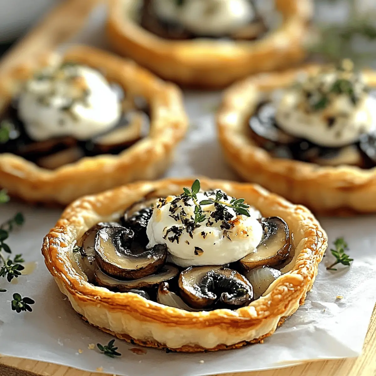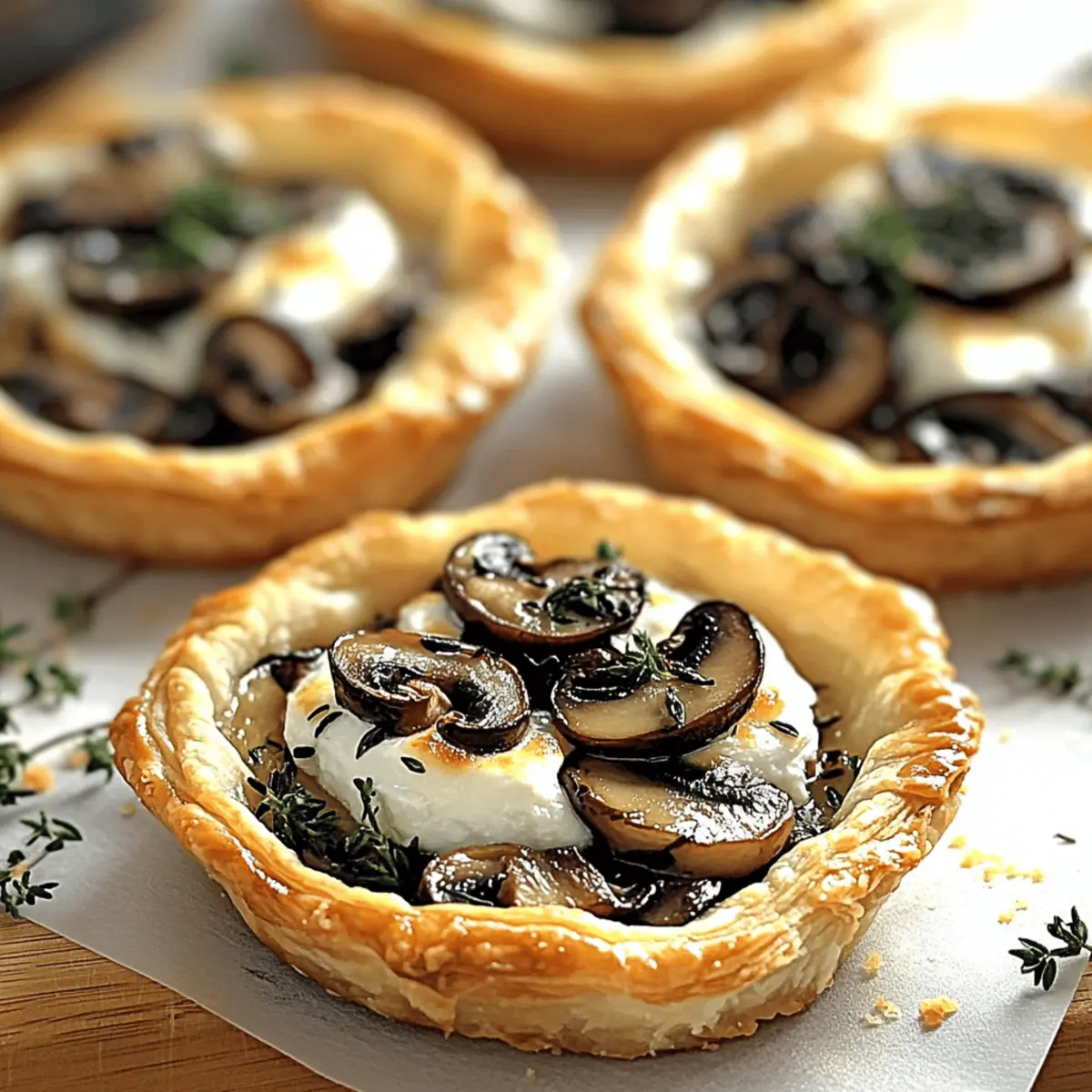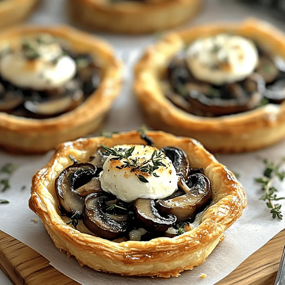 Jump to Recipe Print RecipeAs I stood at the kitchen counter, the rich aroma of sautéed shallots and earthy mushrooms danced through the air, wrapping me in a cozy embrace. That’s when I decided it was time to whip up these elegant Mushroom, Shallot, and Herbed Goat Cheese Tarts. Perfect as a vegetarian appetizer, these easy-to-make delights transform simple ingredients into a show-stopping centerpiece for any gathering. They’re not just visually stunning; with a flaky, golden pastry and a creamy filling, every bite promises to elevate your entertaining game. Plus, they’re incredibly adaptable—feel free to swap in seasonal veggies or your favorite herbs! Curious how these little culinary wonders can dazzle your next dinner party? Let’s get cooking! Why Make Elegant Mushroom Goat Cheese Tarts? Impressive Presentation: These tarts are not just food; they’re a feast for the eyes! The golden puff pastry and colorful filling create a stunning visual that will captivate your guests. Simple Yet Sophisticated: With a straightforward preparation process, even novice cooks can whip these up in no time, making it elegant entertaining a breeze. Versatile Ingredient Options: Feel free to experiment! Use seasonal veggies or your favorite herbs to customize these tarts, ensuring they fit perfectly into your meal plans. Perfect Texture Combination: The flaky pastry paired with the creamy goat cheese filling provides a delightful contrast that is sure to please everyone’s palate. Crowd-Pleasing Flavor: The combination of sautéed mushrooms, shallots, and herbs brings a savory depth that keeps them coming back for more—ideal for impressing guests at your next gathering! Consider pairing them with a light salad or a charcuterie board for a complete entertaining experience. Elevate your appetizer game with these tarts and leave the fast food behind! Elegant Mushroom Goat Cheese Tart Ingredients These delightful tarts will take your entertaining to the next level! For the Pastry Puff Pastry – This forms the flaky base of your tarts; phyllo dough can be substituted for a lighter crunch. For the Filling Mushrooms (8 oz) – Opt for cremini or button mushrooms; shiitake or portobello can offer a richer flavor. Shallots (2 medium) – Provide a lovely mild sweetness; red onion works in a pinch but alters the flavor profile. Garlic (2 cloves, minced) – Enhances aroma; freshly minced is best, with powdered as a backup. Goat Cheese (8 oz, softened) – The creamy star ingredient; ricotta for a milder taste or sharp cheddar for a twist are great substitutes! Fresh Herbs (2 tbsp, chopped) – Use thyme or rosemary for flavor; dried can substitute at a lesser quantity (1 tbsp). Olive Oil (2 tbsp) – Excellent for sautéing; butter brings a richer flavor, if you prefer. Salt and Pepper – Essential for enhancing the overall taste of your filling. Make sure to gather these ingredients to craft your Elegant Mushroom Goat Cheese Tarts that will wow your guests! Step‑by‑Step Instructions for Elegant Mushroom Goat Cheese Tarts Step 1: Preheat Your Oven Begin by preheating your oven to 400°F (200°C). This ensures that your Elegant Mushroom Goat Cheese Tarts will bake evenly, resulting in a perfectly golden and flaky crust. While the oven heats up, prepare your workspace by gathering all your ingredients and equipment, including a baking sheet lined with parchment paper. Step 2: Prepare the Puff Pastry On a lightly floured surface, roll out your thawed puff pastry until it’s about ¼ inch thick. Using a circular or square cutter, cut out pieces measuring 3-4 inches across, then place them carefully on your prepared baking sheet. This base will form the delightful foundation of each tart. Keep the pastry chilled while you prepare the filling to ensure it puffs up beautifully in the oven. Step 3: Sauté the Vegetables In a skillet, heat 2 tablespoons of olive oil over medium heat. Add the finely chopped shallots and sauté until they turn translucent, stirring occasionally for about 3-4 minutes. Then, introduce the minced garlic and diced mushrooms, cooking until the mushrooms are tender and lightly browned, around 5-7 minutes. Season the mixture generously with salt and pepper to enhance the flavors of your filling. Step 4: Mix the Filling Together In a medium bowl, combine the sautéed vegetable mixture with 8 ounces of softened goat cheese along with 2 tablespoons of chopped fresh herbs. Stir until all the ingredients are well blended, creating a creamy and flavorful filling for your Elegant Mushroom Goat Cheese Tarts. This mixture should be rich and aromatic, reminiscent of a savory hug. Step 5: Assemble the Tarts Take each puff pastry piece and make a small indentation in the center using your fingers or the back of a spoon, creating a little well for the filling. Divide the mushroom and goat cheese mixture evenly among the pastry bases, leaving a small border around the edges. Prick the pastry’s base lightly with a fork to prevent excessive puffing during baking for perfectly shaped tarts. Step 6: Bake the Tarts Carefully place the assembled tarts into your preheated oven. Bake them for 15-20 minutes, or until the pastry is beautifully golden brown and puffed up. Keep an eye on them to achieve that delightful flaky texture, and enjoy the tempting aroma that fills your kitchen—a sure sign that your Elegant Mushroom Goat Cheese Tarts are cooking to perfection. Step 7: Cool and Serve Once baked, remove the tarts from the oven and allow them to cool for a few minutes on the baking sheet. This cooling time helps the filling set and makes them easier to handle. You can serve the tarts warm or at room temperature, garnished with additional herbs for an elegant touch. Your guests will love these stunning little bites! Make Ahead Options These Elegant Mushroom Goat Cheese Tarts are perfect for busy home cooks looking to save time! You can prepare the filling (sautéed mushrooms, shallots, garlic,