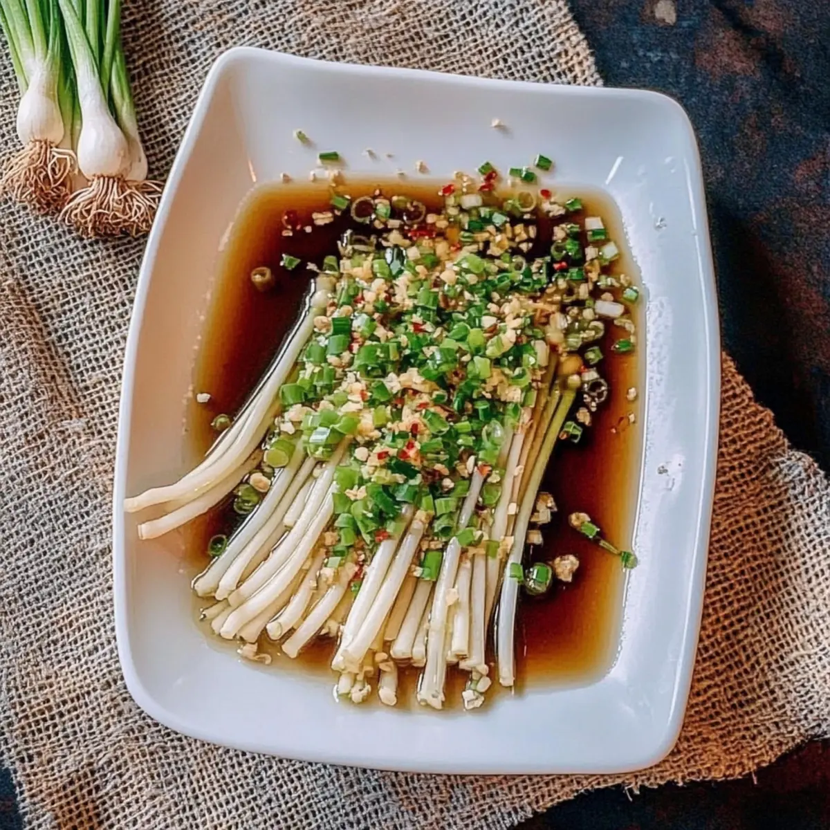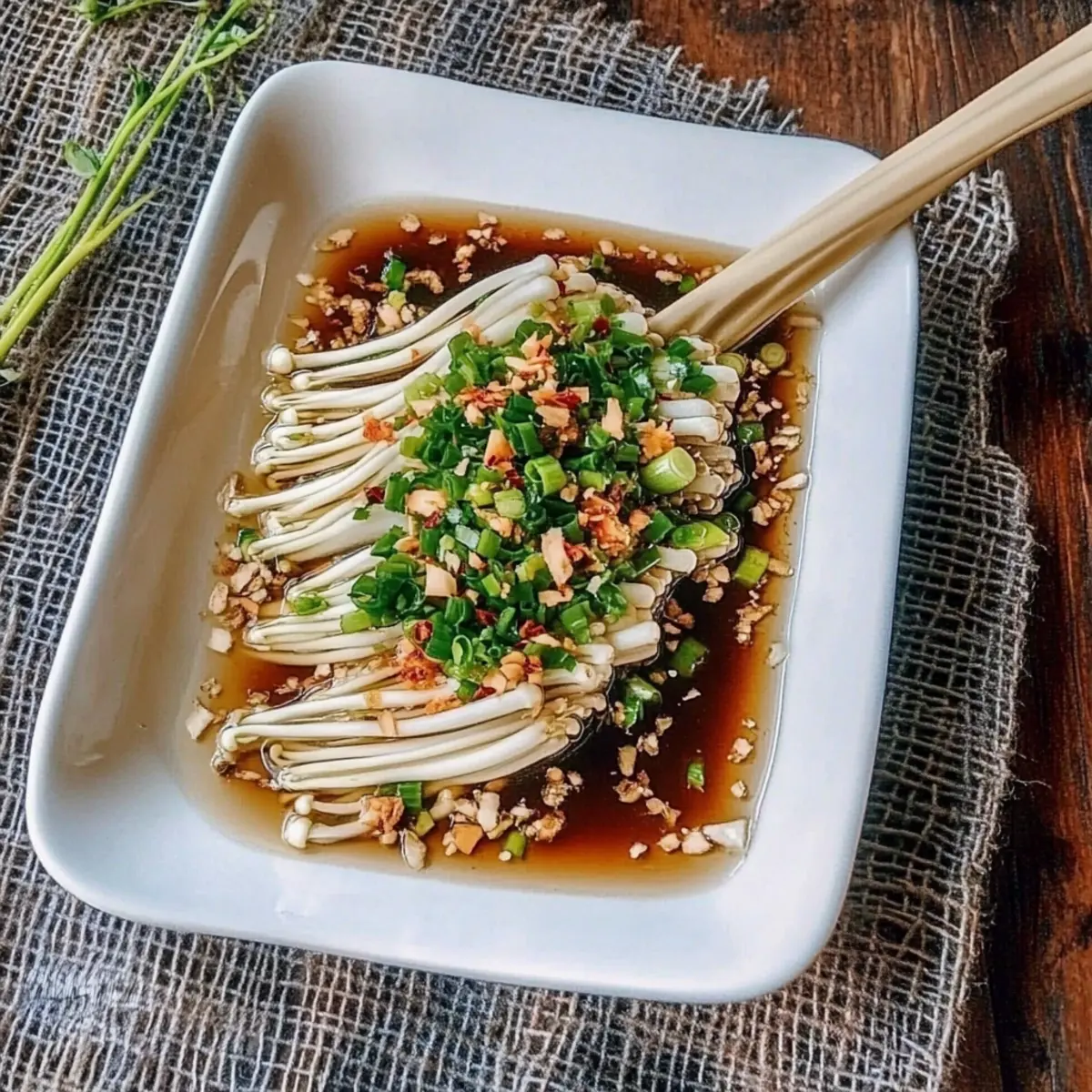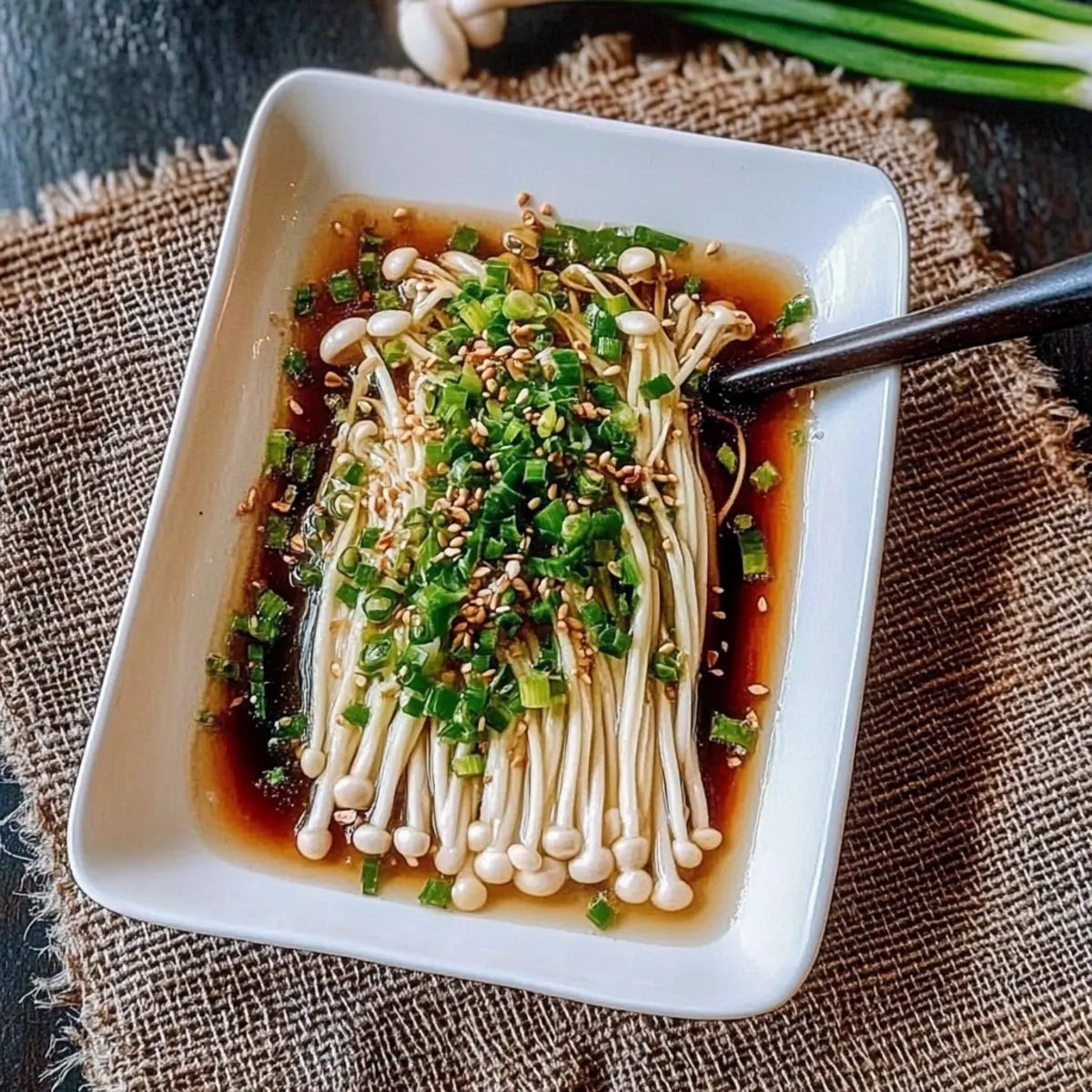 Jump to Recipe Print RecipeAs I stood in my kitchen, surrounded by the enticing aroma of sautéing garlic, I couldn’t help but smile at the simplicity of my newest creation. Enoki Mushrooms with Garlic & Scallion Sauce are a revelation in quick, plant-based cooking. These delicate little mushrooms offer a delightful crunch that pairs perfectly with a rich, fragrant sauce, and the best part? You can whip this dish up in just 20 minutes! It’s an impressive yet easy addition to any meal, whether you’re a seasoned chef or just transitioning to a vegan lifestyle. Packed with flavor without the fuss, this dish promises to satisfy your taste buds and your busy schedule alike. Curious to find out how these beautiful enoki mushrooms transform into a culinary masterpiece? Let’s dive into the recipe! Why are Enoki Mushrooms a Must-Try? Quick and Easy: In just 20 minutes, you can create a stunning vegan dish that’s sure to impress. Rich Flavor: The combination of garlic and scallion sauce elevates the earthy taste of enoki mushrooms to new levels. Healthy and Light: With only about 112 calories per serving, this recipe fits perfectly into health-conscious diets without sacrificing flavor. Versatile Additions: Feel free to customize with sautéed tofu or veggies for extra nutrition. Serve alongside steamed rice, and you’ve got a complete meal! Whether you’re searching for a quick lunch or a delightful dinner, these Enoki Mushrooms with Garlic & Scallion Sauce won’t disappoint. Enoki Mushrooms with Garlic Ingredients Ready to create a culinary masterpiece with these enoki mushrooms? Here’s what you’ll need! For the Dish Enoki Mushrooms – These delicate fungi provide a delightful crunch; choose firm, white mushrooms for the best texture. Oil (2 tablespoons) – Essential for sautéing garlic; opt for vegetable or sesame oil for an extra flavor boost. Garlic (2 cloves, minced) – Infuses the dish with rich flavor; fresh garlic is a must for optimal taste. Light Soy Sauce (3 tablespoons) – Adds a perfect salty and umami balance; tamari is a great gluten-free alternative. Sugar (½ teaspoon) – Enhances the overall flavor profile with a subtle sweetness; consider maple syrup for a different touch. Scallion (1, finely chopped) – Introduces a fresh onion flavor; green onions can be used for a similar effect. Imagine how these ingredients come together to create a vibrant dish of Enoki Mushrooms with Garlic and Scallion Sauce that you’ll want to make again and again! Step‑by‑Step Instructions for Enoki Mushrooms with Garlic Step 1: Prepare the Mushrooms Begin by trimming the root ends of the enoki mushrooms, gently separating them into bite-sized bundles. Rinse them thoroughly under cold water to remove any dirt. Then, set the cleaned mushrooms aside in a strainer to allow any excess water to drain off, preparing them for a delightful sauté later. Step 2: Blanch the Enoki Bring a pot of water to a rolling boil over high heat. Once boiling, carefully drop in the enoki mushrooms in batches, blanching each batch for just 1 minute. Once they’ve softened, promptly drain them and lay the blanched enoki mushrooms on a serving plate, ready to be dressed with the flavor-packed garlic and scallion sauce. Step 3: Sauté the Garlic In a small saucepan, heat 2 tablespoons of oil over medium heat until it shimmers lightly. Add the minced garlic to the pan, stirring continuously for about 10 seconds. Keep a close eye to ensure the garlic doesn’t brown, as you want it to retain its vibrant flavor without becoming bitter. Step 4: Make the Sauce Next, incorporate 3 tablespoons of light soy sauce and ½ teaspoon of sugar into the sautéed garlic. Stir well and bring the mixture to a gentle boil, allowing all the flavors to meld together for about 30 seconds. Once the sauce is bubbling nicely, remove the pan from heat and stir in the finely chopped scallions. Step 5: Combine and Serve Pour the aromatic garlic and scallion sauce generously over the blanched enoki mushrooms on your serving plate. The hot sauce will provide a beautiful sheen to the mushrooms, making them irresistible. Serve immediately, and enjoy this vibrant dish of Enoki Mushrooms with Garlic as a delightful side or a stand-alone meal! Make Ahead Options These Enoki Mushrooms with Garlic & Scallion Sauce are perfect for meal prep, making your busy weeknights a breeze! You can blanch the enoki mushrooms and store them in an airtight container in the refrigerator for up to 3 days. Just be sure to rinse them thoroughly before blanching to maintain their fresh flavor and crisp texture. The garlic and scallion sauce can also be prepared ahead; simply combine the sautéed garlic, soy sauce, sugar, and scallions, then refrigerate for up to 24 hours. When you’re ready to serve, reheat the sauce gently and pour it over the prepared enoki mushrooms, ensuring you enjoy a quick, fresh, and delicious meal anytime! Enoki Mushrooms with Garlic Variations Feel free to explore creative twists and personalized touches that will elevate your Enoki Mushrooms with Garlic & Scallion Sauce! Add Protein: Include sautéed tofu or tempeh for a heartier meal. Simply cube them and sauté alongside the garlic for an extra boost of nutrition. Nutty Flavor: Drizzle sesame oil over the top just before serving. This added richness will enhance the dish’s overall complexity and leave you wanting more. Crunchy Toppings: Consider sprinkling toasted sesame seeds on the finished dish for an extra crunch. The contrast of textures will delight your palate and add visual appeal. Vegetable Medley: Throw in baby bok choy or sliced bell peppers during the sautéing process for colorful additions and extra nutrients. These veggies will complement the enoki beautifully, making your dish even more vibrant. Spice It Up: For a kick of heat, add red pepper flakes to the sauce. Just a pinch will give your dish a lovely warmth without overwhelming the delicate mushrooms.