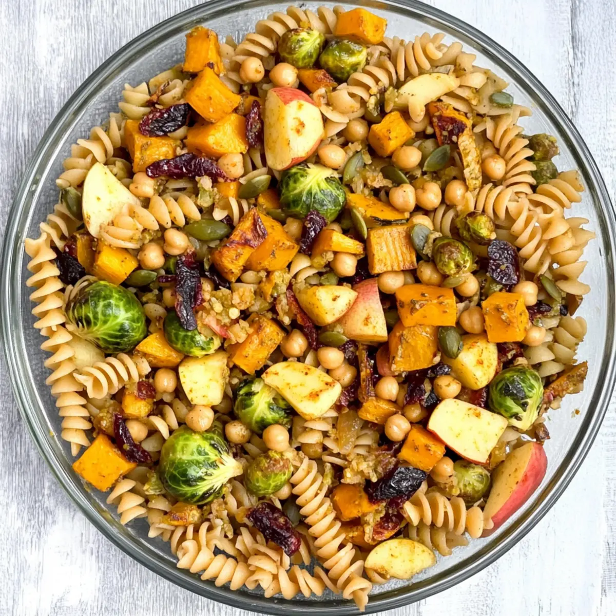 In a large mixing bowl, combine the cooled pasta, roasted vegetables, drained chickpeas, diced apple, dried cranberries, and your chosen cheese. Pour the prepared dressing over the mix and toss gently until everything is evenly coated. This harmonious blend creates a delightful Autumn-Infused Fall Pasta Salad.