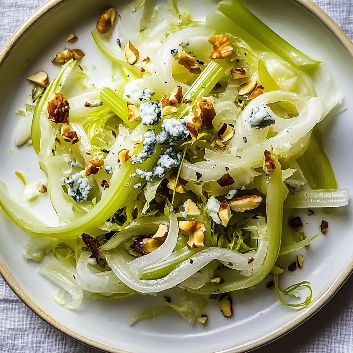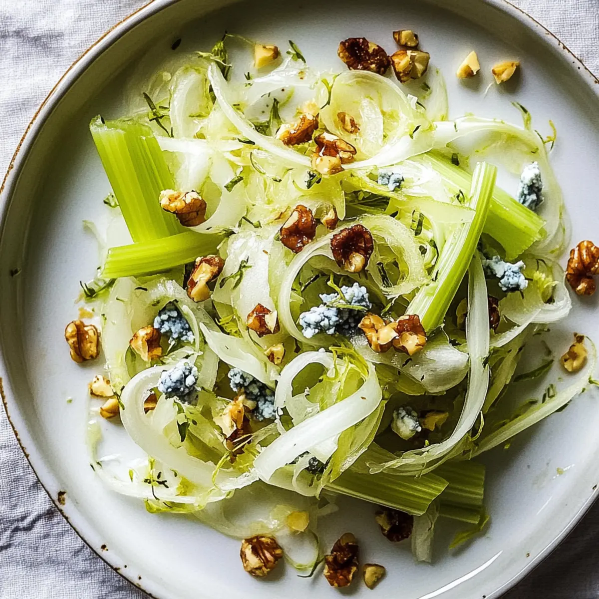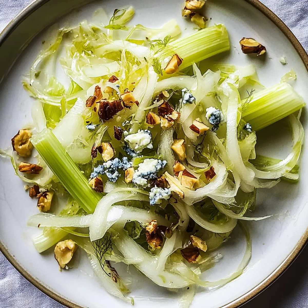 Jump to Recipe Print RecipeThe aroma of crisp, fresh vegetables always brings me back to the sun-kissed days of fall, where vibrant salads take center stage on our kitchen table. Today, I’m excited to share my delightful recipe for Fennel-Celery Salad with Blue Cheese and Walnuts—an easy and elegant dish that effortlessly blends crunchy textures and creamy flavors. This salad isn’t just a feast for the eyes; it’s an ideal choice for anyone seeking a healthy upgrade to their meal planning, perfectly balancing fresh produce with the rich tang of blue cheese and the satisfying crunch of walnuts. Plus, it’s gluten-free and vegetarian-friendly, making it accessible for various dietary preferences. Curious about how this salad can brighten your next gathering or weeknight dinner? Let’s dive into the recipe together! Why is Fennel-Celery Salad a Must-Try? Fresh, Crisp Ingredients: This salad bursts with the refreshing crunch of fennel and celery, creating a delightful texture that keeps each bite exciting. Elevated Flavor Profile: The creamy blue cheese introduces a tangy richness that beautifully complements the nutty walnuts, making every bite a flavor explosion. Quick to Prepare: In just 15 minutes, you can whip up this gourmet dish, perfect for busy weeknights or last-minute gatherings. Versatile & Adaptable: Want to switch things up? Feel free to substitute blue cheese with feta or go nut-free by using seeds! Perfect for Any Occasion: Whether served alongside grilled meats or as a light vegetarian dish, this salad is sure to impress guests at any meal. Discover more refreshing ideas with our Watermelon Berry Salad or a flavorful Broccoli Crunch Salad. Fennel-Celery Salad Ingredients For the Salad • Fennel – Provides a refreshing, crisp base; choose fresh and firm bulbs for the best texture. • Celery – Adds a bright crunch; use fresh, vibrant green stalks for optimal flavor. • Blue Cheese – Offers creamy, tangy richness; substitute with feta or goat cheese for different flavors or omit for a vegan option. • Walnuts – Introduces a nutty crunch; toast before using to enhance the flavor, or use pumpkin or sunflower seeds for a nut-free option. For the Dressing • Olive Oil – A high-quality extra virgin adds healthy fats and richness to the salad. • Lemon Juice – Provides freshness and acidity; fresh-squeezed juice is always preferred for optimal flavor. • Salt – Enhances all flavors; adjust to taste based on preference. • Pepper – Adds a mild kick; freshly cracked is recommended for the best taste. Enjoy making this Fennel-Celery Salad as a vibrant addition to your meals! Step‑by‑Step Instructions for Crunchy Fennel-Celery Salad with Blue Cheese and Walnuts Step 1: Prepare the Fresh Ingredients Begin by trimming the fennel bulb and slicing it thinly, revealing its delicate layers. Next, chop the celery into bite-sized pieces and place both in a large mixing bowl. Enjoy the bright, crisp colors as you combine these fresh vegetables, forming the vibrant base of your Fennel-Celery Salad. Step 2: Toast the Walnuts In a dry skillet over medium heat, add the walnuts and toast them for about 5-7 minutes, stirring frequently. Watch for a golden brown color and the delightful aroma as they become fragrant. Once toasted, transfer the walnuts to a plate and allow them to cool slightly before mixing them into the salad. Step 3: Make the Dressing In a small bowl, whisk together 1/4 cup of extra virgin olive oil, 2 tablespoons of fresh lemon juice, a pinch of salt, and freshly cracked pepper to taste. Aim for a smooth, emulsified consistency, which will enhance the flavors of your Crunchy Fennel-Celery Salad with Blue Cheese and Walnuts. Step 4: Dress the Salad Drizzle the dressing over the fennel and celery mixture, then use a wooden spoon or salad tongs to gently toss everything together. Ensure that all the crisp vegetables are well coated, allowing the flavors to mingle beautifully, which will elevate your salad to new heights. Step 5: Incorporate the Cheese and Walnuts Carefully fold in the crumbled blue cheese and the toasted walnuts into the salad using a light hand. This step is essential to maintaining the texture while evenly distributing the rich, creamy cheese and nutty crunch throughout the Fennel-Celery Salad. Step 6: Let It Rest To allow the flavors to meld perfectly, let your salad sit for at least 10 minutes before serving. This brief resting period will enhance the overall taste experience, transforming your salad into a dish that’s as satisfying as it is beautiful. What to Serve with Crunchy Fennel-Celery Salad with Blue Cheese and Walnuts Pairing this vibrant salad with complementary dishes will elevate your meal to new heights. Grilled Chicken: The warm, smoky flavor of grilled chicken perfectly matches the fresh crunch of the salad, making it a satisfying protein option. Lemon Herb Quinoa: This light and fluffy dish brings a nutty undertone that enhances the creamy blue cheese while adding a healthy grain option. Roasted Beets: Their earthy sweetness balances the sharpness of the blue cheese, adding a pop of color and additional texture to the meal. Herbed Garlic Bread: The crunchiness of toasted bread with buttery garlic complements the salad while inviting you to enjoy every bite. Sparkling Water with Lime: A refreshing drink that cleanses the palate, enhancing the crisp flavors of your Crunchy Fennel-Celery Salad. Apple Crisp: This warm dessert provides a sweet contrast to the salad’s savory elements, rounding off your meal with a comforting touch. Don’t hesitate to mix and match! Each of these options adds unique flavors and textures, ensuring a delightful dining experience. Make Ahead Options These refreshing Fennel-Celery Salad with Blue Cheese and Walnuts are perfect for meal prep enthusiasts! You can prepare the fennel and celery up to 24 hours in advance by chopping them and storing them in an airtight container to keep them