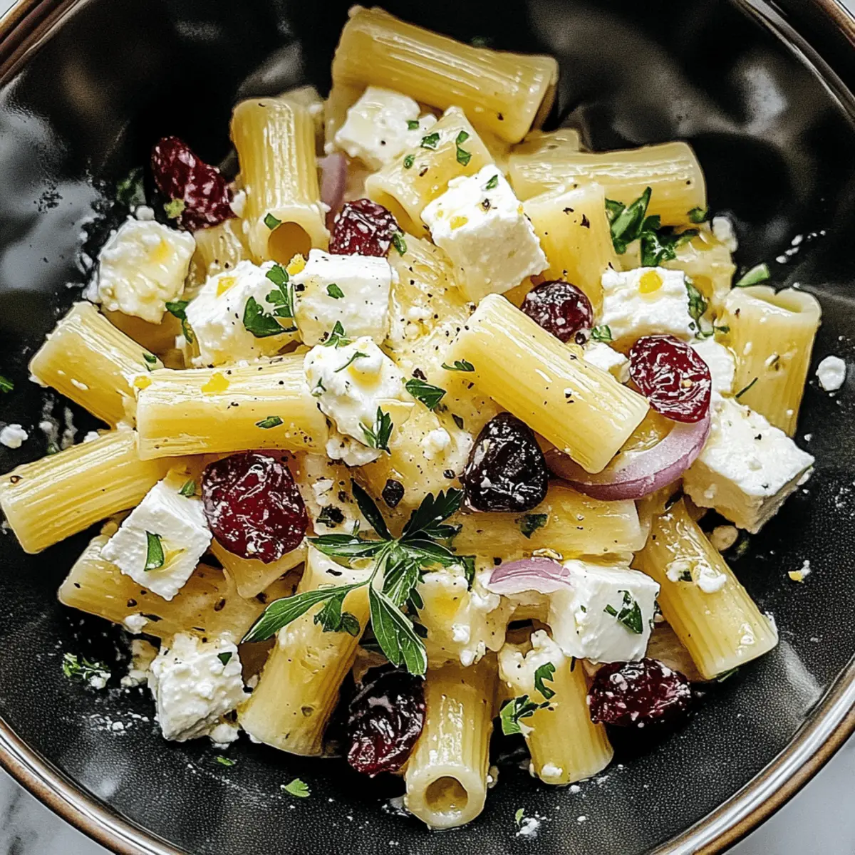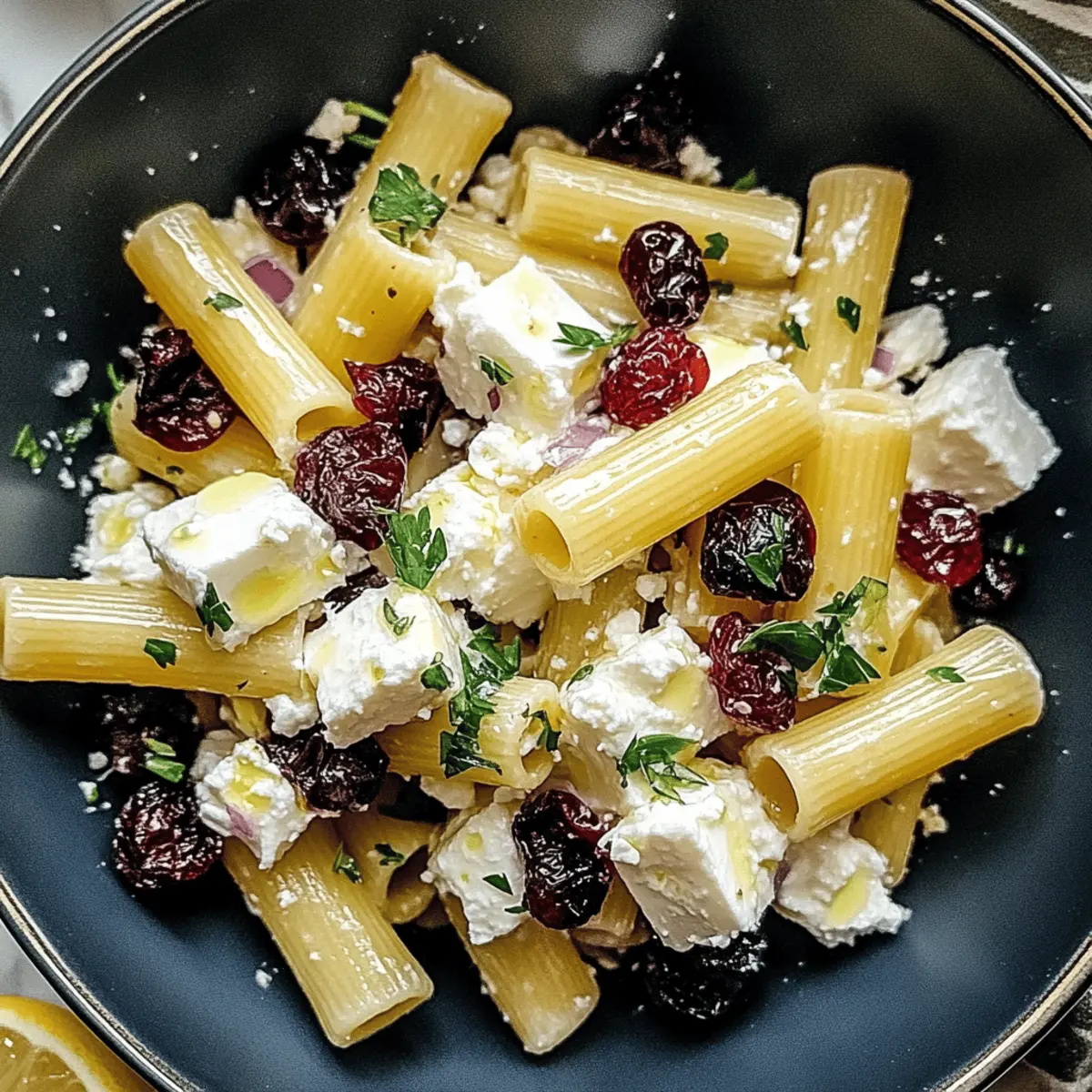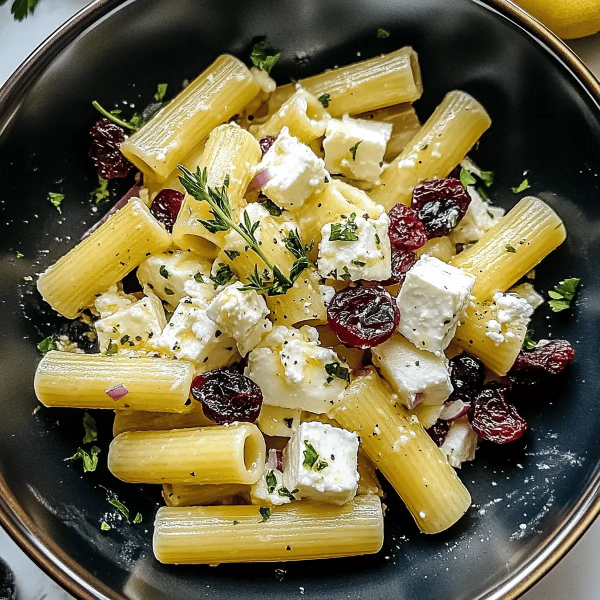 Jump to Recipe Print RecipeAs I stood in my kitchen with the summer sun streaming through the window, a craving for something vibrant yet satisfying hit me. Enter the Feta & Cranberry Rigatoni Salad with Lemon Vinaigrette—a delightful combination that has quickly become my go-to for light lunches and potlucks. This salad manages to strike a perfect chord between creamy feta, sweet dried cranberries, and the zingy brightness of lemon vinaigrette, making it ideal for those warm afternoons. With minimal prep time and refreshing ingredients, it’s not just a meal, but a celebration of flavors and textures. Whether you’re serving it as a side or making it the star of your lunch, this dish is sure to please everyone at the table. Are you ready to whip up this delicious creation? Why is this salad a must-try? Vibrant Colors: The vivid hues of the fresh ingredients make this salad not only appealing but a feast for the eyes. Easy Preparation: With just a handful of steps, this dish comes together quickly, perfect for anyone short on time but big on flavor. Crowd-Pleasing Delight: Whether for a summer picnic or a casual dinner, this Feta & Cranberry Rigatoni Salad is sure to win over friends and family alike. Customizable Options: Want to switch things up? Swap the rigatoni for your favorite pasta or use a different cheese like goat cheese for a unique twist! You may also enjoy pairing it with dishes like Strawberry Spinach Salad for a fantastic meal combo. Refreshing Flavor: The zesty lemon vinaigrette perfectly complements the creamy feta and sweet cranberries, leaving you refreshed and satisfied. Make this dish your seasonal staple! Feta & Cranberry Rigatoni Salad Ingredients For this vibrant and delicious Feta & Cranberry Rigatoni Salad, you’ll need these fresh ingredients to create a delightful blend of flavors. For the Pasta Rigatoni Pasta – Provides structure and texture, ideal for holding the vinaigrette. Note: Can substitute with penne, farfalle, or rotini. For the Salad Feta Cheese – Adds creaminess and a tangy flavor, balancing the sweetness of cranberries. Substitution: Goat cheese or ricotta salata for a different cheese profile. Dried Cranberries – Contributes sweetness and chewy texture, providing a pop of flavor and color. Substitution: Raisins or dried cherries may be used. Red Onion (finely chopped) – Offers sharpness and crunch to balance the creaminess. Note: Use shallots or green onions for a milder flavor. Fresh Parsley (chopped) – Adds freshness and bright color to the dish. Substitution: Fresh cilantro or basil can work as alternatives. For the Vinaigrette Olive Oil – Forms the base of the vinaigrette, providing richness. Lemon Juice – Provides acidity and brightness, complementing the other flavors. Honey – Adds a subtle sweetness to the vinaigrette, balancing acidity. Note: Maple syrup can be a vegan alternative. Dijon Mustard – Enhances the dressing with tang and helps emulsify. Salt & Black Pepper – Essential for flavor enhancement. Gather these ingredients for your Feta & Cranberry Rigatoni Salad, and prepare to impress everyone with this light, vibrant dish! Step‑by‑Step Instructions for Feta & Cranberry Rigatoni Salad Step 1: Boil the Pasta Begin by bringing a large pot of salted water to a rolling boil over high heat. Once boiling, stir in the rigatoni pasta and cook according to the package directions, usually around 10 to 12 minutes, until it’s al dente. Stir occasionally to prevent sticking and keep an eye out for that perfect chewy texture. Step 2: Drain and Rinse Once the rigatoni reaches the al dente stage, carefully drain it in a colander. Rinse the pasta under cold running water for about 1-2 minutes to stop the cooking process and cool it down. This step not only halts further cooking but also helps ensure your Feta & Cranberry Rigatoni Salad remains refreshingly crisp. Step 3: Combine the Pasta and Ingredients After draining, let the pasta sit for a minute to remove excess moisture. Transfer the cooled rigatoni to a large mixing bowl. Now, add the crumbled feta cheese, dried cranberries, finely chopped red onion, and freshly chopped parsley. The combination of these ingredients will begin to form the vibrant base of your salad. Step 4: Whisk the Vinaigrette In a separate medium bowl, whisk together 1/4 cup of olive oil, the juice of one fresh lemon, 1 tablespoon of honey, and 1 teaspoon of Dijon mustard. Season the vinaigrette with a pinch of salt and black pepper to taste. Whisk until the mixture is well emulsified and smooth, creating a zesty dressing for your Feta & Cranberry Rigatoni Salad. Step 5: Dress the Salad Pour the prepared lemon vinaigrette over the pasta mixture in the large bowl. Gently toss everything together using a spatula or tongs until the salad is well coated, and the flavors are distributed evenly. Take a moment to admire the colorful medley of ingredients coming together in this delightful Feta & Cranberry Rigatoni Salad. Step 6: Taste and Adjust After tossing, taste the salad and adjust the seasoning as needed. You may want to add a bit more salt, pepper, or even a touch more honey if you prefer a sweeter dressing. This step ensures your Feta & Cranberry Rigatoni Salad has the perfect balance of flavors tailored to your personal taste. Step 7: Chill and Serve For the best flavor, let your salad sit for about 30 minutes in the refrigerator before serving. This chilling period allows the flavors to meld, enhancing the overall taste. Serve your salad chilled or at room temperature—either way, it’s sure to be a hit as a refreshing dish for your next meal! How to Store and Freeze Feta & Cranberry Rigatoni Salad Fridge: Store your Feta & Cranberry Rigatoni Salad in an airtight container in the refrigerator for up to 3 days to maintain its freshness and flavor. Vinaigrette: If you’ve made the salad in advance, it’s best to store the vinaigrette separately to avoid soggy pasta. This way, you can en