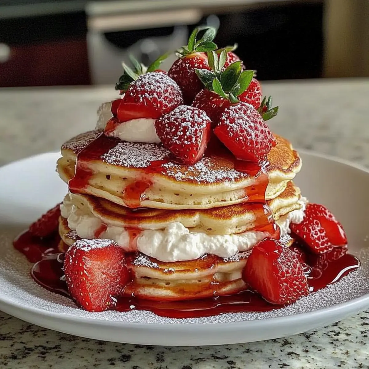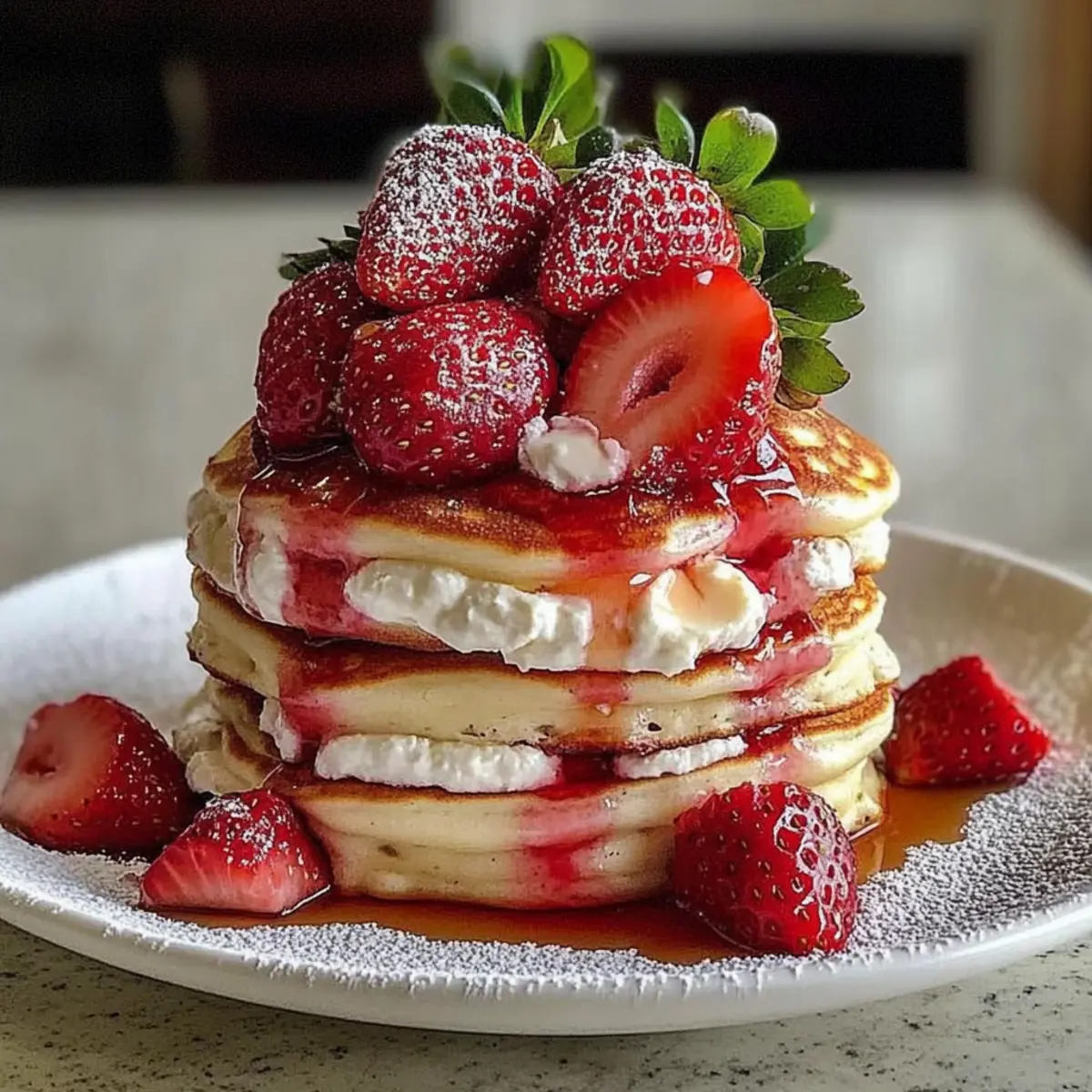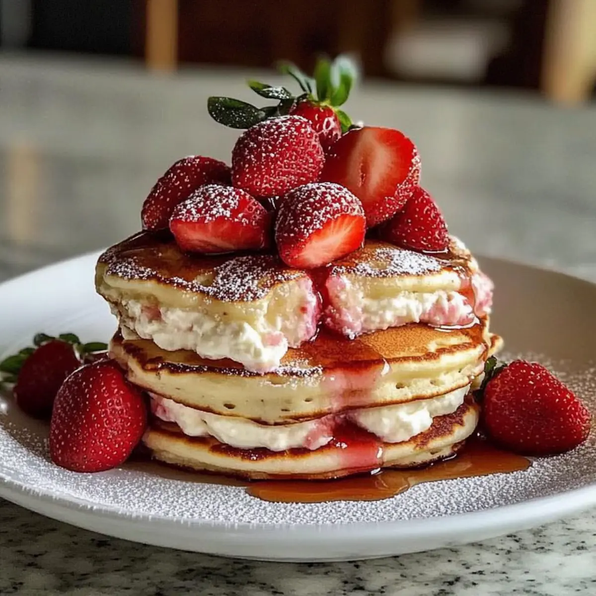 Jump to Recipe Print RecipeThe smell of pancakes sizzling on a Sunday morning is like a warm hug for the soul. With my recipe for Fluffy Strawberry Cheesecake Pancakes, you’ll experience breakfast like never before; imagine biting into a soft pancake filled with creamy cheesecake goodness, topped with fresh, juicy strawberries. This indulgent breakfast is not only a fantastic way to kickstart your day, but it also makes for an impressive brunch centerpiece that your friends and family will adore. What’s more, these pancakes are surprisingly easy to prepare, allowing you to whip up a special treat without spending hours in the kitchen. Ready to transform your mornings into delightful occasions? Let’s dive into this sweet journey together! Why Are These Pancakes a Game Changer? Indulgent Breakfast: Fluffy Strawberry Cheesecake Pancakes combine convenience and decadence in every bite, elevating your brunch game effortlessly. Versatile Customization: Swap in blueberries or a chocolate drizzle for a delightful twist that suits your taste, ensuring variety every time. Simple Preparation: The easy steps allow even novice cooks to serve up a stunning dish without hassle. Impressive Presentation: Their beautiful layers and vibrant colors will wow guests, making them perfect for any occasion. Sweet Morning Memories: Whether for a leisurely Sunday or a festive gathering, these pancakes create delicious moments worth savoring. Enjoy them alongside a refreshing Strawberry Lemonade Refreshing to complete your experience! Fluffy Strawberry Cheesecake Pancakes Ingredients For the Pancakes • All-Purpose Flour – Provides structure to the pancakes; whole wheat flour can be used for a healthier option. • Baking Powder – Helps pancakes rise and become fluffy; ensure it’s fresh for best results. • Baking Soda – Enhances the fluffiness of pancakes; be sure not to omit it as it works with buttermilk’s acidity. • Salt – Balances sweetness in pancakes; essential for flavor—using kosher salt results in a milder taste. • Granulated Sugar – Adds sweetness to the batter; coconut sugar can be a delightful substitute for a different flavor profile. • Buttermilk – Key to a fluffy texture and adds moisture; can be replaced with non-dairy milk mixed with vinegar or lemon juice. • Eggs – Provide structure and richness; for a vegan version, consider using flax eggs instead. • Melted Butter – Adds richness and tenderness; substitute with coconut oil for a dairy-free option. • Vanilla Extract – Enhances flavor; using pure vanilla extract will yield the best aroma and taste. For the Cheesecake Filling • Cream Cheese – Creates the creamy cheesecake filling; vegan cream cheese is a good dairy-free option. • Powdered Sugar – Sweetens the cheesecake filling; no substitutions are necessary for this ingredient. • Heavy Whipping Cream – Adds lightness when whipped into the filling; coconut cream serves as a non-dairy alternative. For the Topping • Fresh Strawberries – Offers natural sweetness and vibrant flavor; while frozen can be used, fresh strawberries create better texture. • Granulated Sugar (for strawberries) – Helps macerate the strawberries into a sweet syrup; optional if your strawberries are already sweet. • Maple Syrup or Strawberry Syrup – Adds extra sweetness when drizzled on top; honey can be an excellent substitute. • Butter (for greasing skillet) – Prevents sticking and enhances flavor; non-stick spray is a viable alternative as well. With these ingredients, you’re all set to indulge in the delightful Fluffy Strawberry Cheesecake Pancakes! Step‑by‑Step Instructions for Fluffy Strawberry Cheesecake Pancakes Step 1: Mix Dry Ingredients In a large mixing bowl, whisk together 1 cup of all-purpose flour, 1 tablespoon of baking powder, 1/2 teaspoon of baking soda, 1/4 teaspoon of salt, and 2 tablespoons of granulated sugar. Ensure that all ingredients are well combined and there are no lumps. This dry mixture sets the foundation for your Fluffy Strawberry Cheesecake Pancakes, creating a perfectly fluffy texture. Step 2: Mix Wet Ingredients In a separate bowl, beat 2 large eggs and whisk in 1 cup of buttermilk, 2 tablespoons of melted butter, and 1 teaspoon of vanilla extract until smooth. The buttermilk adds tang and moisture, helping to achieve the desired fluffiness. Once blended, this wet mixture will contribute to the rich, delicious flavor of your pancakes. Step 3: Combine Mixtures Pour the wet mixture into the bowl of dry ingredients and gently stir using a spatula. Mix until just combined; it’s okay if the batter has a few lumps. Avoid overmixing, as this will prevent your Fluffy Strawberry Cheesecake Pancakes from being light and airy. Set the batter aside to rest for a few minutes while you prepare the skillet. Step 4: Cook Pancakes Preheat a greased non-stick skillet over medium heat. Once hot, scoop about 1/4 cup of batter onto the skillet. Cook for 2–3 minutes or until bubbles form on the surface and the edges look set. Flip the pancake and cook for an additional 2–3 minutes until golden brown. Repeat with the remaining batter, adjusting the heat as needed to prevent burning. Step 5: Prepare Filling In a mixing bowl, beat 8 ounces of softened cream cheese with 1/4 cup of powdered sugar and 1 teaspoon of vanilla extract until smooth and creamy. In a separate bowl, whip 1 cup of heavy whipping cream until stiff peaks form, then gently fold it into the cream cheese mixture. This will create a light and airy filling perfect for your pancakes. Step 6: Macerate Strawberries Chop 1 cup of fresh strawberries and place them in a medium bowl. Sprinkle with 1 tablespoon of granulated sugar and stir gently to coat. Let the strawberries sit for at least 10 minutes; this process allows them to release their juices, creating a luscious syrup that will enhance your Fluffy Strawberry Cheesecake Pancakes. Step 7: Assemble Pancakes To assemble