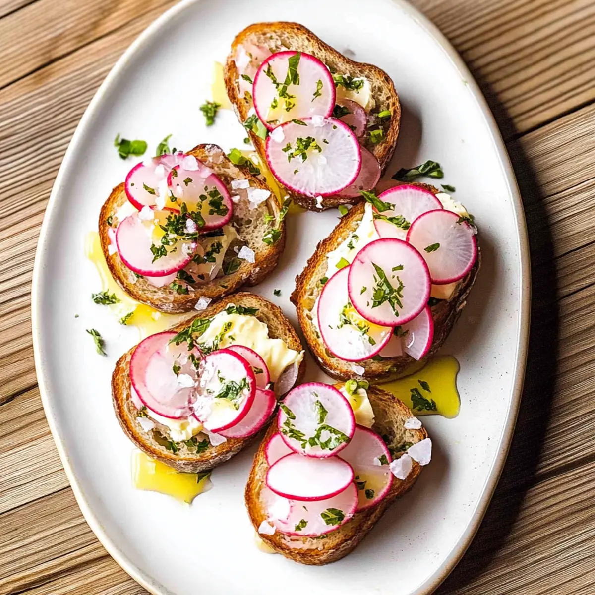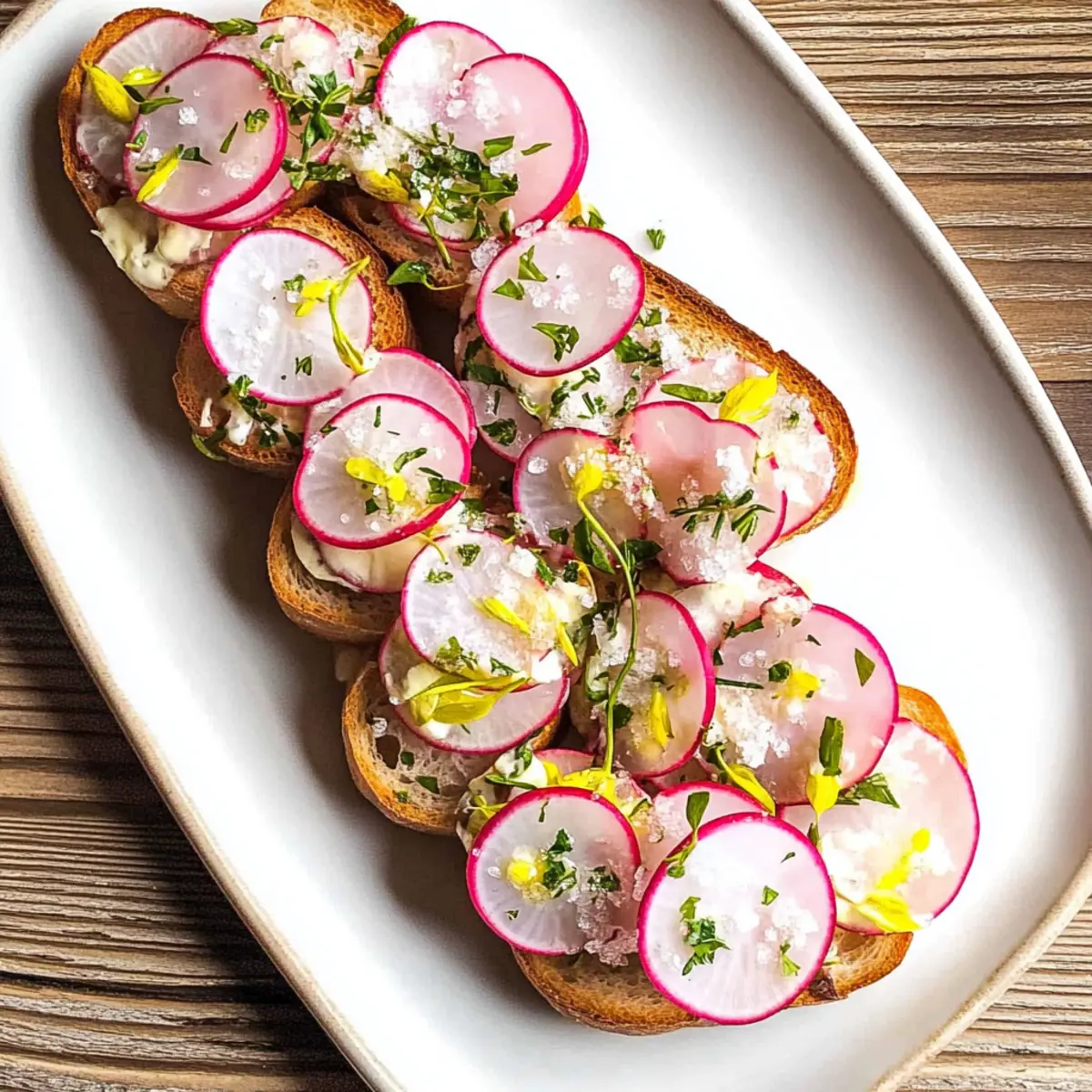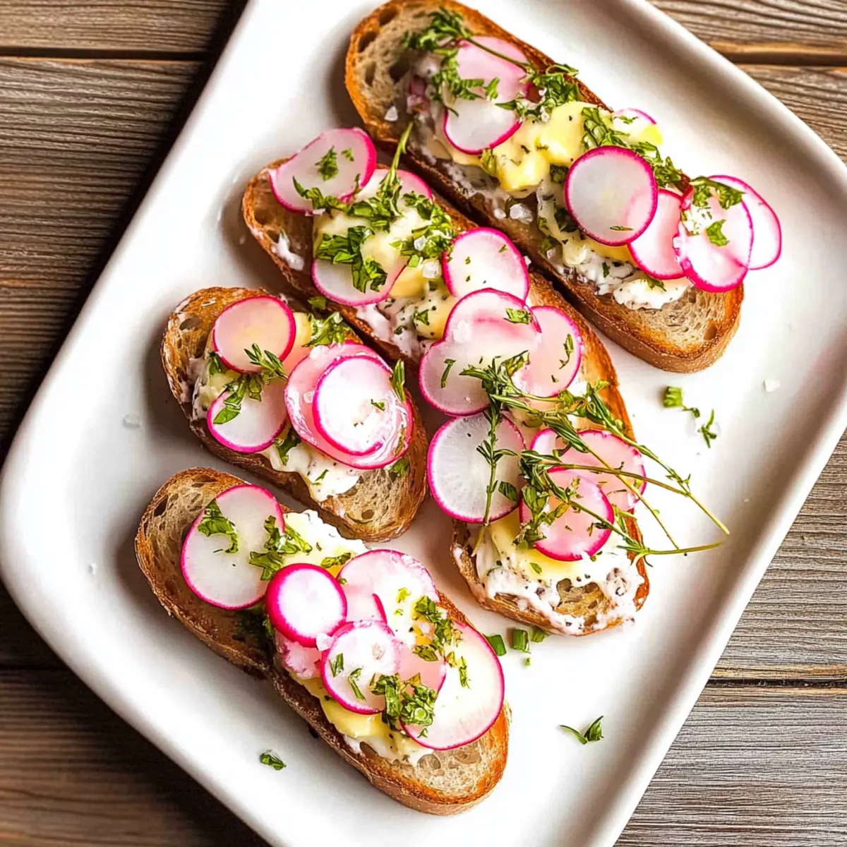 Jump to Recipe Print RecipeAs I strolled through the vibrant farmers’ market, a kaleidoscope of spring colors beckoned—particularly the radiant radishes, gleaming under the sun. This inspired my creation of Easy French Buttered Radish Toasts, a delightful showcase of these fresh gems. With just a handful of ingredients, this quick and easy recipe transforms simple toasted bread into a charming appetizer that’s perfect for any gathering. Not only are these toasts a feast for the eyes, but they also serve as a light, refreshing bite that captures the essence of the season. Think creamy herb-infused butter, crisp radish slices, and a sprinkle of flaky sea salt—all ready in under 15 minutes! So, why not elevate your next spring brunch or casual get-together with a touch of French flair? Let’s dive into this delightful recipe that’ll leave your guests asking for more! Why Are These Toasts a Must-Try? Simplicity, this recipe requires minimal ingredients and just a few steps, perfect for busy cooks looking for a quick delight. Fresh Flavors shine through each bite, combining the crispness of radishes with creamy, herb-infused butter. Versatile options mean you can swap in different vegetables or herbs based on your preferences, making it easily adaptable. Crowd-Pleasing, whether for a brunch or as an appetizer at your next gathering, these toasts are sure to impress! Seasonal Appeal captures the essence of spring, utilizing fresh produce for a vibrant dish that’s as beautiful as it is delicious. If you’re seeking more easy spring options, don’t miss my tips on using seasonal produce to elevate your meals! French Buttered Radish Toasts Ingredients • Perfect for a quick spring appetizer! For the Toasts Baguette or Crusty Bread – The base for these toasts; using a French baguette creates an authentic flavor and texture. Unsalted Butter – Provides a creamy richness; opt for high-quality butter to truly elevate the taste. For the Topping Fresh Chives – Adds a mild oniony flavor; substitute with scallion tops or herbs like dill for a twist. Flaky Sea Salt – Enhances the flavor and creates a delightful crunch; Maldon salt works wonderfully here. Radishes – Thinly sliced for freshness; consider colorful varieties like French breakfast or watermelon radishes for visual appeal. Edible Flowers (Optional) – Adds a vibrant touch; chive flowers are a lovely choice to sprinkle on top! Each ingredient contributes to the overall charm of the French Buttered Radish Toasts, making them not only delicious but also visually stunning. Enjoy crafting this delightful spring appetizer! Step‑by‑Step Instructions for French Buttered Radish Toasts Step 1: Toast the Bread Begin by preheating your oven to 350℉ (175℃) if you prefer baking. Slice a baguette or crusty bread into 1-inch thick pieces. Arrange these slices on a baking sheet and toast them in the oven for about 5-8 minutes, or until they are lightly golden and crisp. If using a toaster, simply toast until you achieve a similar golden color. Step 2: Prepare the Herb-Infused Butter While the bread toasts, take 4 ounces of unsalted butter and allow it to soften at room temperature for about 10-15 minutes. In a bowl, combine the softened butter with finely minced fresh chives until the mixture is well-blended and smooth. This aromatic blend will become the creamy spread for your French Buttered Radish Toasts. Step 3: Assemble the Toasts Once the bread is done toasting, set the slices aside to cool slightly for a minute. This prevents the butter from melting too quickly. Spread a generous layer of the chive-infused butter evenly across each slice, making sure that every bite is infused with flavor. The creamy texture should be easily spreadable, enhancing the deliciousness of your toast base. Step 4: Add Radishes and Salt Now it’s time to give your toasts some crunch! Take fresh radishes and slice them thinly, aiming for uniform rounds that will lay neatly on the buttered toast. Place these vibrant radish slices on top of the buttered bread, ensuring an artistic arrangement. To elevate the flavor, lightly sprinkle flaky sea salt over the radishes, enhancing their natural crispness. Step 5: Garnish and Serve To finish off your French Buttered Radish Toasts, arrange the completed toasts on a lovely platter. For an extra touch of elegance, garnish with additional chives and optional edible flowers for visual appeal. Your delightful spring appetizer is now ready to serve—perfect for impressing guests at a brunch or gathering! French Buttered Radish Toasts Variations Feel free to let your creativity shine while preparing these delicious toasts—there are countless ways to customize and enhance their flavors! Vegetable Swap: Replace radishes with thinly sliced asparagus or fresh snap peas for a delightful crunch. Each option brings a unique flavor that complements the butter beautifully. Herb Infusion: Experiment with different herbs like tarragon or dill in place of chives to elevate the flavor profile. These alternatives can transform your toasts with unexpected yet delicious notes. Spicy Kick: Add a sprinkle of red pepper flakes or a dash of hot sauce to the butter mixture for a zesty, heat-infused twist. This small addition can awaken your taste buds and add excitement! Creamy Alternative: Swap out butter with a rich plant-based option to create vegan French Buttered Radish Toasts. Use coconut oil or vegan spread, ensuring everyone can enjoy this lovely dish. Cheesy Touch: For a rich layer of flavor, incorporate cream cheese or ricotta cheese alongside the butter. This will add creaminess while beautifully complementing the radishes’ crunch. Sweet Option: Drizzle a touch of honey or agave syrup over the radishes before serving for a sweet contrast that highlights the dish’s savory elements. It’s a delightful surprise in each bite! Fresh Sprouts: Top with a handful of fresh sprouts like microgreens or alfalfa for an added