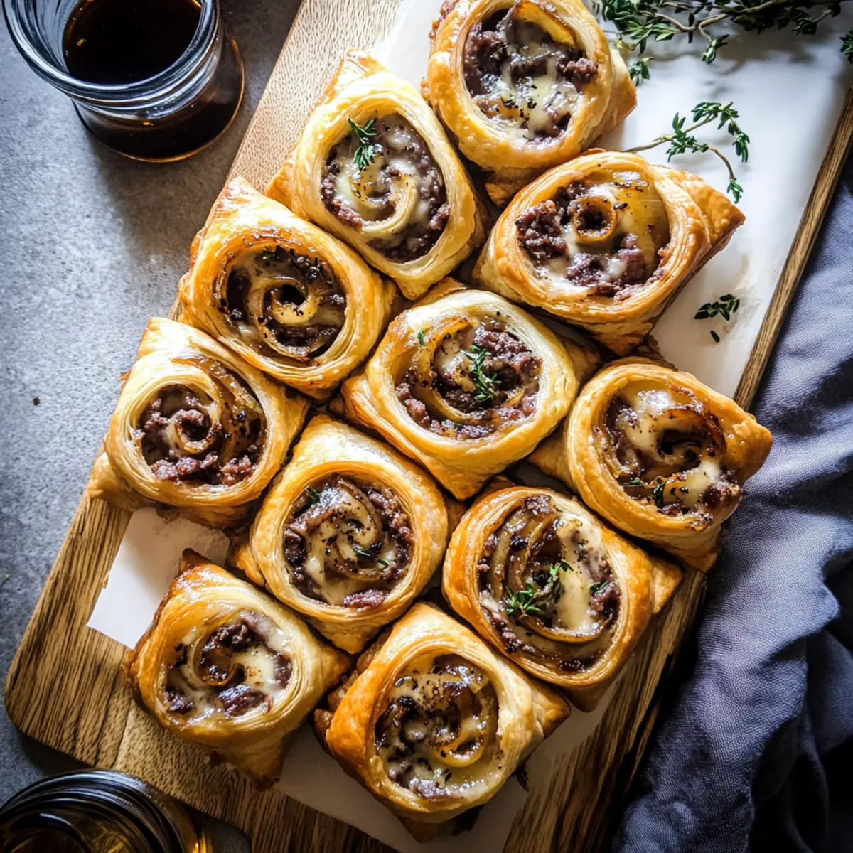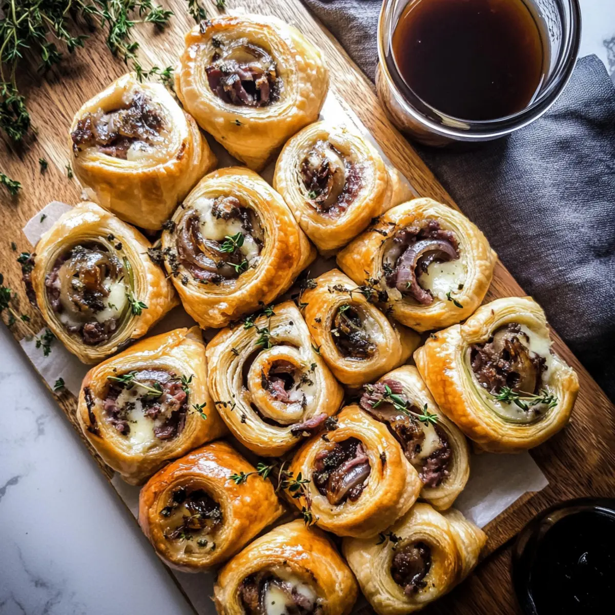 Jump to Recipe Print RecipeAs the aroma of sizzling onions fills the air, I can’t help but savor the thought of my Easy French Dip Pinwheels coming together. Layer upon layer of tender roast beef, gooey provolone, and sweet caramelized onions, all wrapped in flaky pastry, create the ultimate party snack. Not only are these pinwheels a breeze to prepare—perfect for grabbing in a pinch during busy holiday gatherings—but they also come with a homemade au jus that elevates each bite to pure bliss. Trust me, this recipe is sure to become a staple in your appetizer repertoire. So, are you ready to roll up some deliciousness? Why are French Dip Pinwheels a must-try? Irresistible Flavor: Each bite bursts with savory roast beef, creamy provolone, and sweet onions that create a delightful taste sensation. Quick & Easy: With just a few simple steps, prep and bake these delicious pinwheels in no time, making them perfect for any event. Crowd-Pleasing Snack: Whether it’s game day or a family dinner, these pinwheels are always a hit, leaving everyone wanting more. Versatile Options: Feel free to mix it up—add mushrooms or try different cheeses to suit your taste preferences. Dip Requirement: Don’t forget to pair them with the homemade au jus; it enhances the experience and adds a gourmet touch that will wow your guests. These Easy French Dip Pinwheels are your new go-to for every gathering—explore more delicious snack ideas in our Easy Party Appetizers section! French Dip Pinwheels Ingredients For the Pinwheels • Unsalted Butter – Adds richness and flavor to the pinwheels; you can substitute with margarine or olive oil for a dairy-free option. • Yellow Onions – Provides sweetness that enhances the flavor; sweet onions or shallots can be used if you prefer. • Fresh Thyme Leaves – Introduces an aromatic note; if you don’t have fresh, use dried thyme sparingly as a substitute. • Kosher Salt and Pepper – Essential for enhancing overall flavor; feel free to swap with sea salt or black pepper. • Store-Bought Crescent Dough – Makes for a convenient pastry base; use homemade puff pastry if you’re feeling adventurous. • Provolone Cheese – Melts beautifully for a creamy texture; mozzarella or Swiss cheese can work as tasty alternatives. • Sliced Deli Roast Beef – The star of the show, lending heartiness to the dish; replace with turkey or chicken if you prefer a lighter option. For the Au Jus • Garlic – Adds depth of flavor; minced garlic powder can be a quick stand-in. • Beef Stock – The flavorful base of the au jus; feel free to use homemade stock or vegetable broth for a lighter version. • Worcestershire Sauce – Brings umami depth to the mix; soy sauce can substitute, though it might alter the taste slightly. These delectable French Dip Pinwheels are sure to become your new favorite snack! Enjoy the journey of flavors as you prepare this mouthwatering dish. Step‑by‑Step Instructions for Easy French Dip Pinwheels Step 1: Preheat the Oven Begin by preheating your oven to 350°F (175°C). While the oven heats up, prepare a 9×13-inch baking dish by lightly greasing it with nonstick spray to prevent the pinwheels from sticking. This step ensures that your Easy French Dip Pinwheels will cook evenly and achieve that perfect golden-brown crust. Step 2: Caramelize the Onions In a large skillet, melt 2 tablespoons of unsalted butter over medium-high heat. Add the sliced yellow onions and fresh thyme leaves, seasoning them with kosher salt and pepper. Stir occasionally and cook for about 10-15 minutes, until the onions are softened and beautifully caramelized. Let them cool slightly before the next step for easier assembly. Step 3: Assemble the Pinwheels Unroll the store-bought crescent dough and spread it out on a clean surface. Pinch the seams of the dough rectangles together to create a solid sheet. Lay slices of provolone cheese over the dough, followed by a generous layer of sliced deli roast beef and the cooled caramelized onions. Tightly roll the dough into a log and slice it into pinwheels, about 1 inch thick. Step 4: Bake the Pinwheels Arrange the sliced pinwheels in your greased baking dish, making sure they are close but not touching. Place them in the preheated oven and bake for 30-40 minutes, or until they are puffed and golden brown. Keep an eye on them so they reach that perfect crispy texture while still maintaining a gooey inside. Step 5: Make the Au Jus While the pinwheels are baking, prepare the homemade au jus. In a medium saucepan over medium heat, melt 2 tablespoons of butter. Add minced garlic and sauté for about 1 minute until fragrant. Pour in beef stock and add Worcestershire sauce along with a sprinkle of thyme. Allow this mixture to simmer for 10 minutes, letting it reduce slightly while stirring occasionally to enhance the flavors. Step 6: Serve Warm Once the Easy French Dip Pinwheels are out of the oven and cooled slightly, delight in their warm, flaky goodness paired with your flavorful au jus for dipping. The aroma and taste will transport you and your guests to savory bliss, making each bite a satisfying experience to remember. Storage Tips for French Dip Pinwheels Fridge: Store leftover French Dip Pinwheels in an airtight container for up to 3 days to maintain freshness. Freezer: For longer storage, wrap the pinwheels in plastic wrap and place them in a freezer-safe bag. They can be frozen for up to 2 months. Reheating: To reheat, place frozen pinwheels directly in a preheated oven at 350°F (175°C) for 15-20 minutes or until heated through and crispy. Cooling: Allow the pinwheels to cool completely before storing to prevent condensation, which can make them soggy. What to Serve with Easy French Dip Pinwheels Delight in a full dining experience by pairing your pinwheels with these tasty accompaniments! Creamy Coleslaw: The crunch and creaminess contrast beautifully with the savory flavors of the pinwheels, refreshing each