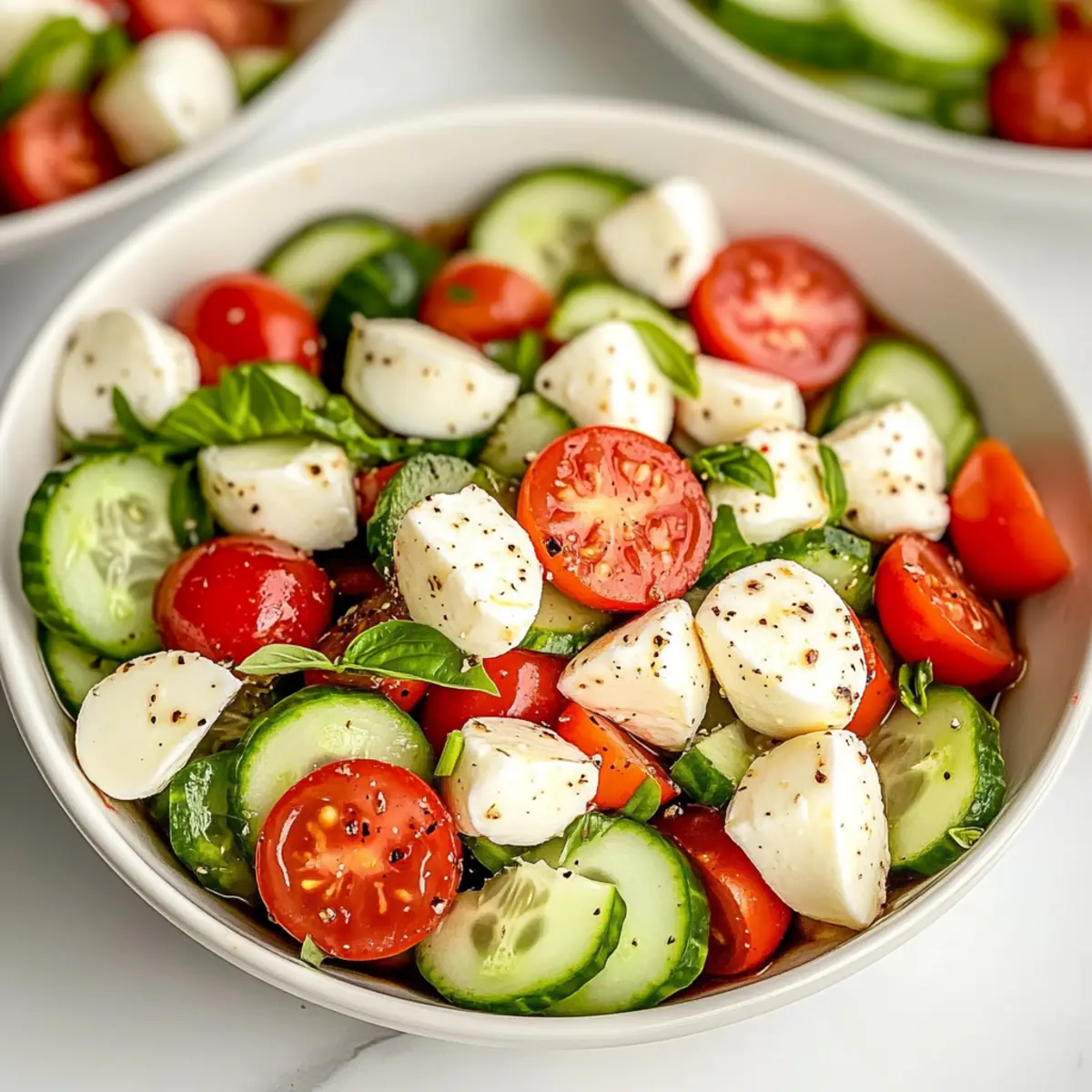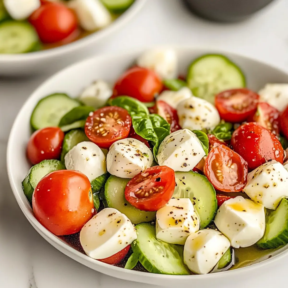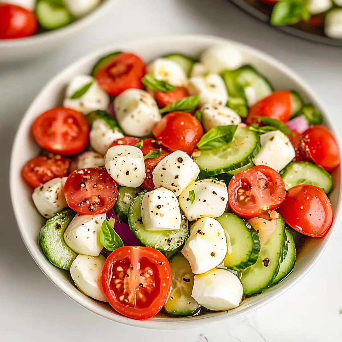 Jump to Recipe Print RecipeAs the temperatures rise, I find myself craving something that’s both refreshing and easy to whip up. That’s where this Fresh Cucumber Caprese Salad comes to the rescue! With its bright combination of crisp cucumbers, juicy cherry tomatoes, and creamy mozzarella, it’s a flavor-packed summer delight that you can prepare in just 10 minutes—no cooking required. Perfect for busy weeknights or outdoor gatherings, this salad not only brings a vibrant touch to your plate but also keeps things light and healthy. Plus, it’s an effortless crowd-pleaser that’s destined to impress your friends and family alike. Ready to dive into this no-fuss dish? Let’s get started! Why is This Salad a Must-Try? Simplicity: This Fresh Cucumber Caprese Salad requires no cooking, making it a hassle-free option for busy cooks. Bright, Flavorful: The contrast of crisp cucumbers, juicy tomatoes, and creamy mozzarella creates an explosion of flavor in every bite. Quick Preparation: Ready in just 10 minutes, it’s perfect for those last-minute gatherings or weeknight dinners. Versatile: Pair it with grilled meats or crusty bread, or serve it alone as a light summer meal. For a twist, try adding avocado or: Broccoli Crunch Salad. Crowd-Pleasing: This salad is a guaranteed hit at parties, making it a fantastic option for your next picnic or barbecue! Fresh Cucumber Caprese Salad Ingredients For the Salad English Cucumbers – They offer a crisp texture and mild flavor; substitute with peeled regular slicing cucumbers if necessary. Cherry Tomatoes – Sweet and juicy, their vibrancy will shine in your Fresh Cucumber Caprese Salad; choose ripe ones for the best taste. Fresh Mozzarella – This creamy delight enhances the salad; use mozzarella balls for easy serving, or cube larger mozzarella. Red Onion (optional) – Adds a nice crunch and sharpness; try substituting green onions for a milder flavor, or leave it out if preferred. For the Dressing Olive Oil – Acts as the foundation of your dressing, adding richness. Balsamic Vinegar – Introduces acidity with a hint of sweetness; adjust to your taste preference. Dried Oregano & Basil – Elevate the flavor profile; fresh herbs can offer an even bolder taste if you have them on hand. Salt & Pepper – Essential for seasoning; feel free to adjust according to your personal preference. Optional Components Avocado – A wonderful addition for extra creaminess; it pairs beautifully with the other ingredients. Feta or Goat Cheese – Swap out the mozzarella for these for a unique twist; they add delightful tanginess to the salad. Step‑by‑Step Instructions for Fresh Cucumber Caprese Salad Step 1: Prepare the Dressing In a small bowl, combine 3 tablespoons of olive oil with 2 tablespoons of balsamic vinegar. Add 1 teaspoon of dried oregano, 1 teaspoon of dried basil, and a pinch of salt and pepper. Whisk the ingredients together vigorously until fully emulsified. You’ll know it’s ready when the mixture is a rich, smooth consistency. Set this dressing aside as we prepare the salad. Step 2: Prep the Cucumbers Take 2 English cucumbers and peel them if you prefer a less bitter taste. Slice the cucumbers thinly to create crisp bites, then dice them into small pieces. Aim for pieces about half an inch for optimal texture. As you chop, you’ll enjoy the fresh aroma and vibrant green color. This preparation sets the stage for the light and refreshing nature of the Fresh Cucumber Caprese Salad. Step 3: Combine the Vegetables In a medium mixing bowl, add the diced cucumbers along with 1 to 2 cups of quartered cherry tomatoes and, if using, ½ a small red onion, thinly sliced. Stir gently to create a colorful mix of ingredients that contrasts beautifully. You’ll start to see the freshness of summer in this bowl, making it hard to resist the temptation to dig in early! Step 4: Incorporate the Mozzarella Next, take 1 cup of fresh mozzarella balls or cut a larger ball into bite-sized pieces. Add the mozzarella to your vegetable mix, distributing it evenly. The creamy texture of the cheese will enhance the salad’s flavor while adding a satisfying bite. This element is crucial to experiencing the full delight of the Fresh Cucumber Caprese Salad. Step 5: Dress and Coat the Salad Pour your freshly whisked dressing over the salad mixture. With a large spoon, toss the ingredients gently but thoroughly until they are well coated. Make sure every cucumber slice and tomato is kissed by the dressing, giving it a glossy finish. This step is essential for marrying all the vibrant flavors together in your Fresh Cucumber Caprese Salad. Step 6: Let It Rest Allow the salad to sit for about 10 minutes at room temperature before serving. This time lets the flavors meld, elevating the dish to new heights. You’ll notice the combination of textures and tastes coming together beautifully. While you wait, take in the vibrant colors and fresh scents emanating from the bowl, making you eager to enjoy your creation! Fresh Cucumber Caprese Salad Variations Feel free to get creative and personalize your Fresh Cucumber Caprese Salad with these delightful twists! Dairy-Free: Substitute fresh mozzarella with almond or coconut-based cheese alternatives for a creamy texture without dairy. Add Avocado: Include diced avocado for a rich, buttery element that pairs wonderfully with the crisp ingredients. Mixed Greens: Toss in a handful of baby spinach or arugula to incorporate leafy greens and a peppery note. Herb Boost: Mix in fresh basil or cilantro for an aromatic kick that enhances the salad’s flavor profile. Spicy Twist: Add sliced jalapeños or a sprinkle of red pepper flakes for a touch of heat that livens up each bite. For a unique take, try incorporating grilled peaches or pineapple, which add a sweet and smoky flavor. And don’t forget, this salad shines alongside a refreshing Watermelon Berry Salad or a zesty Broccoli Crunch Salad. Customize your creation and en