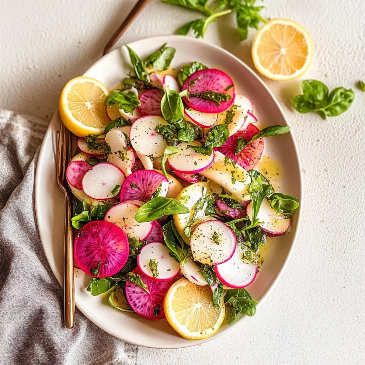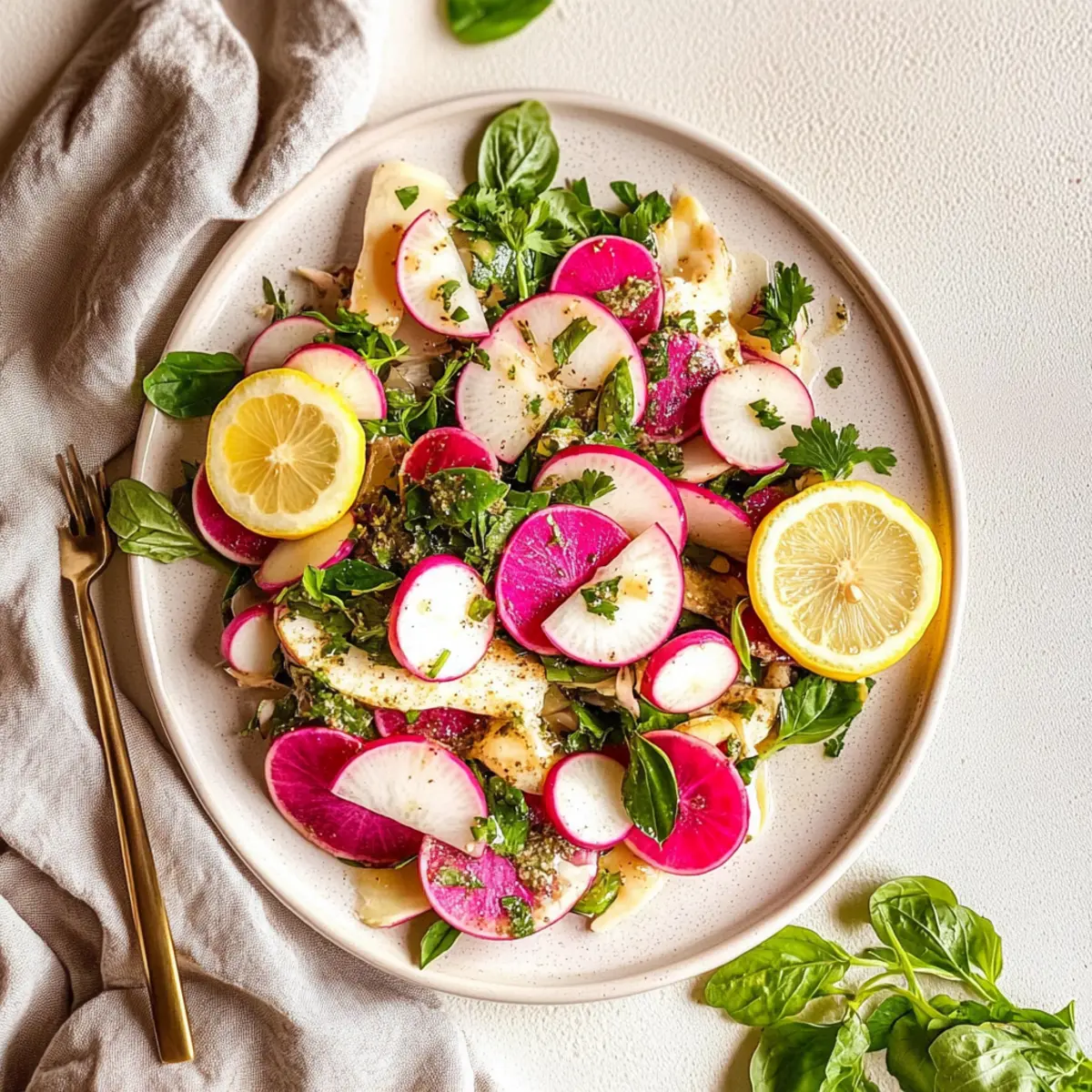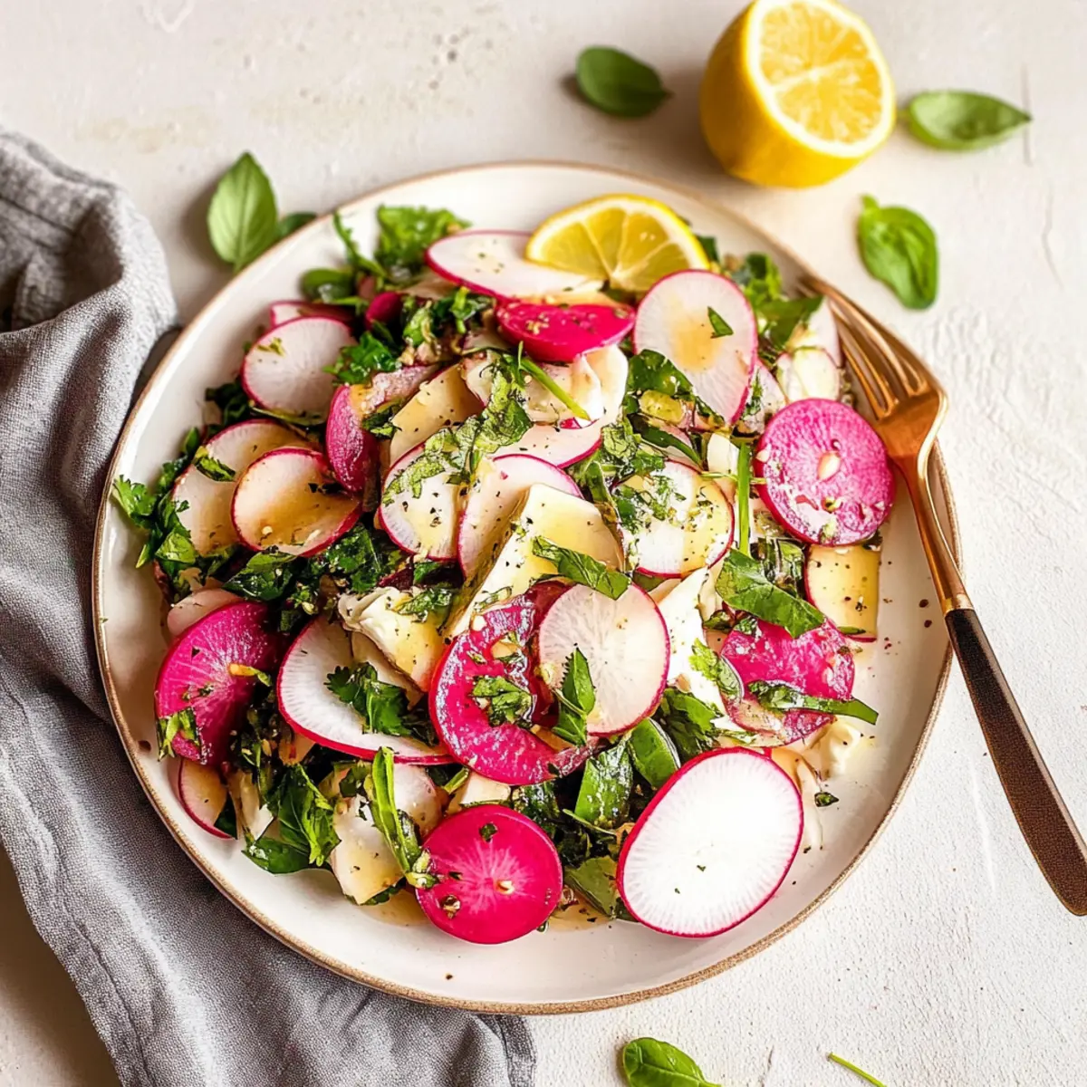 Jump to Recipe Print RecipeAs the sun begins to warm the air and the days grow longer, my mind drifts to bright, crunchy salads that scream summer. This Fresh Radish and Herb Salad brings a delightful twist to your dinner table, showcasing the vibrant colors of white and watermelon radishes that are as visually appealing as they are delicious. Not only is this salad a breeze to prepare, making it the perfect quick side dish, but it also offers a refreshing pop of flavor that can elevate any meal. Whether you’re serving it alongside grilled fish or enjoying it as a light lunch, this salad is sure to please. Curious how a few simple ingredients can transform into something so uplifting? Let’s dive into the recipe! Why is this salad the ultimate summer dish? Simplicity: This Fresh Radish and Herb Salad is incredibly easy to make, requiring minimal preparation—perfect for busy days! Refreshing flavors: The combination of crisp radishes, zesty dressing, and fresh herbs creates a vibrant taste that bursts with each bite. Versatile pairing: It complements a variety of meals, whether served alongside grilled meats or as a delightful light lunch on its own. Nutrient-rich: Packed with vitamins from fresh veggies, this salad is a healthy addition to your menu, offering a guilt-free indulgence. Visual appeal: The striking colors of white and watermelon radishes make this salad not only delicious but also a feast for the eyes, ideal for summer gatherings! For more exciting salads, check out our Orzo Pasta Salad or a refreshing Fruit Salad. Fresh Radish and Herb Salad Ingredients For the Dressing • Extra virgin olive oil – Provides fat for dressing; substitute with any neutral oil if desired. • Dijon mustard – Adds a tangy flavor and helps emulsify the dressing for a silky consistency. • Lemon juice – Brightens the dressing with acidity; vinegar is a suitable substitute if lemon isn’t available. • Apple cider vinegar – Enhances the dressing’s tanginess; feel free to use white vinegar as an alternative. • Salt and pepper – Season to taste; adjust as needed for optimal flavor. For the Salad • White radishes (cut into wedges) – The main ingredient providing crunch; any crisp radish variety can be used in this Fresh Radish and Herb Salad. • Watermelon radishes (sliced) – Adds vibrant color and a slightly sweet flavor; substitute with regular radishes if necessary. • Chopped cilantro – Brings freshness and herbal notes; parsley can serve as a lovely alternative. • Chopped red onion – Provides a sharp flavor; green onions offer a milder substitute. • Fresh basil (for serving) – Adds aromatic flavor as a delightful garnish. • Lemon slices (for serving) – Enhances presentation and adds a hint of refreshing citrus flavor. Step‑by‑Step Instructions for Fresh Radish and Herb Salad Step 1: Prepare the Dressing In a small bowl, whisk together ¼ cup of extra virgin olive oil, 1 tablespoon of Dijon mustard, 2 tablespoons of lemon juice, and 1 tablespoon of apple cider vinegar. Add a pinch of salt and pepper to taste, blending until smooth. Set this delightful dressing aside, allowing the flavors to meld while you prepare the salad. Step 2: Combine the Salad Ingredients In a large mixing bowl, add the wedges of white radishes and sliced watermelon radishes for a colorful crunch. Next, toss in ½ cup of chopped cilantro and ¼ cup of chopped red onion. Mix these fresh ingredients gently to ensure an even distribution of colors and flavors in your Fresh Radish and Herb Salad. Step 3: Dress the Salad Drizzle the prepared dressing over the mixed radishes and herbs in the bowl. Using a pair of tongs or a large spoon, gently toss the salad until the radishes are evenly coated with that zesty dressing. This step enhances the freshness and brightens the overall flavor of your salad. Step 4: Garnish and Serve To give your Fresh Radish and Herb Salad a beautiful presentation, garnish with a handful of fresh basil leaves and a few lemon slices on top. Serve immediately, or let it sit for a few minutes to allow the flavors to blend further. Enjoy this refreshing side dish with grilled meats or on its own! Expert Tips for Fresh Radish and Herb Salad Wash Thoroughly: Ensure radishes are washed thoroughly to maintain their freshness and remove any dirt. A quick rinse under cold water does wonders! Taste as You Go: Adjust seasoning to your liking. A pinch more salt or a dash of extra lemon juice can elevate the flavors in your Fresh Radish and Herb Salad. Use Fresh Herbs: Fresh ingredients make all the difference! Opt for freshly chopped herbs rather than dried to enhance the salad’s vibrant taste and aroma. Chill for Best Flavor: Let your salad chill in the fridge for about 15 minutes before serving. This allows the flavors to meld together beautifully. Customize It: Feel free to swap out ingredients, like using different radish varieties or adding nuts for crunch. Get creative to suit your taste! What to Serve with Fresh Radish and Herb Salad? As you prepare to gather friends and family around the table, consider these delightful pairings that will elevate your dining experience. Grilled Salmon: The rich, smoky flavors of grilled salmon balance perfectly with the fresh, zesty notes of the salad, creating a harmonious meal. Roasted Chicken Thighs: Juicy chicken thighs infused with spices make a savory counterpart, allowing the salad’s crunch to shine through. Quinoa Pilaf: Light and nutty, quinoa pilaf offers a great source of protein and pairs beautifully with this refreshing side. Vegetable Skewers: Colorful, grilled skewers packed with seasonal veggies add a touch of char while enhancing the salad’s vibrant flavors. Creamy Avocado Toast: Slather a piece of crispy toast with avocado; its creaminess complements the crunchy radishes, making a perfect brunch option. Sparkling Lemonade: A bubbly, citrusy drink brings a refreshing zing, perfectly matching the bright flav