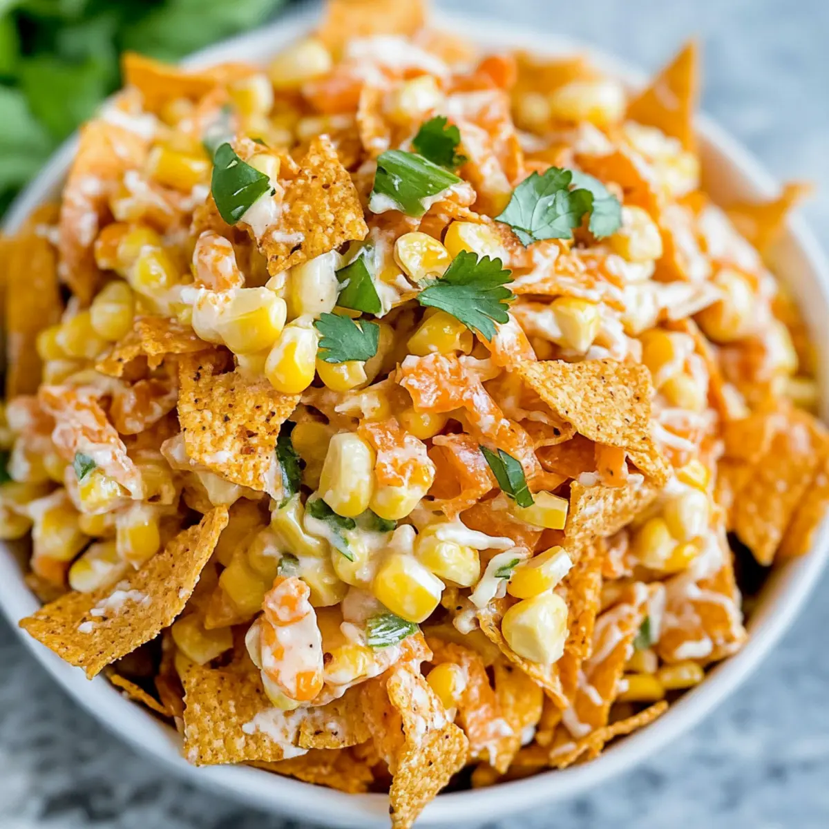 Optionally, finish by garnishing your salad with freshly chopped cilantro for a burst of color and flavor. Once everything is well mixed and garnished, serve your Fritos Corn Salad immediately. This colorful dish is best enjoyed fresh, so make it last-minute to keep that delightful crunch intact!
