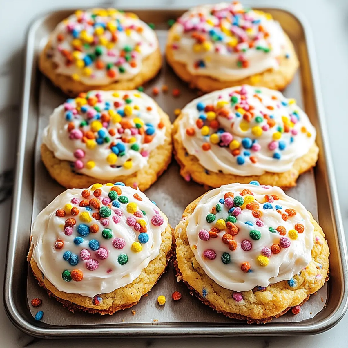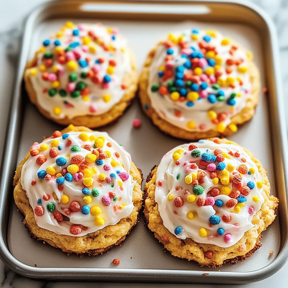 Jump to Recipe Print RecipeThe moment I took my first bite of Frosted Fruity Pebbles Cookies, I was whisked back to lazy Saturday mornings filled with colorful bowls of cereal and the laughter of friends. These delightful cookies bring together chewy goodness and the playful crunch of Fruity Pebbles, making them an instant hit at any gathering. Not only are they a vibrant addition to your dessert table, but they are also quick to whip up, making them perfect for impromptu celebrations or cheerful snacking. Plus, with simple gluten-free substitutions, you can share this joy with everyone! Ready to capture some nostalgic smiles? Let’s dive into this fun recipe that will surely brighten your day! Why Are Frosted Fruity Pebbles Cookies So Fun? Colorful, these cookies brighten any dessert table with their vibrant appearance, evoking childhood joy. Chewy Texture meets crunchy bites for a delightful contrast that keeps everyone reaching for more. Quick to Make, you can whip them up in no time, making last-minute gatherings a breeze. Versatile Options allow for creative additions like chocolate chips or almond extract, catering to various tastes. Plus, with gluten-free alternatives available, everyone can join in on the fun! Frosted Fruity Pebbles Cookies Ingredients For the Dough Butter – Provides fat and richness; substitute with margarine for a dairy-free option. Granulated Sugar – Adds sweetness and contributes to cookie spread; no substitutes recommended for the best texture. Brown Sugar – Enhances moistness and adds a deeper flavor; can replace with additional granulated sugar if necessary. Eggs – Binds ingredients and aids in rising; for a vegan alternative, use flax eggs (1 tablespoon ground flaxseed + 2.5 tablespoons water per egg). Vanilla Extract – Adds flavor depth; substitute with almond extract for a nutty twist if desired. All-Purpose Flour – The main structure ingredient; use a gluten-free flour blend for a gluten-free version, ensuring the Fruity Pebbles are also gluten-free. Fruity Pebbles Cereal – Provides a unique fruity flavor and colorful appearance; can substitute with other cereals or sprinkles if desired. For the Frosting Frosting – Suggested for topping to enhance sweetness; cream cheese or chocolate ganache can be used as fun alternatives. Step‑by‑Step Instructions for Frosted Fruity Pebbles Cookies Step 1: Preheat and Prepare Start by preheating your oven to 350°F (175°C) while you prepare your baking sheets. Line them with parchment paper or lightly spray with non-stick spray to ensure your Frosted Fruity Pebbles Cookies won’t stick during baking, allowing for a perfectly clean release after cooling. Step 2: Cream the Butters and Sugars In a large mixing bowl, use an electric mixer to cream together softened butter, granulated sugar, and brown sugar until the mixture is light and fluffy, about 3-5 minutes. This process will create a beautiful, airy texture, which is essential for achieving soft, chewy cookies that everyone will love. Step 3: Incorporate Eggs and Vanilla Add the eggs to the creamed mixture one at a time, mixing well after each addition. Then pour in the vanilla extract, stirring until fully incorporated. This step enhances the overall flavor profile of your Frosted Fruity Pebbles Cookies, providing a rich base that perfectly complements the vibrant cereal. Step 4: Combine Dry Ingredients Gradually add the all-purpose flour to the wet mixture, mixing gently until just combined. Be careful not to overmix; we want to maintain the tender texture of the cookies. Once the flour is incorporated and a thick dough forms, you’re ready to bring the colorful cereal into the mix. Step 5: Fold in Fruity Pebbles Gently fold in the Fruity Pebbles cereal with a spatula, ensuring they are evenly distributed throughout the dough. This step adds that delightful crunch and vibrant color to your Frosted Fruity Pebbles Cookies, transforming them into a fun treat that will spark joy at any gathering. Step 6: Scoop and Bake Using a cookie scoop or tablespoon, drop spoonfuls of dough onto the prepared baking sheets, leaving about two inches of space between each cookie. Bake in the preheated oven for 10-12 minutes, or until the edges are golden brown while the centers remain soft and slightly underbaked for that chewy texture. Step 7: Cool and Frost Once baked, remove the cookies from the oven and let them cool on the baking sheets for about 5 minutes. Then, transfer them to a wire rack to cool completely. Once cooled, top each cookie with a dollop of frosting and sprinkle additional Fruity Pebbles on top for an extra touch of color and crunch! What to Serve with Frosted Fruity Pebbles Cookies? Pair these playful cookies with delightful sides and drinks that enhance their whimsical charm. Milkshakes: A creamy vanilla milkshake perfectly complements the fruity flavors, making every bite feel like a nostalgic treat. Fruit Salad: A fresh fruit salad adds vibrant color and texture, balancing the sweetness of the cookies with a refreshing burst of flavor. Chocolate Ice Cream: Rich and luscious chocolate ice cream contrasts beautifully with the chewy cookies, creating a delightful fusion of flavors. Hot Chocolate: Cozy up with a warm mug of hot chocolate; its rich flavor pairs wonderfully with the crunchy, fruity bites of these cookies. Whipped Cream: Topping the cookies with a dollop of whipped cream creates a fluffy texture and adds a touch of elegance to this fun dessert. Rainbow Sprinkles: Serving cookies alongside a bowl of rainbow sprinkles invites creativity and fun, where everyone can build their unique dessert. Caramel Sauce: Drizzle warm caramel sauce over the cookies to add a sweet, salty contrast, creating a decadent dessert experience. Sparkling Water: A fizzy drink elevates the cookie experience, cleansing the palate with each sip while amplifying the joyful atmosphere. Cupcakes: Offering colorful cupcakes on the side keeps the festive vibe 
