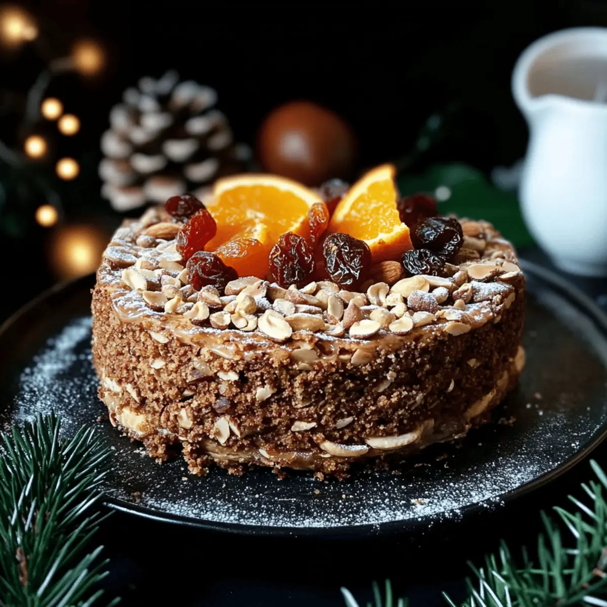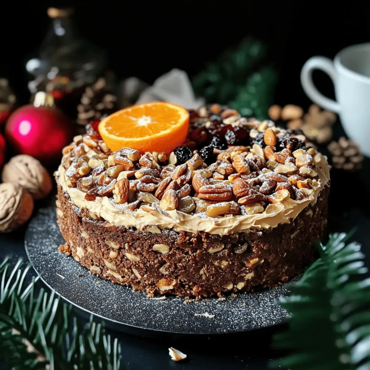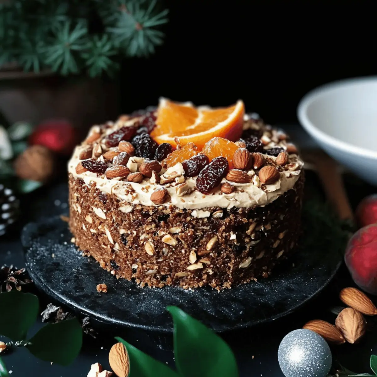 Jump to Recipe Print RecipeAs I stood by the oven, the sweet aroma of warm spices and citrus wafted through my kitchen, instantly transporting me to joyous holiday feasts of years past. Today, I’m thrilled to share my recipe for a Fruit and Nut Cake with Orange Cardamom Cashew Cream—an indulgent yet wholesome treat that embraces the season’s spirit. This cake is rich, moist, and completely vegan, making it a crowd-pleaser for everyone, including those with dietary restrictions. Not only does it come together in a breeze, but its vibrant flavors of dried fruits and nuts create a delightful harmony, sure to impress your guests. Ready to elevate your festive dessert lineup? Let’s dive into this delicious celebration! Why is this cake a must-try? Festive flavors abound in this delightful cake, perfect for holiday gatherings! Moist and rich, each slice delivers a burst of sweet fruit complemented by the warm spice of cardamom. Vegan and gluten-free makes it an inclusive option for all your friends and family. Easily customizable, you can tailor the nut and fruit mix to suit your preferences. Whether served at a winter celebration or enjoyed with a cup of tea, this cake pairs beautifully with a dollop of Zesty Orange Cardamom Cashew Cream. Make it ahead of time, and watch the flavors intensify for a truly memorable dessert! Fruit and Nut Cake Ingredients • Perfect for your festive baking! Dried Fruit Mix – Provides sweetness and moisture; try cranberries, dates, or figs for a rich flavor. Nuts (Almonds, Hazelnuts, Walnuts) – Adds crunch and structure; any combination will work, or use your favorite nuts like pecans. Buckwheat Flour – Acts as the primary dry ingredient, giving the cake body; substitute with oat flour for a lighter texture if desired. Baking Soda – Provides lift during baking; no substitutions usually needed. Orange Juice – Enhances flavor and moistness; freshly squeezed is best for robust taste. Cashews (for cream) – A creamy base for the topping; macadamia nuts or coconut cream can replace them for variety. Cardamom – Adds a warm, aromatic flavor; reduce or replace with cinnamon if you prefer a different spice. Step‑by‑Step Instructions for Fruit and Nut Cake with Orange Cardamom Cashew Cream Step 1: Prepare Dried Fruit Begin by soaking your chosen dried fruit mix in freshly squeezed orange juice for at least 2 hours, allowing the fruits to plump and absorb the citrusy flavor. This step enhances the moisture content of the Fruit and Nut Cake, giving it a rich texture. If time allows, soak overnight for maximum flavor. Step 2: Preheat Oven While the fruit is soaking, preheat your oven to 325°F (165°C). This lower temperature ensures even baking, allowing the cake to rise gently without burning the top. Prepare an 8-inch round cake tin by lining it with parchment paper, making it easy to release your cake once baked. Step 3: Mix Dry Ingredients In a medium-sized mixing bowl, combine buckwheat flour with baking soda, whisking them together thoroughly. This ensures the baking soda is evenly distributed, which is crucial for the cake’s rise. The dry mix will form the base of your Fruit and Nut Cake, providing structure and body to support the other ingredients. Step 4: Combine Wet Ingredients In a separate large bowl, combine the soaked fruit (including the flavorful orange juice) with the chopped nuts and any remaining wet ingredients. Stir gently to mix and avoid breaking up the fruit too much. This mixture will contribute to the cake’s moistness and create a delightful contrast with the dry ingredients. Step 5: Combine Mixtures Gradually add the dry ingredients to the wet mixture, stirring gently until just combined. Be careful not to overmix; a few lumps are perfectly fine. This is where the magic happens, transforming separate components into a cohesive batter for your Fruit and Nut Cake, rich and full of texture. Step 6: Bake Pour the batter into the prepared cake tin, ensuring it is evenly spread out. Place it in the preheated oven and bake for 1 to 1 hour and 15 minutes. Check for doneness by inserting a toothpick into the center; it should come out sticky but not wet. The edges should be slightly golden when the cake is ready. Step 7: Cool Once baked, remove the cake from the oven and allow it to cool in the tin for about 10-15 minutes. Carefully transfer the cake to a wire rack to cool completely. This step is essential for achieving the right texture in your Fruit and Nut Cake, allowing it to firm up properly before slicing. Step 8: Prepare Cashew Cream While the cake cools, prepare the Orange Cardamom Cashew Cream. Blend the soaked cashews with a splash of orange juice and a pinch of cardamom until smooth and creamy. This zesty topping will beautifully complement your Fruit and Nut Cake, adding a rich, aromatic layer that enhances each slice. Step 9: Serve Once the cake has cooled completely, slice it and serve it alongside the vibrant Orange Cardamom Cashew Cream. Presenting the cream on the side allows everyone to enjoy the delightful combination of flavors at their own pace, making this dessert even more inviting at your festive gatherings. Make Ahead Options These Fruit and Nut Cake with Orange Cardamom Cashew Cream are perfect for busy home cooks looking to save time during the festive season! You can soak the dried fruits in orange juice up to 24 hours in advance to allow for maximum flavor absorption. Additionally, the cake batter can be prepared and stored in the refrigerator for up to 3 days before baking—just ensure to cover it tightly to maintain moisture. When you’re ready to enjoy this delightful dessert, pour the batter into your prepared cake tin and bake as directed. Serve with the freshly made cashew cream, and you’ll have a delightful treat that’s just as delicious as if it were made fresh that day! Expert Tips for Fruit and Nut Cake Soak the Fruit: Ensure the dried fruit is well-soaked in orange juice for at l