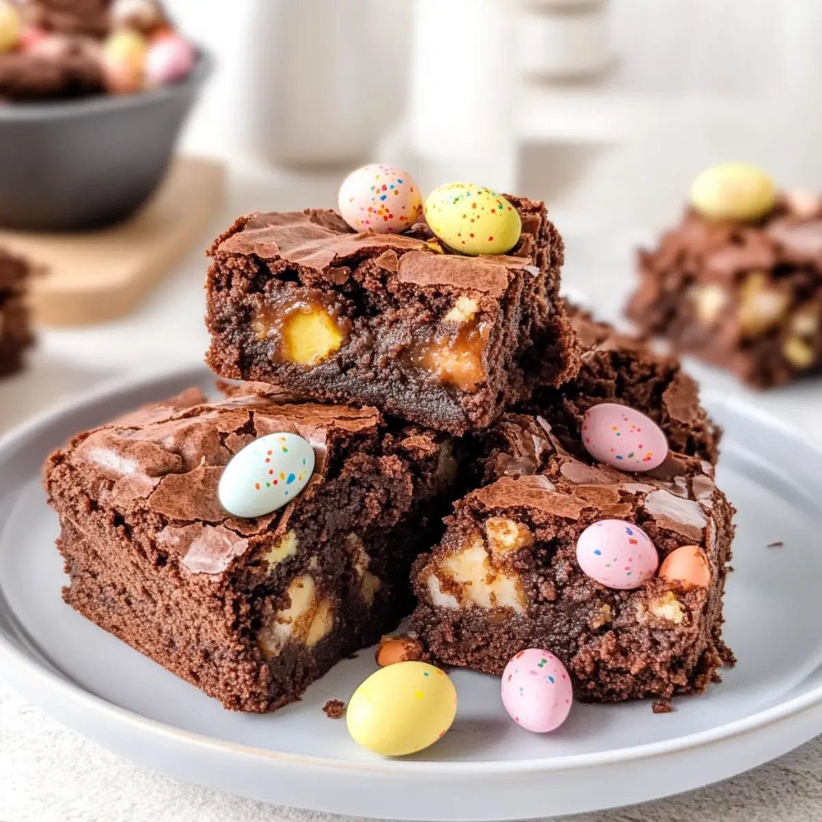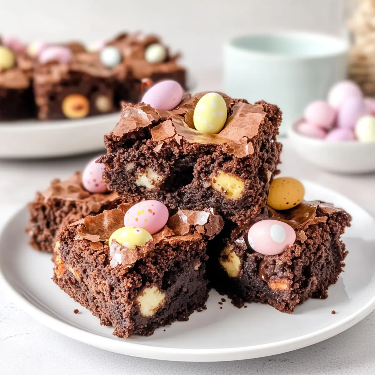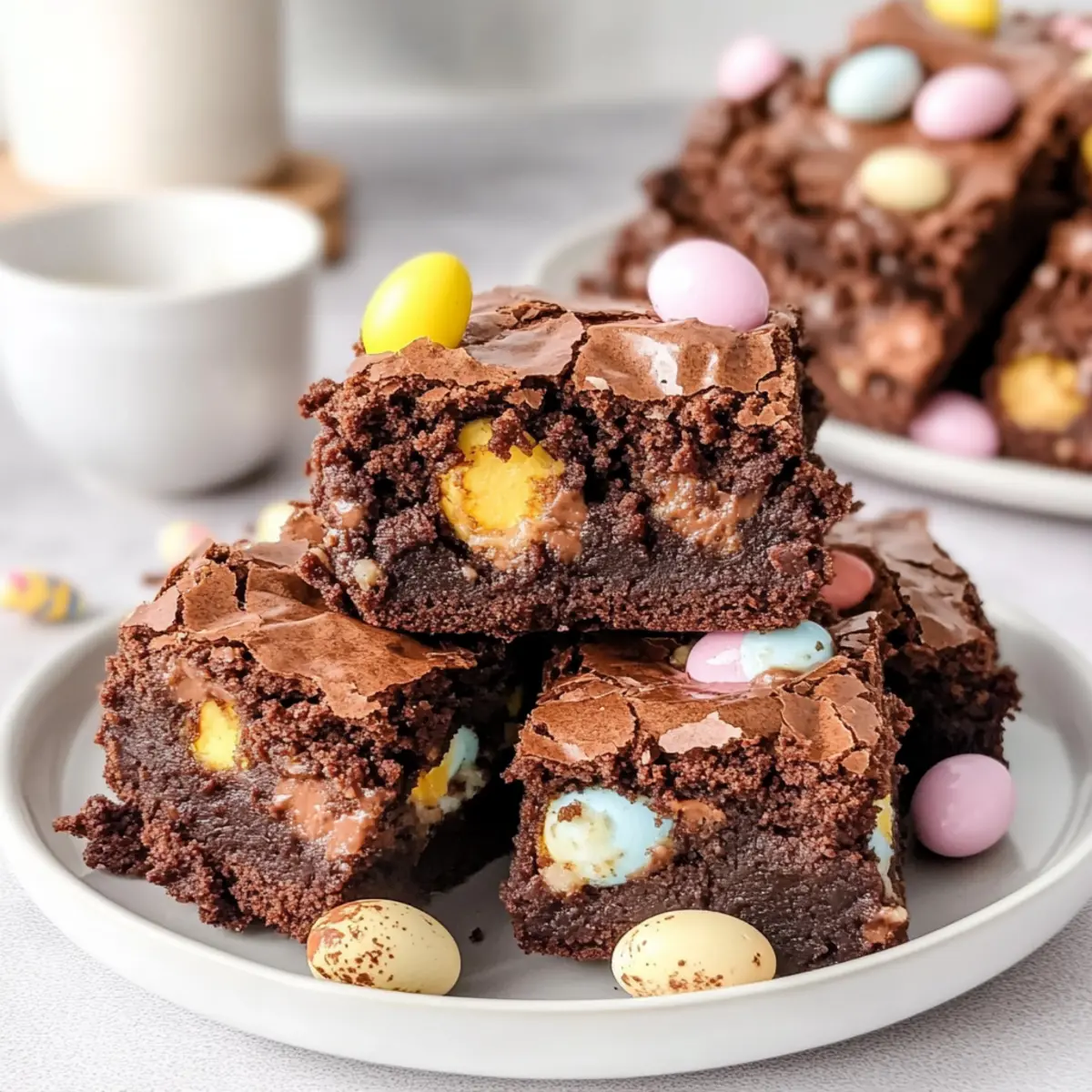 Jump to Recipe Print RecipeAs the scent of melting chocolate wafts through the air, it feels like magic in the kitchen. For Easter, I’m excited to share my recipe for Fudgy Homemade Easter Brownies with Mini Eggs—an irresistible treat that not only brings a smile to your face but also effortlessly elevates any gathering. Imagine a chewy, fudgy brownie studded with colorful mini eggs, creating an adorable and delicious masterpiece. The best part? These brownies come together in a flash, allowing you to whip up something special without spending hours in the kitchen. They’re a total crowd-pleaser, perfect for little ones and adults alike who are looking to indulge their chocolate cravings. Are you ready to bring some joy to your Easter celebrations with these delightful brownies? Let’s dive into the recipe! Why are these brownies a must-try? Festive Delight: These Fudgy Homemade Easter Brownies are adorned with vibrant mini eggs, making them a perfect centerpiece for your Easter table. Quick and Easy: With a simple preparation process, you’ll spend less time cooking and more time enjoying the festivities. Heavenly Flavor: Rich, fudgy texture and bursts of chocolate create an indulgent treat that chocolate lovers crave. Crowd-Pleasing: Everyone, young and old, will find themselves reaching for seconds, ensuring your dessert table is a hit! Don’t forget to check out my other easy treats like the Rhubarb Cinnamon Pie to round out your celebration! Fudgy Homemade Easter Brownies Ingredients For the Brownie Batter • Semi-sweet baker’s chocolate – Provides rich chocolate flavor and moisture; dark chocolate can be used for a deeper flavor. • Salted butter (melted) – Adds richness and creaminess; unsalted butter can be used with an adjusted salt amount. • White sugar – Sweetens the brownies and helps with texture; can be replaced with brown sugar for a more caramel-like flavor. • Large eggs (room temperature) – Provides structure and helps with leavening; ensure they are at room temperature for better incorporation. • Vanilla extract – Enhances overall flavor profile; no substitutions recommended for best impact. • All-purpose flour – Gives structure to the brownies; a 1:1 gluten-free blend can be used for a gluten-free variant. • Unsweetened cocoa powder – Adds depth of chocolate flavor; no substitutions recommended for best results. • Salt – Balances sweetness and enhances flavor; essential for the overall taste. • Mini eggs – Adds visual appeal and a fun crunch; chocolate chips can be used as an alternative. Step‑by‑Step Instructions for Fudgy Homemade Easter Brownies Step 1: Preheat and Prepare Begin by preheating your oven to 350°F (175°C). While it’s warming up, line an 8×8-inch baking dish with parchment paper, allowing some excess to hang over the edges for easy removal later. This is the foundation for your Fudgy Homemade Easter Brownies, ensuring the perfect bake without sticking. Step 2: Melt the Chocolate Chop the semi-sweet baker’s chocolate into smaller pieces and place it in a microwave-safe bowl. Microwave in 20-second intervals, stirring after each session, until completely melted and smooth—this should take about 1 to 2 minutes total. The melted chocolate should have a glossy appearance, ready to bring rich flavor to your brownies. Step 3: Mix Butter and Sugar In a large mixing bowl, add the melted butter and white sugar, whisking together until the mixture is smooth and combined, usually about 1-2 minutes of whisking. This step is essential for creating that fudgy texture in your brownies, and the mixture should start to look slightly glossy as you blend. Step 4: Incorporate Eggs and Vanilla Add the room temperature eggs and vanilla extract to the sugar-butter mixture. Whisk vigorously for about 5 minutes until the mixture lightens in color and becomes fluffy. This aeration helps create a delightful chewiness in your Fudgy Homemade Easter Brownies, ensuring they rise perfectly in the oven. Step 5: Add Melted Chocolate Once the egg mixture is light and airy, carefully incorporate the melted chocolate by pouring it in slowly and folding it gently. Stir until just combined—take care not to overmix. The chocolate adds a deep flavor and a dense, fudgy texture, transforming your mixture into brownie batter. Step 6: Combine Dry Ingredients Sift in the all-purpose flour, unsweetened cocoa powder, and salt into the brownie batter, making sure to fold gently with a spatula until just combined. This will prevent overmixing, which keeps your brownies fudgy rather than cakey. The batter should be thick and chocolatey with no dry flour pockets visible. Step 7: Fold in Mini Eggs Gently fold in the mini eggs, ensuring they are distributed evenly throughout the batter. This adds a delightful texture and festive touch to your Fudgy Homemade Easter Brownies. Be careful to maintain the batter’s thickness while incorporating the mini eggs to preserve that fudgy consistency. Step 8: Pour and Top Carefully pour the brownie batter into the prepared baking dish, spreading it evenly with a spatula. To add an extra festive flair, sprinkle additional mini eggs on top, pressing them in slightly so they set into the batter. This visual appeal will make your brownies even more irresistible when they come out of the oven. Step 9: Bake to Perfection Place the dish in the preheated oven and bake for 25-28 minutes. Check for doneness by inserting a toothpick into the center; it should come out with a few moist crumbs attached, indicating a fudgy texture rather than dry. The edges will look slightly set while the center remains soft. Step 10: Cool Before Slicing Once baked, remove the brownies from the oven and let them cool completely in the baking dish. This step is crucial; allowing them to cool will prevent crumbling when you slice into these Fudgy Homemade Easter Brownies. Use the parchment overhang to lift them out for easy cutting into squar
