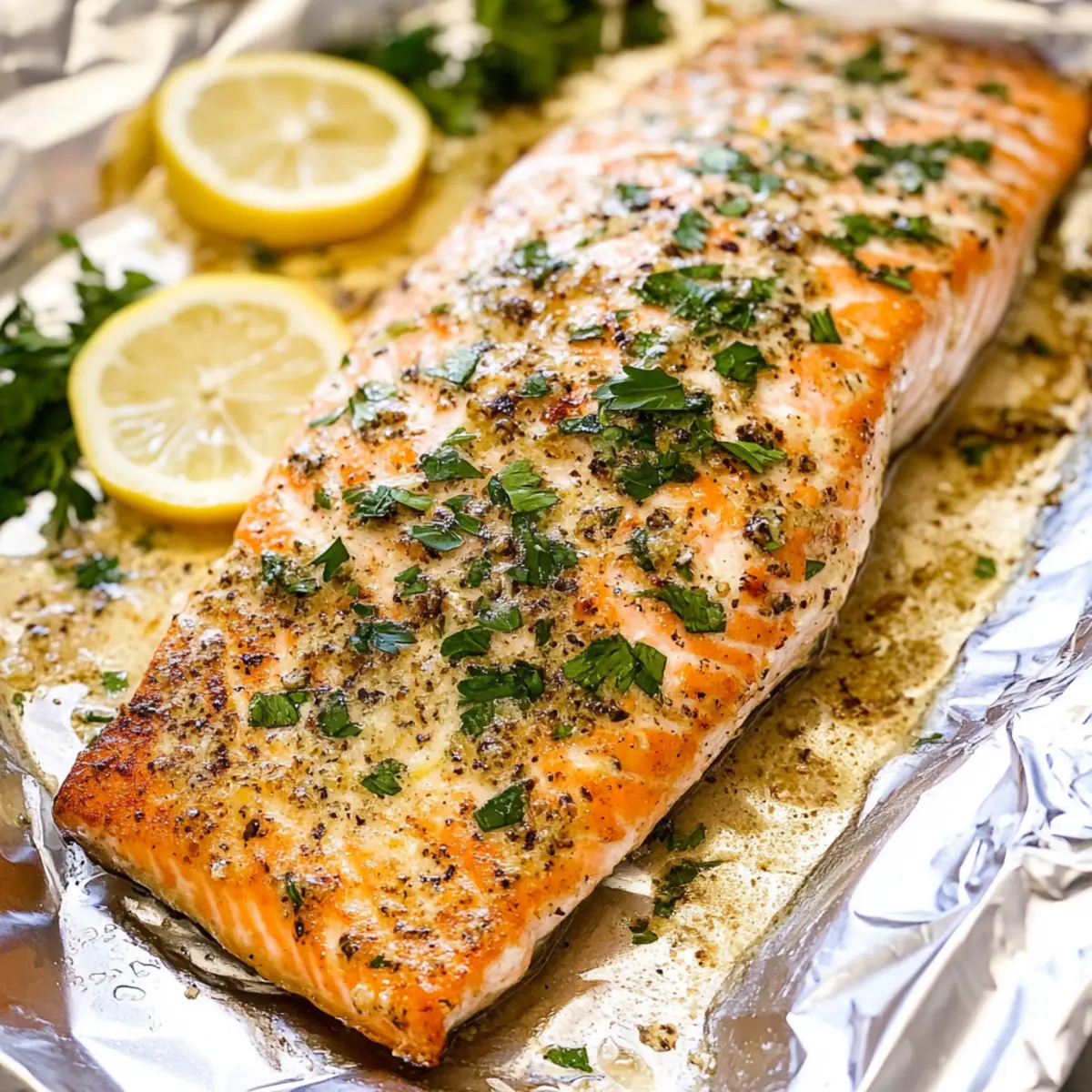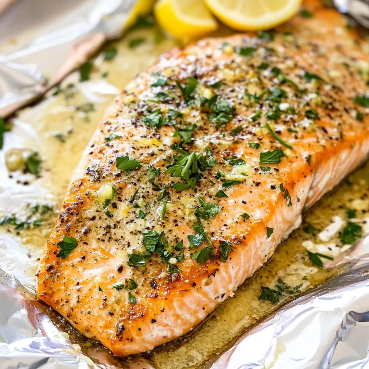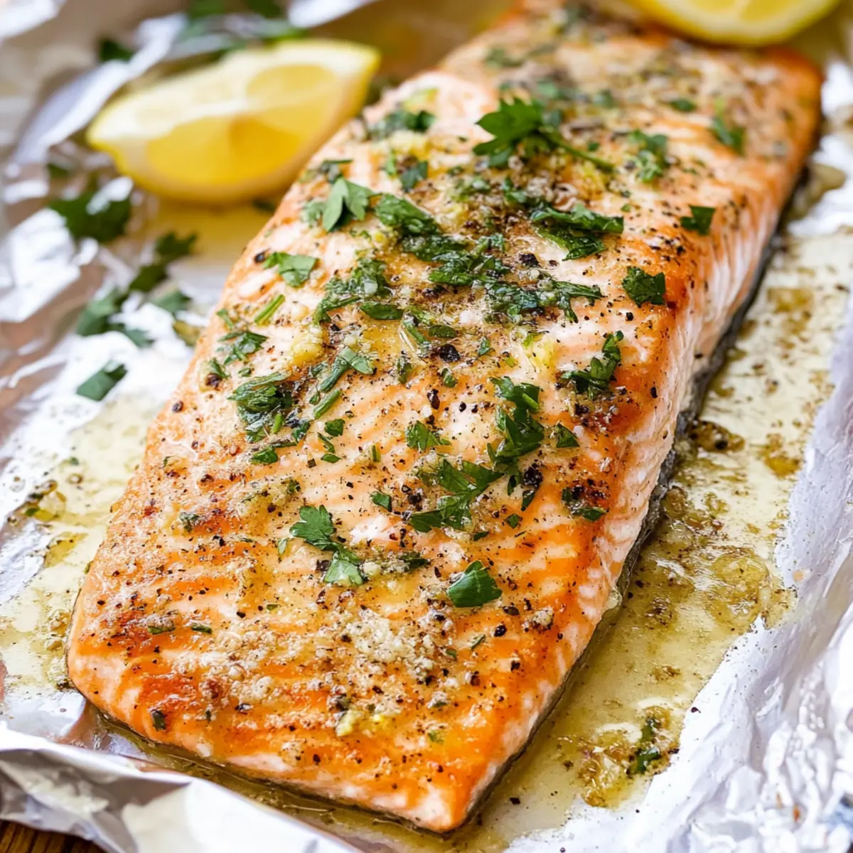Jump to Recipe Print RecipeThe rich aroma of garlic mingling with butter has a way of transforming an ordinary kitchen into a gourmet haven. If you’re searching for a spectacular yet simple seafood dish that’s sure to impress, look no further than this Easy Garlic Butter Salmon. Whether you’re juggling a busy weeknight or simply craving a quick dinner, this recipe has you covered—ready in just 30 minutes, it’s perfect for satisfying your hunger without compromising on quality. With its high protein content and delightful infusion of lemon and dill, this dish is a fantastic choice for both seafood aficionados and those easing into the world of fish. So, how about taking your dinner routine up a notch? Let’s dive into the deliciousness of Garlic Butter Salmon together! Why is Garlic Butter Salmon a must-try? Fast and Flavorful: This recipe allows you to whip up a gourmet meal in just 30 minutes! Irresistible Aroma: The combination of garlic and butter creates a heavenly scent that fills your kitchen, making dinner feel extra special. High Protein Goodness: Packed with protein and omega-3 fatty acids, this dish supports a healthy lifestyle while tasting amazing. Perfectly Versatile: Accompany it with roasted vegetables or creamy rice to create a balanced meal that caters to any palate. Crowd-Pleasing Dish: Even those hesitant about seafood will love the flaky, tender texture and delightful flavors of garlic and lemon. For more exquisite seafood meals, check out my Garlic Lemon Butter and Honey Butter Salmon recipes! Garlic Butter Salmon Ingredients • Here’s everything you need for a fantastic meal! For the Salmon Salmon – A rich source of protein and omega-3s, ensuring a healthy delight on your plate. For the Garlic Butter Sauce Butter – Adds a luxurious richness; for a lighter twist, try olive oil. Garlic – Fresh minced garlic is best for robust flavor; use garlic powder as a backup. Lemon Juice – Brightens the dish; white wine or vinegar can stand in for a zesty kick. Lemon Zest – Enhances freshness; substitute lime zest for a unique twist. Dill (dried) – Offers an earthy flavor perfect for salmon; use twice the amount of fresh dill if you have it. For Seasoning Kosher Salt and Pepper – Essentials for flavor; sea salt and black pepper are great alternatives. For Garnish Parsley (fresh, chopped) – Makes the dish pop with color and freshness; green onions or cilantro work well as substitutes. Enjoy your culinary journey with this Garlic Butter Salmon recipe! Step‑by‑Step Instructions for Garlic Butter Salmon Step 1: Preheat the Oven Begin by preheating your oven to 375°F (190°C). While the oven warms up, line a baking sheet with aluminum foil, which will help save on cleanup and ensure even cooking. This initial preparation is key for achieving that perfect flaky texture in your Garlic Butter Salmon. Step 2: Prepare the Garlic Butter Sauce In a medium bowl, whisk together the melted butter, lemon zest, lemon juice, minced garlic, dried dill, kosher salt, and freshly cracked pepper. Keep whisking until well combined, and the mixture is creamy and fragrant. This rich garlic butter sauce is what will elevate your salmon to gourmet status, so make sure it’s nicely blended. Step 3: Arrange the Salmon Place your salmon fillets skin-side down on the prepared baking sheet. Gently curl up the edges of the foil to create a makeshift packet, leaving the top open. This method allows the flavors to infuse while preventing the salmon from drying out, ensuring your dish retains its moisture and tenderness. Step 4: Add the Sauce Generously spoon the garlic butter mixture over the exposed salmon. Ensure each fillet is lavishly coated with the sauce, as this will not only enhance flavor but also help achieve that desirable golden finish. Once coated, you can now seal the foil packet by folding the edges together, trapping in all those delicious aromas. Step 5: Bake the Salmon Slide the foil-wrapped salmon into your preheated oven and bake for 15 to 20 minutes. You’ll know it’s ready when the salmon flakes easily with a fork and takes on an opaque appearance. Keep an eye on it during the last few minutes to avoid overcooking and losing that flavorful juiciness characteristic of Garlic Butter Salmon. Step 6: Garnish and Serve Once your salmon is perfectly baked, carefully remove the foil packet from the oven, allowing the steam to escape safely. Transfer the salmon to plates and garnish with freshly chopped parsley for a touch of color and flavor. Serve immediately to enjoy the rich, buttery goodness that makes this Garlic Butter Salmon truly irresistible. Make Ahead Options These Easy Garlic Butter Salmon fillets are perfect for meal prep enthusiasts! You can marinate the salmon in the garlic butter mixture up to 24 hours in advance, allowing the flavors to infuse beautifully without losing quality. Simply whisk together the butter, lemon zest, lemon juice, minced garlic, dried dill, salt, and pepper, then coat the salmon and keep it tightly covered in the refrigerator. When it’s time to cook, just unwrap the salmon, pop it into the oven, and bake as directed. This method ensures dinner is ready in a snap, giving you more time to unwind after a busy day while still enjoying delicious, homemade flavors! What to Serve with Easy Garlic Butter Salmon? Savoring a delicious salmon dish brings the perfect opportunity to create a delightful dining experience with thoughtful side choices. Creamy Mashed Potatoes: Their buttery texture pairs beautifully with the rich garlic sauce, creating a comforting comfort food combo. Garlic Roasted Asparagus: Fresh and crisp, this vegetable adds a crunchy contrast and echoes the garlic flavor in the salmon. Citrusy Quinoa Salad: Light and refreshing, the quinoa salad with zesty dressing complements the savory salmon, adding brightness to your plate. Steamed Broccoli: This simple side offers a boost of color and nutrition, bringing an ea