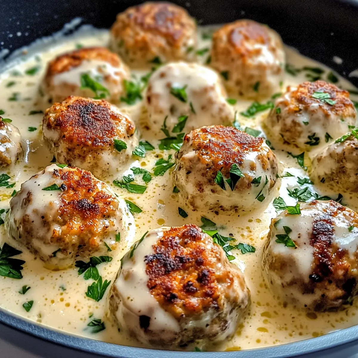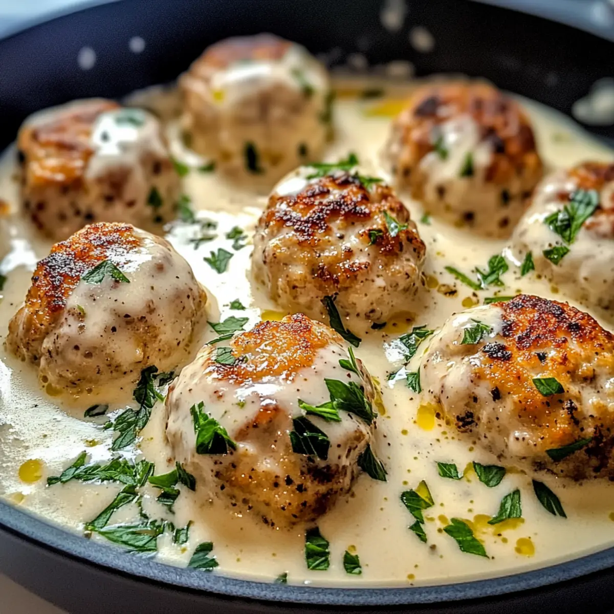 Jump to Recipe Print RecipeAs I stood in my kitchen one chilly evening, the scent of garlic wafting through the air took me straight back to cozy gatherings with friends. That’s when I decided to whip up some Garlic-Parmesan Chicken Meatballs in Cream Sauce, a weeknight wonder that never fails to impress. Juicy meatballs, bursting with flavorful garlic and cheesy goodness, are enveloped in a creamy sauce that feels like a warm hug on a plate. This dish not only brings comfort but also offers a simple solution for dinner prep. Whether you’re feeding the family or meal prepping for the week ahead, these meatballs are bound to become a favorite. Ready to take your taste buds on a creamy adventure? Let’s dive into this delightful recipe together! Why Are These Meatballs So Irresistible? Tender, Flavorful Meatballs: These Garlic-Parmesan Chicken Meatballs are juicy and packed with a delicious blend of garlic and Parmesan, satisfying even the pickiest eaters in the family. Creamy Comfort Sauce: The rich, garlicky cream sauce elevates the dish, making it the perfect comfort food for any night of the week. Quick Weeknight Solution: Ready in under 30 minutes, this recipe is a glorious answer to your busy evenings. Versatile Dish: Serve them with buttered pasta, creamy mashed potatoes, or a fresh salad—this meal adapts to whatever you’re craving. For a refreshing twist, pair it with our delightful Hawaiian Chicken Salad. Meal Prep Friendly: Easily make these meatballs ahead of time, ensuring delicious meals are just a quick reheat away. Enjoy the comfort and flavor throughout your busy week! Garlic-Parmesan Chicken Meatballs Ingredients For the Meatballs • Ground Chicken – Provides lean protein for the meatballs; substitute with ground turkey for a lighter option. • Grated Parmesan Cheese – Adds a savory, cheesy flavor; fresh Parmesan is recommended for the best taste. • Bread Crumbs – Binds the meatballs and gives them a pleasant texture; use gluten-free bread crumbs for a gluten-sensitive version. • Chopped Fresh Parsley – Provides freshness and color; you can add fresh herbs like basil or thyme for an herbal twist. • Minced Garlic – A key aromatic that deepens the garlicky essence of the dish. • Egg – Acts as a binder to help maintain the shape of the meatballs. • Salt and Black Pepper – Essential seasonings that elevate the overall flavor. • Olive Oil – Used for browning the meatballs, contributing to a rich flavor. For the Cream Sauce • Heavy Cream – Creates the luscious, creamy sauce; substitute with half-and-half or a yogurt-milk mixture for a lighter option. • Chicken Broth – Enhances the sauce flavor; low-sodium broth is a great way to control salt levels. • Garlic Powder – Adds additional depth of garlic flavor to the sauce. For Garnish • Chopped Parsley (for garnish) – Enhances presentation and adds a pop of color. With these Garlic-Parmesan Chicken Meatballs, you’ll not only enjoy a delicious comfort meal but also have the flexibility of healthy options to fit your dietary needs! Step‑by‑Step Instructions for Garlic-Parmesan Chicken Meatballs Step 1: Prepare the Meatball Mixture In a large mixing bowl, combine ground chicken, 1/4 cup grated Parmesan, bread crumbs, chopped parsley, minced garlic, one egg, and a generous pinch of salt and black pepper. Use your hands to mix gently until just combined, avoiding overmixing to keep the meatballs tender. This creates the flavorful base for your Garlic-Parmesan Chicken Meatballs. Step 2: Shape the Meatballs With clean hands, scoop out the mixture and form it into 1-inch balls, aiming for about 18-20 meatballs in total. Place them on a baking sheet lined with parchment paper for easy transfer later. Take a moment to enjoy the delightful aroma of the garlic and herbs; your meatballs are already shaping up to be a winner! Step 3: Brown the Meatballs In a large skillet, heat 2 tablespoons of olive oil over medium heat. Once hot, carefully add the meatballs in batches, allowing them to brown for 5-6 minutes on all sides, until golden and cooked through. Avoid overcrowding the pan to ensure even cooking. Once browned, transfer the meatballs to a plate and set aside, letting the skillet retain all those lovely flavors. Step 4: Create the Cream Sauce In the same skillet, lower the heat and pour in 1 cup of heavy cream, 1 cup of chicken broth, and 1 teaspoon of garlic powder. Stir the mixture gently, scraping the bottom of the pan to incorporate any browned bits. Cook for 3-4 minutes, allowing the sauce to thicken slightly while the cheese melts into a rich, creamy blend that will envelop your Garlic-Parmesan Chicken Meatballs perfectly. Step 5: Simmer the Meatballs Return the browned meatballs to the skillet with the creamy sauce. Cover the skillet and let them simmer on low heat for 8-10 minutes, or until the meatballs reach an internal temperature of 165°F. This step allows the meatballs to soak up the rich flavors of the sauce while remaining juicy and tender—this is where the magic happens! Step 6: Garnish and Serve Once the meatballs are cooked through, sprinkle with chopped parsley for a fresh touch. Serve your Garlic-Parmesan Chicken Meatballs over buttered pasta, creamy mashed potatoes, or even on their own for a comforting meal. The luscious sauce is simply begging for something to soak it up, making every bite utterly delicious! Expert Tips for Garlic-Parmesan Chicken Meatballs • Mix Gently: Avoid overmixing the meatball mixture to keep them tender and prevent a dense texture. • Crowd Control: Brown the meatballs in batches and don’t overcrowd the pan. This ensures they cook evenly and develop a beautiful golden crust. • Temperature Check: Use a meat thermometer to ensure that the meatballs reach an internal temperature of 165°F for safe eating. • Homemade Sauce Joy: Consider making the cream sauce in advance. It can be refrigerated for up to 2 days; just reheat g