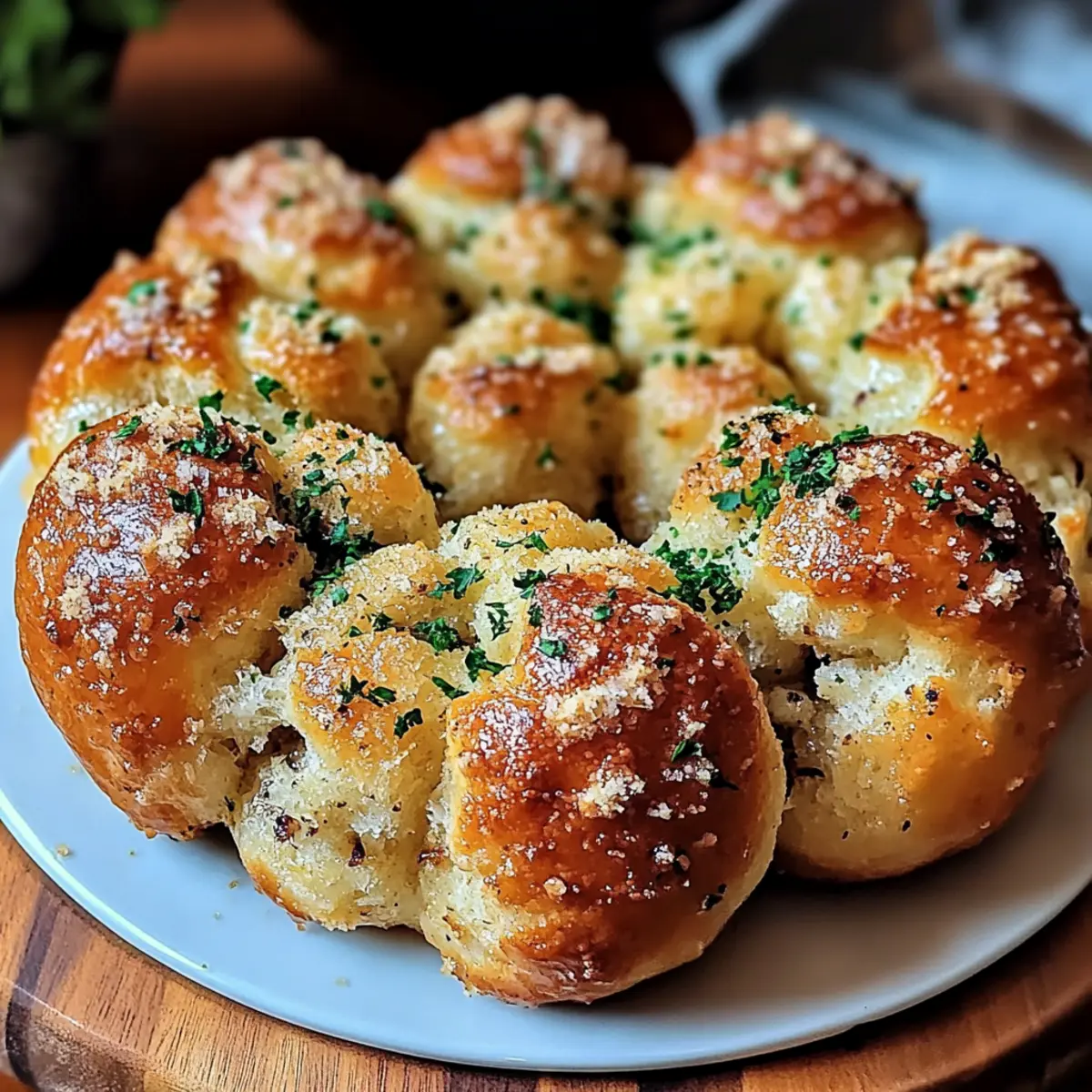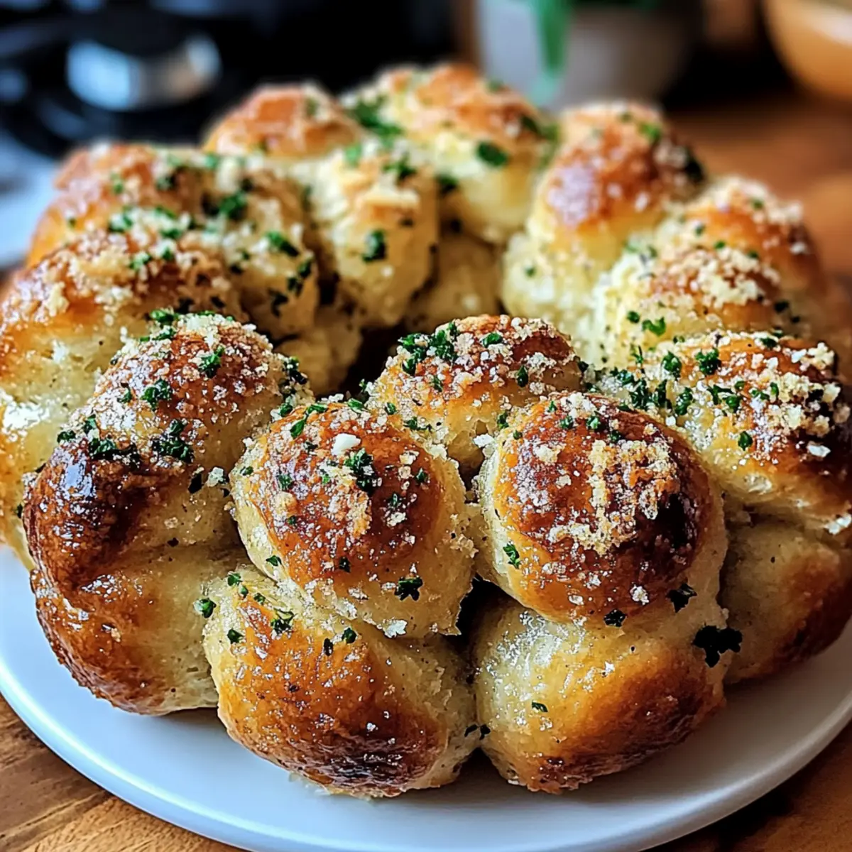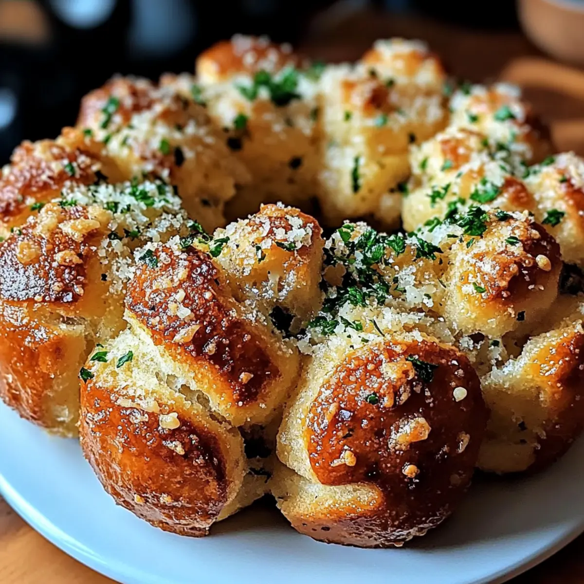 Jump to Recipe Print RecipeThe aroma of melting garlic and butter fills the air, instantly transporting me to cozy family gatherings and joyous celebrations. That’s the magic of Garlic Parmesan Monkey Bread—a cheesy pull-apart delight that never fails to please a crowd. Made from simple refrigerated biscuit dough, this recipe transforms into golden, fluffy bites with a crispy exterior and a warm, soft interior. What’s more, it’s incredibly easy to whip up, allowing you to spend less time in the kitchen and more time with your favorite people. Whether you’re hosting a get-together or looking for a comforting side dish, this Garlic Parmesan Monkey Bread is the perfect solution. Ready to indulge in this savory treat that’s both fun to make and divine to share? Why Is This Monkey Bread Irresistible? Easy Preparation: This Garlic Parmesan Monkey Bread comes together in just a few simple steps, making it a perfect choice for those busy weeknights or spontaneous gatherings. Flavor Explosion: The irresistible combination of buttery garlic and nutty Parmesan cheese creates a flavor sensation that will have your taste buds dancing. Perfect for Sharing: With its pull-apart format, it’s a fun, interactive dish that encourages sharing and conversation among friends and family. Versatile Pairing Options: Serve it alongside marinara or ranch for dipping, or as a delightful appetizer at your next dinner party. Crowd-pleaser: Whether at casual family dinners or elegant celebrations, this monkey bread never fails to impress with its delicious taste and appealing presentation. For an extraordinary twist, consider pairing it with a delicious Lemon Garlic Butter main dish to complete your meal! Garlic Parmesan Monkey Bread Ingredients For the Dough • Refrigerated biscuit dough – Provides the base, creating fluffy pull-apart pieces; homemade dough works too! • Unsalted butter – Adds richness and moisture; can substitute with salted butter, reducing extra salt. For the Flavoring • Grated Parmesan cheese – Essential for flavor; brings a nutty, salty element, or use Pecorino Romano for a sharper taste. • Garlic powder – Adds great garlic flavor without the hassle; fresh minced garlic can be used for a punchier kick. • Dried parsley – Enhances flavor and adds a hint of freshness; fresh parsley works too but use a bit less. • Salt – Balances flavors; adjust according to the butter’s salt content. • Black pepper – Offers mild heat; adjust to taste based on your preference. • Italian seasoning – Complements garlic and Parmesan; feel free to omit if desired. • Red pepper flakes (optional) – Adds a slight heat; omit for a milder taste. For Preparation • Cooking spray – Prevents sticking in your pan; butter or oil can be good alternatives. This flavorful Garlic Parmesan Monkey Bread is a delightful treat that’s perfect for cozy gatherings! Step‑by‑Step Instructions for Garlic Parmesan Monkey Bread Step 1: Preheat the Oven Begin by preheating your oven to 350°F (175°C). This essential step ensures that your Garlic Parmesan Monkey Bread bakes evenly, creating that perfect golden-brown exterior. While the oven is heating, gather your ingredients and equipment, including a bundt pan, mixing bowls, and a whisk for mixing. Step 2: Prepare the Biscuit Dough Open the refrigerated biscuit dough and tear it into small, irregular pieces, about 1-inch in size. This will allow for those delightful pull-apart sections. Be sure to create enough pieces so that every bite is packed with flavor. Set these pieces aside in a mixing bowl as you prepare the garlic-butter mixture. Step 3: Melt the Butter and Mix Seasonings In a microwave-safe bowl, melt ½ cup of unsalted butter until just liquid. Stir in garlic powder, dried parsley, salt, black pepper, Italian seasoning, and optional red pepper flakes to create a fragrant garlic-butter mixture. This will infuse your Garlic Parmesan Monkey Bread with irresistible flavor. Mix until well combined and vibrant. Step 4: Coat the Biscuit Pieces Pour the melted butter mixture over the torn biscuit pieces in the bowl. Toss the dough pieces gently until each one is thoroughly coated with the rich, garlicky goodness. Ensure every piece is well covered for maximum flavor; the buttery coating is key to achieving that mouthwatering crunch. Step 5: Layer the Dough in the Pan Lightly spray or grease your bundt pan with cooking spray to prevent sticking. Begin layering the coated biscuit pieces into the pan, stacking them haphazardly for a rustic look. This will create lots of nooks and crannies, perfect for the butter to seep into while baking. Continue layering until all the dough pieces are used. Step 6: Bake the Monkey Bread Place the bundt pan in your preheated oven and bake for 30-35 minutes. Keep an eye on it; you want the monkey bread to rise and turn a beautiful golden brown. Once finished, a toothpick inserted should come out clean, and the edges should look crisp and inviting. Step 7: Cool and Invert onto Serving Plate After baking, remove your Garlic Parmesan Monkey Bread from the oven and allow it to cool in the pan for about 5 minutes. Then, carefully invert the pan onto a serving plate. Give it a gentle shake if necessary to release the delicious pull-apart bread, revealing its golden crust and fluffy interior. How to Store and Freeze Garlic Parmesan Monkey Bread Room Temperature: Store leftover monkey bread in an airtight container at room temperature for up to 2 days to maintain its fluffy texture. Fridge: If you want to keep it longer, refrigerate for up to a week in an airtight container, but be prepared for a slight change in texture. Freezer: For longer storage, freeze the wrapped monkey bread in plastic wrap and aluminum foil for up to 2 months. Thaw in the fridge overnight before reheating. Reheating: To restore crispness, reheat the garlic Parmesan monkey bread in the oven at 350°F (175°C) for about 10 minutes, ensuri