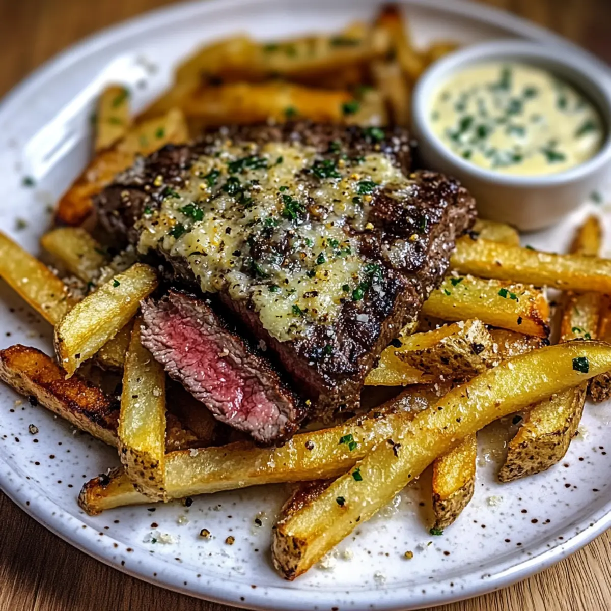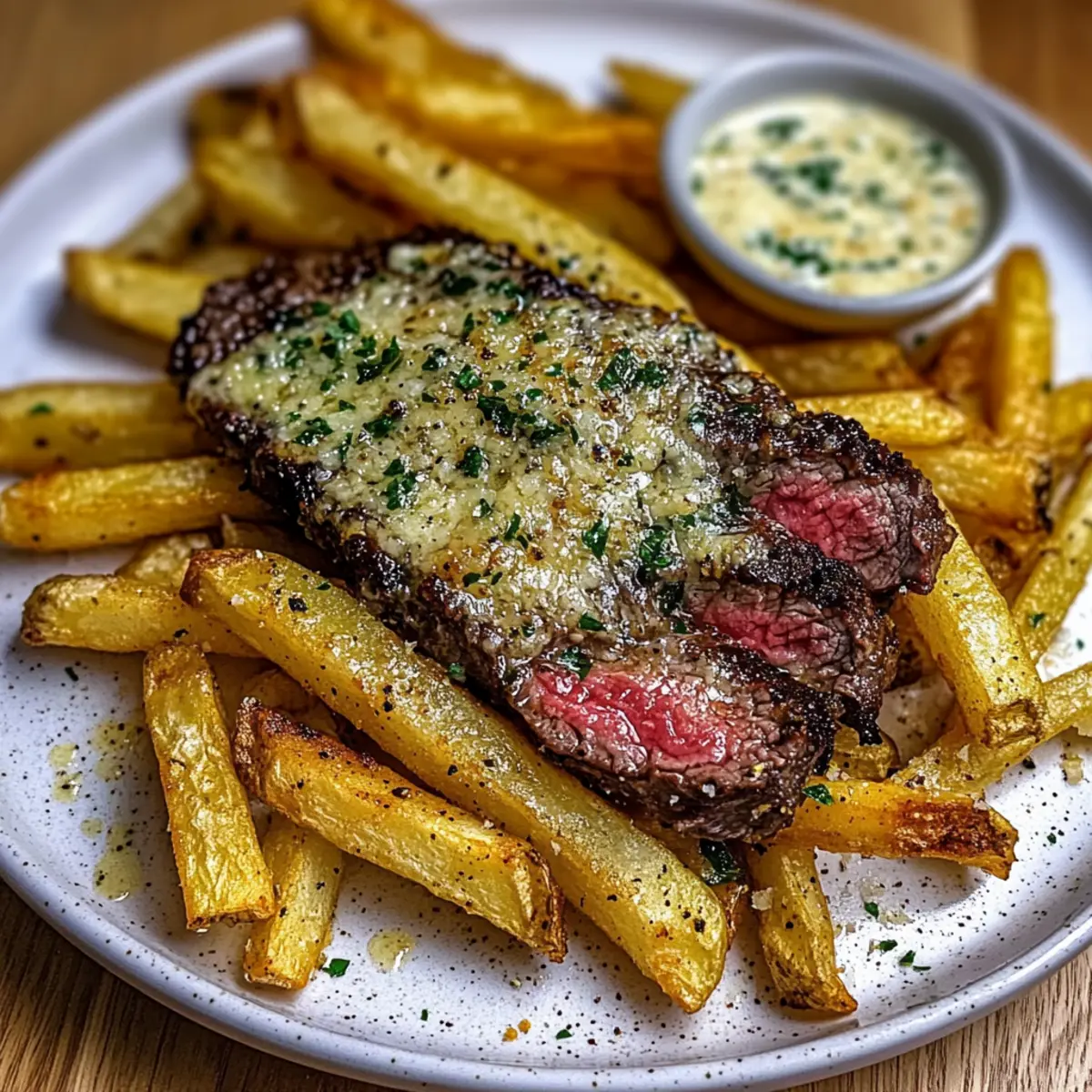 Jump to Recipe Print RecipeThe aroma wafting through my kitchen instantly transports me back to cozy family gatherings, where the crispy crunch of freshly baked fries is met with playful banter and laughter. These Garlic Parmesan Steak Fries are not just a side dish; they are an experience that brings comfort to any meal. Oven-baked to perfection, they offer a delightful balance of a golden, crispy exterior and a fluffy interior that simply melts in your mouth. What’s more, this easy recipe elevates ordinary Russet potatoes into a beloved comfort food that pairs beautifully with everything from juicy steaks to your favorite dipping sauce. Whether you’re cooking for friends or craving a comforting weeknight treat, these fries are bound to dazzle. Ready to take your cooking to the next level? Let’s dive in! Why are these fries a must-try? Crispy Texture: You’ll love how the golden crust gives way to a fluffy interior, creating the perfect contrast in every bite. Flavor Explosion: Packed with savory garlic and Parmesan, these fries elevate any meal, whether served alongside a juicy steak or enjoyed as a snack with your favorite aioli. Easy to Make: With just a few simple ingredients and straightforward steps, this oven-baked recipe allows for homemade comfort food without the fuss. Versatile Pairings: Ideal for everything from family dinners to casual gatherings, these fries are the perfect accompaniment to grilled burgers or roasted chicken, ensuring they’ll please any crowd. Get creative by trying them with recipes like Garlic Lemon Butter or keeping it classic with some Balsamic Steak Gorgonzola. Garlic Parmesan Steak Fries Ingredients • The secret to achieving the perfect fries lies in these simple ingredients! For the Fries Russet Potatoes – The ideal choice for fries, yielding a fluffy texture inside; you can substitute with Yukon Gold for a creamier bite. Olive Oil – This ingredient helps achieve that crispy exterior; feel free to swap with vegetable oil if preferred. Kosher Salt – Essential for bringing out the flavor; sea salt works just as well. Black Pepper – Adds depth; adjust according to your taste. Garlic Powder – Infuses fries with delicious garlic flavor; fresh minced garlic can enhance the taste even more. Dried Oregano – Imparts a lovely earthy note; you could use Italian seasoning as an alternative. Parmigiano Reggiano Cheese – This cheese creates a rich, nutty flavor and a tempting cheesy crust; Grana Padano is a suitable substitute. Fresh Parsley – For garnish, bringing a touch of color and freshness to your plate; this step is optional. For the Steak New York Striploin Steak – A juicy companion for the fries, seasoned simply for maximum flavor. Beef Tallow – Provides a rich flavor when searing the steak; olive oil or butter can be used instead. For the Dipping Sauce Lemon Herb Aioli – Enhances the dish with tangy goodness; feel free to swap for your favorite dip. Fresh Chives – Optional garnish that adds a burst of freshness and color. With these ingredients, your Garlic Parmesan Steak Fries will surely be a hit, transforming an ordinary meal into an extraordinary occasion! Step‑by‑Step Instructions for Garlic Parmesan Steak Fries Step 1: Preheat the Oven Begin by preheating your oven to 425°F (220°C). This step is crucial for achieving the perfect crispy texture for your Garlic Parmesan Steak Fries. Ensure your oven is fully heated before baking to secure that golden exterior. Step 2: Prepare the Potatoes Peel and slice the Russet potatoes into uniform 1/2-inch thick fries to promote even cooking. Rinse the fries under cold water to remove excess starch and then pat them dry with a clean towel. In a large bowl, toss the fries with olive oil, kosher salt, black pepper, garlic powder, and oregano until they are evenly coated. Step 3: Initial Bake Spread the seasoned fries evenly on parchment-lined baking sheets, ensuring they are not overcrowded for proper air circulation. Bake in the preheated oven for 20–25 minutes, or until the fries are tender and starting to turn golden. Keep an eye on them, as the first bake is essential for achieving that desired crunch. Step 4: Flip the Fries After the initial baking time, remove the trays from the oven and carefully flip each fry to ensure even cooking. Sprinkle half of the Parmigiano Reggiano cheese over the fries at this point, allowing them to melt and form that irresistible cheesy crust. Return the baking sheets to the oven for another 10–15 minutes. Step 5: Final Bake Continue baking until the fries are golden brown and crispy on the outside. In the last few minutes, add the remaining cheese to the fries, watching closely to avoid burning. You’ll know they are ready when they are beautifully golden and emit a tempting aroma, signaling the Garlic Parmesan Steak Fries’ completion. Step 6: Cook the Steak While the fries are baking, season the New York striploin steak with kosher salt and black pepper. Heat beef tallow in a cast-iron skillet over medium-high heat. Once hot, sear the steak for about 3-4 minutes on each side for a perfect medium-rare finish. Keep an eye on the steak for a beautiful crust. Step 7: Rest the Steak Once cooked to your desired level of doneness, transfer the steak to a cutting board. Allow it to rest for 5-10 minutes before slicing, ensuring the juices redistribute to keep it tender and juicy. This step is essential for optimal flavor and moisture. Step 8: Serve To plate your Garlic Parmesan Steak Fries, arrange them alongside the sliced steak. Drizzle with lemon herb aioli for added flavor, and sprinkle with fresh parsley and chives for a pop of color. Enjoy the delightful combination of savory flavors in this comforting dish! What to Serve with Garlic Parmesan Steak Fries The warm, inviting aroma of garlic and Parmesan wafts through your kitchen, beckoning everyone to the table for a comforting feast. Juicy New York Strip Steak: The perfect meaty c