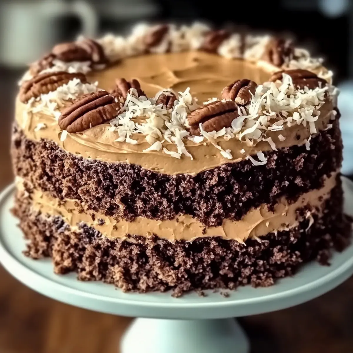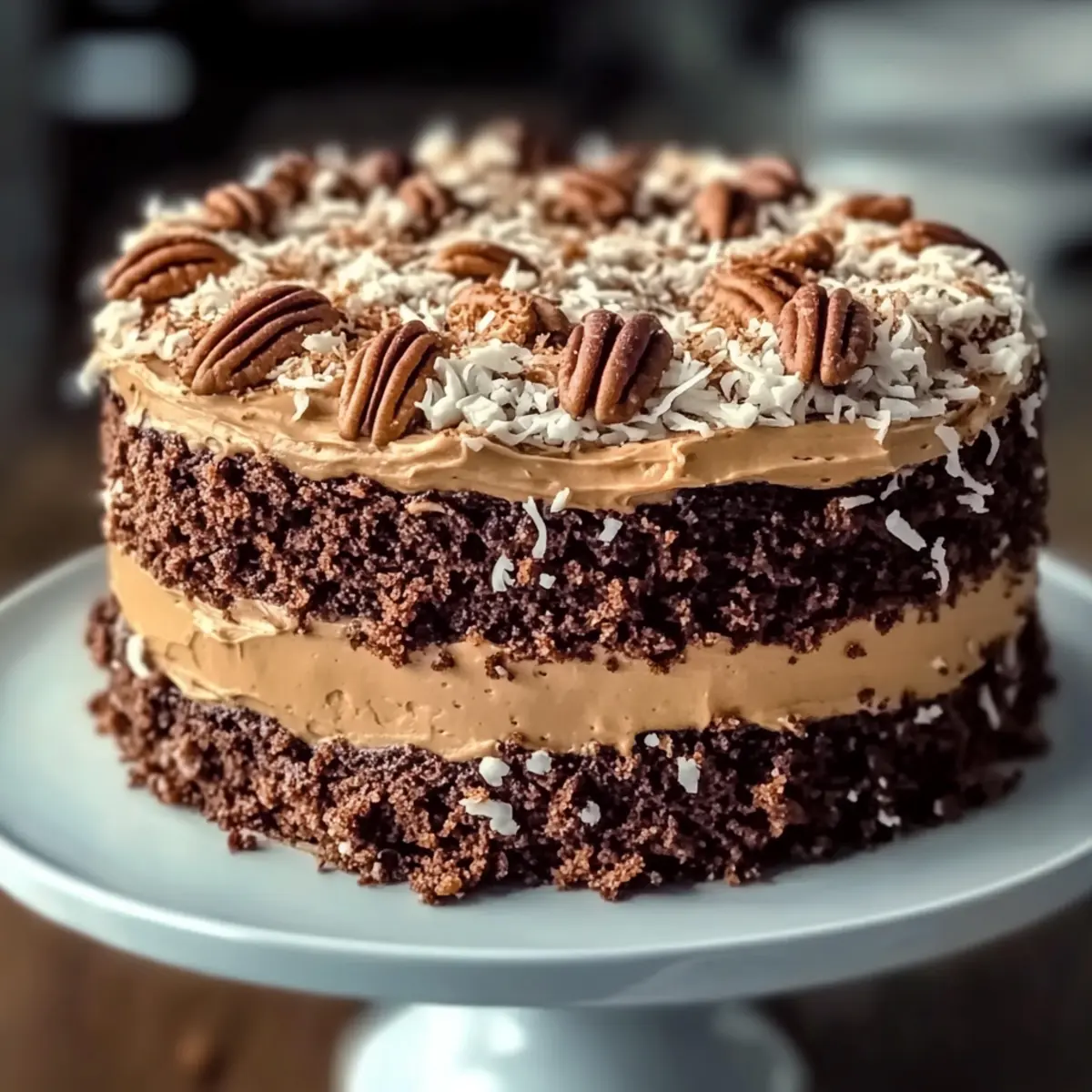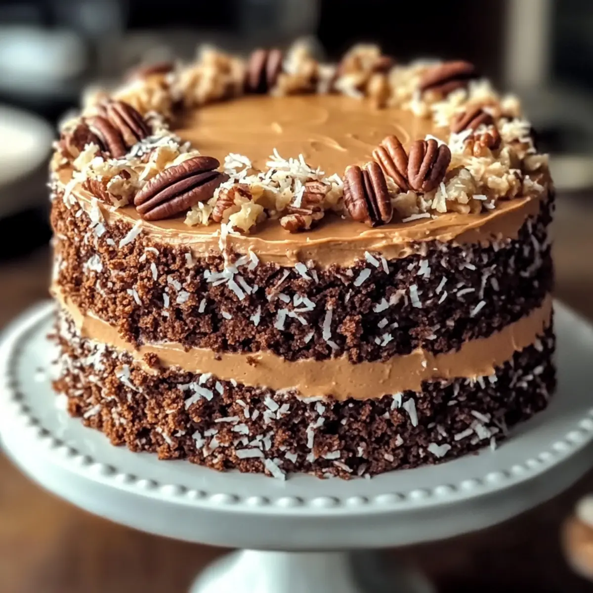Jump to Recipe Print RecipeTucked away in my grandmother’s recipe box, I stumbled upon a stained index card that held the magic of her German Chocolate Cake. This delightful dessert is a trip down memory lane, pulling at my heartstrings and enticing my taste buds with its rich layers and decadent coconut pecan frosting. It’s an absolute showstopper that’s surprisingly easy to whip up, making it perfect for both cozy family gatherings and festive celebrations. Not only does this cake satisfy your sweet tooth, but it also offers a fun twist on traditional chocolate desserts that everyone will adore. Ready to bring a slice of joy to your table? Let’s dive into the world of German Chocolate Cake together! Why is German Chocolate Cake so irresistible? Decadent flavors: The rich chocolate, combined with the delightful coconut and pecan frosting, creates a flavor explosion that will have everyone asking for seconds. Nostalgic treat: This cake brings back memories of family gatherings and celebrations, making it more than just a dessert – it’s a sweet piece of history. Surprisingly simple: With just a few straightforward steps, you can create a stunning dessert that impresses both friends and family, even if you’re new to baking! Versatile options: Whether you serve it at birthday parties or cozy dinners, this German Chocolate Cake fits any occasion beautifully – think about pairing it with a scoop of vanilla ice cream for a delightful twist. Showstopper presentation: Its layered look and luscious frosting not only taste incredible but also make for stunning visuals, perfect for impressing guests. Dive deeper into baking with more delicious cake recipes to keep your sweet tooth satisfied! German Chocolate Cake Ingredients For the Cake • All-purpose flour – a key base that gives structure and stability to your cake. • Granulated sugar – brings sweetness and enhances the chocolate flavor beautifully. • Unsweetened cocoa powder – essential for that rich chocolate taste that makes this cake unforgettable. • Baking powder – helps the cake rise, creating a light and airy texture. • Baking soda – works in tandem with baking powder for the perfect lift. • Salt – enhances the overall flavors and balances the sweetness. • Eggs – act as a binding agent, providing moisture and richness. • Milk – makes for a moist crumb and adds creaminess to the batter. • Vegetable oil – ensures a tender and moist cake, keeping it fresh longer. • Vanilla extract – adds depth and a lovely aroma to complement the chocolate. • Boiling water – intensifies the cocoa flavor and creates a smooth batter. For the Coconut Pecan Frosting • Sweetened shredded coconut – adds texture and a delightful sweetness that pairs perfectly with the chocolate. • Chopped pecans – introduce a nutty crunch that elevates the frosting. • Sweetened condensed milk – makes the frosting rich and creamy, binding the ingredients together. • Butter – adds richness and helps with spreading the frosting evenly. • Vanilla extract – infuses a warm flavor that complements the frosting perfectly. Dive into this German Chocolate Cake recipe, and prepare to impress with every delicious slice! Step‑by‑Step Instructions for German Chocolate Cake Step 1: Prepare the Oven and Pans Preheat your oven to 350°F (175°C) and gather your baking equipment. Grease and flour two 9-inch round cake pans, making sure to tap out any excess flour. This preparation ensures your decadent German Chocolate Cake layers will release easily after baking, providing a beautiful presentation for your finished masterpiece. Step 2: Mix Dry Ingredients In a large mixing bowl, whisk together 2 cups of all-purpose flour, 2 cups of granulated sugar, ¾ cup of unsweetened cocoa powder, 1 ½ teaspoons of baking powder, 1 ½ teaspoons of baking soda, and 1 teaspoon of salt. This step is essential for achieving a perfectly balanced flavor and texture in your cake, ensuring the ingredients are evenly combined for optimal rising and taste. Step 3: Combine Wet Ingredients In a separate bowl, mix together 3 large eggs, 1 cup of milk, ½ cup of vegetable oil, and 2 teaspoons of vanilla extract. Beat the mixture until smooth, then gradually add it to your dry ingredients. Use a hand mixer on medium speed for about 2 minutes until everything is well combined, creating a rich, velvety batter that’s ready for the final touch. Step 4: Add the Boiling Water Carefully stir in 1 cup of boiling water to the batter, mixing well. This step intensifies the cocoa flavor and results in a thinner batter, but don’t worry—it’s perfect! Pour your combined mixture evenly into the prepared cake pans and tap gently to release any air bubbles. Your cakes are ready to bake! Step 5: Bake the Cakes Place the cake pans in the preheated oven and bake for 30-35 minutes. Check for doneness by inserting a toothpick in the center; it should come out clean with a few moist crumbs attached. Once baked, remove the cakes from the oven and let them cool in the pans for about 10 minutes before transferring to wire racks to cool completely. Step 6: Make the Coconut Pecan Frosting While your cake layers cool, prepare the frosting. In a saucepan, combine 1 cup of sweetened shredded coconut, 1 cup of chopped pecans, 1 cup of sweetened condensed milk, and ½ cup of butter over medium heat. Stir constantly for about 10 minutes until the mixture thickens and turns golden. Remove from the heat and mix in 1 teaspoon of vanilla extract, allowing it to cool slightly. Step 7: Assemble the Cake Once the cake layers are completely cooled, place one of the layers on a serving plate. Spread a generous layer of the coconut pecan frosting on top, then carefully place the second layer over it. Use the remaining frosting to generously cover the top and sides of the cake, creating a stunning look that showcases its delightful flavors. Step 8: Serve and Share Slice your beaut