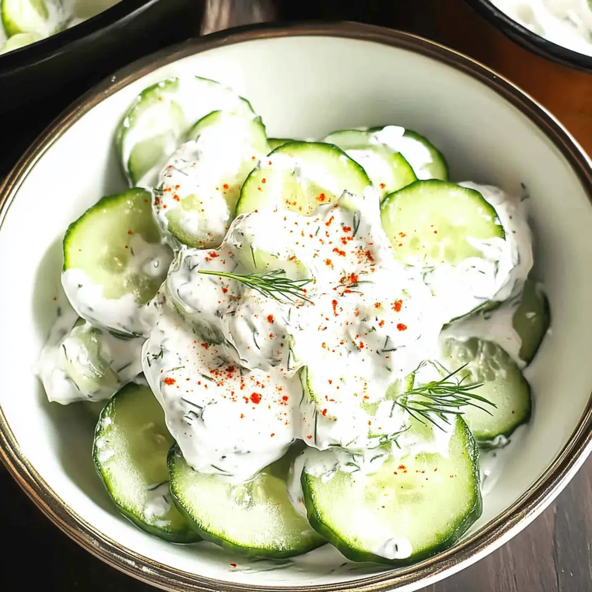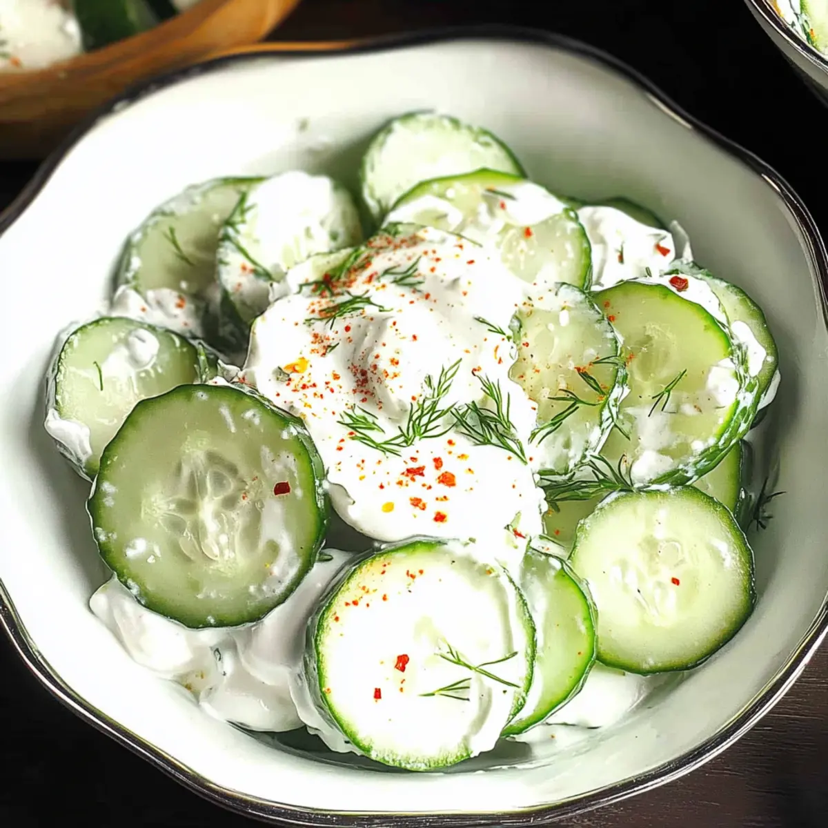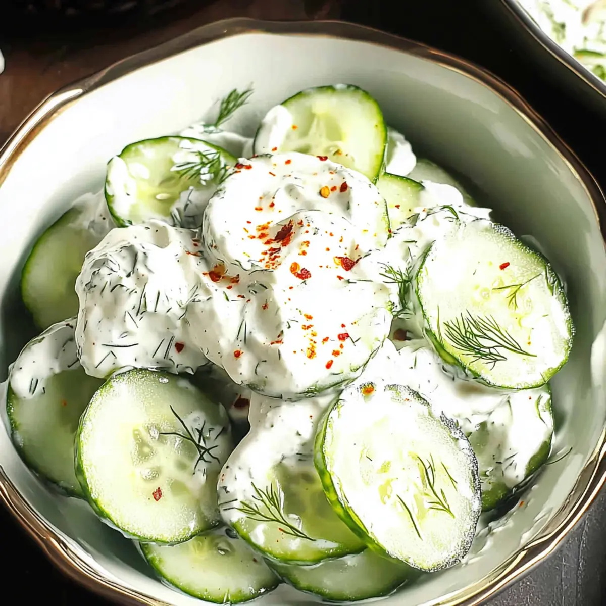 Jump to Recipe Print RecipeAs summer beckons with its warm embrace, it’s the perfect time to celebrate freshness in simple ways. I adore creating a Greek Yogurt Cucumber Salad—a quick Mediterranean delight that elevates any meal in just under five minutes. The beauty of this dish lies in its effortless preparation, making it a go-to side for grilled meats or spicy dishes. Not only does it offer a refreshing crunch, but the creamy yogurt and fragrant dill also work together to create a well-balanced flavor that cools the palate beautifully. Plus, with gluten-free and plant-based options available, this salad is a nutritious choice for everyone! Are you ready to dive into this vibrant and satisfying recipe? Why is this Greek Yogurt Salad a Must-Try? Quick and Easy: This Greek Yogurt Cucumber Salad comes together in just five minutes, making it perfect for busy weeknights or last-minute gatherings. Nutritious Delight: With just a few ingredients, it’s a healthy option packed with vitamins A and C while being low in calories. Versatile Flavor: The creamy yogurt and fragrant dill bring a unique taste that complements grilled meats or spicy dishes beautifully. Refreshingly Light: Its fresh crunch and buttery texture make it the ultimate summer side, ideal for BBQs or picnics. Plant-Based Adaptable: Looking for vegan options? Simply swap Greek yogurt for your favorite plant-based alternative for a delicious twist! Experience this vibrant dish alongside other delightful salads, like my Strawberry Spinach Salad or Broccoli Crunch Salad, and make your meals memorable! Greek Yogurt Cucumber Salad Ingredients For the Salad Cucumbers – Provide a fresh crunch; must be washed and sliced just before serving. Test for bitterness before using. Greek Yogurt (Plain) – Adds creaminess and a tangy flavor; substitutes include plant-based yogurts for a vegan option. Dill – Offers fragrant, herbaceous notes that complement the yogurt and cucumber; alternatively, use fresh mint, parsley, or chives. Red Chili Flakes (Optional) – Introduces a touch of heat; adjust or omit based on preference. Salt – Enhances all flavors; quantity can be adjusted to taste. The Greek Yogurt Cucumber Salad is great to whip up for a quick, nutritious meal! Step‑by‑Step Instructions for Greek Yogurt Cucumber Salad Step 1: Prepare the Cucumbers Start by washing two medium cucumbers thoroughly under cool running water to remove any debris. Once clean, slice them evenly into thin rounds using a sharp knife or a mandoline for consistent thickness. Aim for about 1/8-inch slices so they maintain a nice crunch. Testing for bitterness is essential—discard any overly bitter slices. Step 2: Combine Ingredients In a large mixing bowl, add the sliced cucumbers along with 1 cup of plain Greek yogurt. Sprinkle in a generous tablespoon of freshly chopped dill for flavor and, if desired, a pinch of red chili flakes for a kick. Season the mixture with a couple of generous pinches of salt, enhancing the overall flavor of the Greek Yogurt Cucumber Salad. Step 3: Mix Gently Using a spatula, gently fold the ingredients together until the cucumbers are well-coated with the creamy yogurt and herbs. Be careful not to crush the cucumber slices during this process; you want to maintain their crisp texture. This will only take about a minute, and you’ll see the vibrant colors blend beautifully. Step 4: Serve Immediately Transfer the Greek Yogurt Cucumber Salad to a serving bowl and enjoy right away while the ingredients are fresh and crisp. It’s best to serve this dish immediately to preserve the salad’s vibrant texture and taste. Pair it with your favorite grilled meats or spicy sides for a refreshing complement to your meal. Expert Tips for Greek Yogurt Cucumber Salad Fresh Ingredients: Use cucumbers that are firm and crisp. Avoid soft or wrinkled cucumbers, which can spoil the salad’s texture. Quick Preparation: Prepare the Greek Yogurt Cucumber Salad just before serving to maintain its freshness. This prevents excess moisture from making the cucumbers soggy. Taste Before Mixing: Always taste the cucumbers first. Some varieties can be bitter, especially near the ends; cutting those parts away ensures a refreshing flavor. Customize Your Herbs: While dill is perfect, feel free to swap it for other fresh herbs like mint or parsley to suit your taste, adding a personal touch to the Greek Yogurt Cucumber Salad. Chill Before Serving: For an even cooler experience, let the salad chill in the fridge for about 15 minutes before serving. It heightens the refreshment factor, especially on hot days. Make Ahead Options These Greek Yogurt Cucumber Salad components are perfect for meal prep, allowing you to save time during busy weeknights! You can wash and slice the cucumbers up to 24 hours in advance and refrigerate them in an airtight container to maintain their crunch. Additionally, mix the Greek yogurt, dill, and seasonings in a separate bowl up to 3 days ahead for optimal flavor infusion. When you’re ready to serve, simply combine the prepped cucumbers with the yogurt mixture and stir gently. This method ensures that your salad remains just as delicious and fresh, while also making meal planning a breeze! What to Serve with Greek Yogurt Cucumber Salad As you savor the creamy and refreshing notes of this delightful salad, consider these complementary dishes to create a full-flavored meal experience. Grilled Chicken Skewers: Charred to perfection, they add a smoky depth that contrasts beautifully with the salad’s coolness, making each bite a celebration of flavors. Quinoa Tabbouleh: This vibrant dish brings a nutty texture and fresh herbs, harmonizing with the cucumber’s crunch and enhancing your Mediterranean spread. Stuffed Bell Peppers: The hearty filling of rice or lentils offers a satisfying bite, bringing a bit of comfort to your table alongside the lightness of the Greek Yogurt Cucumber Salad. Roasted Vegetables: Seasoned with o