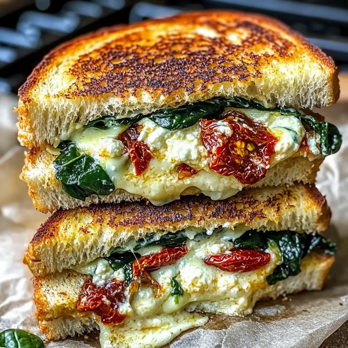 This grilled cheese classic sandwich is elevated with sun-dried tomatoes, fresh spinach, and creamy ricotta, making it a delightful twist on comfort food.