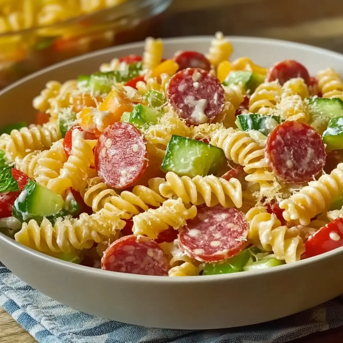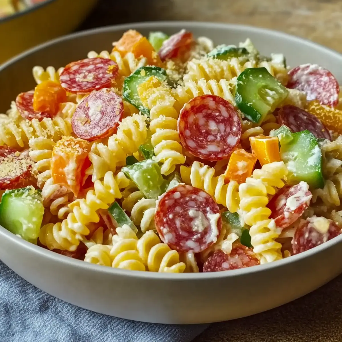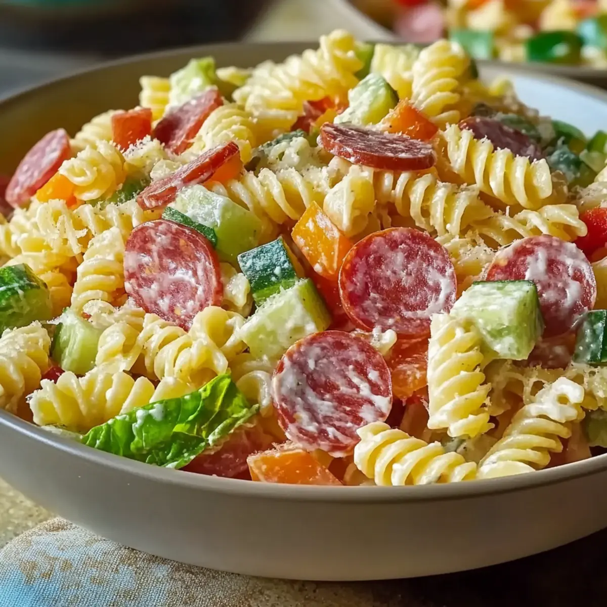 Jump to Recipe Print RecipeAs the sun sets on a warm afternoon, the scent of summer and laughter fills the air, ushering in the perfect moment for a delicious meal. This is where my beloved Grinder Salad comes into play, offering a colorful celebration of fresh ingredients and bold flavors without keeping you tied to the kitchen. This quick recipe transforms simple pasta into a vibrant dish, ideal for picnics or those busy weeknights when you crave something satisfying yet easy to prepare. Not only is it a crowd-pleaser, but you can customize it to your taste, whether you’re sticking to classic meats or opting for a lighter twist. So, are you ready to dive into the delightful world of the Grinder Salad? Why Choose the Grinder Salad? Simplicity at Its Best: The Grinder Salad is a quick and straightforward dish, perfect for those hectic evenings or last-minute picnics. Bursting with Flavor: This salad combines al dente pasta with crunchy veggies and savory meats, creating a delicious meal that pleases everyone’s taste buds. Versatile Ingredients: Customization is key! Swap out meats or use gluten-free pasta to cater to your dietary needs. Crowd Appeal: Whether served at a family gathering or a neighborhood potluck, this salad is always a hit, leaving your guests asking for more! Easy Prep Ahead: Make it ahead of time and chill; this dish allows flavors to meld beautifully and is ready whenever you are. If you’re looking for other refreshing options, check out our Strawberry Spinach Salad or a zesty Watermelon Berry Salad to complement your meal! Grinder Salad Ingredients • Create a delightful dish with these essential ingredients! For the Pasta Base Pasta (8 oz) – The foundation of your salad, choose any pasta shape you love. (Substitution: Use whole wheat or gluten-free pasta to keep it light and inclusive for all diners.) For Freshness Diced Vegetables (1 cup) – Adds crunch and color; bell peppers and cucumbers work wonders. (Substitution: Feel free to swap with any favorite vegetable mix for variety.) For the Meaty Kick Salami (1 cup, diced) – Infuses rich flavor, making every bite hearty. Pepperoni (1 cup, sliced) – Elevates the savory taste; perfect for fans of bold flavors. (Substitution: Opt for turkey or chicken for a lighter option.) For Creamy Harmony Creamy Italian Dressing (1 cup) – Brings it all together with a luscious, creamy finish. (Substitution: A vinaigrette can lighten it up if preferred.) For Seasoning Salt and Pepper – Essential for balancing all flavors; season to taste. Dive into this flavorful Grinder Salad, and let every bite be a celebration of freshness and ease! Step‑by‑Step Instructions for Grinder Salad Step 1: Cook the Pasta Begin by bringing a large pot of salted water to a rolling boil over high heat. Add 8 ounces of your favorite pasta and cook according to the package instructions until al dente, usually about 8-10 minutes. Once the pasta is cooked, drain it in a colander and rinse with cold water to stop the cooking process and cool it down. Step 2: Prepare the Vegetables While the pasta is cooling, take 1 cup of diced vegetables, such as bell peppers and cucumbers, and place them in a large mixing bowl. Ensure the vegetables are freshly chopped and vibrant in color to create an appealing presentation. The crunchiness of these fresh ingredients will enhance the texture of your Grinder Salad. Step 3: Add the Meats Once your pasta has cooled, add 1 cup of diced salami and 1 cup of sliced pepperoni to the bowl with the vegetables. Mix the ingredients gently with a spatula to combine them, allowing the savory meats to infuse their flavor throughout the salad. This step gives your Grinder Salad its hearty character. Step 4: Incorporate the Dressing Pour 1 cup of creamy Italian dressing over the combined pasta, vegetables, and meats. Use a large spoon to fold the dressing in evenly, ensuring that every bite is coated with a beautiful creamy layer. This will meld all the flavors of the Grinder Salad together harmoniously. Step 5: Season to Taste Sprinkle in salt and pepper to taste, adjusting as you mix to achieve the perfect balance of flavors in your Grinder Salad. Always taste your salad after seasoning to ensure that the seasoning enhances, rather than overpowers, the fresh ingredients. Step 6: Chill the Salad Cover the bowl with a lid or plastic wrap, and place it in the refrigerator for at least 30 minutes. This chilling time allows the flavors of your Grinder Salad to meld together beautifully, creating a delicious and refreshing dish ready to impress when served. Step 7: Serve and Enjoy After chilling, give the salad a gentle stir to reincorporate any settled ingredients. Serve your delicious Grinder Salad in bowls, either alone or alongside crusty bread for a perfect picnic meal. The vibrant colors and delightful textures will make every bite a celebration of flavor! Make Ahead Options Planning ahead with this Grinder Salad saves precious time on busy weeknights! You can prepare the pasta and chop vegetables up to 24 hours in advance. Simply cook 8 oz of pasta, cool it, and store it in an airtight container in the refrigerator. Likewise, dice 1 cup of your chosen vegetables and keep them separate in another airtight container to maintain their crispness. On the day you’re ready to serve, combine the prepped ingredients with 1 cup of salami, 1 cup of pepperoni, and creamy Italian dressing. Toss everything together and chill for at least 30 minutes to allow flavors to meld. This way, your Grinder Salad remains just as delicious and fresh, ready for any gathering! Expert Tips for Grinder Salad Chill for Flavor: Always allow the Grinder Salad to chill for at least 30 minutes; this enhances flavor integration and makes every bite delicious. Use Fresh Veggies: Opt for fresh and seasonal vegetables; they’ll add a crunch and vibrancy that elevates your Grinder Salad to another level. Adjust Your Dressing: If looking for a lighter o