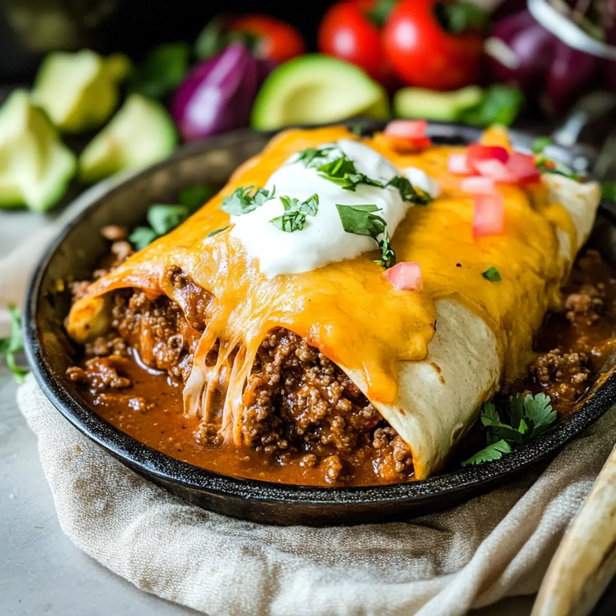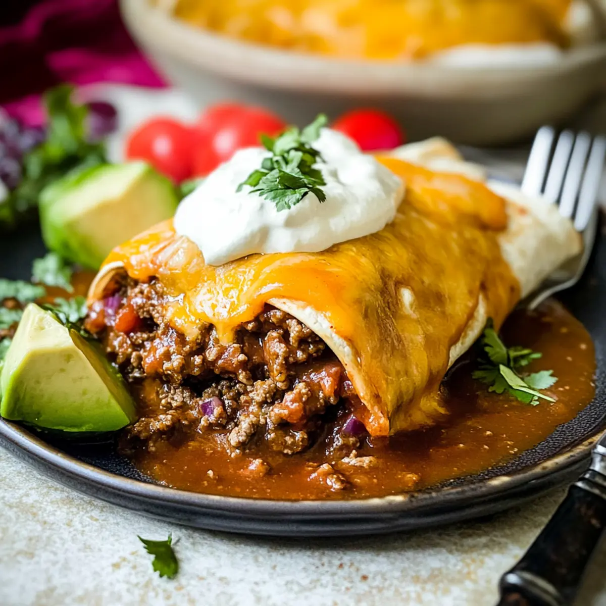 Jump to Recipe Print RecipeThe aroma of seasoned ground beef sizzling in the skillet can instantly transport you to a cozy Mexican kitchen. As I wrap each tortilla around the savory filling, I’m reminded of those weeknight dinners we share, laughter echoing around the table. These ultimate smothered ground beef burritos are a delicious answer to any busy evening, bringing comfort food to new heights with their rich enchilada sauce and gooey melted cheese. Packed with high protein, they’re not just satisfying but also a guaranteed crowd-pleaser. Who wouldn’t want to dive into a dish that combines convenience with robust flavors? Let’s uncover how to make these irresistible burritos your new family favorite—are you ready to elevate your weeknight meals? Why choose Ground Beef Burritos? Simplicity: This recipe is quick and straightforward, perfect for busy weeknights—just gather your ingredients and wrap! Bold Flavors: With a mouthwatering blend of spices and a rich enchilada sauce, these burritos are bursting with taste that pleases everyone at the table. High Protein: Each burrito is packed with 80g of protein, making it a hearty choice for those seeking nutritious meals. Versatility: Customize the filling with beans or veggies for extra nutrients, or swap the beef for turkey or plant-based options. Crowd-Pleasing: Ideal for family dinners or gatherings, these burritos bring smiles with every cheesy, savory bite. Pair with Beef Stroganoff Cozy for another comforting meal idea! Ground Beef Burrito Ingredients To create your ultimate Ground Beef Burritos, gather these essential ingredients: For the Filling • Ground Beef – The heart of the burrito, providing rich flavor and satisfying texture. Substitute with turkey or chicken for a leaner dish. • Taco Seasoning – Packs in the flavor; consider homemade for a personalized touch. • Better than Beef Bouillon – Enhances the beefy taste; swap in vegetable bouillon for a vegetarian option. • Dr Pepper – Adds a unique sweetness that deepens the flavor; root beer can be an excellent substitute. • Water – Works in tandem with Dr Pepper to keep the filling moist. For the Sauce • Butter – Creates a creamy base for the sauce; olive oil can be a healthier alternative. • Flour – Acts as a thickening agent for your sauce; use gluten-free flour for a specialized diet. • Beef Stock – Infuses rich flavor; substitute with vegetable stock to keep it vegetarian. • Red Enchilada Sauce – Essential for that signature burrito taste; homemade can enhance freshness. • Chili Powder – Adds heat and depth; adjust the amount based on your spice preference. For Assembly • Tortillas (large burrito size) – The perfect vessel for your filling; whole wheat or corn tortillas can add variety. • Mexican Cheese Blend – Melts beautifully over the burritos; feel free to swap in cheddar or Monterey Jack for different flavors. Step‑by‑Step Instructions for Ultimate Smothered Ground Beef Burritos with Enchilada Sauce Step 1: Preheat the Oven Begin by preheating your oven to 350°F (175°C). This ensures a perfect baking environment for the flavor-packed burritos. While the oven heats, gather all your ingredients, as you’ll want to work quickly to keep everything fresh and flavorful. Step 2: Brown the Ground Beef In a large skillet over medium heat, add your ground beef and cook for about 5-7 minutes, breaking it up with a spoon until it’s browned and no pink remains. Drain any excess fat to keep your burrito filling rich, not greasy. The meat should be nicely caramelized for maximum flavor. Step 3: Add Seasonings Once the ground beef is browned, sprinkle in the taco seasoning and Better than Beef Bouillon. Stir to combine, allowing the seasonings to coat the meat evenly. Cook for an additional 2 minutes, until fragrant. This step infuses your filling with vibrant flavors that define the ultimate ground beef burritos. Step 4: Introduce Dr Pepper Pour in the Dr Pepper and water, stirring well to combine. Bring the mixture to a gentle simmer, reducing the heat to low. Let it cook for about 5-10 minutes until the liquid reduces and thickens slightly, concentrating those delicious flavors into the beef. Step 5: Make the Sauce In a separate saucepan, melt the butter over medium heat. Once melted, whisk in the flour and cook for 1-2 minutes until it’s golden. Gradually add the beef stock and red enchilada sauce, stirring constantly to prevent lumps. Sprinkle in the chili powder and simmer for 5-7 minutes until the sauce thickens. Step 6: Assemble the Burritos Lay out the large tortillas on a clean surface. Spoon a generous portion of the beef mixture along the center of each tortilla, followed by a sprinkle of Mexican cheese blend. Roll the tortillas tightly, securing the filling, and place them seam-side down in a greased baking dish, ready for their delicious sauce. Step 7: Pour the Sauce Once the burritos are arranged in the dish, pour the luscious enchilada sauce over the top, ensuring each burrito is covered. For the crowning touch, add a bit more cheese on top to achieve that gooey, melt-in-your-mouth texture. It’s the final flourish that adds comfort to the ultimate ground beef burritos! Step 8: Bake Until Done Transfer the baking dish to the preheated oven and bake for 10-12 minutes, or until the burritos are bubbling and the cheese is melted and slightly golden. The scent wafting from your oven will make it hard to wait! Once done, remove them from the oven and let them cool slightly before serving. What to Serve with Ultimate Smothered Ground Beef Burritos? Imagine a table bursting with delightful sides and vibrant flavors that elevate your burrito experience to another level! Refried Beans: Creamy and hearty, they complement the savory filling of the burritos perfectly. Their texture balances the gooiness of melted cheese beautifully. Spanish Rice: Fluffy rice cooked with tomatoes and spices adds a subtle flavo
