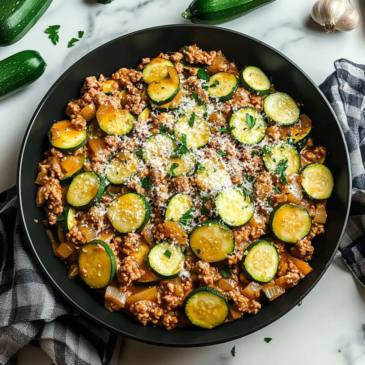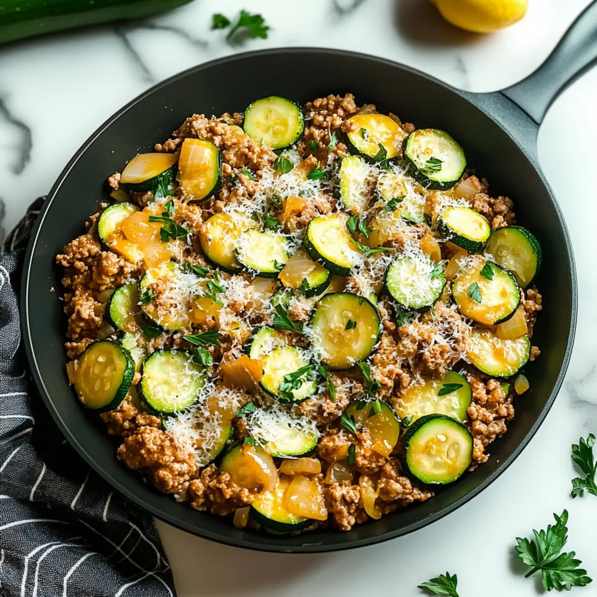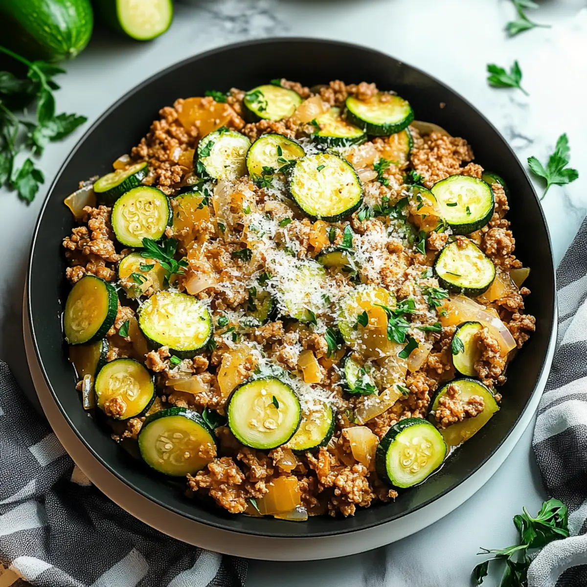 Jump to Recipe Print Recipe“Is it possible to whip up a delicious homemade dinner in under 30 minutes?” Absolutely! My Ground Turkey and Zucchini Skillet proves just that. This one-pan meal marries tender, lean turkey with the naturally sweet flavors of sautéed zucchini, creating a satisfying dish that’s both healthy and quick to prepare. Perfect for those busy weeknights, this recipe keeps meal prep simple without sacrificing flavor. What I love most is that it’s not only a low-carb option, but it also encourages creativity with seasoning adjustments to suit your taste. So, are you ready to transform your evenings with this delightful skillet concoction? Let’s dive into making a meal that will have everyone craving seconds! Why Choose This Ground Turkey Skillet? Easy Preparation: With just one pan required, cleanup is a breeze! Nutritious Ingredients: Packed with lean protein and fresh veggies, this dish promotes a balanced diet without sacrificing taste. Quick Cooking Time: Ready in under 30 minutes, it’s an ideal choice for those busy evenings when time is limited. Flavor Boosting Options: Use spices like smoked paprika or taco seasoning for a unique twist! Versatility: Pair it with fluffy rice, a tortilla, or even serve on a bed of quinoa for a complete meal. You’ll discover endless variations that keep your meals exciting! Ground Turkey and Zucchini Skillet Ingredients • Dive into the flavors with these must-have ingredients for your quick one-pan meal! For the Skillet Ground Turkey – Lean protein that delivers a tender, slightly sweet base; substitute with ground chicken, beef, or pork as preferred. Zucchini – The main vegetable that absorbs flavors beautifully; for best results, pick medium-sized zucchinis. Olive Oil – Essential for sautéing, bringing richness and helping to brown the turkey. Onion – Adds a savory sweetness through caramelization; finely chop before cooking for maximum impact. Garlic – Introduces aromatic depth; remember to mince for the best distribution of flavor. For Seasoning Dried Oregano – Offers an earthy backdrop that enhances the dish. Salt – Elevates all flavors in the skillet; adjust to your taste preference. Black Pepper – Provides a touch of warmth; keep it to your liking. Crushed Red Pepper Flakes – Optional for those who enjoy a little heat; adjust according to your personal spice tolerance. For Extra Flavor Chicken Broth – Adds moisture while infusing flavor; swap for vegetable broth or water with bouillon if desired. Grated Parmesan Cheese – The finishing touch that contributes nutty richness and creaminess to this Ground Turkey and Zucchini Skillet. With these wholesome ingredients, you’ll create a comforting dish that’s both satisfying and healthy—perfect for any busy evening! Step‑by‑Step Instructions for Ground Turkey and Zucchini Skillet Step 1: Heat the Oil Begin by pouring 1 tablespoon of olive oil into a large skillet and place it over medium heat. Allow the oil to warm for about 1-2 minutes, watching as it shimmers slightly, signaling that it’s ready for the next step. This initial heat is essential for achieving a good sear on the turkey. Step 2: Sauté the Onion Finely chop one onion and add it to the hot oil in the skillet. Sauté for about 3-4 minutes, stirring occasionally, until the onion becomes soft and translucent. The fragrant aroma will fill your kitchen, setting the stage for the delicious Ground Turkey and Zucchini Skillet ahead. Step 3: Add Garlic Mince 2 cloves of garlic and toss them into the skillet along with the sautéed onion. Cook for an additional 30 seconds, stirring continuously to prevent burning. The garlic will become fragrant, adding a wonderful depth of flavor to the dish. Step 4: Cook the Turkey Crumble 1 pound of ground turkey into the skillet with the onion and garlic. Use a spatula to break it up as it cooks for about 6-8 minutes. Stir occasionally until the turkey is browned throughout and no longer pink, indicating it’s perfectly cooked and ready to absorb the flavors of the veggies. Step 5: Prepare the Zucchini While the turkey is cooking, slice 2 medium zucchinis into half-moon shapes. After the turkey is nicely browned, add the zucchini to the skillet. Stir everything together, allowing it to cook for another 4-5 minutes until the zucchini starts to soften but retains a slight crunch, ensuring a great texture in the Ground Turkey and Zucchini Skillet. Step 6: Season the Mixture Sprinkle dried oregano, salt, black pepper, and optionally crushed red pepper flakes over the turkey and zucchini mixture. Stir well to combine, letting the seasonings meld with the ingredients for about 1 minute. This step enhances the savory profile and adds a touch of warmth to the dish. Step 7: Add Chicken Broth Pour in ½ cup of chicken broth, stirring gently to combine. Reduce the heat to low and let the mixture simmer for 3-4 minutes. This will allow the zucchini to finish cooking while soaking up the flavorful broth, rounding out the deliciousness of your Ground Turkey and Zucchini Skillet. Step 8: Melt the Cheese Once the zucchini is tender, remove the skillet from heat and sprinkle ¼ cup of grated Parmesan cheese over the top. Stir until the cheese melts and becomes creamy, enriching the dish’s flavor and tying all the ingredients together beautifully. Step 9: Taste and Serve Finally, taste your Ground Turkey and Zucchini Skillet, adjusting the seasoning if necessary. Serve immediately for a quick and healthy meal, allowing the vibrant colors and mouthwatering aroma to entice your family to the table! Ground Turkey and Zucchini Skillet Variations Feel free to mix and match these ideas to elevate your cooking experience and create a dish uniquely yours! Veggie Boost: Add chopped bell peppers or spinach for vibrant colors and extra nutrition. It’s a wonderful way to incorporate more greens into your meal! Whole Grain Twist: Replace half of the turkey with quinoa