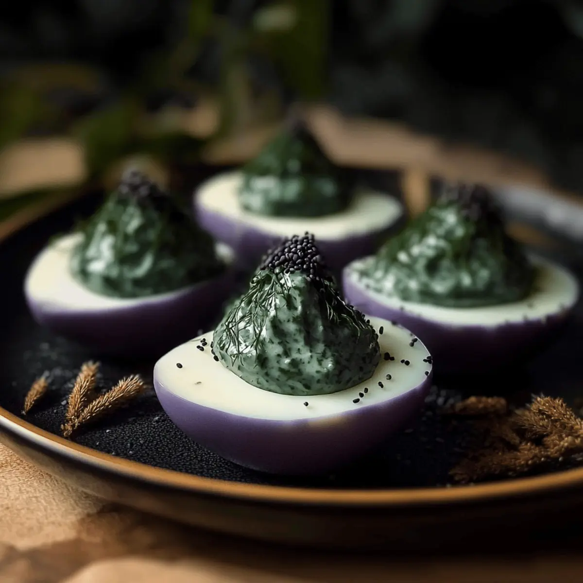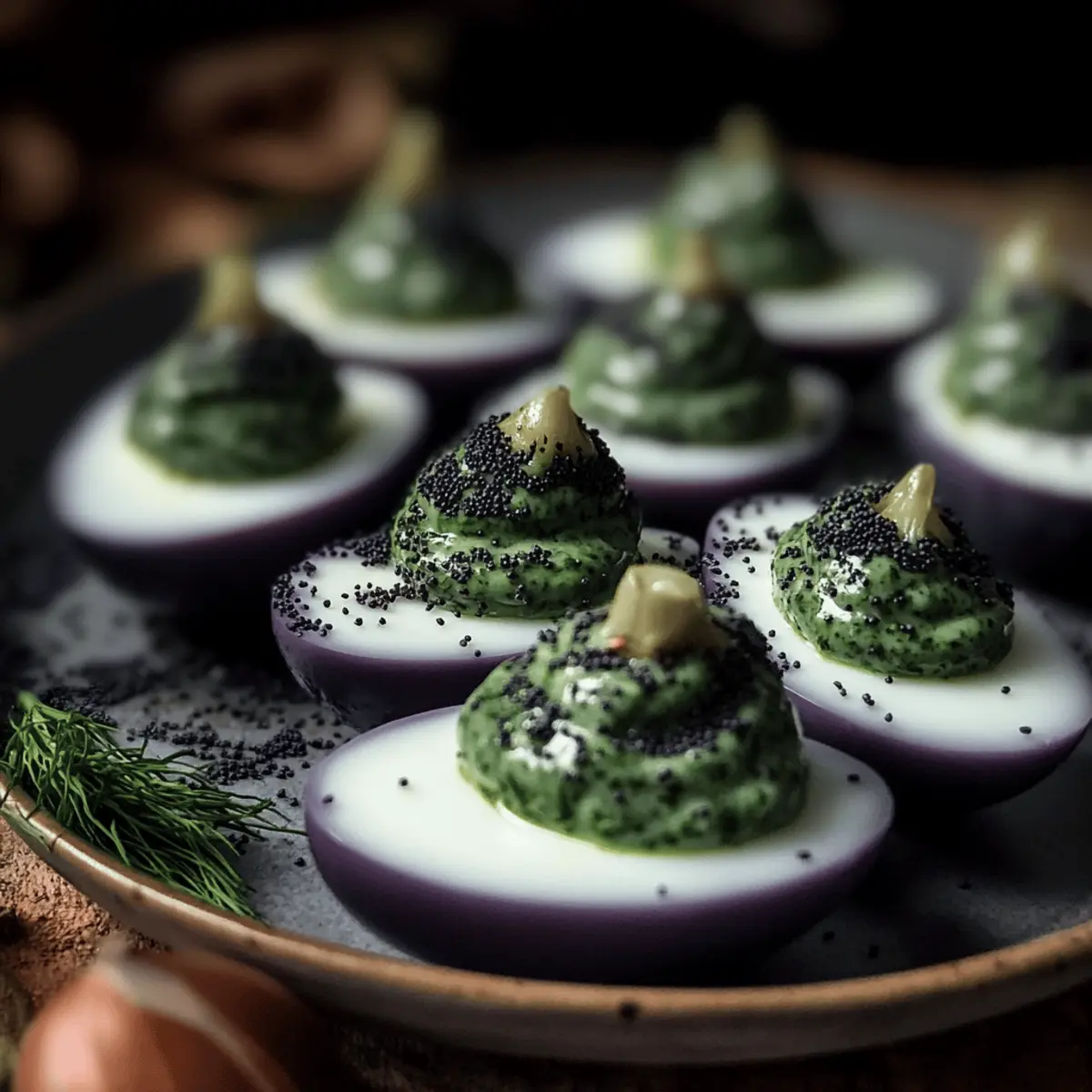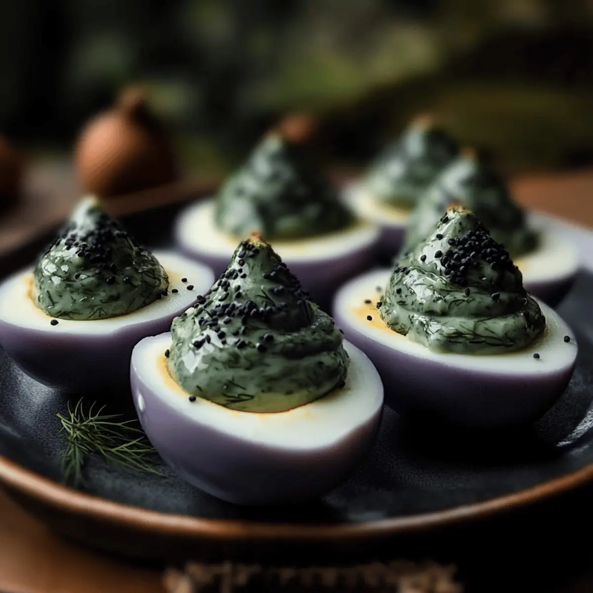 Jump to Recipe Print RecipeAs I stared at the eerie Halloween decorations scattered across my kitchen, I was struck by an idea that would transform our festive gathering. Enter the Spooky Halloween Deviled Eggs, also known as Swamp Eggs—a playful twist on a classic favorite! These uniquely crafted eggs not only offer a creamy filling infused with garlic and dill but are also naturally dyed to create an awe-inspiring visual feast. The best part? You can create a variety of themed versions, from spider eggs to monster eggs, keeping your guests both intrigued and delighted. Plus, this vegetarian treat is a healthier alternative to artificial colorings while being quick to prepare—perfect for those of us who love to impress without spending all day cooking. Curious how to make this unsettling yet delicious dish? Let’s dive right in! Why are Halloween Deviled Eggs a must-try? Visual Appeal: These Halloween Deviled Eggs are a showstopper that will have everyone talking. The vibrant, naturally dyed colors evoke a sense of spooky fun, perfect for your holiday gathering. Quick Preparation: With just a few simple steps, you can whip up these crowd-pleasers in no time, making them an ideal choice for impromptu parties or last-minute invitations. Healthy Twist: Say goodbye to artificial dyes! This recipe embraces vibrant colors from natural ingredients like blueberries, keeping your snacks both festive and wholesome. Endless Variations: Let your creativity shine by transforming these eggs into spider or monster motifs, ensuring that there’s something for everyone to enjoy. Creamy Delight: The rich filling of garlic and dill offers a deliciously unexpected flavor that pairs perfectly with the swampy aesthetic. Your guests won’t believe how tasty these bizarre beauties can be! Halloween Deviled Eggs Ingredients For the Eggs • Large Eggs – The base of this spooky dish, necessary for structure and protein. For the Dye • Frozen Blueberries – A natural dye source that infuses a vibrant purple hue; just thaw and mash for the perfect color! • Hot Water – Vital for extracting the dye; ensure it’s boiling to maximize color brilliance. • Distilled White Vinegar – Enhances flavor and aids in the dyeing process; can be swapped with apple cider vinegar if preferred. For the Filling • Egg Yolks – Creamy and rich, these form the base of your filling; always save from hard-boiled eggs. • Mayonnaise – Adds luscious creaminess; Greek yogurt serves as a healthier alternative. • Liquid Chlorophyll – An optional ingredient that lends a swampy green color to your filling. • Salt & Black Pepper – Essential seasonings; adjust to taste, and consider adding garlic powder for extra depth. • Fresh Dill & Chives – Fresh herbs that elevate flavor and color; substitute with parsley or green onions if you like! • Garlic – Adds a pungent kick to the filling; garlic powder is a fine substitute in a pinch. For the Garnish • Poppy Seeds – These little seeds not only add an enticing crunch but also make for a creepy finish; omit if allergies arise. Transform your gathering with these delightfully eerie Halloween Deviled Eggs, perfect for igniting curious conversations among your guests! Step‑by‑Step Instructions for Naturally Dyed Spooky Halloween Deviled Eggs Step 1: Prepare the Eggs Start by hard boiling the large eggs; place them in a pot, cover with water, and bring to a boil over high heat. Once boiling, reduce the heat to medium and let simmer for 9-12 minutes. After cooking, transfer the eggs to an ice bath for 5-10 minutes to cool completely, making them easier to peel. Step 2: Dye the Eggshells Gently crack the cooled egg shells by tapping them lightly on a hard surface. In a bowl, combine boiling hot water, thawed and mashed frozen blueberries, and a splash of distilled white vinegar. Submerge the cracked eggs in this mixture, allowing them to soak for at least 2 hours or up to overnight for a more vivid, swampy color. Step 3: Make the Filling Once your dyed eggs are ready and the color has set, peel the shells carefully. Slice the eggs in half lengthwise and scoop out the yolks into a mixing bowl. Add mayonnaise, liquid chlorophyll, salt, black pepper, dill, chives, and crushed garlic to the yolks. Mash until creamy and well combined; this filling is what brings the Halloween deviled eggs to life! Step 4: Fill the Egg Whites With your creamy filling prepared, carefully spoon or pipe the mixture back into the halves of the dyed egg whites. By using a piping bag or a plastic bag with the corner snipped off, you can create a more artistic look, enhancing the spooky presentation of your Halloween deviled eggs. Step 5: Garnish for Spookiness To add the final touch, sprinkle poppy seeds over the topped fillings for a textural contrast and a creepy effect. This will enhance the swampy vibe of your naturally dyed spooky Halloween deviled eggs while also providing a delightful crunch with each bite. Step 6: Serve and Impress Chill your Halloween deviled eggs in the refrigerator for at least 20 minutes to ensure they’re refreshing when served. For the best experience, enjoy them within 2 hours if left out at room temperature. Present on a spooky-themed platter to wow your guests and ignite conversations! Storage Tips for Halloween Deviled Eggs Fridge: Store your leftover Halloween deviled eggs in an airtight container in the refrigerator for up to 4 days. This keeps them fresh and flavorful! Room Temperature: If serving at a gathering, limit the time they sit out at room temperature to no more than 2 hours to ensure food safety. Freezer: It is not recommended to freeze Halloween deviled eggs, as the texture of the egg filling may change upon thawing, making them less enjoyable. Make-Ahead Advice: Prepare the filling in advance and fill the eggs just a few hours before your event for the best quality and presentation. What to Serve with Naturally Dyed Spooky Halloween Deviled
