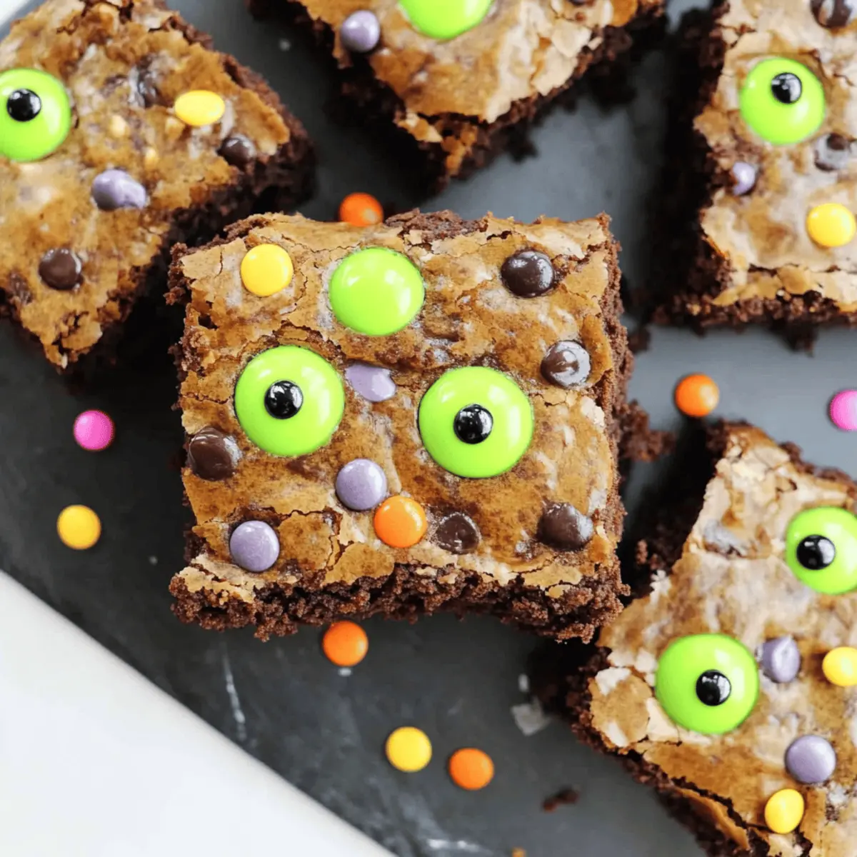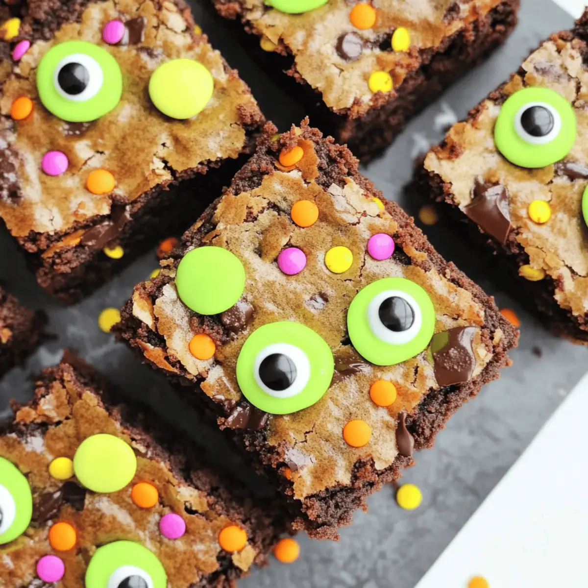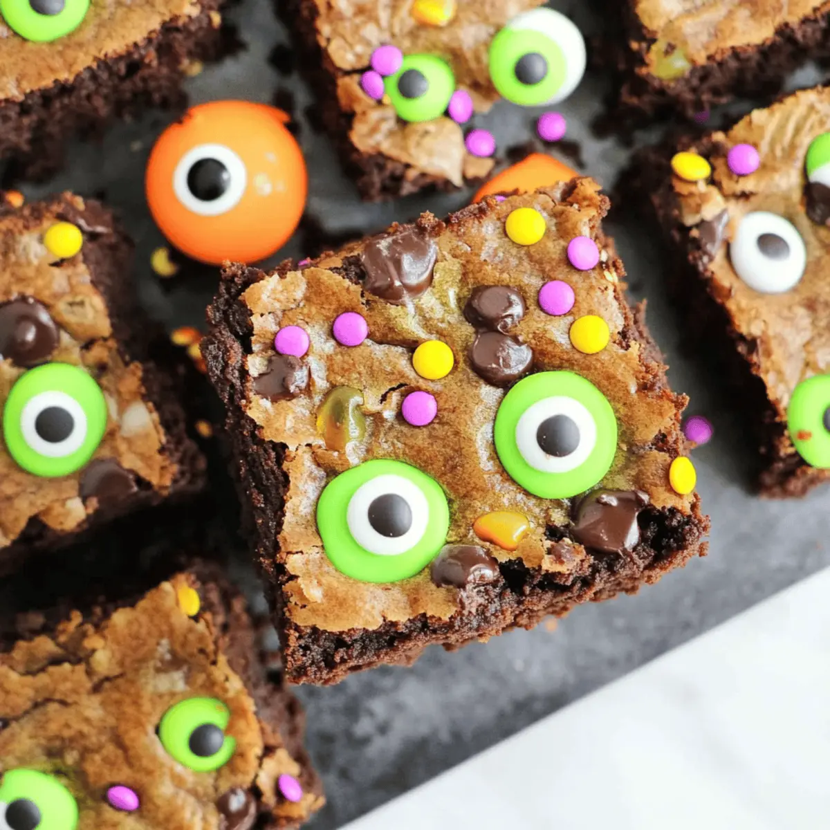 Jump to Recipe Print RecipeAs I gathered ingredients for a recent Halloween party, a delightful thought struck me: why not create something that combines the richness of brownies with a playful twist? Enter the Halloween Monster Brownies! These easy-to-make, festive treats feature a fudgy brownie base paired with a chewy cookie layer, bringing both satisfaction and charm to the dessert table. Whether you opt for a homemade brownie mix or grab a box from the store, these brownies stay true to the Halloween spirit and are sure to impress friends and family alike. Plus, with their fun decorations, they double as eye-catching party favors. Curious to see how these frightfully delicious brownies come together? Let’s dive in! Why are Halloween Monster Brownies a must-try? Irresistible Appeal: These brownies are not only a treat for the taste buds but also a feast for the eyes, thanks to their whimsical decorations! Easy to Make: Whether you’re whipping up homemade brownie batter or using a box mix, this recipe is straightforward, saving you time in the kitchen. Fudgy Goodness: With a velvety brownie base and a chewy cookie layer, you’ll enjoy the perfect balance of textures in every bite. Party Showstopper: Need a crowd-pleaser? These Halloween Monster Brownies are sure to grab attention and get everyone in the festive spirit, just like our High Protein Monster treats. Versatile Options: Customize with different sprinkles or nut alternatives to cater to various dietary needs and preferences, making them perfect for any gathering. A Perfect Match: Pair with milk or ice cream for delightful contrast, making your Halloween dessert table even more decadent! Halloween Monster Brownie Ingredients • Get ready to whip up a batch of fun with these Halloween Monster Brownies! For the Brownies Brownie Mix (2 boxes – 18.3 oz each) – This forms the fudgy base; opt for homemade brownie batter for even richer flavor. Unsalted Butter (8 tablespoons total) – Adds moisture and richness; margarine works as a dairy-free substitute. Eggs (2 large) – Essential for structure and moisture; consider flax eggs for a vegan alternative. Light Brown Sugar (½ cup) & Granulated Sugar (4 tablespoons) – Sweeteners that enhance the caramel notes; coconut sugar can be a healthier swap. Pure Vanilla Extract (3 teaspoons total) – Elevates flavor depth; try vanilla bean paste for an extra kick. For the Cookie Layer Creamy Peanut Butter (½ cup) – Introduces rich, nutty goodness; almond butter makes a nut-free option. All-Purpose Flour (½ cup) – Provides structure; gluten-free flour works if needed. Baking Soda (½ teaspoon) & Kosher Salt (½ teaspoon) – Helps with leavening; keep these quantities for the best results. Quick Cooking Oats (½ cup) – Adds delightful texture; old-fashioned oats offer a chewier bite. Miniature Chocolate Chips (½ cup) – Perfect for melty chocolate surprises; use any chocolate chips on hand. For the Frosting Confectioners Sugar (2 cups) – Sweetens the frosting; powdered erythritol can substitute for fewer calories. Heavy Whipping Cream (2 tablespoons) – Ensures the frosting is silky smooth; coconut cream is great for a non-dairy version. Neon Green Gel Food Coloring – For that vibrant, spooky frosting color that screams Halloween! For Decoration Halloween Sprinkles (1 cup) – Fun and festive; any colorful sprinkles will do. Candy Eye Decorations (1 package) – Adds to the spooky theme, making your brownies even more fun! These ingredients come together beautifully to create tantalizing Halloween Monster Brownies that are sure to become a favorite at your gatherings. Happy baking! Step‑by‑Step Instructions for Halloween Monster Brownies Step 1: Oven Preparation Preheat your oven to 350°F (177°C) and prepare your 9″ x 13″ baking pan by spraying it with nonstick spray. For added security, line the bottom and sides with parchment paper, allowing some overhang for easy removal later. This ensures your Halloween Monster Brownies come out perfectly without sticking to the pan. Step 2: Brownie Batter In a large mixing bowl, follow the package instructions to prepare the brownie mix, combining ingredients until smooth. Once fully blended, pour the brownie batter into the prepared pan, spreading it evenly across the bottom. Set it aside while you prepare the delightful cookie layer that will top your fudgy brownie base. Step 3: Cookie Layer Preparation Using a stand mixer, cream together the creamy peanut butter and softened unsalted butter until fluffy, about 2-3 minutes. Then, add in the light brown sugar, granulated sugar, eggs, and vanilla extract; mix until well combined and creamy. This rich, peanut buttery mixture will enhance your Halloween Monster Brownies with fantastic flavor. Step 4: Dry Ingredients In a separate bowl, whisk together the all-purpose flour, baking soda, kosher salt, quick cooking oats, and miniature chocolate chips. Gradually add this dry mixture to the peanut butter mixture in the stand mixer, stirring until just combined. Be careful not to overmix, as you want to keep that chewy texture for your cookie layer. Step 5: Assemble Spoon dollops of the cookie mixture over the top of the brownie batter; there’s no need to spread it perfectly, as a rustic look adds to the charm of your Halloween Monster Brownies. Sprinkle generously with Halloween-themed sprinkles and candy eye decorations, giving your brownies that spooky touch that makes them perfect for the festive season. Step 6: Baking Place your assembled Halloween Monster Brownies in the preheated oven and bake for 25-30 minutes. You’ll know they’re ready when the edges start to pull away from the pan and a toothpick inserted into the center comes out with a few moist crumbs. Keep an eye on them to avoid overbaking! Step 7: Cooling Once baked to perfection, remove the brownies from the oven and allow them to cool in the pan for approximately 30 minutes. This cooling period helps 