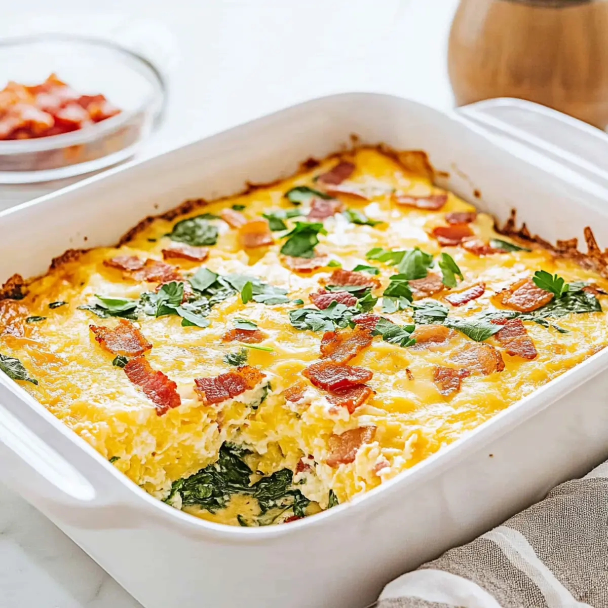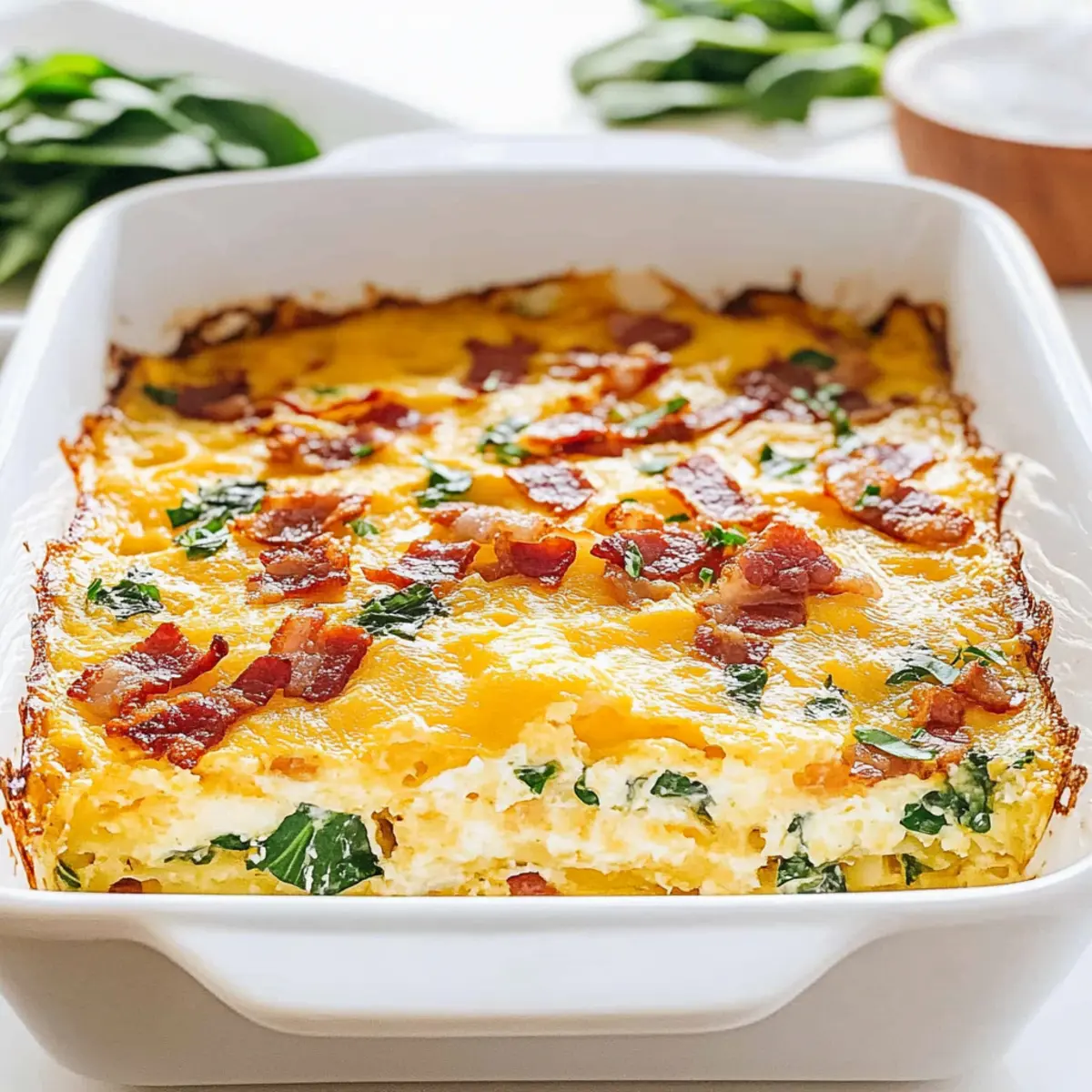 Jump to Recipe Print RecipeAs I stood at the kitchen counter, a sense of excitement bubbled up at the thought of the perfect breakfast—a dish that would warm hearts and start our day off right. Enter the Hashbrown Breakfast Casserole, brimming with crispy hash browns, rich eggs, and savory bacon, beautifully complemented by vibrant spinach. This comforting casserole is not only a crowd-pleaser, but it also makes meal prep a breeze, allowing for lazy mornings or busy brunch gatherings. Plus, it’s incredibly freezer-friendly—so you can whip it up in advance and simply reheat when that craving strikes. Are you ready to dig into this delightful dish and savor each bite? Why is this casserole a breakfast game-changer? Ease of Preparation: This Hashbrown Breakfast Casserole is a breeze to make, requiring minimal cooking skills while delivering maximum flavor. Crowd-Pleasing Dish: Perfect for brunch gatherings or family breakfasts, this hearty casserole pleases both kids and adults alike. Flexible Ingredients: The recipe invites creativity, allowing you to swap in your favorite veggies or proteins such as Loaded Broccoli Casserole or Cheesy Broccoli Casserole. Make-Ahead Magic: Prepare ahead of time for those whirlwind mornings; just pop it in the oven for a warm meal ready in minutes! Freezer-Friendly: Leftovers can be easily stored or frozen, making this casserole ideal for meal prep. Enjoy the convenience without sacrificing taste! Hashbrown Breakfast Casserole Ingredients Discover the delicious components that make up this comforting dish! For the Casserole • Bacon – Adds a savory, smoky flavor and crispy texture; substitute with sausage for a different taste. • Yellow Onion – Provides sweetness and depth to the dish’s flavor. • Eggs – Acts as the primary structure, binding the casserole together. • Milk – Contributes creaminess to the egg mixture; can be replaced with a non-dairy milk alternative if desired. • Salt – Enhances the overall flavor of the dish. • Black Pepper – Adds a mild heat and flavor contrast. • Ground Nutmeg – A touch of warmth that complements the other flavors. • Baby Spinach – Infuses color and nutrients; can be replaced with other leafy greens like kale. • Hot Sauce – Optional, providing a kick for those who enjoy spice. • Hash Browns – The main base for texture; ensure they are thawed and drained to avoid excess moisture. • Swiss Cheese – Provides a creamy, nutty flavor; substitute with cheddar or Gruyere if preferred. • Chives – Optional garnish that adds freshness and color. Step‑by‑Step Instructions for Hashbrown Breakfast Casserole Step 1: Preheat the Oven Begin by preheating your oven to 350°F (175°C) while you prepare the baking dish. Grease a 9×13-inch baking dish with cooking spray or butter to ensure the casserole releases easily once baked. This step is essential for achieving that crispy, golden top on your Hashbrown Breakfast Casserole. Step 2: Cook the Bacon and Onions In a large skillet over medium heat, cook diced bacon for about 5 minutes until it starts to get crispy. Add in the diced yellow onions and continue sautéing for an additional 5 minutes, or until the onions become translucent and the bacon is golden brown. Once cooked, remove the skillet from heat and let the mixture cool slightly. Step 3: Whisk the Egg Mixture In a large mixing bowl, whisk together the eggs, milk, salt, black pepper, ground nutmeg, and optional hot sauce until well combined. This creamy egg mixture forms the base of your Hashbrown Breakfast Casserole, binding all the ingredients together and adding flavor. Step 4: Combine Ingredients Gently fold the thawed and drained hash browns into the egg mixture, ensuring they are evenly coated. Then, add the cooked bacon and onions along with the baby spinach and Swiss cheese. Stir the mixture carefully until all elements are well incorporated, creating a flavorful filling for your casserole. Step 5: Bake the Casserole Transfer the combined mixture into your greased baking dish, spreading it out evenly. Place the dish in the preheated oven and bake for 40-45 minutes, or until the center is set and no longer jiggly. Look for a golden-brown crust on top to ensure that your Hashbrown Breakfast Casserole is perfectly cooked. Step 6: Let It Rest and Serve Once baked, remove the casserole from the oven and allow it to rest for about 5-10 minutes. This resting period helps the casserole firm up, making it easier to slice. Garnish with fresh chopped chives before serving to add a pop of color and flavor, then enjoy this comforting dish warm with your favorite sides! How to Store and Freeze Hashbrown Breakfast Casserole Fridge: Store leftovers in an airtight container for up to 4 days, ensuring they remain fresh and ready for quick meal options throughout the week. Freezer: Freeze the casserole for up to 3 months. It’s best to cut it into portions before freezing for easy reheating. Reheating: For the best texture, reheat in the oven at 350°F (175°C) for about 20-25 minutes, or until warmed through. The microwave is convenient but may not yield that crispy topping! Thawing: If frozen, thaw in the refrigerator overnight before reheating to maintain flavor and consistency in your delicious hashbrown breakfast casserole. Hashbrown Breakfast Casserole Variations Feel free to unleash your inner chef and customize this dish with these tasty twists! Sausage Swap: Replace bacon with cooked sausage for a different savory flavor. It’s hearty and delicious! Veggie Boost: Add bell peppers, mushrooms, or zucchini to the mix for extra nutrients and color. They’ll lend a wonderful texture! Dairy-Free Option: Use a non-dairy milk and a vegan cheese substitute to make this casserole friendly for everyone. It maintains its creaminess without dairy! Spicy Kick: Incorporate diced jalapeños or your favorite hot sauce to crank up the heat. Spice lovers will rejoice in this fiery twist! Chee