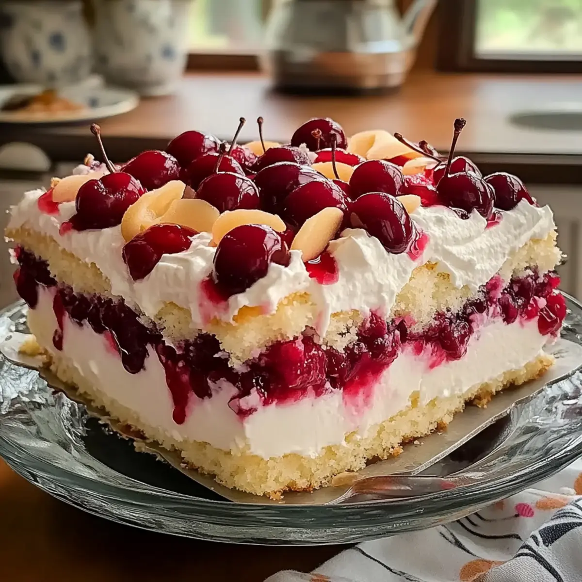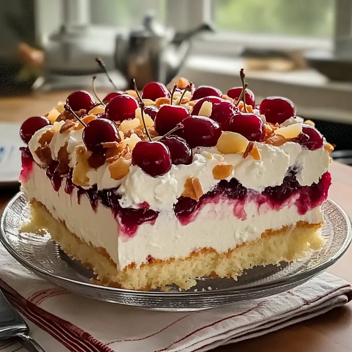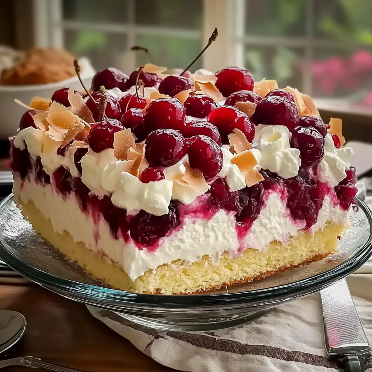 Jump to Recipe Print RecipeAs I stood in my kitchen, the soft summer sun streaming through the window, I couldn’t help but feel a sense of excitement for what I was about to create—Heaven on Earth Cake. It’s the perfect guilt-free treat for those moments when you crave something sweet yet light. This Heavenly Easy Angel Food Cake with Cherry Filling is not only a breeze to whip up, but it’s also a zero-carb delight that will impress your friends and family without the heaviness of traditional desserts. The airy layers of cake, creamy pudding, and vibrant cherry topping make this dessert a showstopper, ideal for gatherings or a cozy night in. Why compromise on flavor when you can have such indulgence without the carbs? Ready to learn how to make this luscious cake that’s sure to leave everyone begging for more? Let’s dive in! Why is this cake a must-try? Heavenly Layers: This cake features a fluffy angel food base that melts in your mouth, providing the perfect canvas for a variety of flavors. Quick and Easy: With just a few simple ingredients, you can whip this up in no time, making it ideal for those busy days when you need a sweet treat. Zero-Carb Delight: Enjoy a dessert guilt-free, as this cake fits perfectly into zero-carb and low-carb diets without sacrificing taste. Versatile Options: Feel free to switch up the cherry filling for strawberries or blueberries to cater to your preference or seasonal fruits. Want more variety? Check out our Oreo Cheesecake for another easy dessert option! Crowd-Pleasing Favorite: Serve it at gatherings or family dinners, and watch as your friends and family rave about this delightful treat—it’s a surefire hit! Heaven on Earth Cake Ingredients For the Cake • Prepared Angel Food Cake – Provides the light, airy structure of the dessert; look for quality bakery options or pre-made versions at stores. For the Pudding Layer • Instant Cheesecake Pudding Mix – Adds creaminess and a rich cheesecake flavor; choose a low-carb variety to maintain the dish’s zero-carb essence. • Cold Milk – Used to rehydrate and set the pudding mix; opt for unsweetened almond or coconut milk for a lower carb alternative. • Sour Cream (or Plain Greek Yogurt) – Enhances creaminess and tang; Greek yogurt can be a tasty lower-fat substitute. For the Topping • Cherry Pie Filling – Delivers sweetness and a burst of fruit flavor; feel free to swap it with other fillings like strawberry or blueberry for a twist. • Whipped Topping (Thawed) – Provides a light, fluffy finish; most ready-made varieties work, but ensure they are low-sugar. • Sliced Almonds (optional) – Adds a crunchy texture and nutty flavor; can be omitted or replaced with your favorite nuts for variation. Step‑by‑Step Instructions for Heaven on Earth Cake Step 1: Prepare the Pudding In a medium mixing bowl, combine the instant cheesecake pudding mix with cold milk. Whisk vigorously for about 2–3 minutes until the mixture is thickened and creamy. The pudding should have a smooth consistency with no lumps. Set it aside for a moment, allowing it to firm up slightly while you prepare the next layers of your Heaven on Earth Cake. Step 2: Add the Creaminess Next, gently fold in the sour cream or Greek yogurt into the thickened pudding. Use a spatula to ensure it blends smoothly without deflating the mixture. This step adds a delightful tanginess and creaminess to your filling. Aim for a consistent, velvety texture that will layer beautifully later. Step 3: Layer the Cake Cubes Take a 9×13-inch dish and layer half of the prepared angel food cake cubes evenly on the bottom. Ensure the cubes are slightly pressed together but not packed too tightly. This light, airy base is the hallmark of your Heaven on Earth Cake, so make sure it covers the bottom of the dish evenly to provide a solid foundation for your dessert. Step 4: Spoon on the Cherry Filling Spoon half of the cherry pie filling over the layer of angel food cake cubes. Spread it gently with the back of a spoon, allowing the tart cherries to seep into the cake. This burst of fruitiness will elevate the flavors in your cake and create a delightful contrast against the creamy pudding layer. Step 5: Add the Pudding Mixture Spoon half of the creamy pudding mixture over the cherry layer, using a spatula to spread it evenly. This layer should cover the cherries completely. The pudding should be smooth and should create a lovely contrast to the cherry filling. Repeat this step with care to maintain the beautiful layers of your Heaven on Earth Cake. Step 6: Create the Second Layer Repeat the layering process by adding the remaining angel food cake cubes, followed by the rest of the cherry filling. Use the back of a spoon to evenly distribute the filling again. This careful layering ensures that each slice of your Heaven on Earth Cake showcases the vibrant colors and textures. Step 7: Top with Whipped Topping Finally, spread the thawed whipped topping over the top layer, ensuring an even and fluffy finish. This light topping is crucial to the cake’s heavenly texture, so take your time to smooth it out gently. For added visual appeal, you can use a spatula or back of a spoon to create soft peaks. Step 8: Chill and Set Cover the assembled Heaven on Earth Cake with plastic wrap and refrigerate for at least 2 hours, allowing for flavors to meld and the cake to set. This chilling phase is essential for achieving the perfect slice and ensuring your dessert is refreshingly cool and creamy when served. Make Ahead Options These Heavenly Easy Angel Food Cakes are perfect for meal prep enthusiasts! You can prep the pudding mixture and cherry filling up to 24 hours in advance to save time on busy days. Simply whisk together the instant cheesecake pudding mix with cold milk, then fold in sour cream, and store it in an airtight container in the refrigerator. You can also layer the angel food cake cubes and cherry filling in the dish a day ahead; 