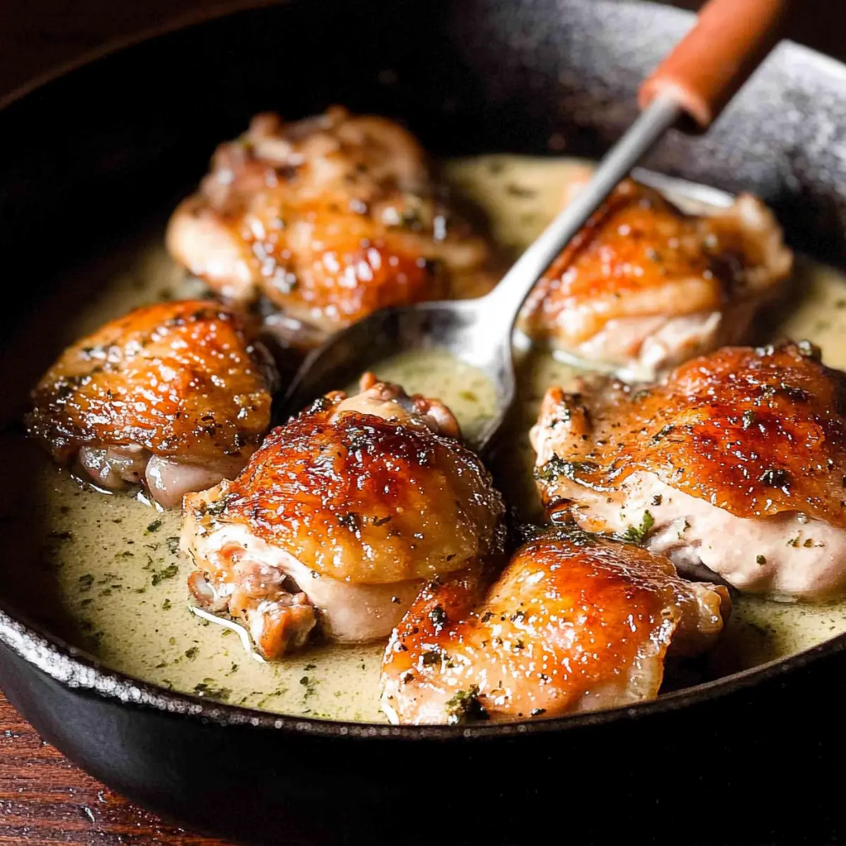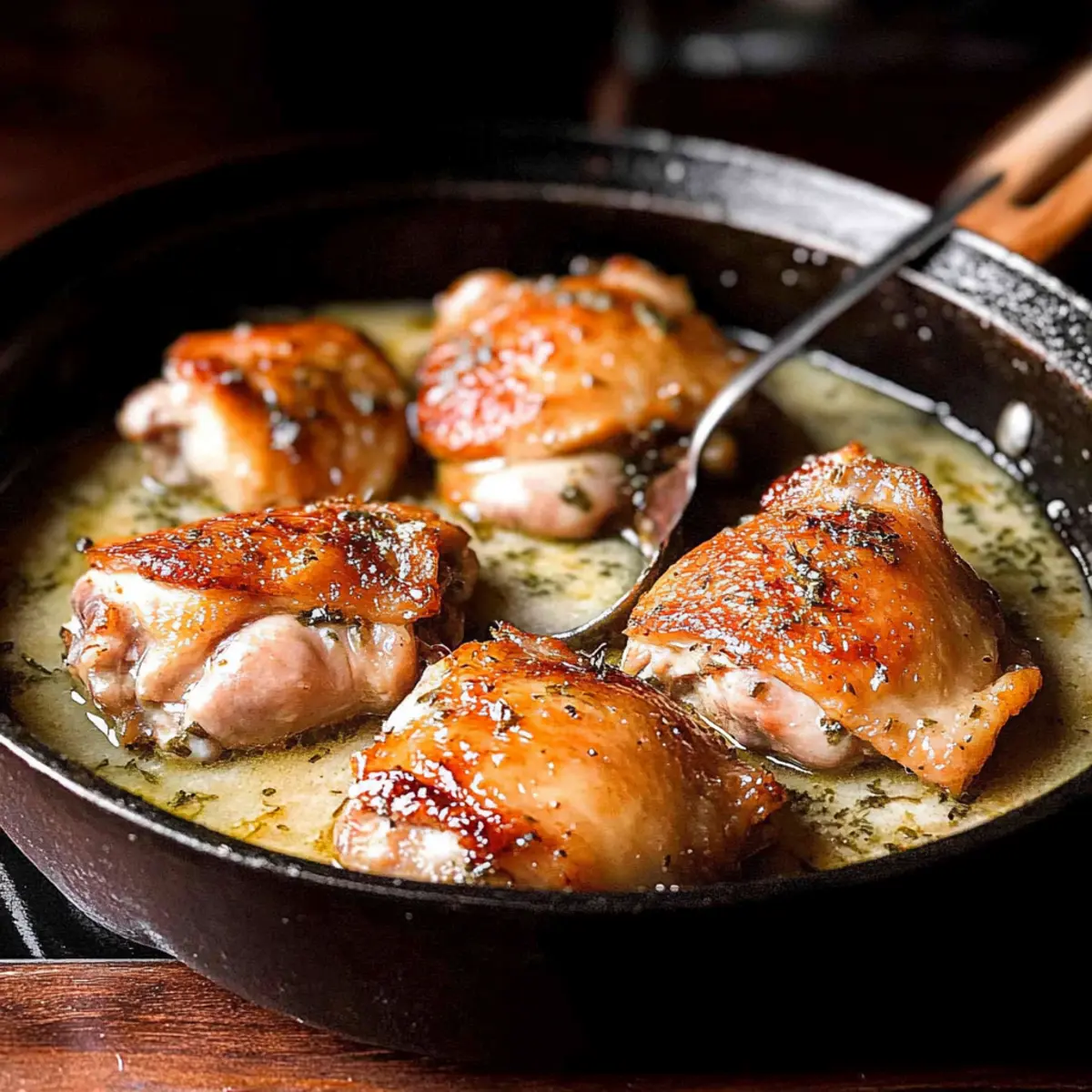 Jump to Recipe Print RecipeThe aroma wafting from the kitchen had my family gathering like moths to a flame, drawn in by the promise of something special. Today, I’m thrilled to share my recipe for Herb Roasted Chicken Thighs in Creamy White Wine Sauce, a dish that transforms any weeknight dinner into a delightful feast. This comforting delight is not just incredibly simple to prepare; it’s a one-skillet wonder that makes cleanup a breeze. With perfectly seasoned chicken enveloped in a rich, velvety sauce, it’s both indulgent and wholesome—a definite crowd-pleaser! Imagine serving this on a chilly evening, with laughter and warmth surrounding the table. Are you ready to impress your loved ones and create a memorable meal? Let’s dive in! Why is this chicken dish irresistible? Savoriness that captivates: The creamy white wine sauce elevates the succulent chicken thighs to a whole new level of flavor. One skillet magic: Say goodbye to messy kitchens! This recipe allows you to whip up a hearty meal and keep cleanup minimal. Comforting and indulgent: Perfect for cozy dinners, the rich texture and seasonings offer the ultimate comfort food experience that everyone will love. Versatile pairings: Serve it alongside your favorite side dishes, like roasted vegetables or creamy mashed potatoes to cater to all tastes. Time-efficient cooking: Ready in about an hour, this dish fits perfectly into your busy lifestyle without sacrificing quality or taste. Herb Roasted Chicken Thighs Ingredients • The perfect blend for an unforgettable dish! For the Chicken Chicken thighs (bone-in, skin-on, 3 lbs) – The main protein providing juiciness and flavor; opt for boneless thighs for a quicker prep but with a compromise on moisture. Olive oil – A cooking fat essential for browning the chicken; butter can be substituted for an extra layer of flavor. Salt and pepper – Essential seasonings; adjust to your taste preferences for the perfect seasoning boost. For the Sauce Butter (2 tablespoons) – Adds a rich flavor to the sauce; olive oil works for a lighter alternative. Onion (1 medium, diced) – This aromatic enhances depth in the dish; the smarter choice for pairing with our herb roasted chicken thighs. Garlic (3 cloves, chopped) – Fresh garlic enhances flavor significantly; stick with fresh for the best results! Italian seasoning (2 tablespoons) – A flavorful herb mix that sets the base for your sauce; Sicilian seasoning can be used for a spicy twist. Thyme (3-4 sprigs, leaves only) – Adds delightful depth to the flavor; dried thyme (1 teaspoon) can be a suitable substitute if needed. Flour (1 tablespoon) – A simple thickener to achieve that luscious sauce consistency; use cornstarch for a gluten-free option. White wine (½ cup) – The star of the sauce; opt for a dry white wine like Pinot Grigio for the best flavor—chicken broth works too if you add lemon juice for acidity. Chicken stock (1 cup) – Moisture and flavor infusion; vegetable stock can lighten the dish for a vegetarian version. Heavy cream (½ cup) – Gives the sauce its velvety richness; swap with half-and-half or omit for a lighter texture. Each ingredient intertwines beautifully to create a dish that is indeed a comforting classic. Your Herb Roasted Chicken Thighs in Creamy White Wine Sauce is just a few steps away, so gather your ingredients and let the cooking magic begin! Step‑by‑Step Instructions for Herb Roasted Chicken Thighs in Creamy White Wine Sauce Step 1: Prepare the oven and skillet Preheat your oven to 400°F (200°C) to ensure a perfect roast. Meanwhile, heat a generous drizzle of olive oil in a large, oven-safe skillet over medium-high heat. This preheating will create a lovely sizzle when you add the chicken, ensuring that the skin crisps up beautifully. Step 2: Brown chicken thighs Pat the chicken thighs dry, then season them generously with salt, pepper, and Italian seasoning. Place the thighs skin-side down in the hot skillet and sear for 4-5 minutes until the skin is golden brown and crisp. Flip the thighs and cook for an additional 4 minutes, then remove them from the skillet and set aside, keeping that delicious flavor in the pan. Step 3: Make the herb sauce In the same skillet, add the butter and diced onion, sautéing for 3-4 minutes until the onion is translucent and lightly browned. Stir in the minced garlic and fresh thyme, letting them cook for about 1 minute until fragrant. This step builds the aromatic base for your creamy sauce, inviting an enticing aroma to your kitchen. Step 4: Add liquids Sprinkle in the flour and stir constantly for about 1 minute, allowing it to cook until it’s no longer white. Gradually add in the white wine while increasing the heat, scraping up any tasty brown bits from the bottom of the skillet. Let this simmer for a few minutes before stirring in the chicken stock and heavy cream, reducing the heat and allowing the mixture to thicken for about 5 minutes. Step 5: Roast chicken Return the browned chicken thighs to the skillet, skin-side up, and ensure they are well-coated in the creamy sauce. Transfer the skillet to the preheated oven and roast uncovered for 35 minutes. The chicken should reach an internal temperature of 165°F (74°C) and the skin should be beautifully crispy and golden. Step 6: Garnish and serve Once the chicken is fully cooked, remove the skillet from the oven and let it rest for a few minutes. Garnish your Herb Roasted Chicken Thighs with fresh thyme leaves for a touch of color and aroma. This delightful dish pairs wonderfully with roasted vegetables, creamy mashed potatoes, or fluffy rice, making it a perfect family meal! Make Ahead Options These Herb Roasted Chicken Thighs in Creamy White Wine Sauce are an excellent choice for meal prep aficionados! You can season and brown the chicken thighs up to 24 hours in advance, storing them in the refrigerator to keep them fresh. The creamy sauce can also be made and refrigerated for up to 3