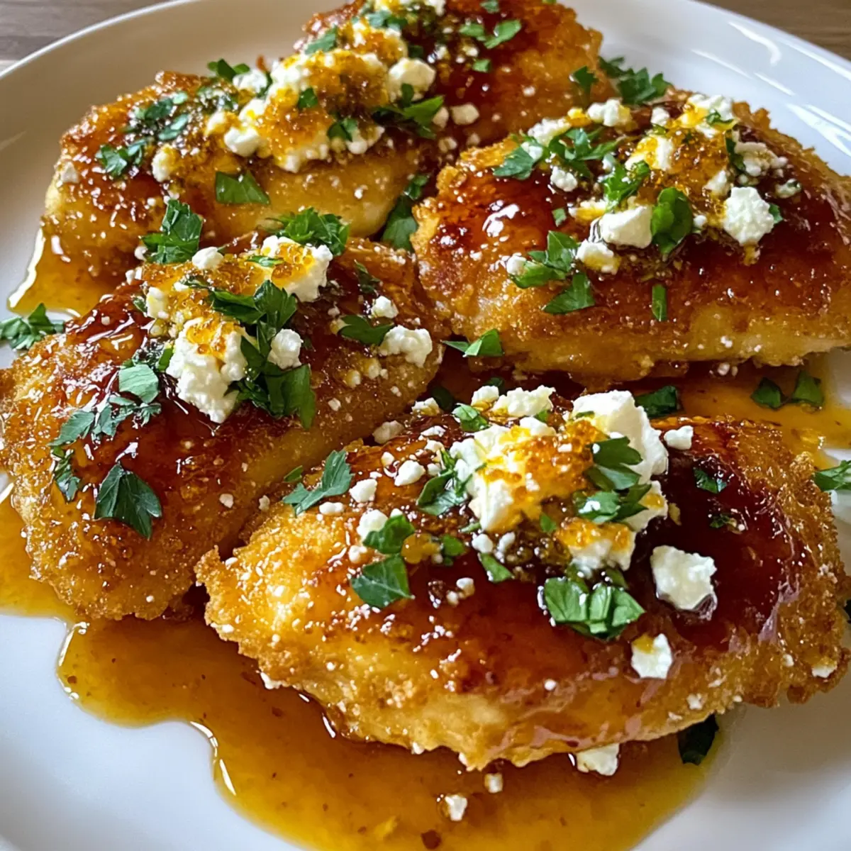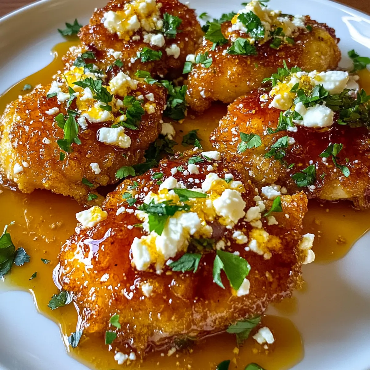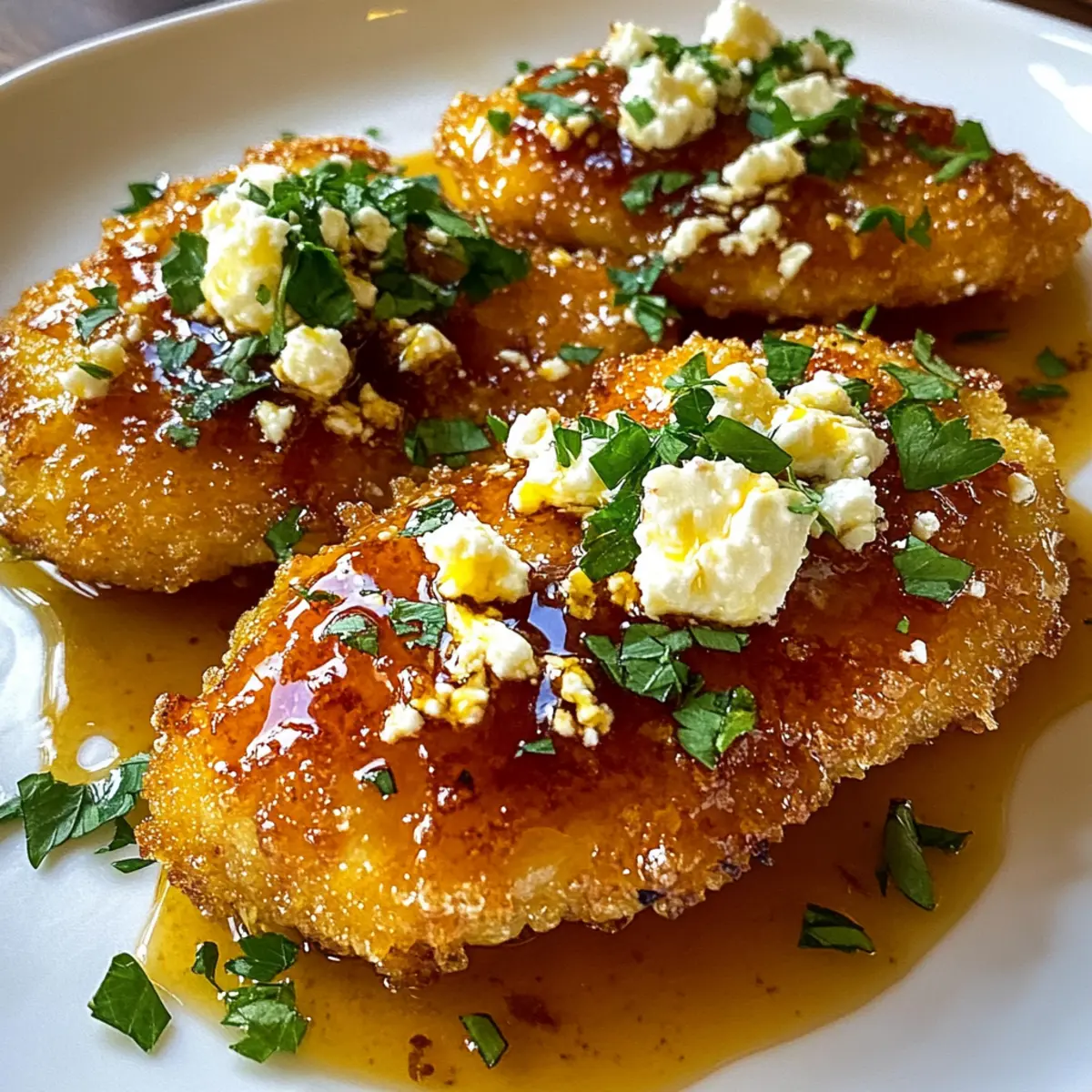 Jump to Recipe Print RecipeAs I stood in my kitchen, that familiar sizzle of frying chicken filled the air, instantly boosting my spirits. Today, I was preparing something truly special: Crispy Hot Honey Feta Chicken. This delicious dish combines the satisfying crunch of panko-breaded chicken with the creamy tang of feta cheese and a drizzle of sweet yet spicy hot honey glaze. Perfect for a cozy weeknight dinner or a gathering with friends, it’s not only easy to whip up with pantry staples, but it also elevates your home-cooked meal experience to something extraordinary. Get ready to impress your taste buds and leave fast food behind—do you have your apron on? Why is Crispy Honey Feta Chicken a Must-Try? Deliciously Unique: This dish perfectly blends sweet and savory, with a hot honey glaze enhancing the rich flavor of creamy feta. Simple Preparation: No advanced skills are needed! You’ll be frying up this crowd-pleaser in no time. Perfect for Any Occasion: Whether it’s a cozy weeknight dinner or an elegant gathering, this recipe is sure to impress. Versatile Pairings: Serve it with a refreshing side salad or some creamy whipped potatoes to create a well-rounded meal. Leftover Friendly: Great as a reheated snack or added to your favorite salads, like this delightful Hawaiian Chicken Salad. With its delightful crunch and mouthwatering glaze, this Crispy Hot Honey Feta Chicken will transform your dinner table into a gourmet experience! Honey Feta Chicken Ingredients • Get ready to create a mouthwatering dish! For the Chicken Chicken Breasts – Use boneless, skinless for easy prep. All-Purpose Flour – Works as the perfect coating; use gluten-free flour for a safe alternative. Eggs – This helps the breadcrumbs stick beautifully. Panko Breadcrumbs – Light and crispy; substitute regular breadcrumbs for a denser finish. For the Feta Coating Feta Cheese – Creamy and tangy, it’s the star of this show; goat cheese is a great alternative if desired. Garlic Powder – A must for boosted flavor! Onion Powder – Adds depth to the dish’s profile. Smoked Paprika – Introduces a smoky hint that complements the dish perfectly. Salt and Pepper – Essential to elevate all the flavors. For the Hot Honey Glaze Vegetable Oil – For frying; canola or peanut oil are good substitutes. Honey – The key ingredient for the sweet glaze; a touch of magic! Hot Sauce – Adjust the heat to your liking; a little goes a long way! Lemon Juice – Brightens up the glaze beautifully. For Garnishing Fresh Parsley – Adds color and freshness for a finishing touch. This Crispy Honey Feta Chicken recipe will elevate your dinner game and leave you feeling accomplished in the kitchen! Step‑by‑Step Instructions for Crispy Hot Honey Feta Chicken Step 1: Prepare the Chicken Begin by patting the boneless, skinless chicken breasts dry with paper towels. This crucial step ensures that the chicken will achieve a crispy golden coating during frying. Next, season both sides generously with salt and pepper to enhance the chicken’s natural flavor and set it aside while you prepare your dredging station. Step 2: Set Up Dredging Station Create an organized dredging station by placing three shallow dishes in a row. Fill the first with all-purpose flour, the second with beaten eggs, and the third with a mixture of panko breadcrumbs, crumbled feta cheese, garlic powder, onion powder, smoked paprika, and additional salt and pepper. This setup will streamline the coating process for your crispy hot honey feta chicken. Step 3: Dredge Chicken Take each chicken breast and coat it in flour, ensuring all surfaces are covered. Next, dip the floured chicken into the beaten eggs, allowing any excess to drip off. Finally, firmly press the chicken into the panko mixture, ensuring it is well-coated with those crunchy, flavorful breadcrumbs. Repeat with all chicken pieces to prepare them for frying. Step 4: Heat Oil Pour about 1/4 inch of vegetable oil into a large skillet and heat it over medium-high heat until it shimmers, indicating it’s hot enough for frying. To test if the oil is ready, drop in a small pinch of the breadcrumb mixture; if it sizzles, you’re good to go! This ensures that your chicken will fry to a perfect, crispy texture. Step 5: Fry Chicken Carefully place the coated chicken breasts into the hot oil in batches, making sure not to overcrowd the pan. Fry each piece for 4-5 minutes on one side or until they turn a beautiful golden brown. Then, flip the chicken and fry for another 4-5 minutes, ensuring it reaches an internal temperature of 165°F (75°C) for safe consumption. Step 6: Prepare Hot Honey Glaze While the chicken is frying, prepare the hot honey glaze by combining honey, your choice of hot sauce, and fresh lemon juice in a small saucepan over low heat. Stir the mixture until it is well combined, allowing the flavors to meld together. This sweet and spicy glaze will add an irresistible finish to your crispy hot honey feta chicken. Step 7: Drain Oil Once the chicken is cooked, carefully remove each piece from the skillet using tongs and place them on a plate lined with paper towels. This will absorb any excess oil, maintaining that satisfying crunch on your hot honey feta chicken. Allow the chicken to rest for a few minutes while you finish up. Step 8: Glaze Chicken Drizzle the warm hot honey glaze generously over the fried chicken pieces, ensuring each one is coated in that delightful sticky sweetness. The glaze complements the savory feta and adds a punch of flavor that brings this dish to life. Step 9: Garnish To finish, sprinkle freshly chopped parsley over the glazed chicken for a pop of color and freshness. This touch not only makes your crispy hot honey feta chicken visually appealing but also elevates the dining experience with its inviting aroma. Serve immediately and savor your delicious creation! Storage Tips for Honey Feta Chicken Fridge: Store cooled leftover honey feta chicken in a