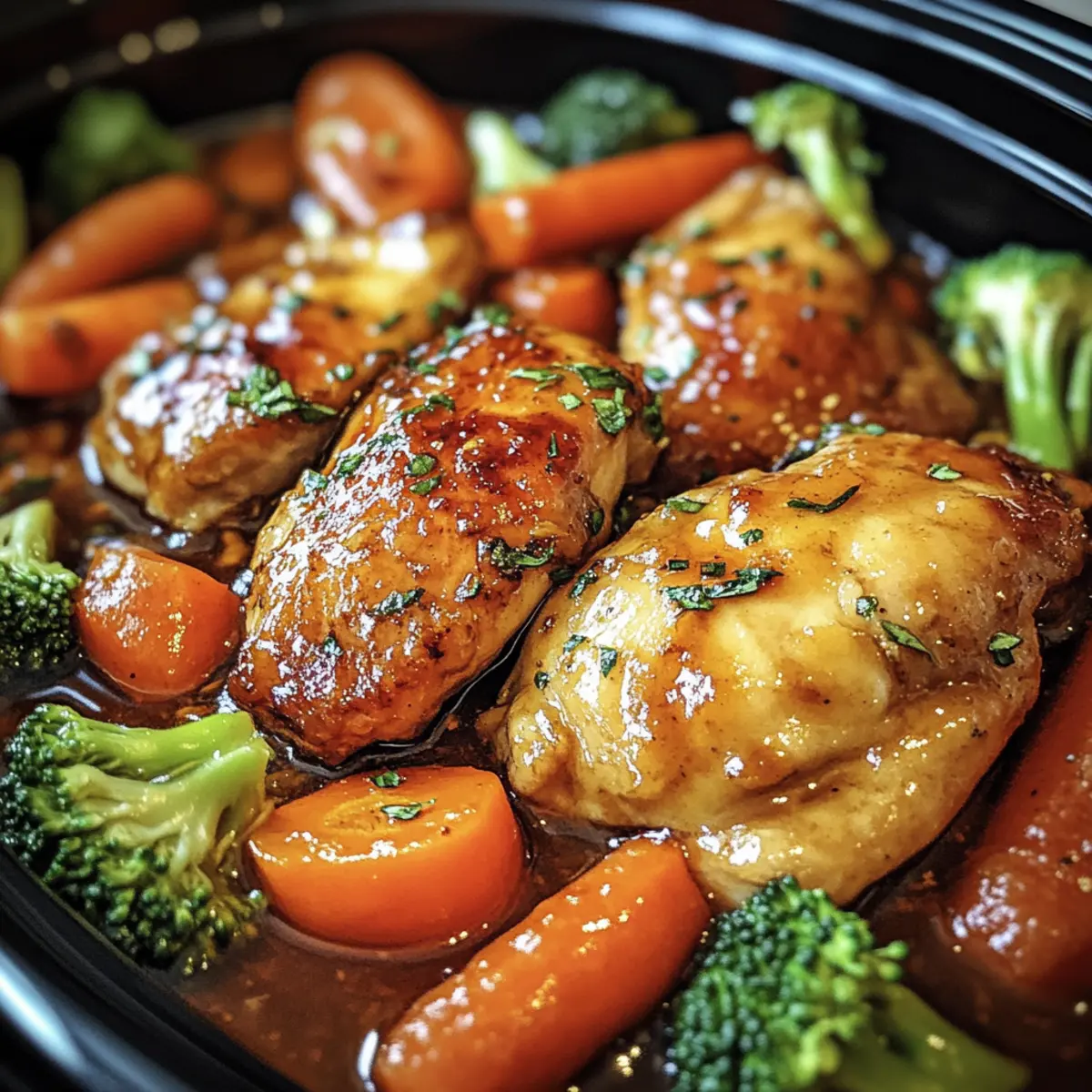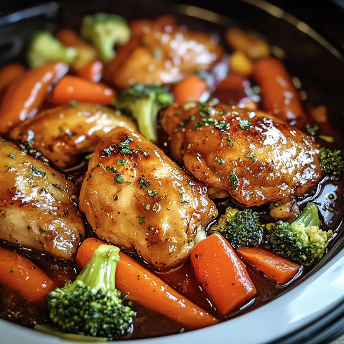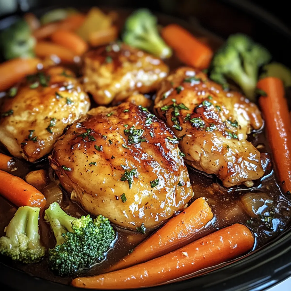 Jump to Recipe Print RecipeAs the sun sets and the hustle of the day begins to fade, I crave meals that wrap me in comfort—like this Slow Cooker Honey Garlic Chicken and Veggies. With tender chicken thighs bathing in a sweet and savory glaze, this dish continues to elevate my weeknight dinners. It’s a charming one-pot meal that not only satisfies my hunger but also takes less than ten minutes to throw together, making it perfect for busy evenings. Plus, the healthy balance of vibrant veggies means I can indulge without the guilt. The enticing aroma wafting through my kitchen hints at the delightful flavors waiting to dance on my plate. Are you ready to discover how this simple recipe can transform your dinner routine? Why is Honey Garlic Chicken a Must-Try? Simplicity: Just throw everything into the slow cooker and let it work its magic, requiring minimal prep time. Nutritious: Packed with colorful vegetables and protein, this dish offers a healthy balance for your family table. Crowd-Pleasing: The sweet and savory flavors are a hit with both kids and adults, ensuring everyone leaves the table satisfied. Versatile: Feel free to swap in seasonal veggies or serve it over rice, quinoa, or even in lettuce wraps for a fun twist. Time-Saving: With an effortless cooking method, you have more time to relax while dinner cooks itself. Indulge in these flavors with our delicious and easy Bbq Chicken Sandwiches or enjoy a refreshing twist with a Hawaiian Chicken Salad. Honey Garlic Chicken and Veggies Ingredients Discover the delightful elements that make this Honey Garlic Chicken and Veggies so irresistible! For the Chicken • Chicken Thighs – The star of the dish, providing tenderness and flavor; feel free to substitute with chicken breasts but monitor time carefully to avoid dryness. For the Vegetables • Carrots – Add sweetness and color to your dish; swap with parsnips or sweet potatoes for a different flair. • Broccoli Florets – Offer crunch and nutrition; green beans or snap peas can be used instead if that’s what you have on hand. • Red Bell Peppers – Provide vibrant color and sweetness; consider yellow or orange bell peppers for a fun twist. For the Sauce • Honey – Infuses sweetness into the dish; adjust to preference, or use maple syrup for a vegan-friendly option. • Soy Sauce – Adds umami depth; coconut aminos are an excellent gluten-free alternative. • Minced Garlic – Essential for that aromatic flavor; fresh garlic works best, but garlic powder is a quick substitute. • Chicken Broth – Enhances the sauce’s depth; switch to vegetable broth for a vegetarian version. • Cornstarch – Acts as a thickener for the marvelous sauce; arrowroot powder can replace it for a gluten-free option. • Cold Water – Used to create a slurry with cornstarch, ensuring smooth thickening. For Garnishing • Green Onions – Sprinkled on top for a burst of freshness; optional but recommended for that extra crunch. • Toasted Sesame Seeds – Adds a nutty flavor and delightful texture; feel free to omit if nut-free. With these ingredients at your fingertips, you’re one step closer to enjoying a deliciously wholesome bowl of Honey Garlic Chicken and Veggies! Step‑by‑Step Instructions for Honey Garlic Chicken and Veggies Step 1: Whisk the Sauce In a small mixing bowl, combine 1/2 cup of honey, 1/4 cup of soy sauce, 4 cloves of minced garlic, and 1/2 cup of chicken broth. Whisk until smooth, ensuring no lumps remain. This sweet and savory sauce is essential for coating your Honey Garlic Chicken and Veggies, enhancing their flavors as they cook together. Step 2: Prepare the Slow Cooker Place 2 pounds of chicken thighs at the bottom of your slow cooker. Layer chopped carrots, broccoli florets, and red bell pepper strips on top. Aim for an even spread; this layering technique allows the veggies to absorb the delicious sauce while keeping the chicken moist during the slow-cooking process. Step 3: Combine Ingredients Pour the prepared honey garlic sauce evenly over the chicken and vegetables. Ensure everything is well coated for maximum flavor. As the mixture seeps through, it will create a beautiful glaze, enhancing the overall taste of the Honey Garlic Chicken and Veggies while they slow-cook to perfection. Step 4: Set to Cook Cover the slow cooker with its lid and set it to cook on low for 4 to 6 hours. Keep an eye on the chicken; it should become tender and easy to shred. The vibrant colors of the veggies will soften but remain bright, indicating they’ve absorbed the sweet-savory essence of the sauce. Step 5: Thicken the Sauce About 30 minutes before serving, make a slurry by mixing 2 tablespoons of cornstarch with 2 tablespoons of cold water in a small bowl. Stir until smooth, then add this mixture to the slow cooker. This step will enhance the sauce’s thickness, creating a luscious glaze that clings to the Honey Garlic Chicken and Veggies. Step 6: Garnish and Serve Once the cooking time is complete, check the chicken for tenderness. Serve the dish warm, garnished with chopped green onions and a sprinkle of toasted sesame seeds for added texture. This final touch elevates your Honey Garlic Chicken and Veggies, making it not only delicious but visually appealing as well. Make Ahead Options These Slow Cooker Honey Garlic Chicken and Veggies are a fantastic choice for meal prep! You can chop the vegetables and marinate the chicken in the honey garlic sauce up to 24 hours in advance, storing them separately in airtight containers in the refrigerator. This allows the flavors to meld beautifully while maintaining quality. On the day of serving, simply layer the chicken and veggies in your slow cooker, pour the pre-prepared sauce over them, and set your slow cooker on low for 4 to 6 hours. This meal is not only quick to prepare; it allows you to enjoy a comforting dinner with minimal effort after a busy day! Honey Garlic Chicken and Veggies Variations Feel free to custo