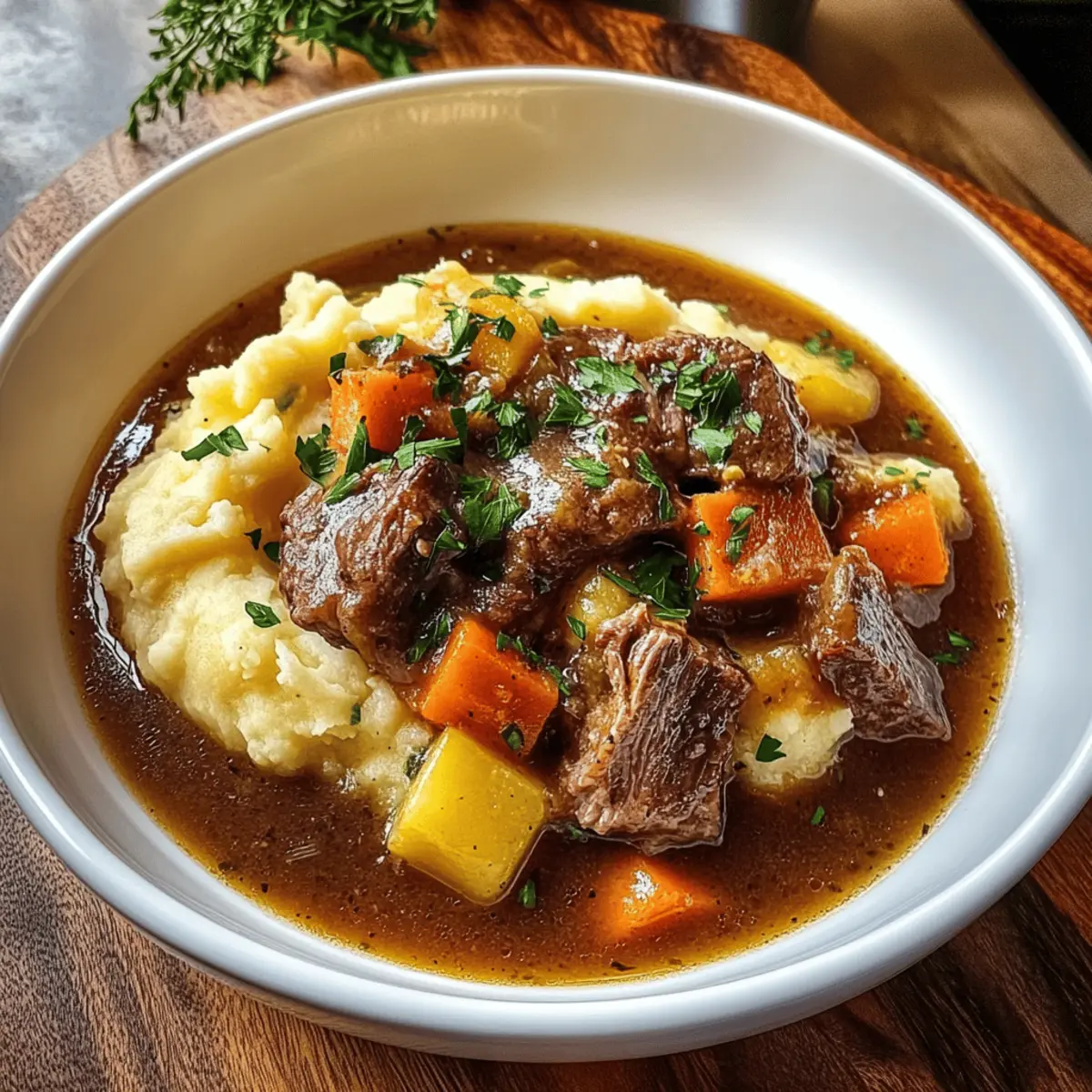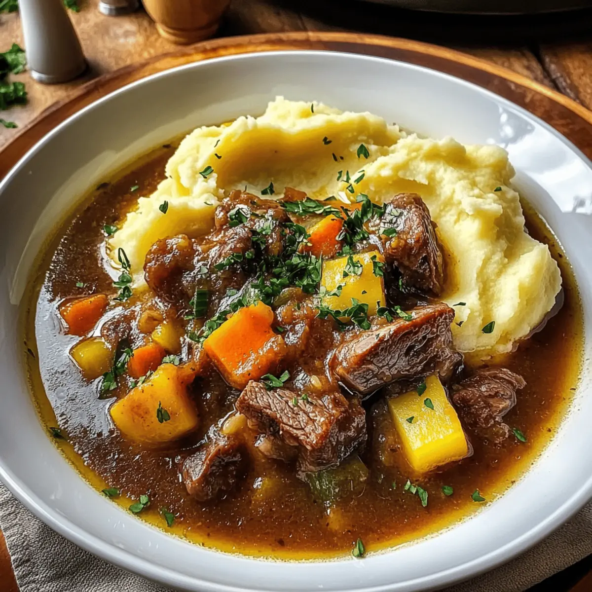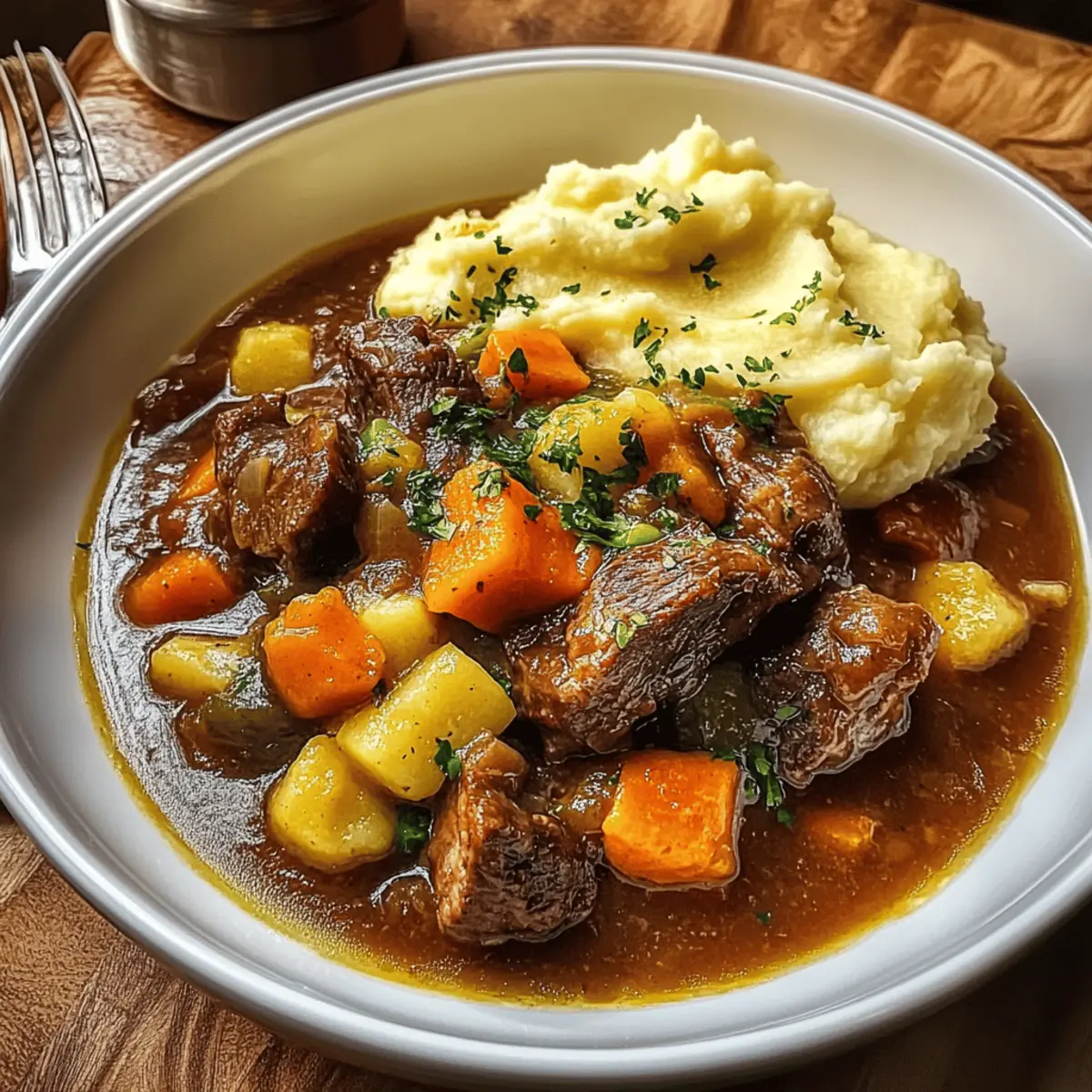 Jump to Recipe Print RecipeAs I shuffled through my pantry, an unexpected aroma wafted through the air, bringing back memories of my grandmother’s kitchen. There it was, the heartwarming scent of simmering Irish Stew with Mashed Potatoes, a timeless comfort food that wraps you in a cozy embrace. This dish isn’t just about filling your belly—it’s a hearty meal that promises to bring people together, whether you choose tender lamb for a traditional twist or opt for beef for a familiar favorite. The best part? It’s not only easy to prepare but also perfect for meal prep, making sure you have delicious leftovers to enjoy throughout the week. Curious about how to recreate this Irish classic? Let’s dive into the recipe that will warm both your home and your heart! Why Is This Irish Stew a Must-Try? Hearty Comfort: This Irish Stew with Mashed Potatoes is the ultimate comfort food, blending tender meat with rich, savory broth that satisfies your cravings. Customizable Choices: Whether you prefer lamb or beef, you can tailor the recipe to fit your family’s taste—everyone will find their favorite! Effortless Cooking: The straightforward instructions mean you can whip up this meal without stress, allowing you to focus on quality time with loved ones. Versatile Variations: Consider adding seasonal veggies or even a splash of Guinness stout for unique twists that keep things exciting. Delicious Leftovers: Make extra, and enjoy comforting meals throughout the week! Pair with crusty bread for a complete dining experience, or round it out with a refreshing Spinach Salad Poppy to balance the rich flavors. Irish Stew Ingredients • Essential components for a hearty dish. For the Stew Lamb Shoulder – This primary protein provides rich flavor and tenderness when slow-cooked; can be substituted with beef if desired. Vegetable Oil – Used for browning the meat; olive oil works wonderfully as a substitute. Salt and Pepper – Vital for seasoning; adjust to your taste for the best flavor enhancement. Onion – Use yellow or white onions to contribute sweetness and depth to the stew. Garlic – Minced or sliced fresh garlic adds aromatic richness to the dish. Carrots – Sweetens the stew and adds vibrant color; parsnips can serve as a unique alternative. Potatoes (for stew) – Yukon gold or russet potatoes are recommended for added heartiness. Beef or Lamb Broth – Forms the flavorful base; vegetable broth can make it lighter and gluten-free. Guinness Stout (optional) – A splash deepens the broth’s taste; omit if non-alcoholic, using extra broth instead. Tomato Paste – Thickens the stew and lends a tangy depth of flavor. Fresh Thyme – This herb brings earthy notes; dried thyme can substitute if fresh is unavailable. Parsley – Fresh parsley adds a lovely brightness as a garnish; chives work too! Bay Leaves – Infuses the stew with fragrant notes; don’t forget to remove before serving! For the Mashed Potatoes Potatoes (for mashing) – Starchy varieties create a fluffier and creamier texture; ideal for that perfect mash! Milk – Adds creaminess to mash; consider using cream or non-dairy alternatives for variety. Butter – Provides richness; a dairy-free spread can substitute for those who need it. Step‑by‑Step Instructions for Irish Stew With Mashed Potatoes Step 1: Brown the Lamb Season the lamb shoulder pieces generously with salt and pepper. In a large pot or Dutch oven, heat 2 tablespoons of vegetable oil over medium-high heat. When the oil shimmers, add the lamb in a single layer, browning for about 5-7 minutes until golden brown on all sides. Once browned, remove the lamb from the pot and set it aside. Step 2: Sauté Aromatics In the same pot, if necessary, add a bit more oil and reduce the heat to medium. Add 1 diced onion and 2 minced garlic cloves, stirring gently for about 3-4 minutes until the onion becomes translucent and fragrant. This step builds a flavorful base for your Irish stew, so keep an eye on the aromatics as they cook. Step 3: Combine Ingredients Return the browned lamb to the pot along with 2 diced carrots and 2 diced potatoes. Pour in 4 cups of beef or lamb broth, followed by a splash of Guinness stout if desired. Add 2 tablespoons of tomato paste, 1 teaspoon of fresh thyme, and 2 bay leaves. Stir everything together to combine the flavors beautifully. Step 4: Simmer the Stew Increase the heat to high to bring the Irish stew to a boil. Once boiling, reduce the heat to low, cover the pot, and let it simmer gently for about 1½ to 2 hours. Stir occasionally, watching for the lamb to become tender and start to fall apart, infusing the broth with rich flavors. Step 5: Prepare Mashed Potatoes While the stew simmers, bring a large pot of salted water to a boil. Add 2 pounds of peeled and diced potatoes, cooking for about 15-20 minutes until they are fork-tender. Drain the potatoes thoroughly, then return them to the warm pot. Add ½ cup of milk and 4 tablespoons of butter, mashing until they reach your desired creamy consistency. Step 6: Finish the Stew After simmering, remove the bay leaves from the pot and adjust seasoning with additional salt and pepper to taste. Serve the hearty Irish stew hot, alongside generous scoops of creamy mashed potatoes. Garnish with freshly chopped parsley for a lovely touch, and delight in the comforting flavors of this Irish stew with mashed potatoes. Make Ahead Options These delightful Irish Stew with Mashed Potatoes are perfect for busy home cooks looking to save time during the week! You can prepare the stew base—browning the lamb and sautéing the vegetables—up to 24 hours in advance. Simply refrigerate your ingredients in an airtight container. When you’re ready to serve, just combine everything in a pot with broth and cook according to the recipe instructions. For the mashed potatoes, you can boil and mash them no more than 3 days ahead, making sure to add a bit of extra milk to maintain creaminess. Reheat on
