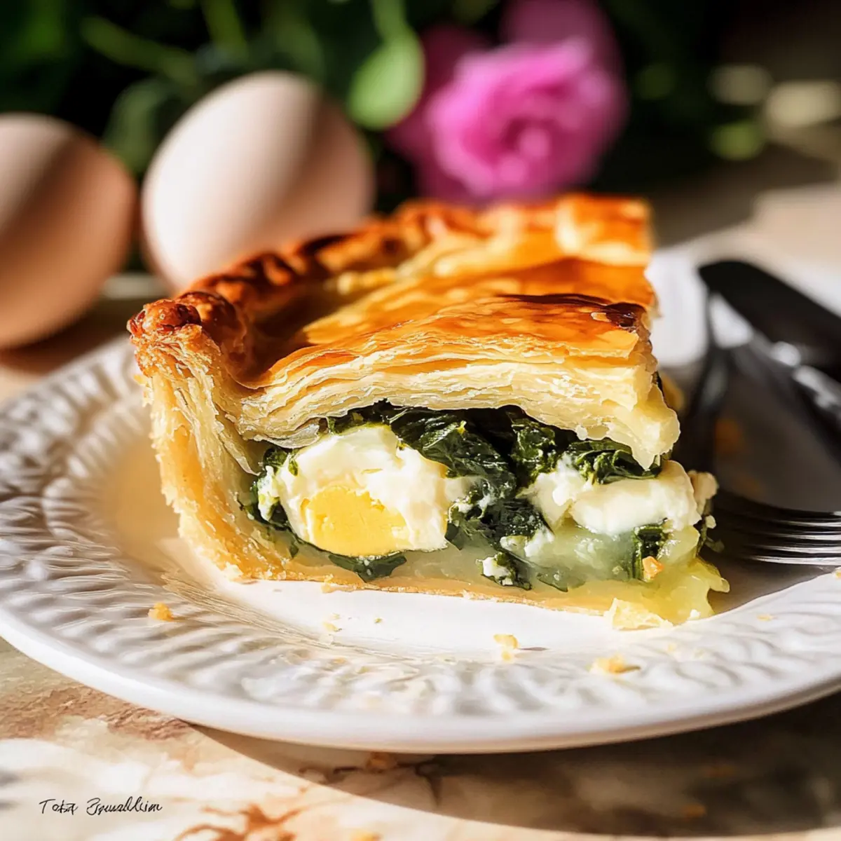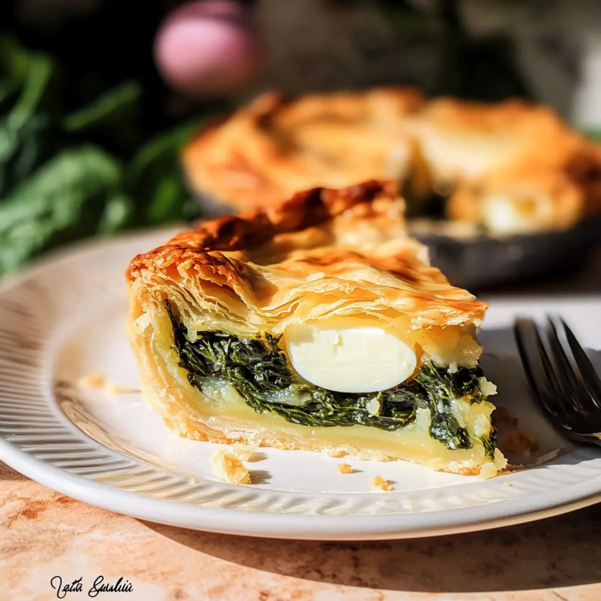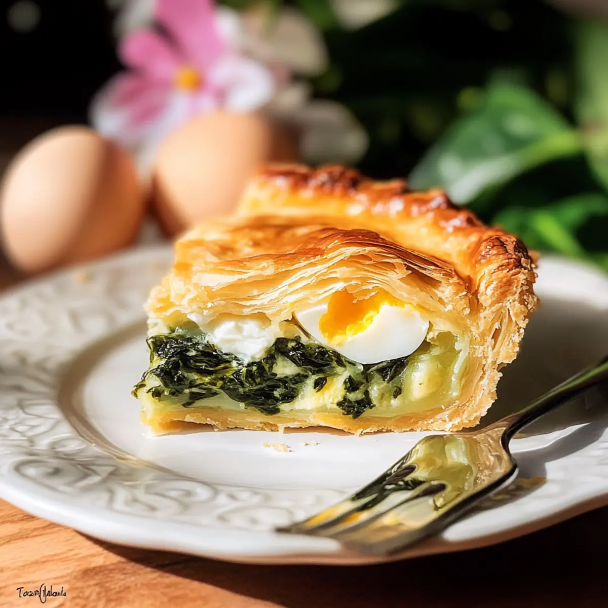 Jump to Recipe Print RecipeAs I pulled a golden-brown pie from the oven, the aroma of fresh spinach and melted cheese filled my kitchen, wrapping me in a warm embrace of nostalgia. Today, I’m sharing my take on the beloved Italian Easter Pie, or Torta Pasqualina. With its flaky crust encasing a rich blend of spinach, creamy cheeses, and whole eggs, this dish doesn’t just serve as a stunning centerpiece; it’s a delicious harmony of flavors that transitions beautifully from your holiday table to a cozy weeknight meal. One of the best parts of this recipe is how effortlessly it comes together—perfect for both seasoned chefs and newcomers alike! Plus, it’s vegetarian-friendly, making it a wonderful option for gatherings where everyone can enjoy a slice. Are you ready to bring a taste of Italy to your kitchen? Why is Torta Pasqualina a must-try? Simplicity: This recipe is a breeze to make, allowing both novice and experienced cooks to succeed with minimal effort. Celebratory Flavor: Infused with fresh spinach and creamy cheeses, the Torta Pasqualina brings an irresistible warmth to your gatherings, making it a hit at any table. Versatile Dish: Perfect for Easter or any occasion, it effortlessly blends into brunch spreads or cozy weeknight dinners. Pair it with a side salad or even some Italian Pasta Salad for a delightful meal! Visual Appeal: Each slice showcases a stunning combination of golden crust and vibrant filling, captivating your guests from the moment it’s served. Make-Ahead Friendly: Prepare the filling in advance and enjoy a hassle-free cooking experience on the day of serving. Store it up to 3 days in the fridge, so you can focus on creating memories, not last-minute cooking chaos! Italian Easter Pie Ingredients • Discover the essentials for this traditional delight. For the Filling Yellow Onion – Adds sweetness and depth to the filling; substitute with shallots for a milder flavor. Olive Oil – Perfect for sautéing vegetables to enhance flavor; unsalted butter can be used as an alternative. Spring Onion – Provides a mild onion flavor; use scallions as a substitute if desired. Frozen Chopped Spinach – Main filling ingredient; thaw and drain thoroughly to prevent excess moisture. Alternatively, fresh spinach can be used, but ensure to wilt it first. Fresh Curly Parsley – Adds a fresh, vibrant touch; basil can be used instead for a twist in flavor. Cream Cheese – Delivers creaminess and richness in the filling; ricotta cheese is a lighter alternative. Extra Sharp Cheddar Cheese – Offers bold flavor and texture; substitute with Gruyère for a milder taste. Parmesan Cheese – Adds umami and depth; avoid pre-grated for optimal texture; consider Pecorino Romano as a substitute. Ground Nutmeg – Enhances the earthy notes of the pie; reduce or omit based on preference. Ground White Pepper – Introduces a mild spice; black pepper can be used if preferred. Sea Salt – Essential for seasoning; adjust according to taste. Medium Eggs – Provide protein and structural integrity; use large eggs if preferred, but adjust cooking time. For the Crust Puff Pastry – Forms the delightful crust; store-bought is recommended for ease, but homemade is fantastic if you have time. Beaten Egg (for glaze) – Enhances the appearance with a golden sheen; vital for achieving that beautiful crust finish. Step‑by‑Step Instructions for Italian Easter Pie Step 1: Prepare Filling Begin by heating 2 tablespoons of olive oil in a skillet over medium heat. Sauté finely chopped yellow onion and spring onion until soft and translucent, about 5 minutes. Then, add thawed and drained frozen chopped spinach along with freshly chopped parsley. Cook until the spinach is fully wilted, approximately 3 minutes, then remove from heat and let cool slightly before draining any excess liquid. Step 2: Mix Filling In a large mixing bowl, combine the sautéed onion mixture with cream cheese, extra sharp cheddar cheese, grated Parmesan, a pinch of ground nutmeg, ground white pepper, and sea salt. Mix until smooth and creamy, ensuring all ingredients are thoroughly combined. Taste the filling and adjust seasonings if needed, providing a balance of flavors for your Italian Easter Pie. Step 3: Preheat Oven While the filling cools further, preheat your oven to 400°F (200°C). Place a cookie sheet on the lower rack to catch any drips, ensuring a clean baking experience. The preheated oven will help create a beautifully golden crust for your Torta Pasqualina, so make sure it reaches temperature before proceeding to assemble. Step 4: Assemble Pie Roll out one sheet of puff pastry on a floured surface to fit your tart pan, ensuring ample overhang to fold over later. Transfer the pastry into the pan, gently pressing it into the edges. Fill with your spinach mixture, creating small wells for the medium eggs. Carefully crack the eggs into the wells, maintaining their shape for a beautiful presentation once baked. Step 5: Cover and Seal Roll out the second sheet of puff pastry to cover the pie, ensuring it overlaps the edges of the bottom crust. Pinch the edges together to create a seal, locking in the filling and eggs. Brush the top with a beaten egg for a glossy finish and slice a few small vents in the crust to allow steam to escape during baking. Step 6: Bake Carefully place the filled tart in the preheated oven on the prepared cookie sheet. Bake for approximately 35 minutes, or until the pastry turns a rich golden brown, and the filling is bubbling. The aroma of the Italian Easter Pie will fill your kitchen, making this a moment to savor as it reaches its perfect doneness. Step 7: Cool Once baked, remove the Torta Pasqualina from the oven and let it cool in the pan for about 5-10 minutes. This resting time allows the filling to set, making it easier to slice. Afterward, gently remove the pie from the tart pan, letting it cool further on a wire rack for another 20 minutes before serving or slicing into de