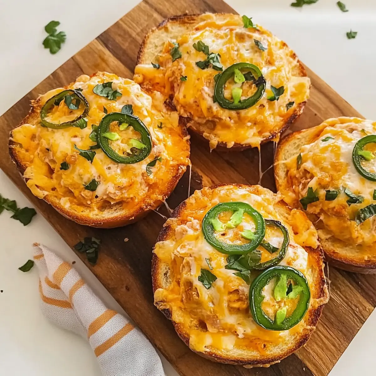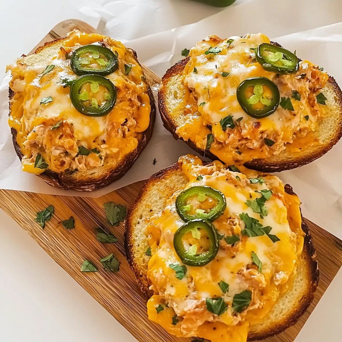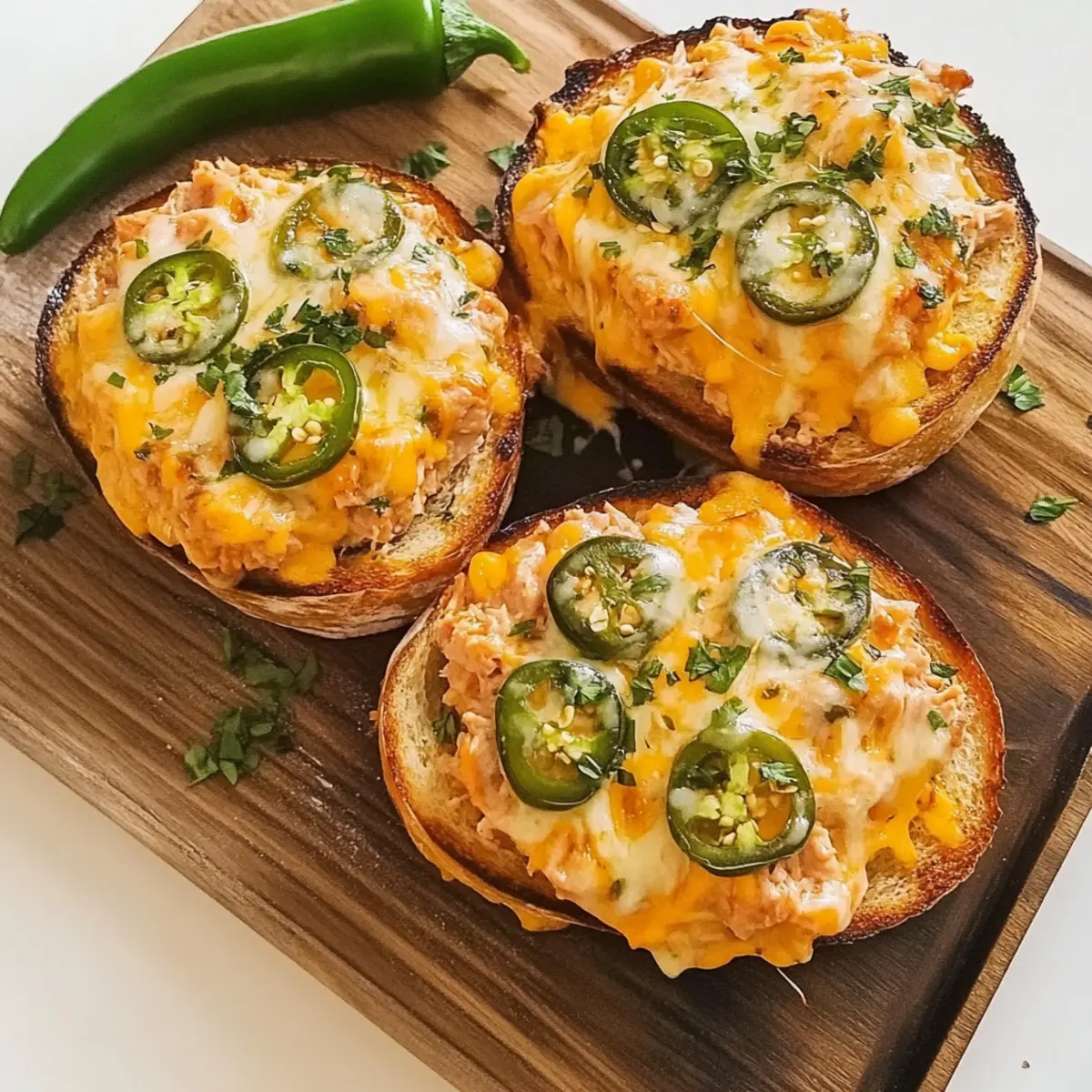 Jump to Recipe Print RecipeAs I sifted through my pantry this week, it hit me: why not transform those canned treasures into something exciting? Enter the Jalapeño Cheddar Tuna Melt, a deliciously satisfying dish that marries flavors with ease. Whipping up these melts takes under 10 minutes and offers a protein-packed punch, making them perfect for those busy days or post-workout cravings. Plus, they’re incredibly versatile; feel free to customize the ingredients to fit your taste. Picture crusty bread supporting a creamy, cheesy filling studded with zesty jalapeños. Doesn’t that sound like the ultimate comfort food? Ready to take your lunch game to the next level with these quick and flavorful delights? Let’s get started! Why not elevate your tuna melt? Quick and Easy: With just 10 minutes of prep time, these Jalapeno Cheddar Tuna Melts are perfect for busy lives. High in Protein: Packed with tuna and cheese, they’re not just comforting but also nutritious, making them a superb post-workout meal. Flavor Explosion: The combination of zesty jalapeños and sharp cheddar creates a deliciously bold flavor that will wake up your taste buds. Versatile: Customize based on your pantry staples, from different cheeses to varying breads—endless options for everyone! Meal Prep Friendly: Make the filling ahead of time and simply assemble whenever hunger strikes. It’s an ideal way to always have a wholesome meal ready in a flash. Don’t forget to check out our tips for adding additional veggies or trying out alternate bread options to make this dish your own! Jalapeño Cheddar Tuna Melt Ingredients For the Filling Canned Tuna – A rich source of protein; feel free to substitute with canned salmon for a different flavor. Jalapeños – Adds a delightful kick; pickled jalapeños can provide a tangy twist if desired. Sharp Cheddar Cheese – Delivers a bold, cheesy flavor; mozzarella works well for a milder alternative. Mayonnaise – Ensures creaminess; Greek yogurt is a healthier substitution that adds protein. Mustard – Brightens the flavor; choose Dijon or yellow mustard to suit your preference. For the Bread Bread (e.g., sourdough, wheat, bagels) – The ideal base for your melts; opt for your favorite type that toasts beautifully. Additional Flavor Enhancers Chopped Celery – Adds a pleasant crunch; perfect for enhancing texture in your tuna filling. Sweet and Spicy Pickles – Introduces extra zest; great for those who love a uniquely flavored profile. Feel free to mix and match according to your pantry and preferences—these Jalapeño Cheddar Tuna Melts are as adaptable as they are delicious! Step‑by‑Step Instructions for Jalapeño Cheddar Tuna Melt Step 1: Prepare the Filling In a medium bowl, combine canned tuna, diced jalapeños, shredded sharp cheddar cheese, mayonnaise, and mustard. Mix thoroughly with a fork until all ingredients are well incorporated, creating a creamy and colorful mixture. The filling should have a consistent texture without any large chunks of tuna and an inviting aroma of the jalapeños. Set it aside while you preheat the oven. Step 2: Store or Use If you’re meal prepping for the week, transfer the tuna filling to an airtight container, ensuring it is sealed tightly. Refrigerate the mixture, where it will stay fresh for 2-3 days, ready for your quick meals. When you’re ready to enjoy your Jalapeño Cheddar Tuna Melt, proceed to assemble your delicious sandwiches. Step 3: Assemble Melts Lay out your bread slices on a clean surface or cutting board. Evenly spread a generous amount of the prepared tuna filling on each slice, allowing the mixture to reach the edges for maximum flavor. Top each slice with additional shredded cheddar cheese and a few more jalapeño slices if desired, enhancing the melts’ spicy kick. Step 4: Bake Preheat your oven or air fryer to 400°F (200°C). Place the assembled tuna melts on a baking sheet lined with parchment paper. Bake for 7-9 minutes, or until the bread is golden brown and crispy, and the cheese is bubbly and beginning to brown. Keep an eye on them to ensure the melts do not over-bake. Step 5: Broil for Extra Crunch If you desire an extra crispy cheese topping, switch your oven settings to broil for the last 2-3 minutes of baking. Watch closely during this step, as the cheese can burn quickly. The result will be a beautifully melted, slightly toasted appearance, intensifying the flavors of your Jalapeño Cheddar Tuna Melt. Step 6: Serve Once your melts are done, remove them from the oven and allow them to cool for a minute. Slice the melts in half for easier handling. Serve them warm alongside fresh veggies or crunchy potato chips, creating a satisfying and delightful meal perfect for any occasion. Jalapeño Cheddar Tuna Melt Variations Feel free to let your creativity shine and customize this dish to tantalize your taste buds! Dairy-Free: Substitute the cheese with a plant-based alternative for a dairy-free version without sacrificing flavor. Try varieties like cashew cheese or almond-based cheddar for a delightful twist! Low Carb: Swap the bread for lettuce wraps to create a refreshing, low-carb option. This is a great way to savor the filling while keeping things light and crisp. Spicy Kick: Add a dash of hot sauce or a sprinkle of crushed red pepper flakes to elevate the heat. Perfect for those who thrive on a little more zing with each bite! Herb Infusion: Mix in fresh herbs like cilantro or parsley for an aromatic punch. This addition brightens the overall flavor profile and adds a touch of freshness. Veggie-Packed: Fold in finely chopped spinach or kale to boost nutritional value without overpowering the dish. These greens not only enhance the color but also pack in extra vitamins and minerals! Savory Additions: Incorporate diced olives or sun-dried tomatoes for a Mediterranean flair. These ingredients introduce a burst of umami to balance the creamy textures. Cheese Variety: Switch the sharp chedd
