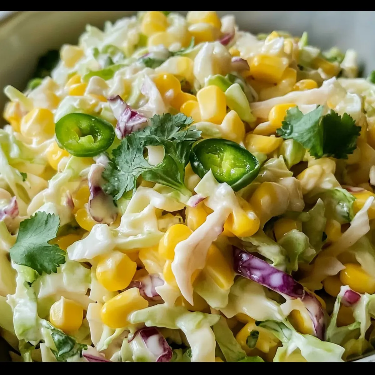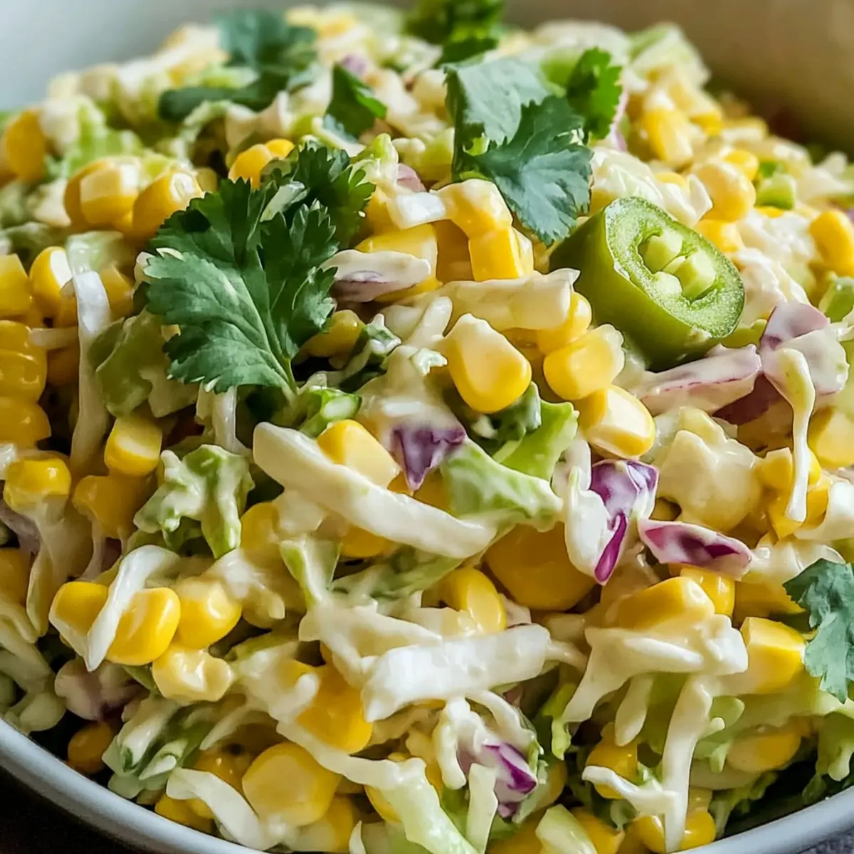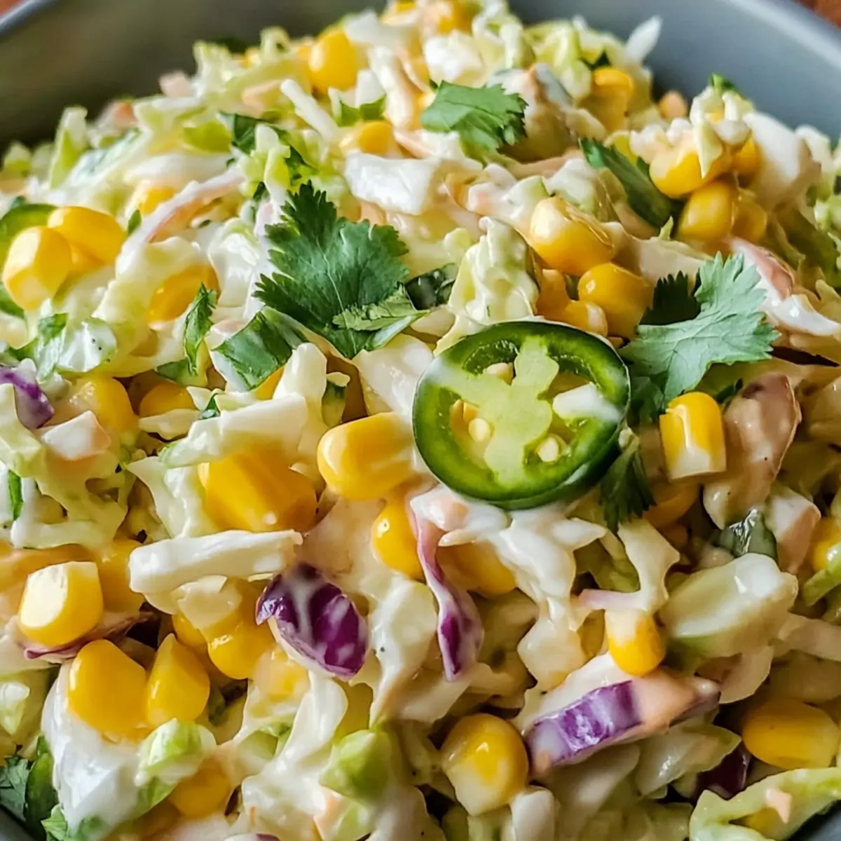Jump to Recipe Print RecipeThe first time I tasted Jalapeno Corn Coleslaw, it was as if summer had exploded on my plate. This vibrant dish turns a classic slaw into something truly special, combining the crispness of fresh cabbage with the sweetness of corn and a delightful kick from pickled jalapeños. It’s not just a side dish—it’s a crowd-pleaser that’s incredibly easy to whip up for any gathering, whether it’s a sunny barbecue or cozy holiday meal. Plus, this budget-friendly recipe can be customized to suit any season or dietary needs, making it a versatile staple in my kitchen. Are you ready to elevate your coleslaw game with this zesty twist? Let’s dive into this deliciously spicy Jalapeno Corn Coleslaw! Why is this coleslaw a must-try? Zesty flavors that excite your taste buds: The combination of pickled jalapeños and sweet corn creates a bold, vibrant taste that livens up any meal. Versatile and adaptable: This coleslaw can effortlessly transition from summer barbecues to cozy winter gatherings, fitting any season. Budget-friendly ingredients ensure you don’t break the bank while impressing your guests with an exceptional dish. Quick to prepare: With just a few simple steps, you’ll have a delightful side ready in no time. And for a delightful pairing, try it alongside my Balsamic Steak Corn or serve it up in a fresh taco with Grilled Shrimp Bowl. Jalapeno Corn Coleslaw Ingredients For the Slaw • Cabbage – Provides the main structure and crunch; feel free to use green or red based on your preference. • Sweet Corn – Adds natural sweetness and texture; fresh is ideal, but canned or frozen will work just as well. • Pickled Jalapeños – The star of the show with a spicy kick; milder than fresh ones, they bring tangy richness to the dish. • Herbs (like cilantro) – Brightens and enhances flavor; fresh herbs are highly recommended for optimal taste. For the Dressing • Mayonnaise – Adds creamy goodness; opt for a dairy-free version if needed. • Vinegar (apple cider recommended) – Provides tanginess to balance sweetness and spice; a key player in bringing flavors together. • Sugar – Enhances sweetness to offset the acidity from the vinegar; a little goes a long way. • Salt and Pepper – Essential seasonings to elevate the flavors of this Jalapeno Corn Coleslaw. Optional Additions • Pomegranate Seeds – For color and extra sweetness; a lovely visual touch for special occasions. • Diced Bell Peppers – Adds vibrant color and crunch; feel free to mix colors for a more appealing dish. • Diced Apples or Pears – Introduces a sweet contrast to the savory slaw; a delicious twist in the mix. Step‑by‑Step Instructions for Jalapeno Corn Coleslaw Step 1: Combine Base Ingredients In a large mixing bowl, add 4 cups of shredded cabbage and 1 cup of sweet corn. If using fresh corn, ensure it’s cut from the cob for the best texture. Mix these ingredients well until evenly combined; the colors will brighten as you stir. Set this bowl aside while you prepare the dressing. Step 2: Whisk the Dressing In a separate small bowl, whisk together 1 cup of mayonnaise, 2 tablespoons of apple cider vinegar, 1 tablespoon of sugar, and a pinch of salt and pepper to taste. Continue whisking until the mixture is smooth and creamy, and the flavors start to meld together. This tangy dressing forms the heart of your Jalapeno Corn Coleslaw. Step 3: Flavor the Dressing Add 1/4 cup of chopped pickled jalapeños and 1/4 cup of chopped fresh herbs like cilantro to the mayo mixture. Stir gently to combine, ensuring the jalapeños and herbs are distributed evenly throughout the dressing. The vibrant colors and aromas will hint at the flavor profile to come, making your coleslaw even more inviting. Step 4: Mix Everything Together Pour the finished dressing over the cabbage and corn mixture. With a spatula, gently fold the dressing into the slaw, making sure all the vegetables are well-coated. Look for a creamy consistency that clings to the ingredients, creating a delightful visual appeal. This step is crucial for the perfect Jalapeno Corn Coleslaw. Step 5: Chill for Flavor Development Cover the bowl with plastic wrap and refrigerate the coleslaw for at least 30 minutes. This resting time allows the flavors to meld beautifully, enhancing the overall taste. You’ll know it’s ready when the cabbage is slightly wilted, and the dressing takes on a rich, spicy flavor. Step 6: Serve and Enjoy Once chilled, give the coleslaw a gentle stir before serving. For an added touch, serve it over ice at gatherings to keep it refreshingly cold. This Jalapeno Corn Coleslaw is perfect alongside grilled meats, in tacos, or even as a standalone dish. Enjoy the crunchy, creamy goodness with a spicy twist! Make Ahead Options This Jalapeno Corn Coleslaw is perfect for busy home cooks looking to save time while still serving delicious meals! You can prepare the coleslaw dressing, mixing together the mayonnaise, vinegar, sugar, and seasonings, up to 24 hours in advance; just store it in an airtight container in the refrigerator. You can also chop the cabbage and sweet corn up to 3 days ahead, storing them separately to maintain their crispness. When you’re ready to serve, simply combine the dressing with the chopped vegetables, add in the jalapeños and herbs, and give it a good mix. This way, you’ll have a fresh, crunchy coleslaw ready to impress at your next gathering without the last-minute stress! What to Serve with Spicy Jalapeno Corn Coleslaw Elevate your meal experience by pairing this vibrant slaw with delightful dishes that complement its zesty flavors beautifully. Grilled Chicken: The smoky flavor of grilled chicken perfectly balances the spiciness of the coleslaw, creating a refreshing contrast. Tacos al Pastor: Layered with marinated pork, these tacos are enhanced by the crunchy, creamy texture of the coleslaw, adding an extra layer of excitement. BBQ Ribs: The sweet and tangy 