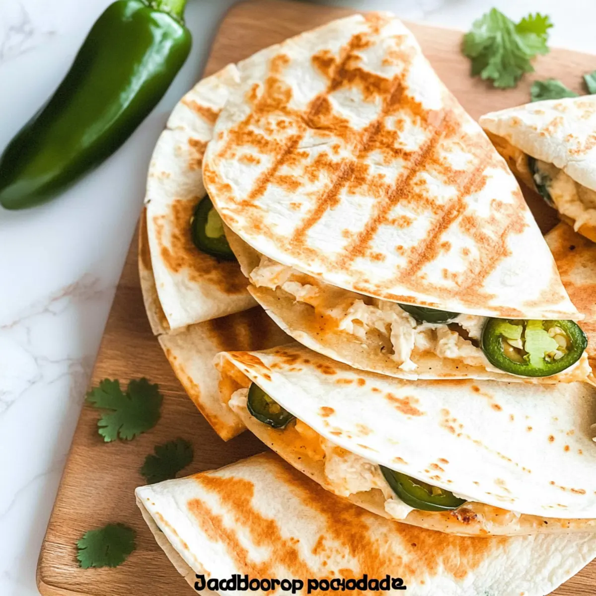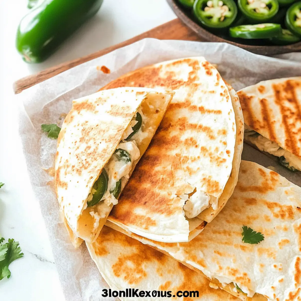Jump to Recipe Print RecipeThe sizzle of tortillas hitting a hot skillet always signals something special. Today, I’m excited to share my go-to recipe for Jalapeño Popper Chicken Quesadillas—it’s a thrilling blend of creamy cheese, juicy chicken, and just enough kick from jalapeños, all wrapped up in golden, crispy tortillas. What I love most about these quesadillas is how effortlessly they transform into a quick dinner, making them perfect after a long day or for your next game day gathering. In just 30 minutes, you can whip up a satisfying meal that’s sure to impress your family or friends. Ready to dive into a world of spicy, cheesy goodness? Let’s get cooking! Why Are Jalapeño Popper Quesadillas a Must-Try? Quick and Easy: You can have these quesadillas ready to serve in just 30 minutes, making it perfect for busy weeknights or last-minute gatherings. Spicy Delight: The jalapeños deliver a punch of flavor that transforms ordinary chicken into something extraordinary. Adjust the heat level to your taste! Comfort Food Upgrade: Combining crispy bacon, creamy cheese, and warm tortillas makes for an irresistible bite that satisfies that comfort food craving. Versatile Options: Whether you want to swap in pulled pork or go vegetarian with sautéed veggies, these quesadillas can adapt to your dietary needs. Crowd-Pleasing Flavor: They’re a hit at parties and game days, pairing perfectly with sour cream or salsa for a delightful spread. Jalapeño Popper Chicken Quesadillas Ingredients Get ready to spice up your dinner with these delicious quesadillas! For the Quesadilla • Large flour tortillas – Perfect for a hearty base; try whole-wheat for a healthier twist. • Cooked and shredded chicken – Adds protein; leftover or rotisserie chicken works great. • Jalapeño peppers – Provides that spicy kick; use fewer for a milder version or swap for mild green chiles. • Cream cheese – Gives a creamy texture; ensure it’s softened for easy mixing. • Monterey Jack cheese – Melts beautifully; cheddar can be swapped for a sharper flavor. • Garlic powder – Enhances overall flavor; fresh garlic is a robust alternative. • Onion powder – Adds depth; fresh onions can be diced in if preferred. • Bacon – Brings crunch and richness; turkey bacon offers a lighter option. • Salt and pepper – Essential for seasoning; adjust to suit your taste. • Olive oil – Used for cooking until crispy; butter adds a richer taste if preferred. Optional Garnish • Fresh cilantro – Adds freshness and a pop of color; a lovely touch for serving! Step‑by‑Step Instructions for Jalapeño Popper Chicken Quesadillas Step 1: Prepare the Cheese Mixture In a mixing bowl, combine 8 ounces of softened cream cheese, 1 cup of shredded Monterey Jack cheese, 1 teaspoon of garlic powder, 1 teaspoon of onion powder, and a pinch of salt and pepper. Use a fork to blend until the mixture is smooth and creamy, which should take about 2-3 minutes. This flavorful base sets the stage for your delicious Jalapeño Popper Chicken Quesadillas. Step 2: Add the Fillings Fold in 2 cups of shredded cooked chicken, ½ cup of crumbled bacon, and 1-2 finely chopped jalapeño peppers into the cheese mixture. Stir everything together until well combined, ensuring an even distribution of ingredients. The combination of chicken, bacon, and spicy jalapeños will create the perfect filling for your quesadillas, bursting with flavor in every bite. Step 3: Assemble the Quesadillas Lay a large flour tortilla flat on a clean surface. Spread a generous portion of the filling mixture across half of the tortilla, then fold the other half over, pressing gently to secure. Repeat this process with the remaining tortillas, ensuring even portions of the filling. This will create a pocket of deliciousness when cooked, perfect for your Jalapeño Popper Chicken Quesadillas. Step 4: Cook the Quesadillas Heat a skillet over medium heat and drizzle in 2 tablespoons of olive oil. Carefully place one folded quesadilla into the skillet. Cook for about 2-3 minutes until the bottom is golden brown and crispy, then flip and cook for another 2-3 minutes on the other side. Watch for a beautiful golden crust, ensuring the cheese melts and the flavors meld together harmoniously. Step 5: Repeat Cooking Process Remove the cooked quesadilla from the skillet and place it on a cutting board to cool slightly. Wipe the skillet if necessary and repeat the cooking process with the remaining quesadillas, adding more oil as needed. You should have 4-6 quesadillas in total, each one delivering a satisfying crunch and the delightful warmth of the cheese and jalapeños. Step 6: Serve and Enjoy Slice each quesadilla into quarters and arrange them on a serving platter. If desired, garnish with fresh cilantro for a burst of color and flavor. Serve your delicious Jalapeño Popper Chicken Quesadillas warm, paired with sour cream or salsa for dipping. Delight your family and friends with this comforting meal that is sure to please! Expert Tips for Jalapeño Popper Chicken Quesadillas Choose the Right Tortillas: Use large flour tortillas for easy folding. Whole-wheat tortillas can add a nutrient boost without sacrificing flavor. Control the Heat: Adjust the jalapeño quantity based on your preference; removing the seeds and ribs will significantly decrease the spice level. Cook Thoroughly: Ensure your skillet is preheated before adding the quesadillas. This helps achieve that golden, crispy exterior everyone loves. Reheat Right: While best enjoyed fresh, if you have leftovers, reheat them in a skillet over low heat to keep them crispy instead of using a microwave. Experiment with Fillings: These quesadillas are versatile! Try swapping the chicken for pulled pork or veggies to create a unique flavor profile while enjoying your Jalapeño Popper Chicken Quesadillas. What to Serve with Jalapeño Popper Chicken Quesadillas Warm, inviting flavors and textures accompan
