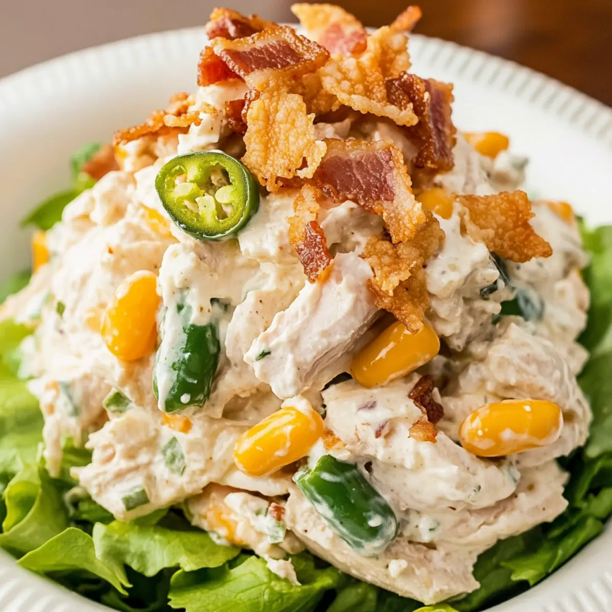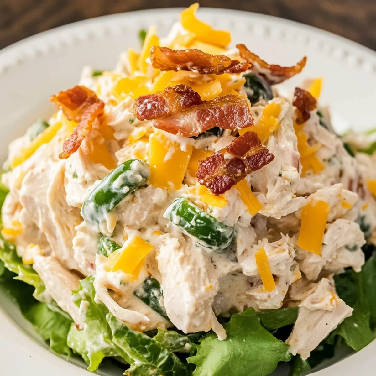 Jump to Recipe Print RecipeAs I rummaged through my fridge for inspiration, a half-empty block of cream cheese caught my eye, whispering promises of creamy delights. That’s when I decided to whip up a luscious Jalapeño Popper Chicken Salad that delivers all the comforting flavor of a classic appetizer while keeping things fresh and satisfying. Perfect for those busy weeknights, this quick recipe comes together in just 15 minutes, making it a fabulous choice for dinner or a picnic treat. The best part? It’s packed with protein, and if you serve it in lettuce wraps, it’s a fantastic low-carb meal! Have you ever tasted something that instantly transports you back to a joyful gathering? Let’s dive into this mouthwatering salad that brings a little pop to your plate! Why Is This Salad So Special? Creamy Delight: The rich cream cheese base creates an indulgent texture that keeps you coming back for more. Mildly Spicy Flavor: Each bite packs just the right punch, promising a zing from jalapeños while remaining approachable for everyone. Quick Prep Time: In just 15 minutes, you can whip up this satisfying meal, making it ideal for those hectic evenings. Versatile Serving Options: Enjoy it as a standout salad, a sandwich filling, or wrapped in crisp lettuce for a low-carb treat. For another refreshing option, check out the flavorful Hawaiian Chicken Salad! Crowd-Pleasing Appeal: With its irresistibly creamy texture and delicious flavors, this salad is sure to impress family and friends at any gathering. Jalapeño Popper Chicken Salad Ingredients For the Base: Cream Cheese – Provides richness and creaminess; substitute with low-fat if desired. Mayonnaise – Adds moisture and flavor; Greek yogurt offers a healthier twist. Garlic Powder – Enhances flavor depth; fresh garlic works well too. Onion Powder – Adds a savory element; fresh onions can replace it. Kosher Salt – Balances flavors; regular table salt can also be used. Black Pepper – Offers a slight kick; white pepper gives a milder taste. For the Chicken Salad: Cooked Chicken – A hearty protein base; shredded rotisserie chicken saves time. Cheddar Cheese – Adds savory creaminess; try Monterey Jack or Pepper Jack for a twist. Bacon – Introduces a delightful crunch; turkey bacon is a lighter alternative. Jalapeño Peppers – Brings spice and flavor; remove seeds for less heat or add more for a fiery kick. This delicious Jalapeño Popper Chicken Salad is not only creamy and comforting but also a delightful way to enjoy familiar flavors in a fresh, new form! Step‑by‑Step Instructions for Jalapeño Popper Chicken Salad Step 1: Beat the Base In a large mixing bowl, beat 8 ounces of softened cream cheese and 1/2 cup of mayonnaise using an electric mixer on medium speed for about 2-3 minutes. Look for a smooth and creamy texture without any lumps. This foundational blend will create the rich base for your Jalapeño Popper Chicken Salad. Step 2: Season It Up Add 1 teaspoon of garlic powder, 1 teaspoon of onion powder, 1 teaspoon of kosher salt, and 1/2 teaspoon of black pepper to the cream cheese mixture. Blend everything together at medium speed for another 1-2 minutes until well combined and the flavors meld perfectly. You should achieve a beautifully seasoned creamy base that’s packed with flavor. Step 3: Add the Chicken and Cheeses Gently fold in 2 cups of shredded cooked chicken, 1 cup of shredded cheddar cheese, and 1/2 cup of crumbled crispy bacon. Use a spatula to carefully combine the ingredients without overmixing, ensuring every bite of your Jalapeño Popper Chicken Salad has a delightful mix of textures. Look for the cheese to be evenly distributed throughout. Step 4: Incorporate the Jalapeños Next, add 1/2 cup of diced jalapeño peppers to the chicken salad mixture. If you prefer a milder heat, make sure to remove the seeds before dicing. Gently fold the jalapeños into the mixture, combining all the ingredients thoroughly for an extra kick of flavor. Step 5: Chill to Perfection Cover the bowl tightly with plastic wrap or a lid and place it in the refrigerator. Allow the salad to chill for at least 30 minutes to 1 hour. This chilling time helps the flavors meld together beautifully, resulting in a creamy and zesty Jalapeño Popper Chicken Salad that is even more delicious when served cold. Step 6: Serve It Fresh Once chilled, remove the salad from the refrigerator. Give it a gentle stir before serving, as it may thicken slightly in the fridge. Use a serving spoon to dish out portions and serve your Jalapeño Popper Chicken Salad in lettuce wraps, as a delightful sandwich filling, or simply on its own. Enjoy this crowd-pleasing dish! Jalapeño Popper Chicken Salad Variations Get ready to make this delightful dish uniquely yours with these fun twists and swaps! Dairy-Free: Substitute cream cheese and mayonnaise with a plant-based yogurt and cashew cream for a creamy vegan alternative. Discovering dairy-free options can lead to equally delicious flavors that everyone can enjoy while keeping it fresh and satisfying. Add More Heat: For spice enthusiasts, include a dash of cayenne pepper or extra diced jalapeños to kick things up a notch. A little extra fire can elevate the comfort of this salad to new, zesty heights. Fresh Herbs: Toss in chopped cilantro or parsley for a burst of freshness and vibrant flavor. Fresh herbs not only add color but also enhance the overall taste and aroma of the dish. Veggie Boost: Mix in diced bell peppers or corn for added crunch and sweetness. By incorporating a few veggies, you’ll be adding a delightful crunch and a rainbow of colors that make the salad visually appealing. Creamy Avocado: Fold in diced avocado for extra creaminess and healthy fats that enrich your salad. Avocado not only enhances the richness but also balances the spice perfectly. Nutty Flavor: Add toasted sunflower seeds or sliced almonds for an unexpected crunch. The texture from the nuts offers a delightfu