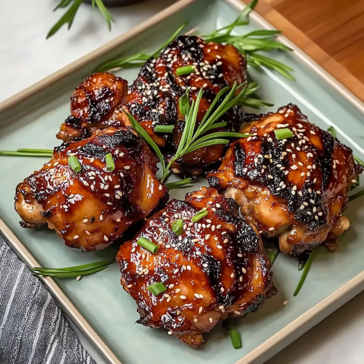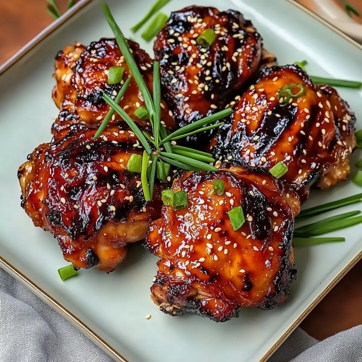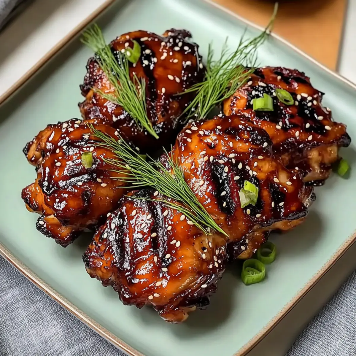 Jump to Recipe Print RecipeAs I stood in my kitchen, the tantalizing aroma of sizzling garlic and ginger wafted through the air, instantly transporting me to a warm izakaya in Japan. These Crispy Japanese BBQ Chicken Thighs are my go-to solution for when I crave a gourmet experience in under 30 minutes. With a perfectly balanced mix of sweet and spicy flavors, this dish combines ease with authenticity, making it a hit for weeknight dinners or cozy gatherings. You’ll love how quickly the flavorful marinade comes together, setting the stage for succulent chicken that’s crispy on the outside and juicy within. Ready to impress in just a fraction of the time it takes to order takeout, these thighs promise to change your dinner game forever. So, what sides will you pair with this delightful dish? Let’s find out! Why Are Japanese BBQ Chicken Thighs a Must-Try? Flavor Explosion: The combination of garlic, ginger, and Japanese BBQ sauce creates a harmonious medley of sweet and spicy that will tantalize your taste buds. Quick and Easy: Designed for busy weeknights, this recipe can be on your table in under 30 minutes, making it perfect for those craving homemade goodness without the long wait. Crowd-Pleasing Appeal: Both kids and adults will love this dish, making it ideal for family dinners or casual gatherings with friends. Pair it with steamed rice or a refreshing cucumber salad for a complete meal. Versatility Galore: Feel free to swap ingredients like sriracha or try different BBQ sauces, allowing you to customize the heat and flavor to your liking. Make-Ahead Convenience: Marinate the chicken ahead of time, so you can simply grill and enjoy a delightful gourmet experience right at home, similar to my Huli Huli Chicken for a tropical twist! Japanese BBQ Chicken Thighs Ingredients For the Marinade • Soy Sauce – Adds umami and saltiness; reduced sodium varieties can be used for a lighter option. • Japanese BBQ Sauce – The key flavor base; for authenticity, choose Bachan’s Original. • Sriracha – Introduces a customizable heat level; adjust according to your spice preference. • Garlic – Freshly minced for maximum flavor; use about 6 cloves or adjust to your taste. • Ginger – Freshly grated for a zesty kick; always opt for fresh to enhance the dish. • Toasted Sesame Oil – Adds a rich nuttiness; use it sparingly for a potent flavor. • Red Chili Flakes – For an added spice element; feel free to omit if you prefer milder dishes. • Salt and Pepper – Essential for seasoning; adjust to suit your preferences. For the Chicken • Chicken Thighs – Provides richness and moisture; bone-in, skin-on is also an option, but adjust your cooking time accordingly. For Garnishing • Green Onions – Mince to sprinkle on top for a fresh, vibrant finish. • Toasted Sesame Seeds – Toast until golden for a crunchy texture and nutty flavor atop your chicken. Now that we have our ingredients ready, let’s dive into the fun part – bringing these Japanese BBQ Chicken Thighs to life! Step‑by‑Step Instructions for Crispy Japanese BBQ Chicken Thighs Step 1: Prepare the Marinade In a medium bowl or resealable bag, combine soy sauce, Japanese BBQ sauce, sriracha, minced garlic, freshly grated ginger, toasted sesame oil, red chili flakes, and a pinch of salt and pepper. Whisk or mix thoroughly until well-blended, creating a fragrant marinade that captures the essence of Japanese BBQ chicken thighs, ready to infuse flavor. Step 2: Marinate the Chicken Add the chicken thighs to the marinade, ensuring each piece is well-coated in the flavorful mixture. Seal the bag or cover the bowl with plastic wrap, and refrigerate for at least 2 to 3 hours; for best results, aim for up to 8 hours. This slow infusion will enhance the taste and tenderness of your Japanese BBQ chicken thighs. Step 3: Preheat the Grill About 15 minutes before grilling, preheat your grill to medium heat, aiming for a temperature of 375-400°F. This steady heat will ensure that the chicken cooks evenly, developing a beautiful caramelized exterior without burning. A properly preheated grill is key to achieving that crispy texture on your chicken thighs. Step 4: Prepare Garnishes While the grill is heating, prepare your garnishes by mincing fresh green onions and toasting sesame seeds in a small skillet over medium heat. Stir constantly for about 3-5 minutes until the seeds are golden brown and aromatic. These will add a delightful crunch and brightness to your finished Japanese BBQ chicken thighs. Step 5: Grill the Chicken Once the grill is ready, remove the marinated chicken thighs from the refrigerator and place them directly on the grill. Grill for 10 to 12 minutes, flipping every 2-3 minutes for even cooking. In the last 2 minutes of grilling, brush on additional BBQ sauce for a glazed finish, enhancing both flavor and visual appeal. Step 6: Check for Doneness As the cooking time nears completion, use a meat thermometer to check the internal temperature of the chicken. You want it to reach 165°F to ensure it is fully cooked and safe to eat. The chicken should appear crispy on the outside, with a succulent and juicy interior that captures the essence of Japanese BBQ chicken thighs. Step 7: Rest and Serve After grilling, remove the chicken thighs from the grill and let them rest for 5 minutes. This resting period allows juices to redistribute for optimal moisture. Once rested, serve the chicken topped with toasted sesame seeds and minced green onions, accompanied by a side of Japanese BBQ sauce and yum yum sauce for dipping. Japanese BBQ Chicken Thighs Variations Feel free to get creative and make this recipe your own with these delightful twists! Dairy-Free: Use coconut aminos instead of soy sauce for a flavorful, gluten-free alternative without any dairy. Spice Levels: Adjust the sriracha amount for a milder flavor, or add extra to kick up the heat. Your taste buds will thank you! BBQ Sauce Options: Experiment wi